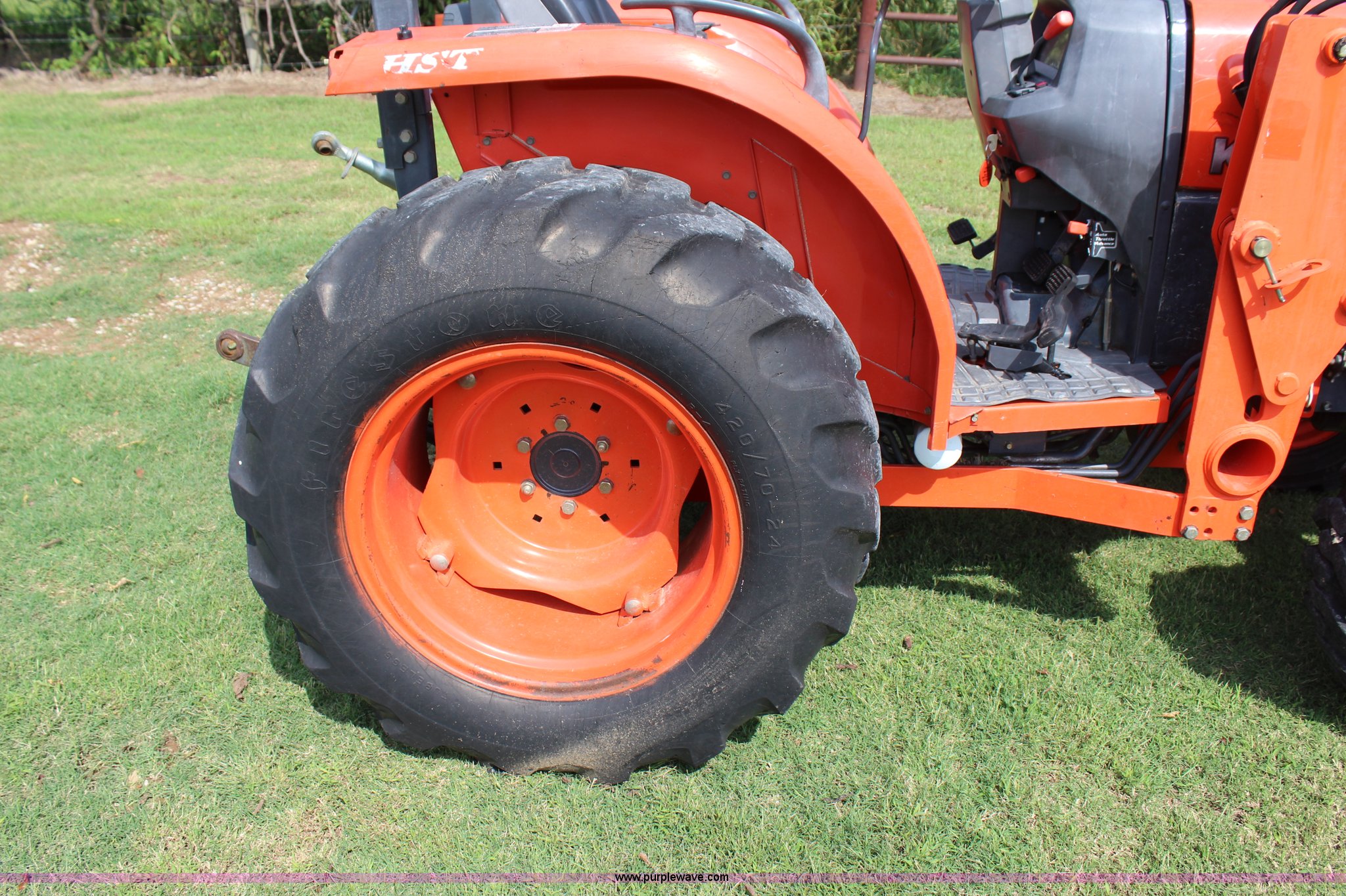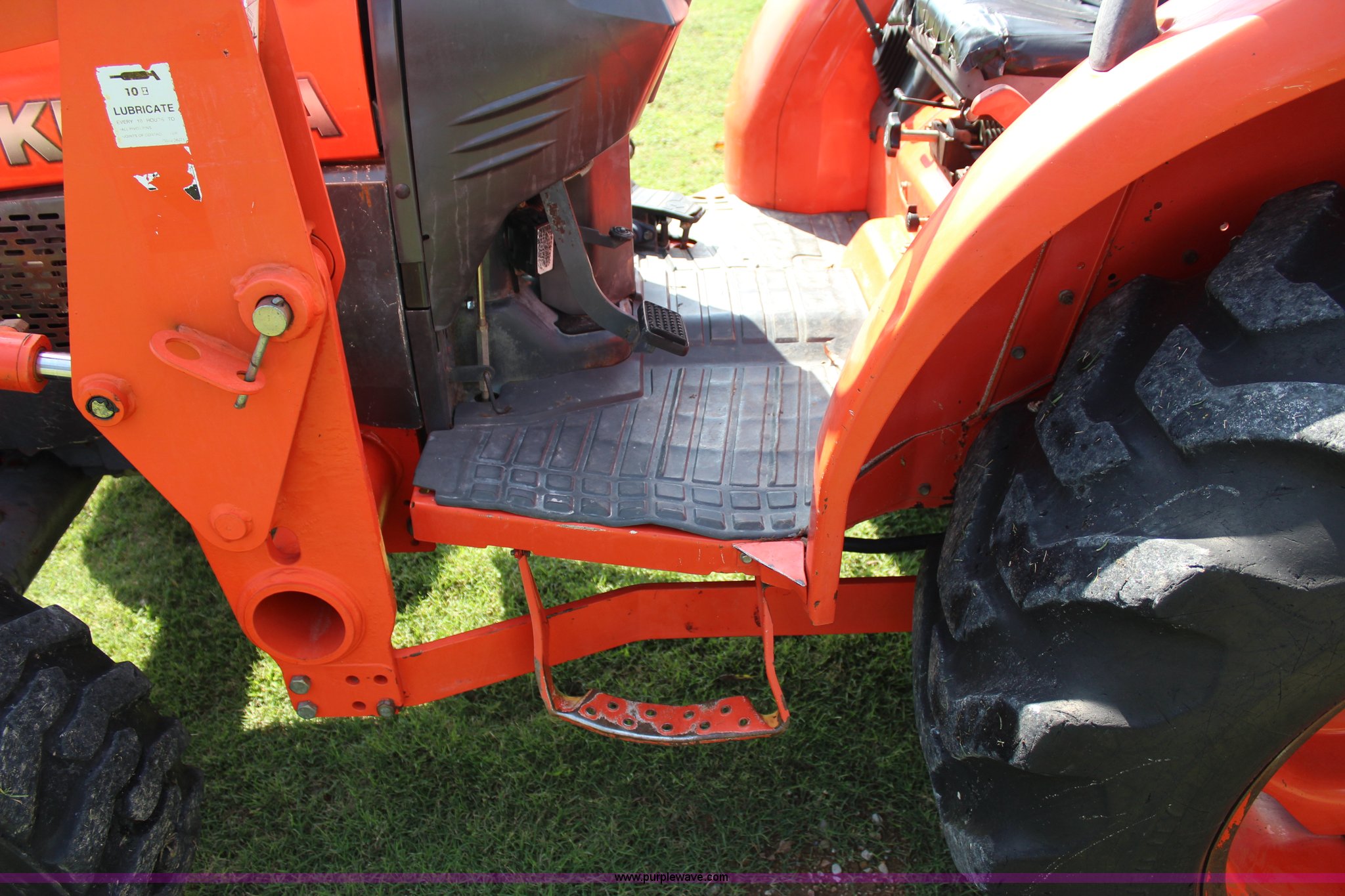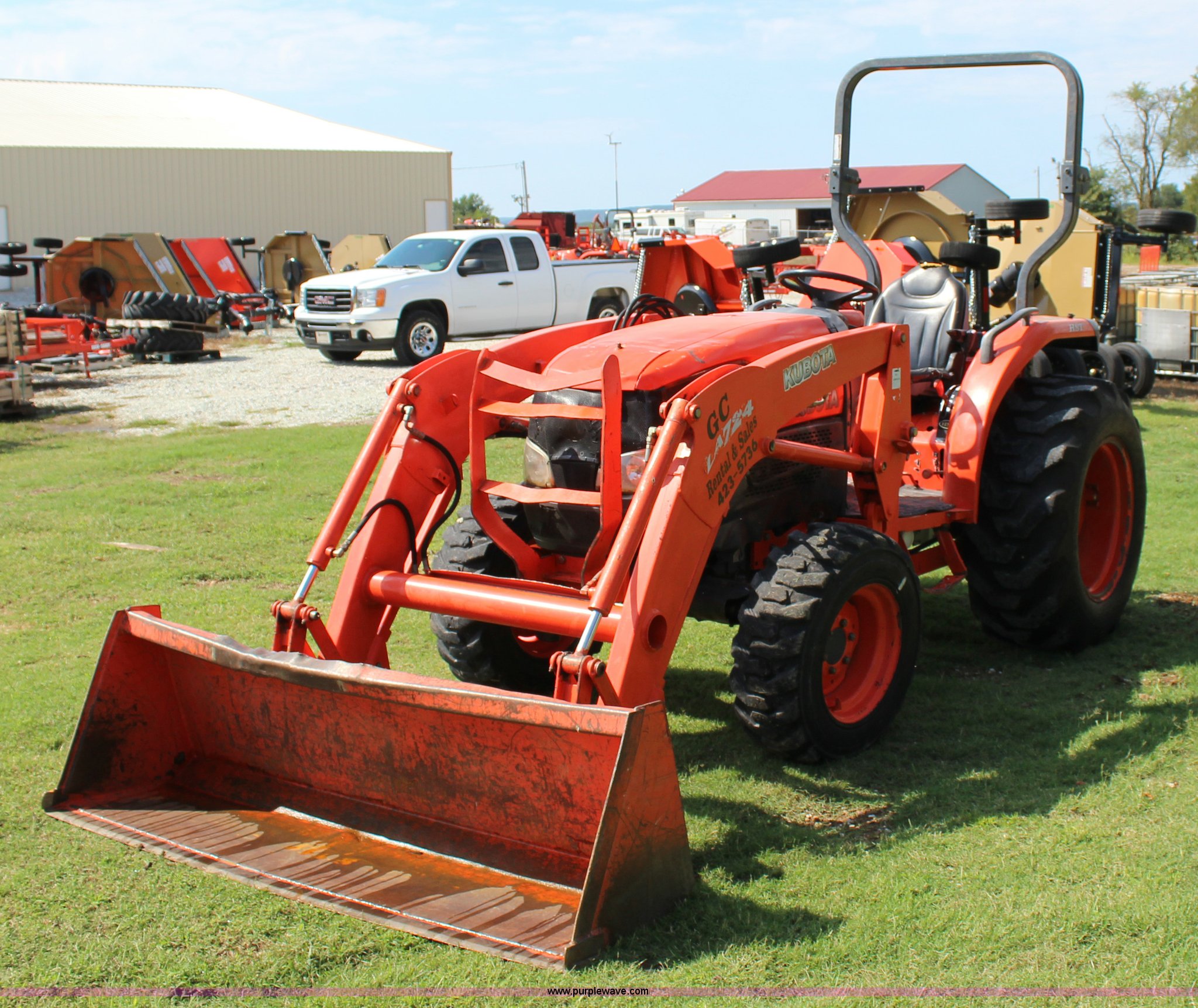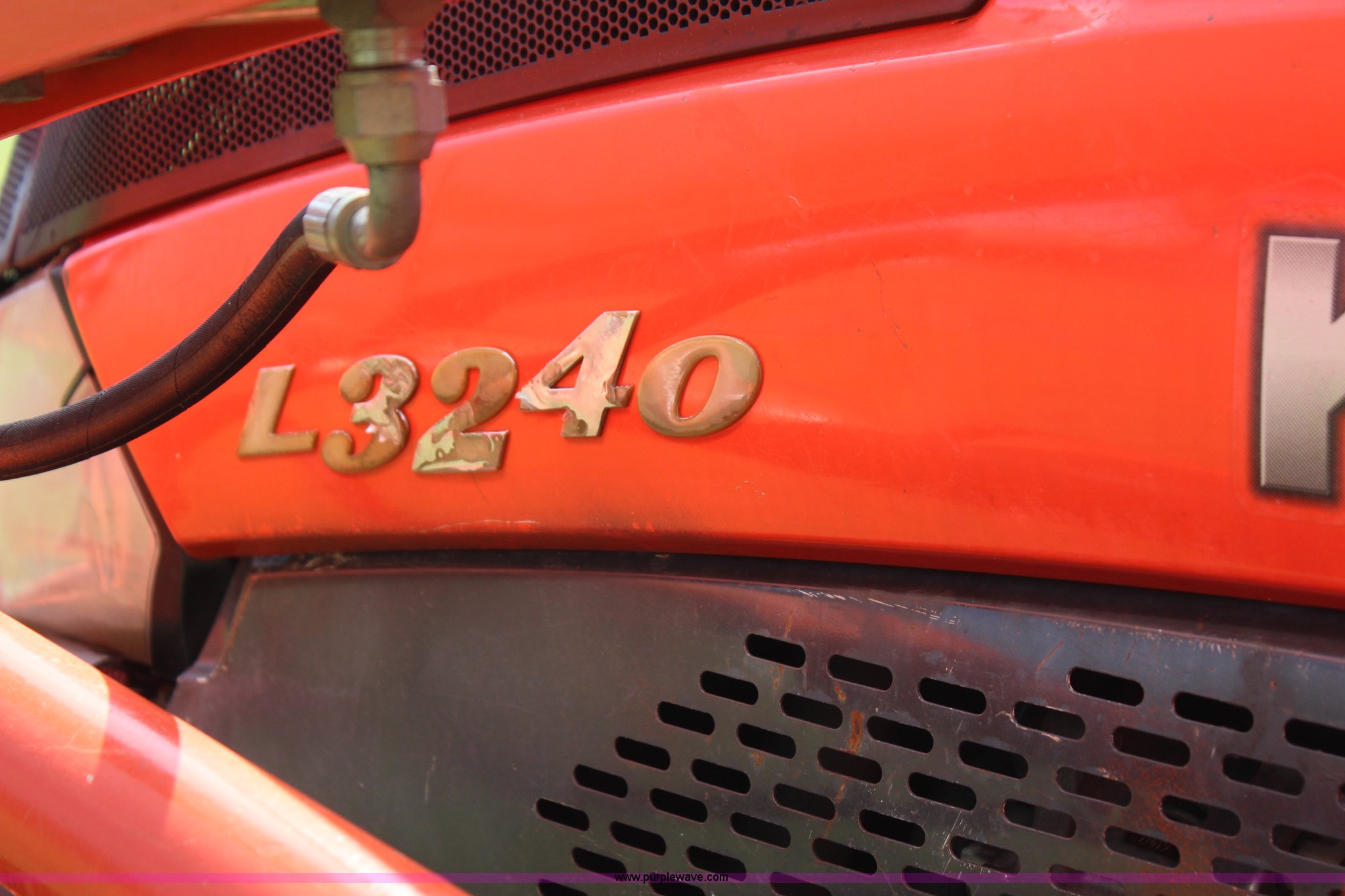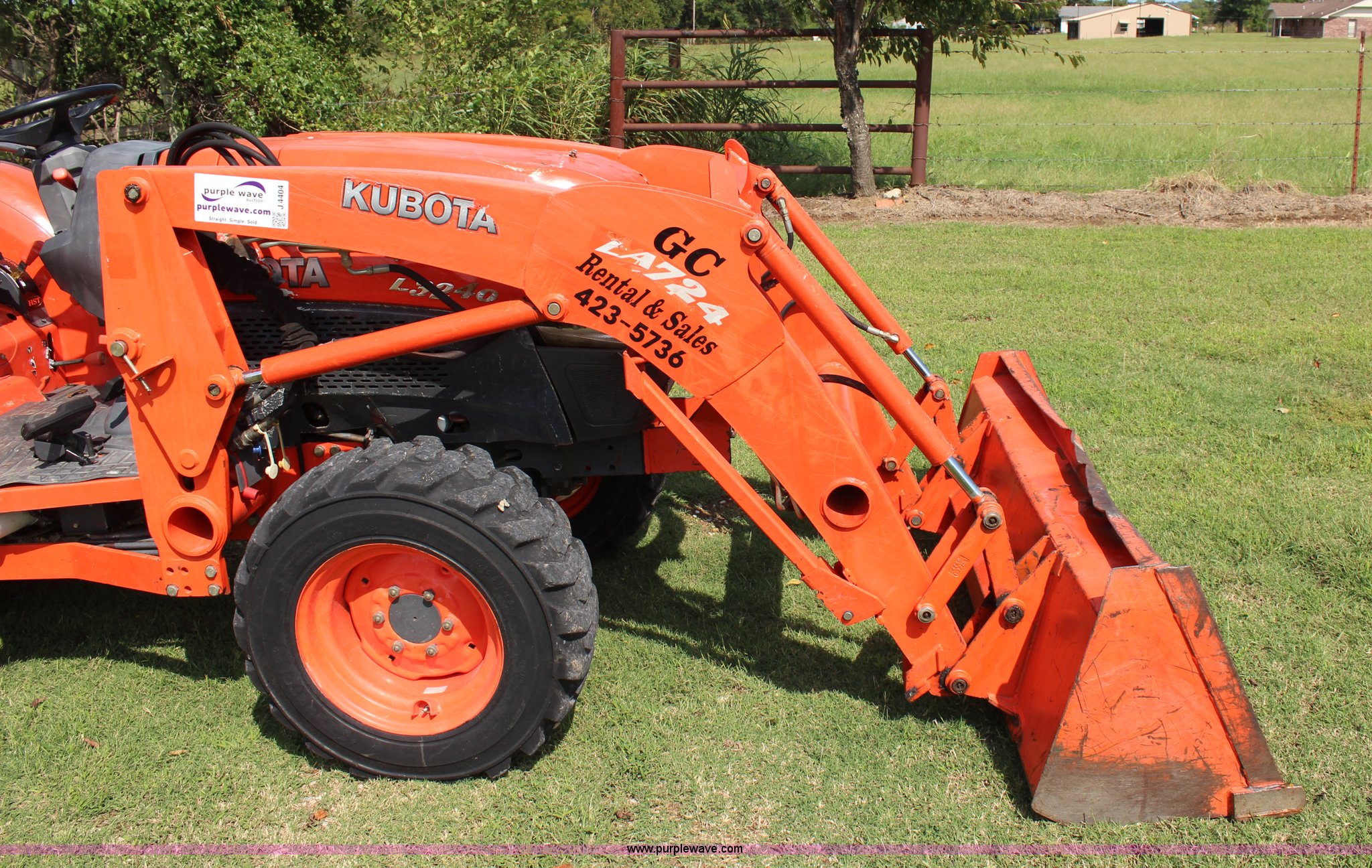 Purple Wave is selling a used Tractor in Oklahoma. This item is a 2007 Kubota L3240 tractor with the following: 1,933 hours on meter, Kubota four cylinder diesel engine, 8F-8R gears, Differential lock, ROPS, Model SFL-F354, Serial 06192, Tilt steering wheel, Suspension seat, Kubota LA724 loader, 70"W bucket, Joystick loader controls, Serial A3841, Three point, 540 PTO, Front hydraulic remote sets, 10-16.5 NHS front tires, 420/70-24 rear tires, Serial 35300