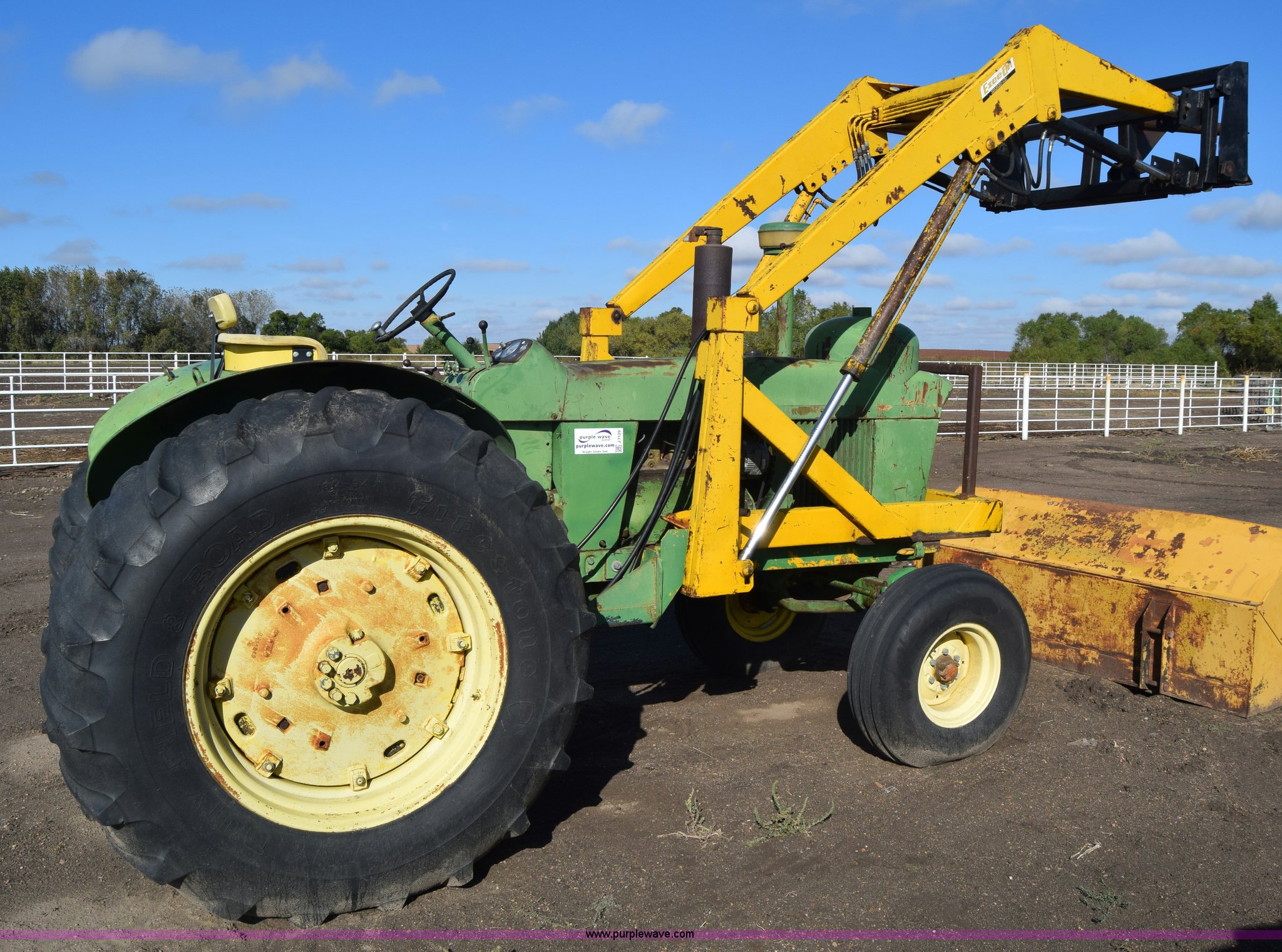 Purple Wave is selling a used Tractor in Kansas. This item is a John Deere 4010 tractor with the following: 3,991 hours on meter, John Deere 4.9L six cylinder dual fuel engine, Gas and propane compatible, 80 HP, John Deere synchro range transmission, 8F-3R gears, Ezee-On loader, 7'W bucket, Bale spear, 540 PTO, (2) rear hydraulic remote sets, 34 gallon fuel tank, 99.25" wheelbase, 10.00-16 front tires, 18.4-34 rear tires