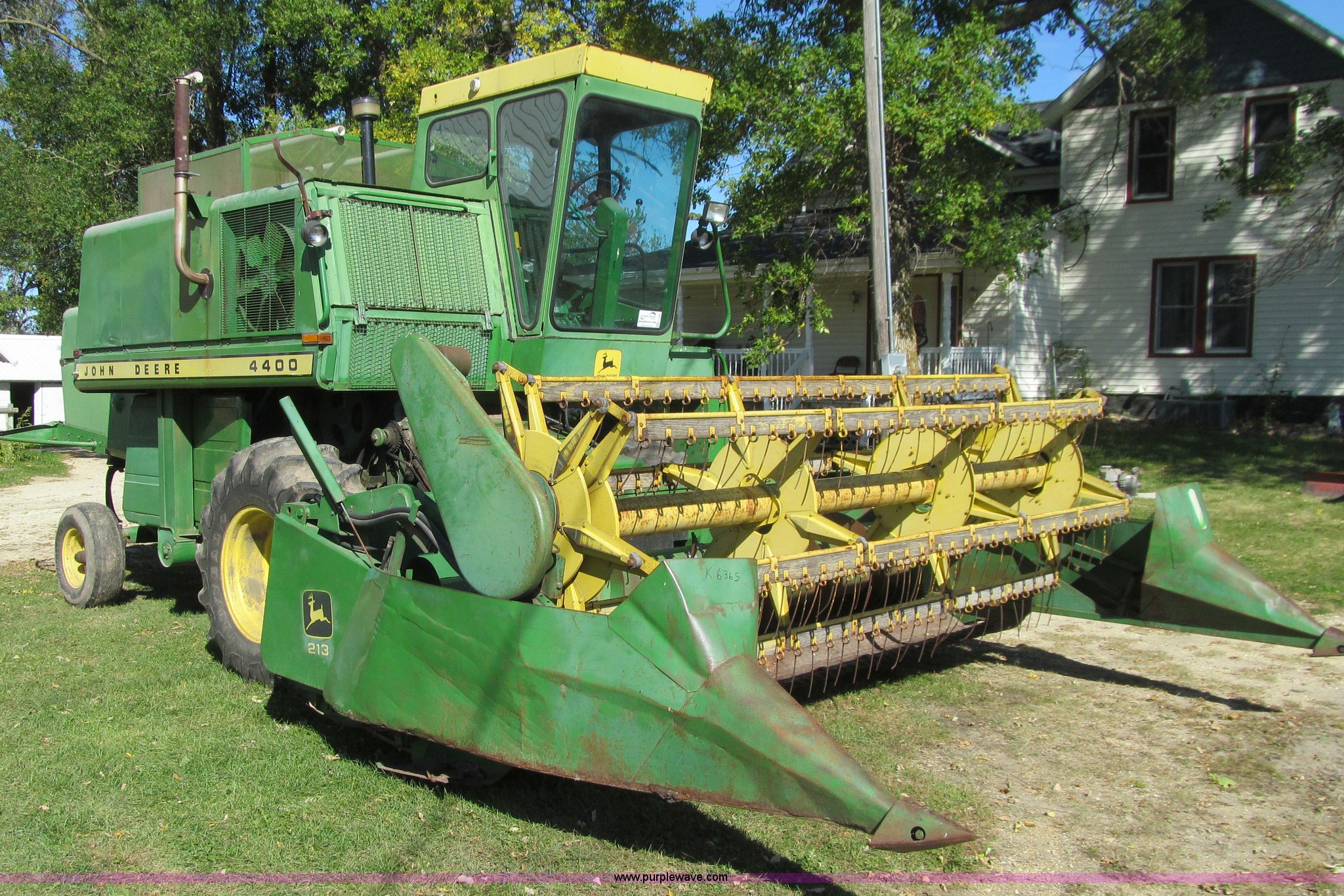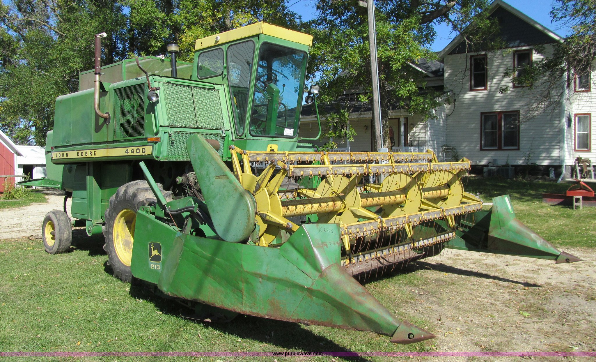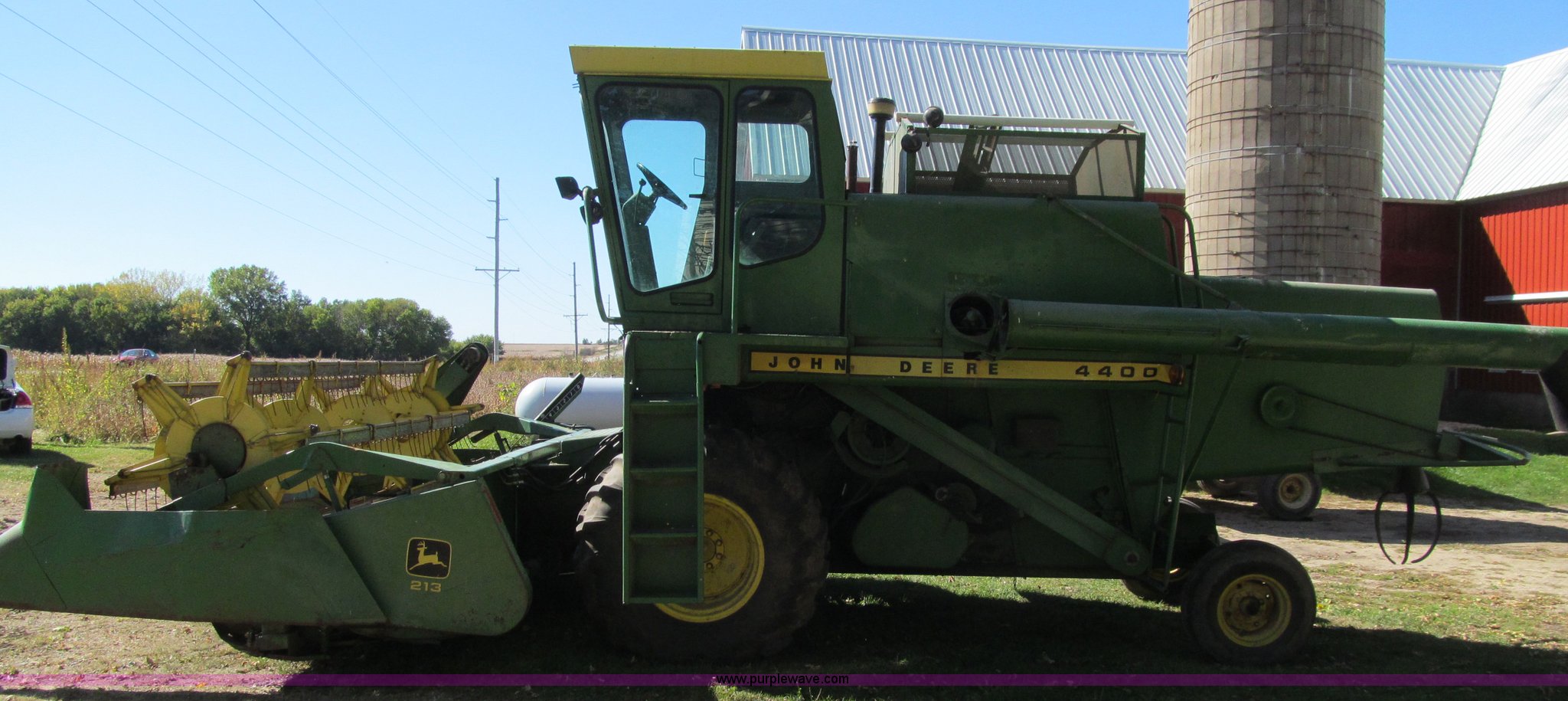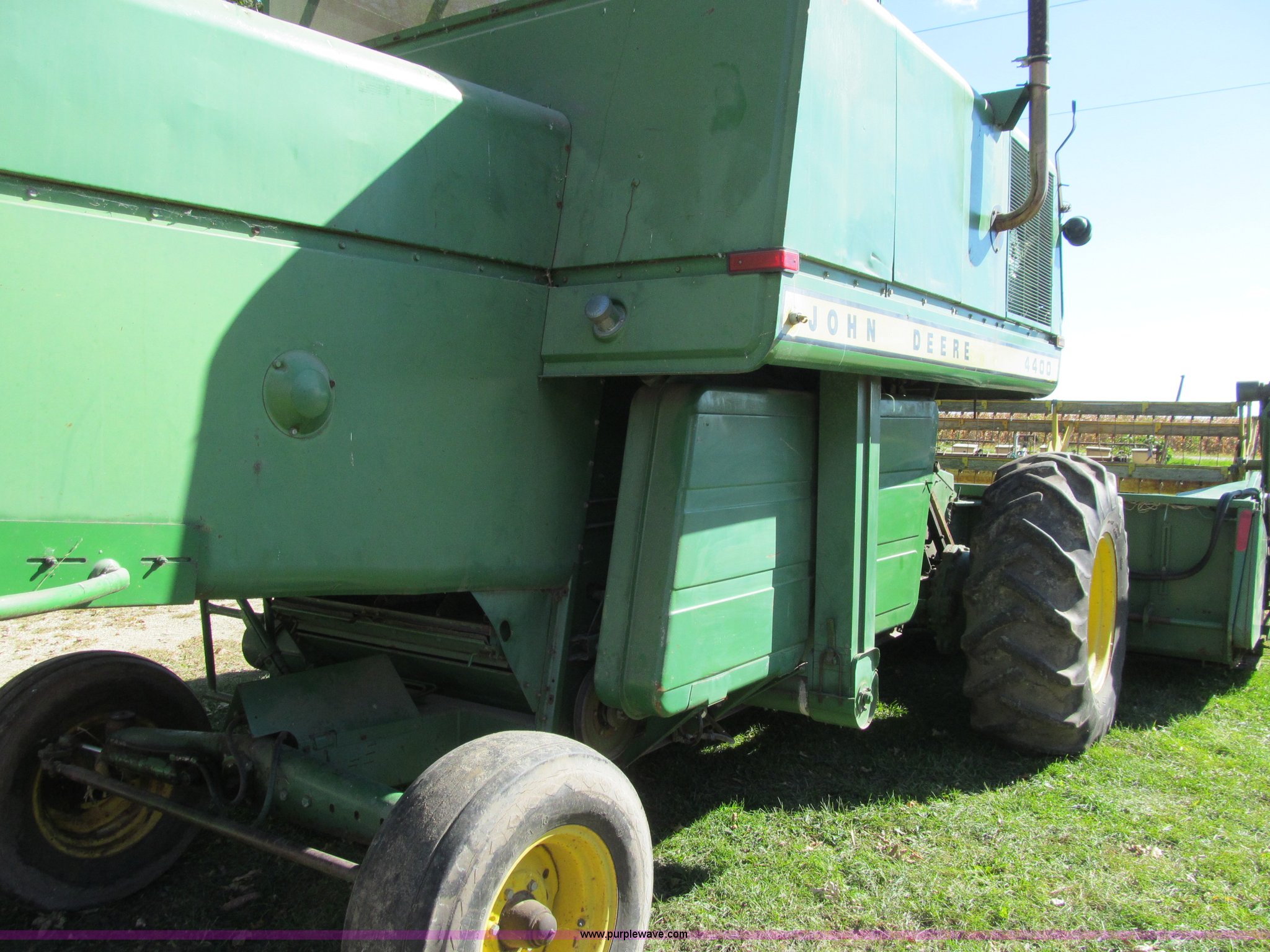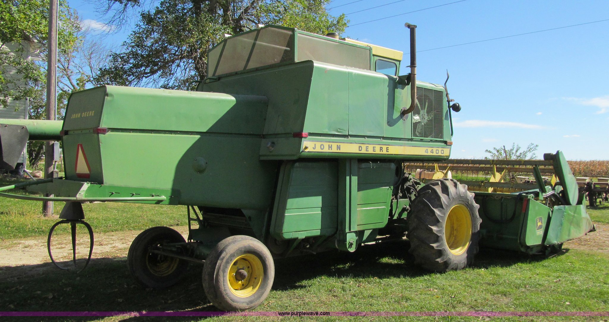 Purple Wave is selling a used Combine in Iowa. This item is a 1976 John Deere 4400 combine with the following: 3,577 engine hours on meter, John Deere six cylinder gas engine, Manual transmission, 4F-1R gears, Heat, Non-operational, Tilt steering wheel, Suspension seat, Chaff spreader, 11'L unloading auger, John Deere 213 flex platform head, Finger reel, Steel skid plates, Hydraulic reel height control, Dual drive lines, Serial 225009H, 128" wheelbase, 18.4-26 front tires, 11L-16 rear tires, Manuals, Serial E4400-007631H