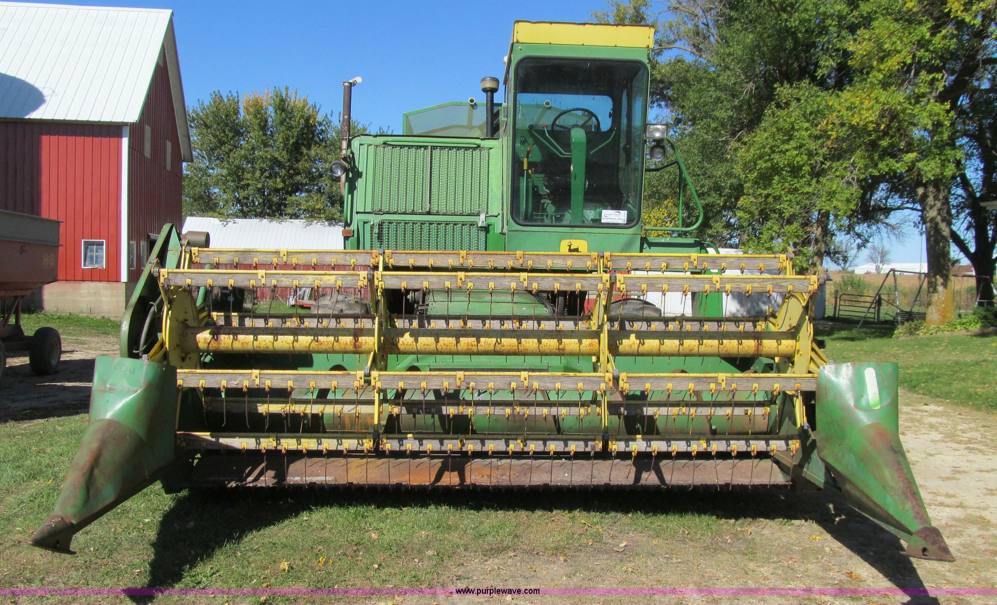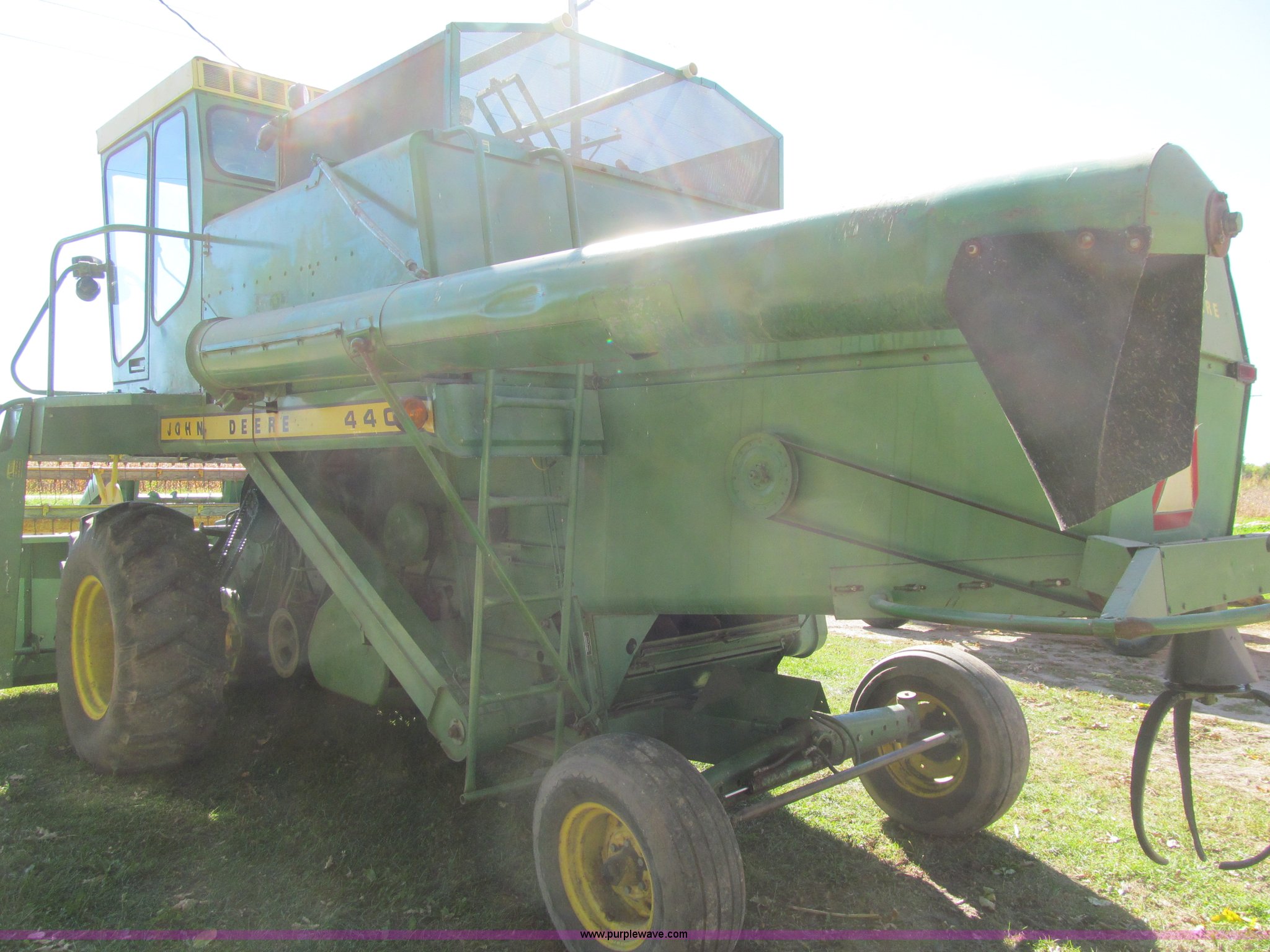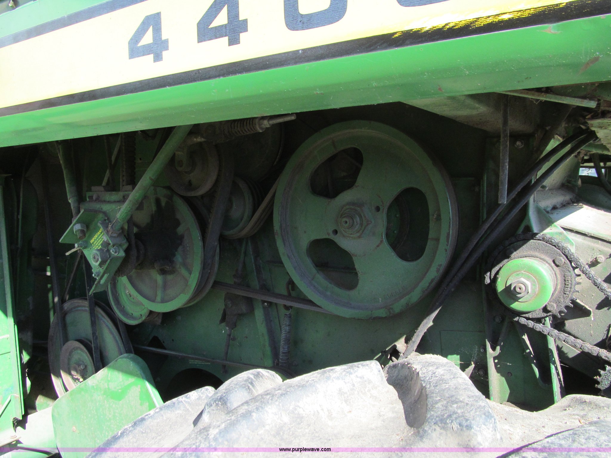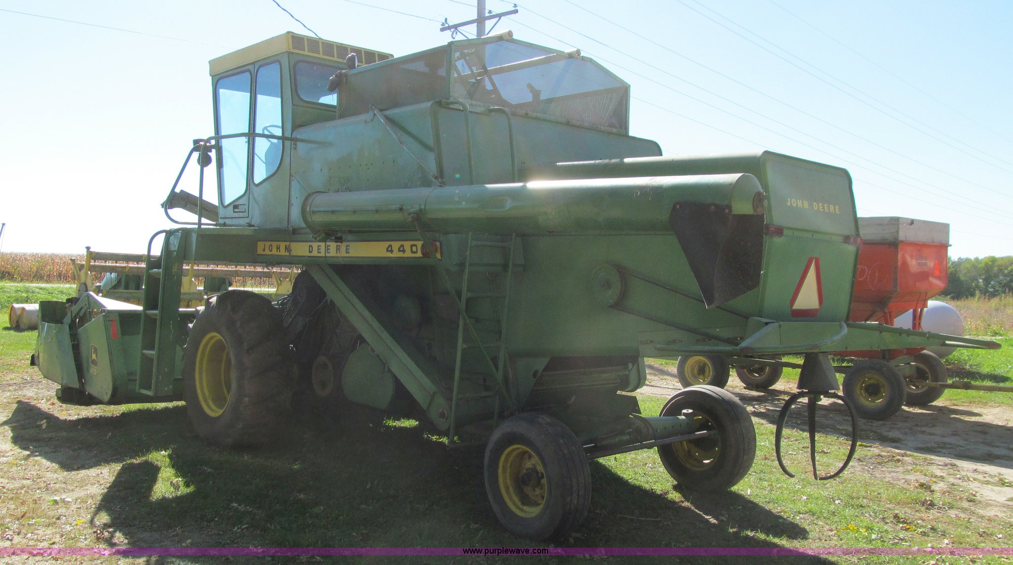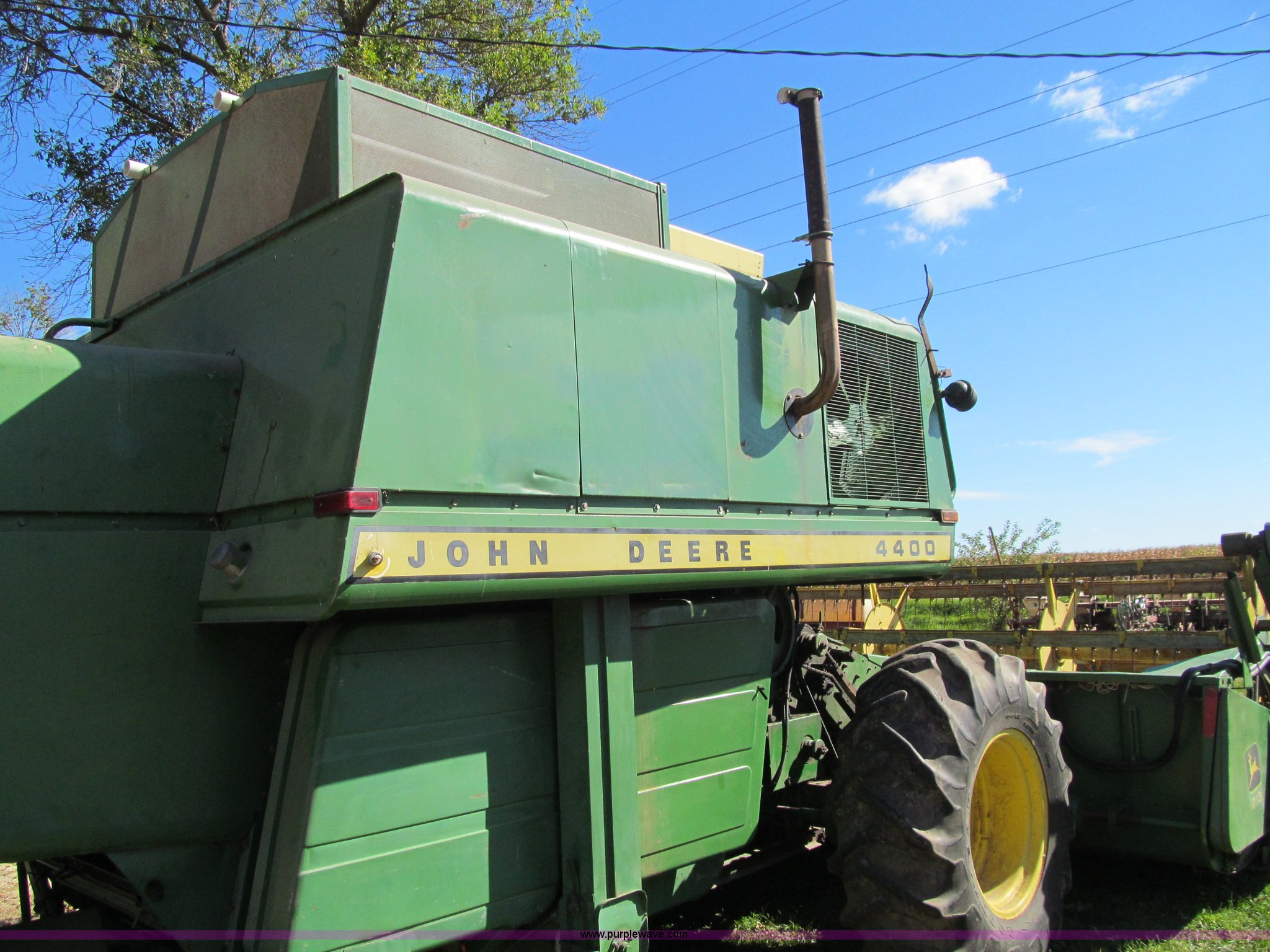 Purple Wave is selling a used Combine in Iowa. This item is a 1976 John Deere 4400 combine with the following: 3,577 engine hours on meter, John Deere six cylinder gas engine, Manual transmission, 4F-1R gears, Heat, Non-operational, Tilt steering wheel, Suspension seat, Chaff spreader, 11'L unloading auger, John Deere 213 flex platform head, Finger reel, Steel skid plates, Hydraulic reel height control, Dual drive lines, Serial 225009H, 128" wheelbase, 18.4-26 front tires, 11L-16 rear tires, Manuals, Serial E4400-007631H