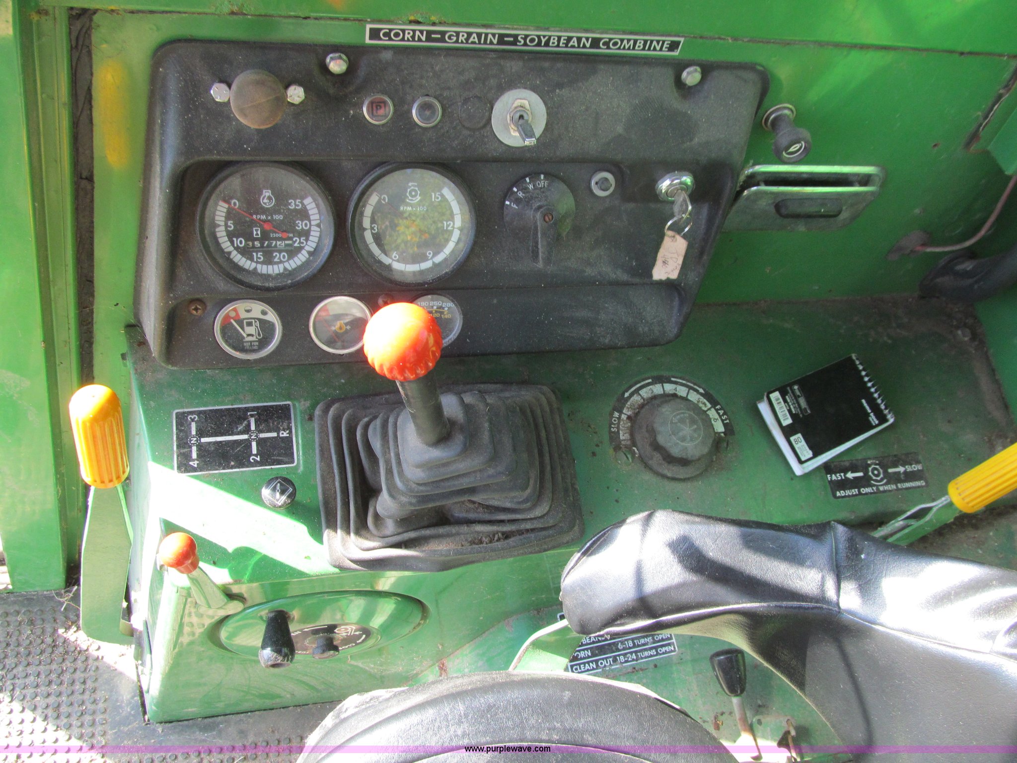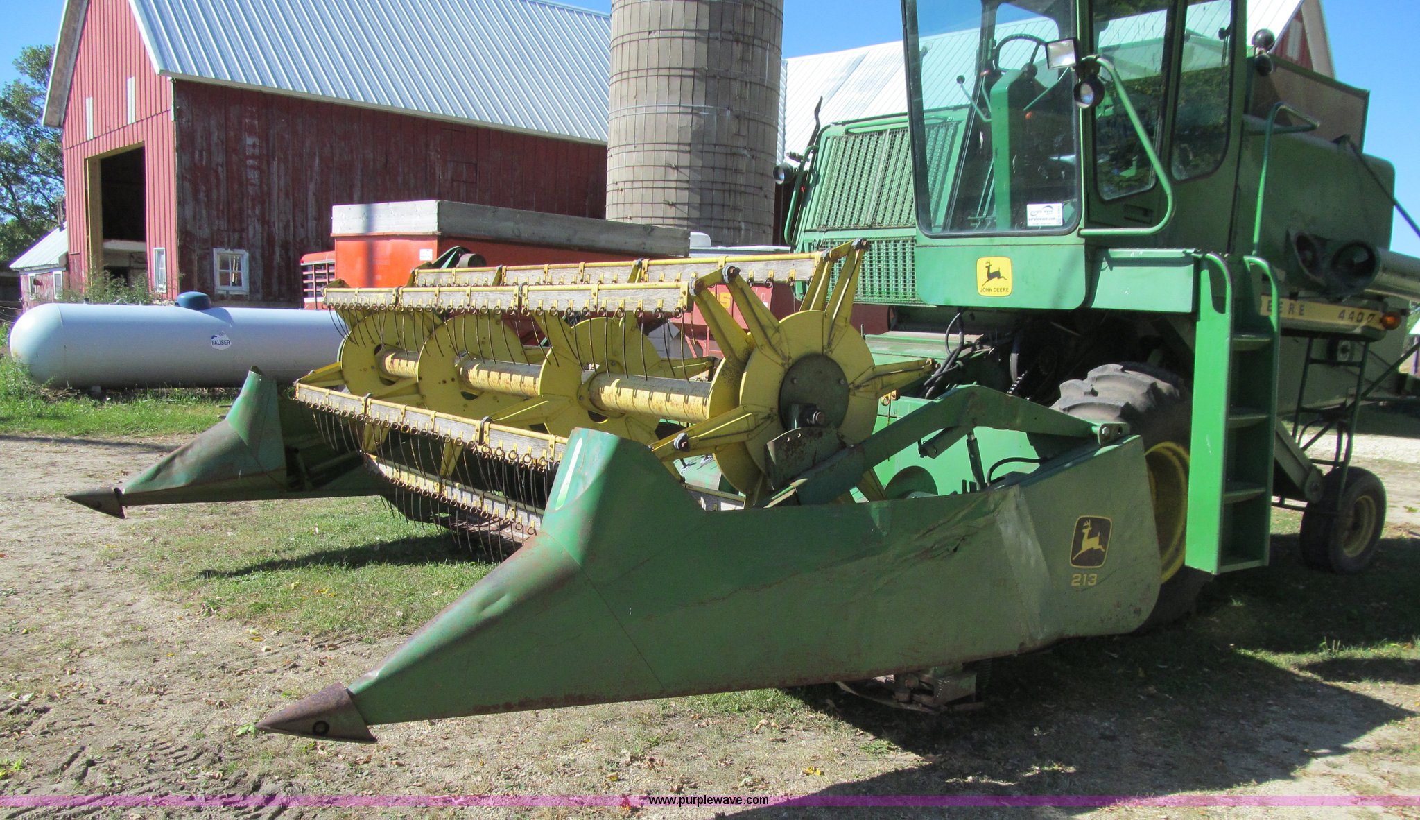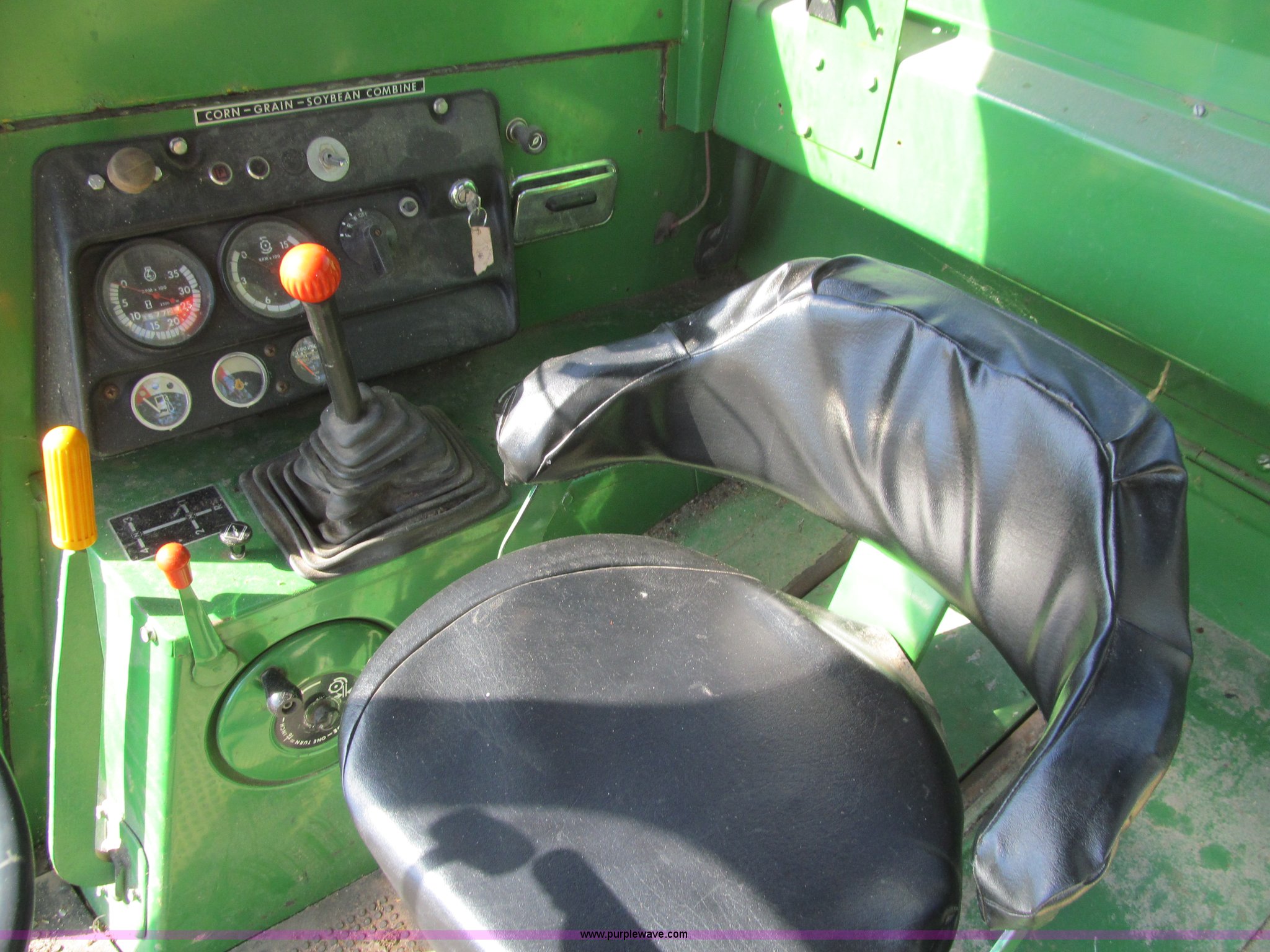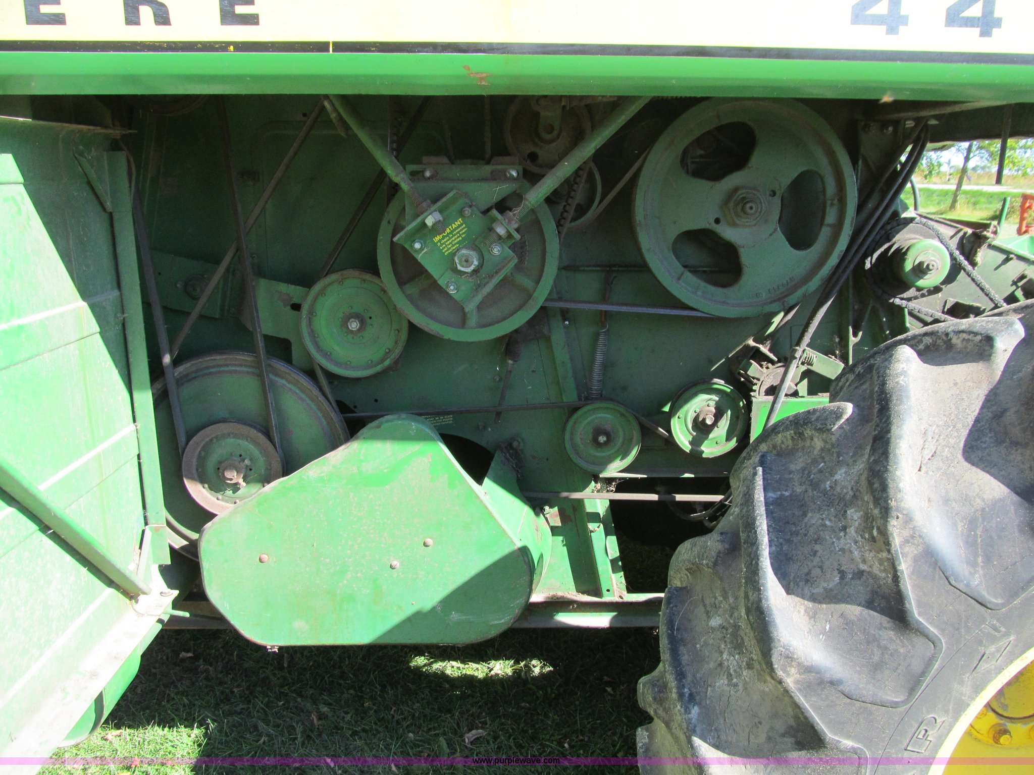 Purple Wave is selling a used Combine in Iowa. This item is a 1976 John Deere 4400 combine with the following: 3,577 engine hours on meter, John Deere six cylinder gas engine, Manual transmission, 4F-1R gears, Heat, Non-operational, Tilt steering wheel, Suspension seat, Chaff spreader, 11'L unloading auger, John Deere 213 flex platform head, Finger reel, Steel skid plates, Hydraulic reel height control, Dual drive lines, Serial 225009H, 128" wheelbase, 18.4-26 front tires, 11L-16 rear tires, Manuals, Serial E4400-007631H