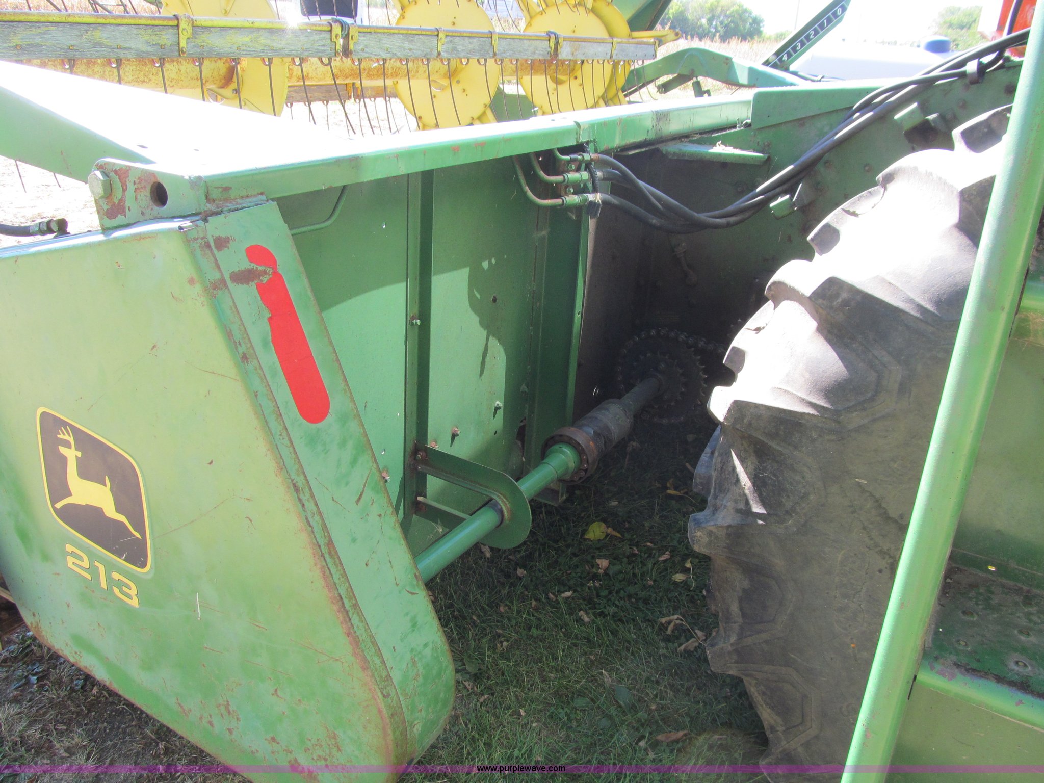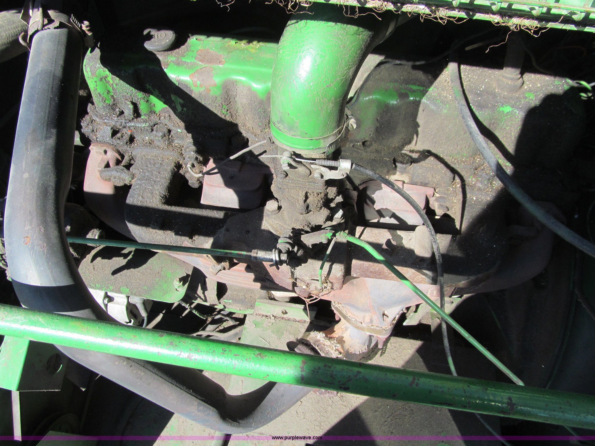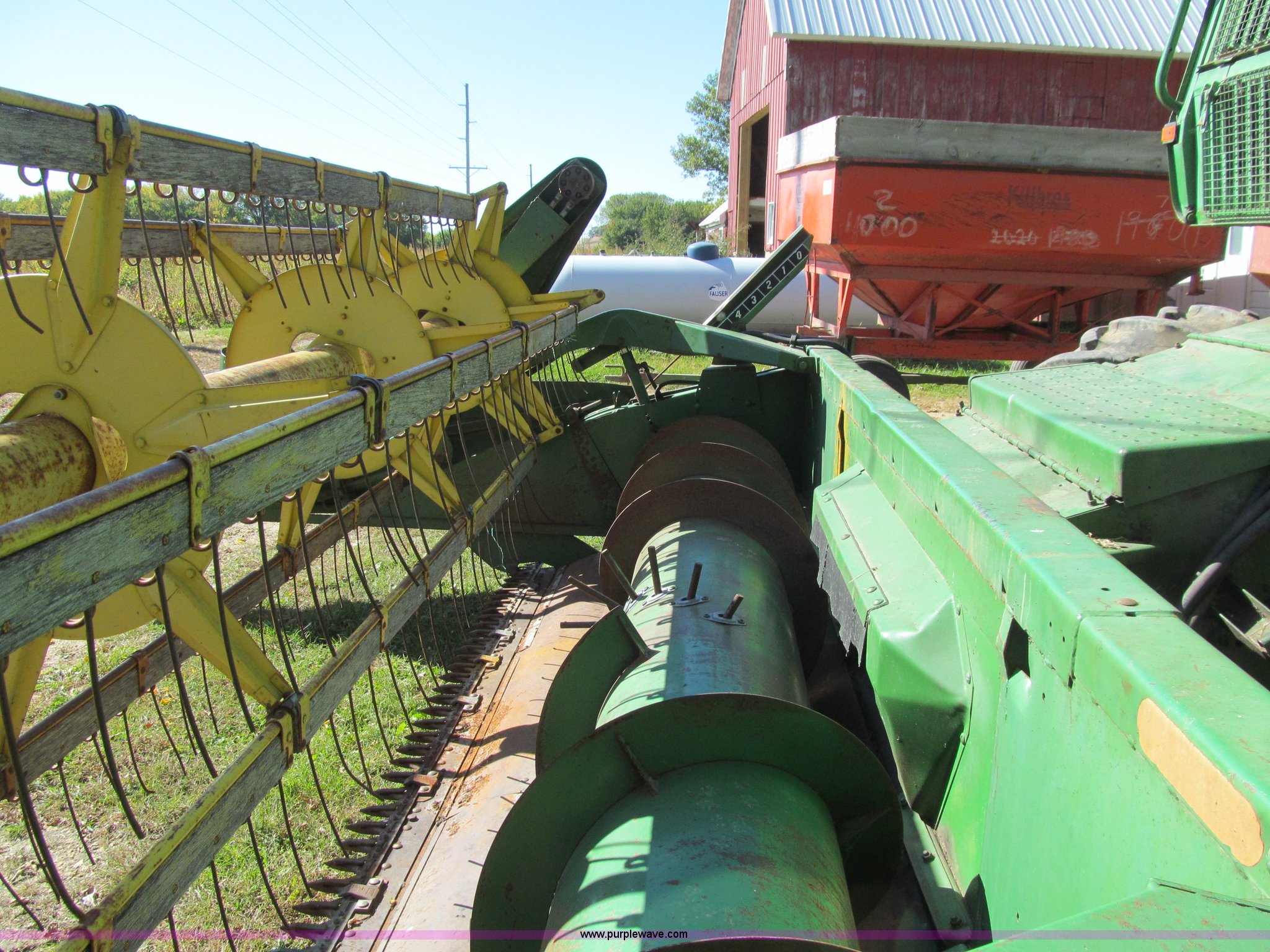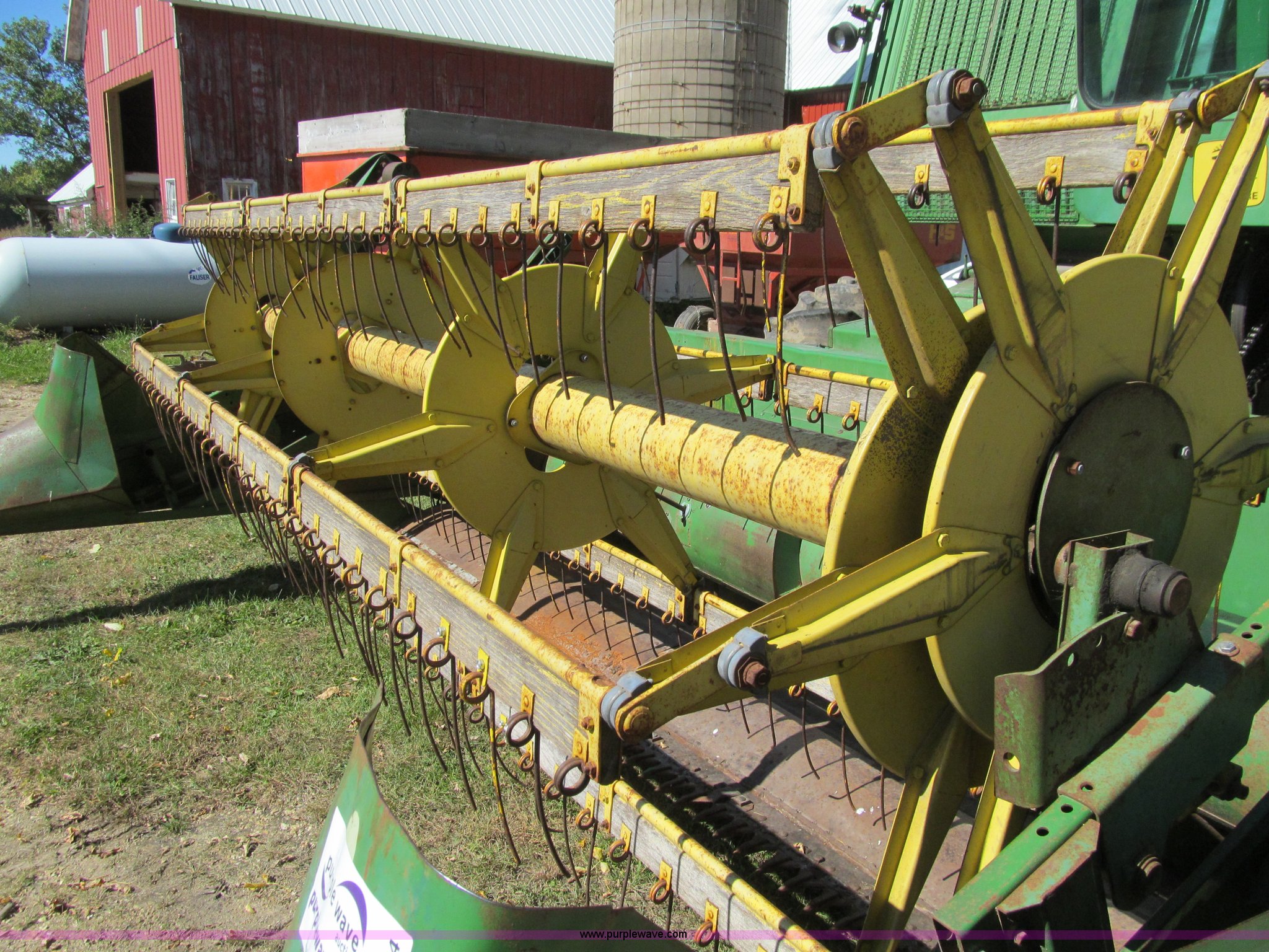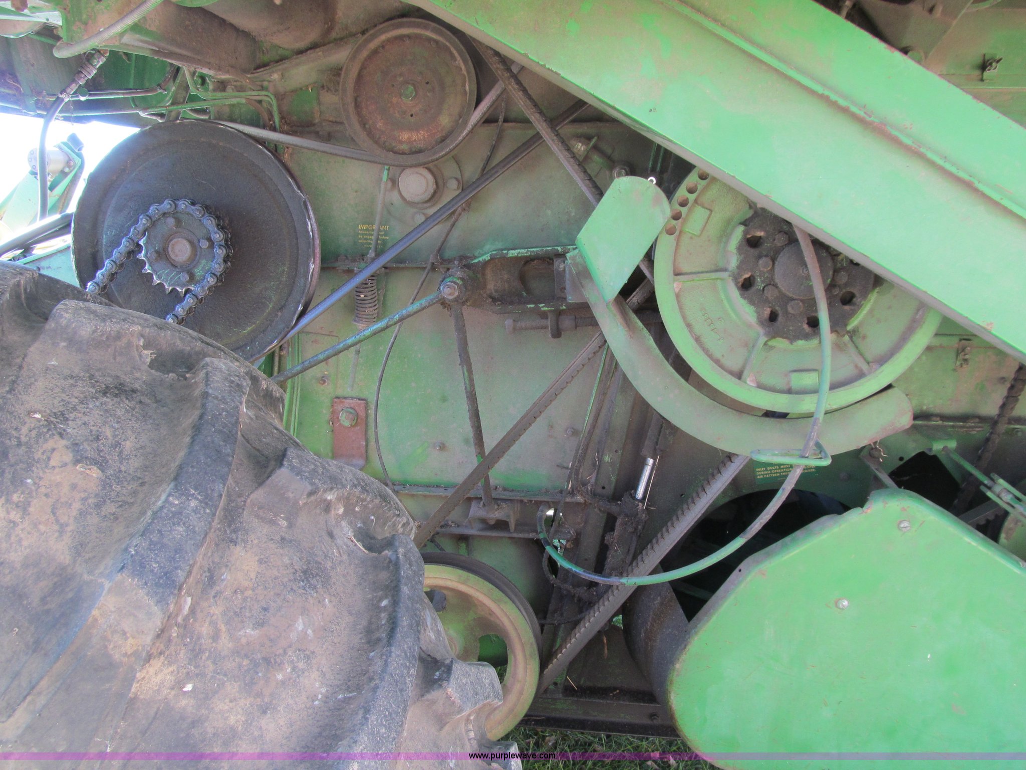 Purple Wave is selling a used Combine in Iowa. This item is a 1976 John Deere 4400 combine with the following: 3,577 engine hours on meter, John Deere six cylinder gas engine, Manual transmission, 4F-1R gears, Heat, Non-operational, Tilt steering wheel, Suspension seat, Chaff spreader, 11'L unloading auger, John Deere 213 flex platform head, Finger reel, Steel skid plates, Hydraulic reel height control, Dual drive lines, Serial 225009H, 128" wheelbase, 18.4-26 front tires, 11L-16 rear tires, Manuals, Serial E4400-007631H