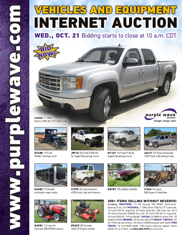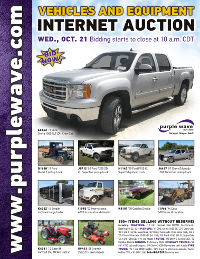 Payments must be made by 4 p.m. CST on the second business day following the auction. Purple Wave reserves the right to charge the credit card on file the total purchase price, $30.00 late payment fee for invoices not paid within our terms. Business hours are Monday through Friday 8 a.m. to 5 p.m CST. Cash and wire transfers (wire instructions) in any amount will be accepted. Checks up to $10,000.00 will be accepted without a bank guaranty letter. Checks of $10,000.00 or greater will be accepted only with a bank guaranty letter (letter requirements) or with prior approval from Purple Wave's credit department. MasterCard or Visa will be accepted only for charges up to $2,000.00, and only after authorization (via website or email) or in-person signatures are obtained from the cardholder. Purple Wave reserves the right to hold assets and/or certificates of title until funds availability is confirmed.
