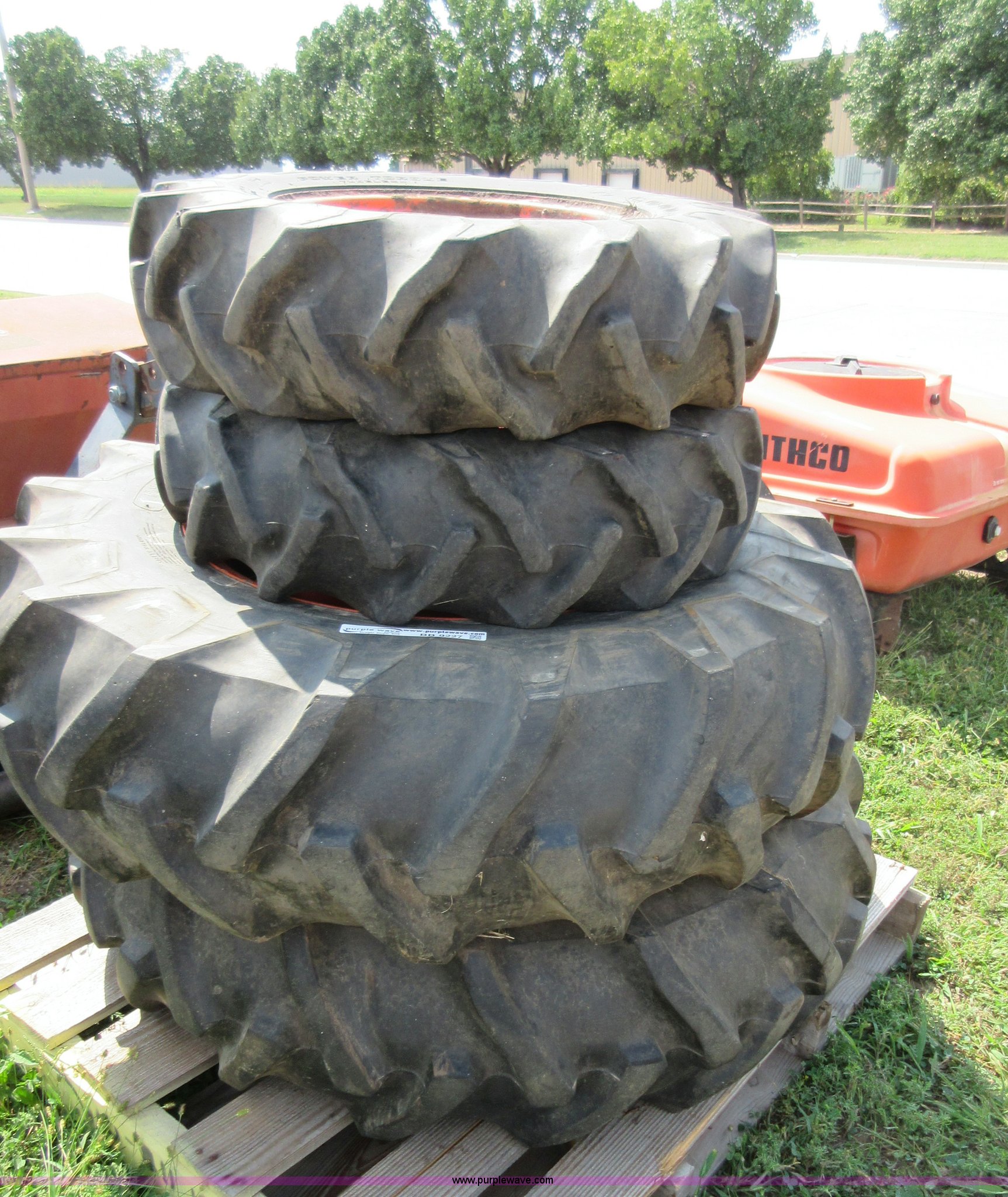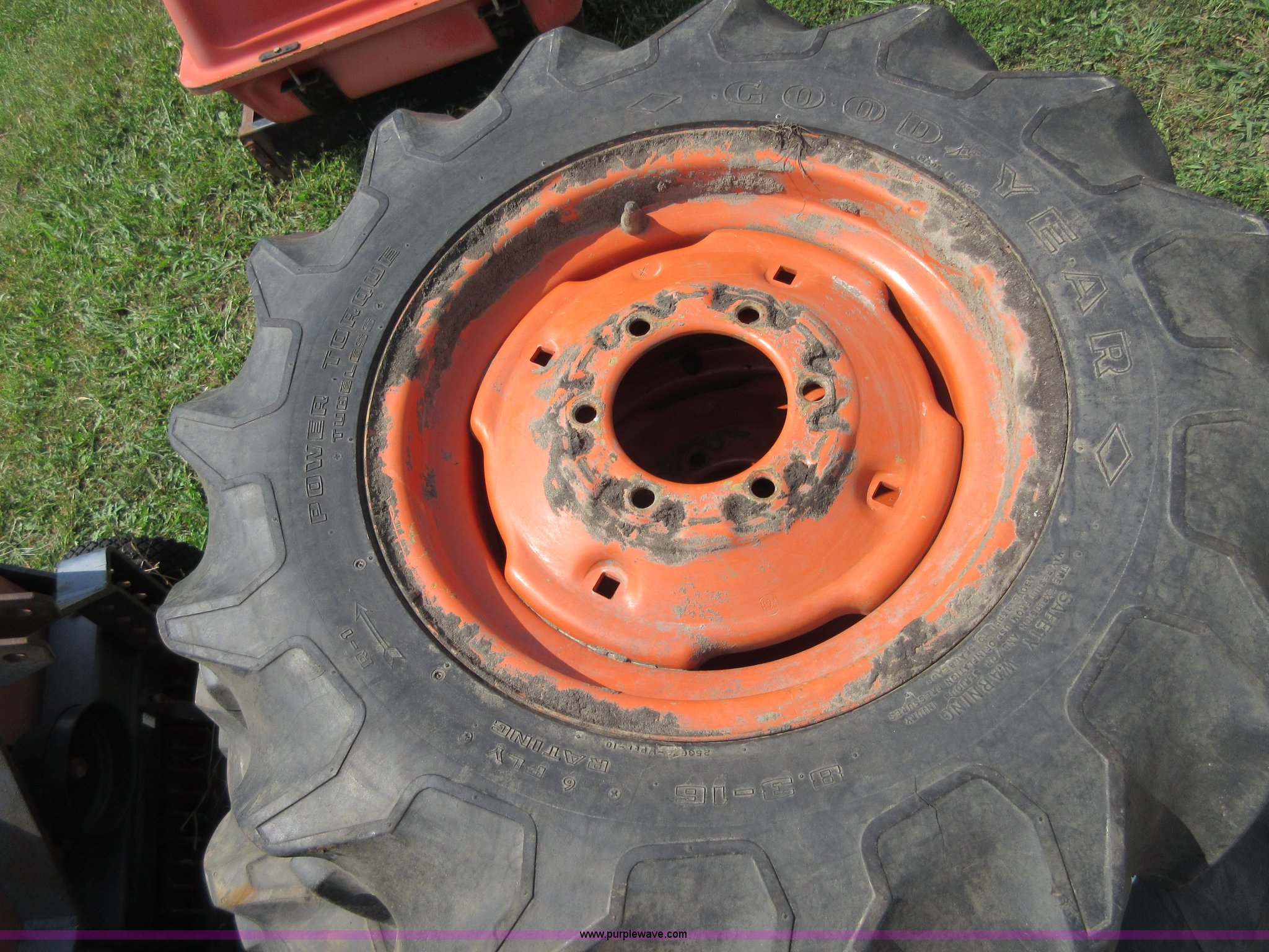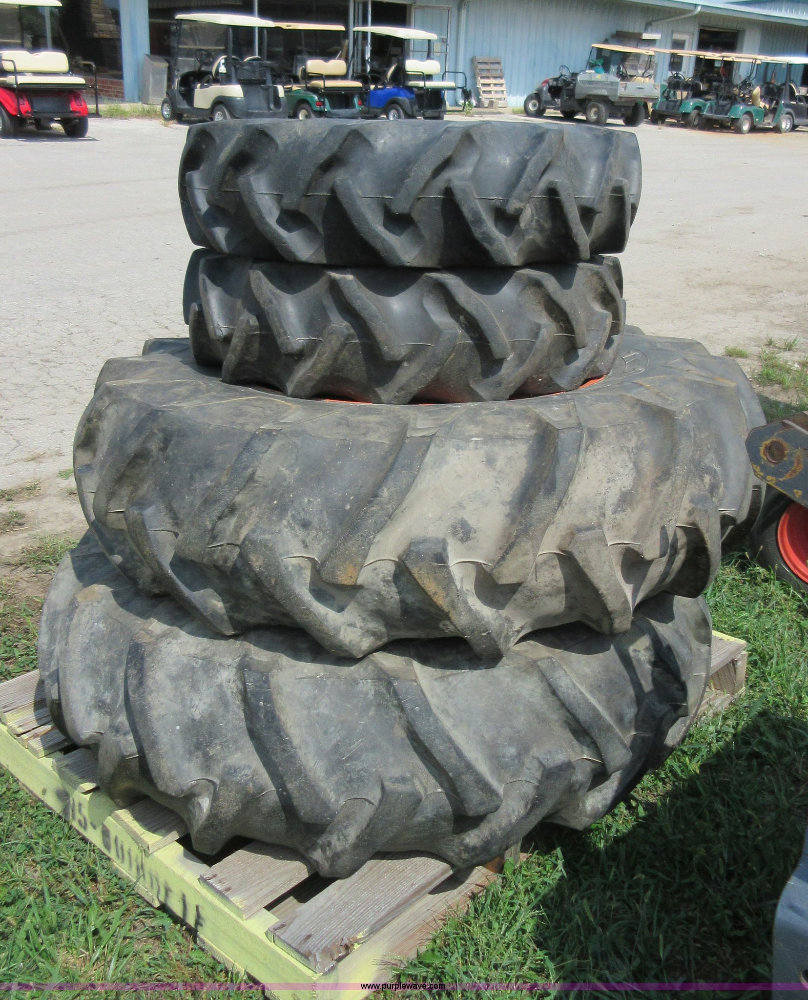 Purple Wave is selling a used Industrial Tires or Tracks in Kansas. This item is a (4) assorted tires and wheels with the following: (2) Goodyear Power Torque 8.3-16 tractor tires, (2) Brigestone Farm Service Lug 13.6-24 tractor tires, Kubota six bolt wheels
