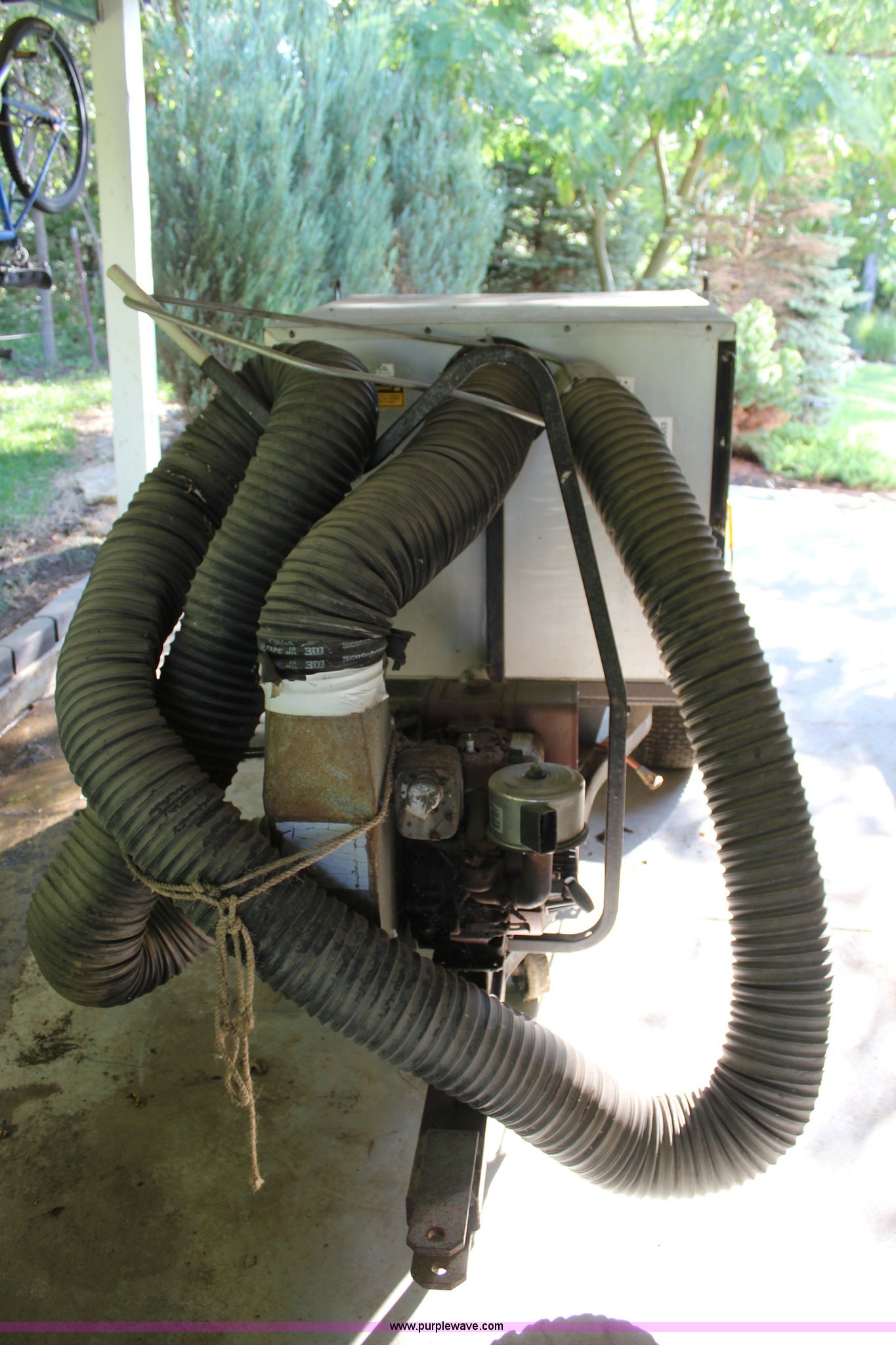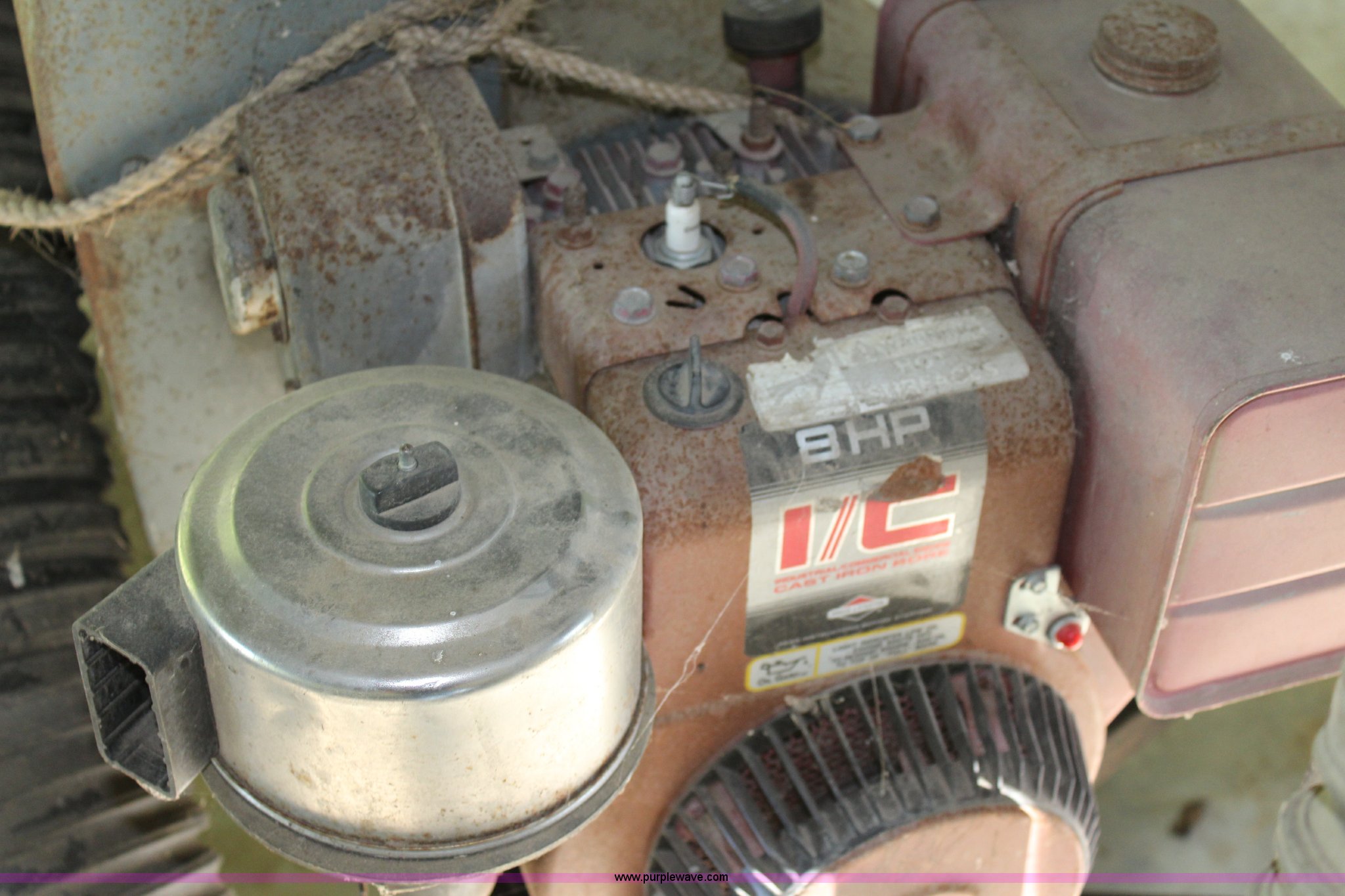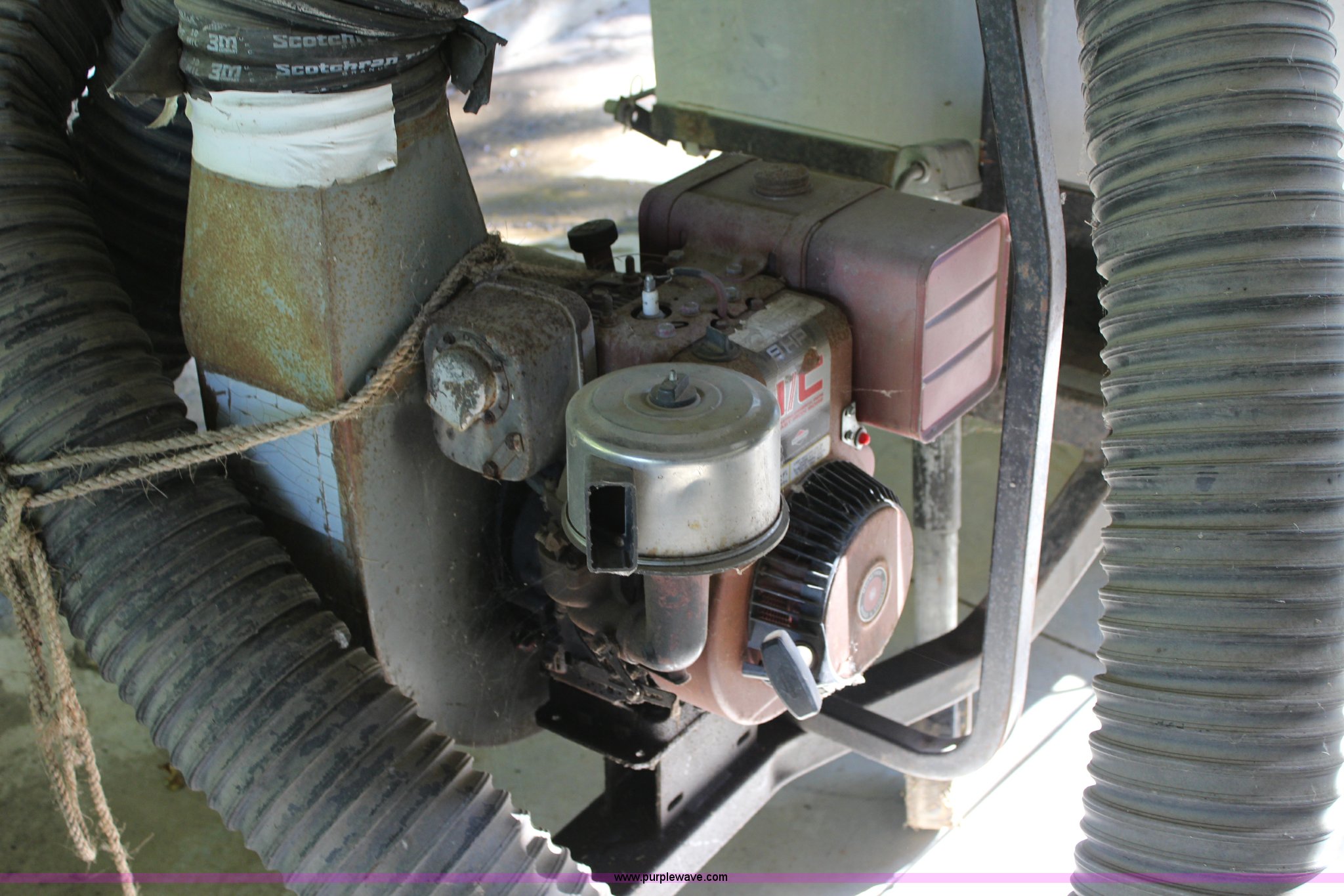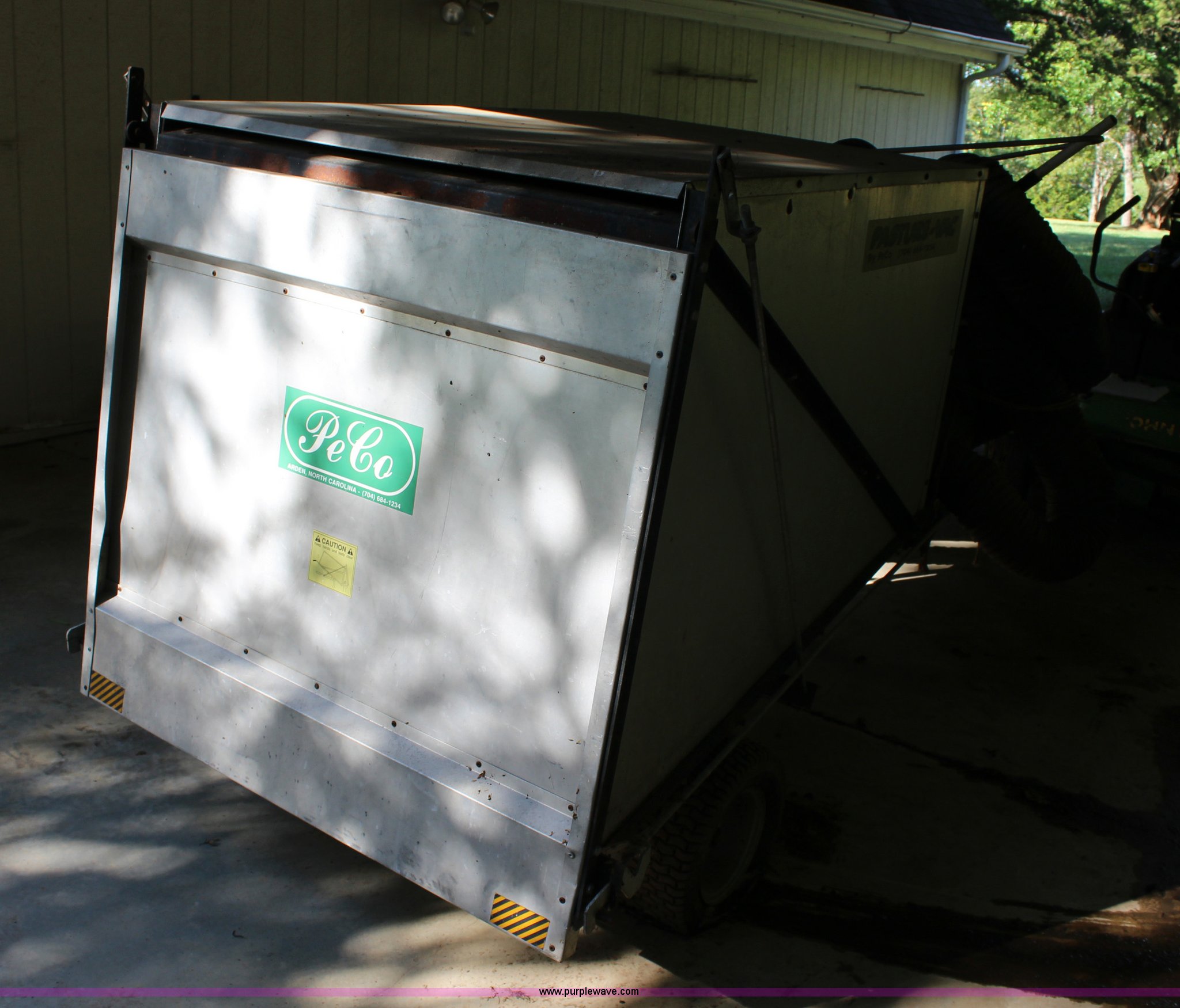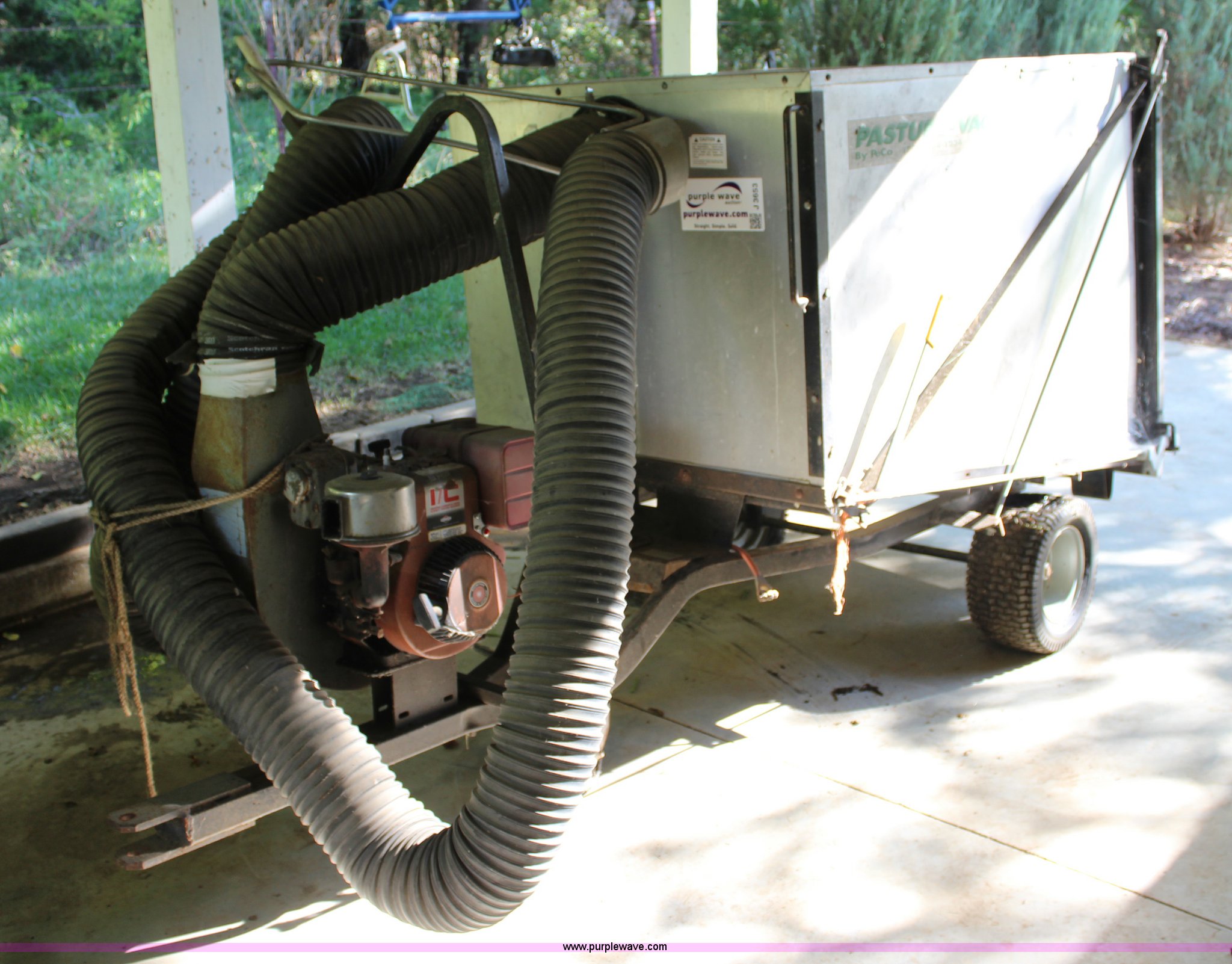Purple Wave is selling a used Lawn and Garden in Kansas. This item is a Peco Pasture Vac lawn vacuum with the following: Briggs & Stratton gas engine, 8 HP, 55"L x 37 3/4"W x 32.5"H box, Rear flip up gate, 16 x 7.50-8 tires, Flat tire