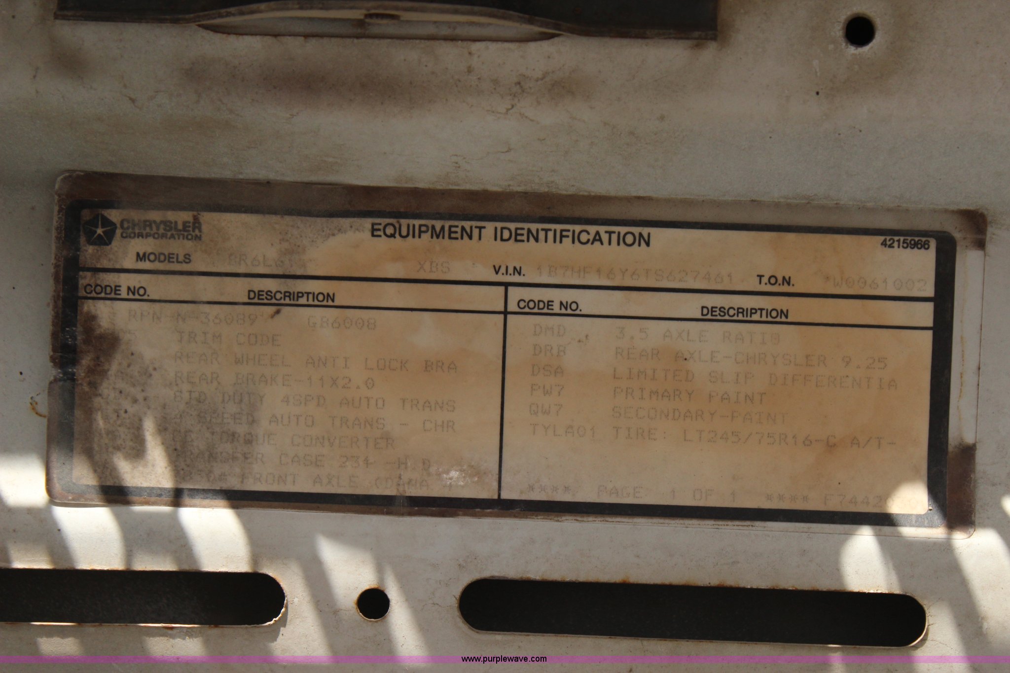 Purple Wave is selling a used 1/2 Ton Pickup or Van in Oklahoma. This item is a 1996 Dodge Ram 1500 pickup truck with the following: 142,596 miles on odometer, 5.2L V8 OHV 16V gas engine, Automatic transmission, Four wheel drive, AC and heat, Tilt, Cruise, AM/FM/cassette, Manual windows and locks, Cloth interior, Front tow hooks, Running boards, Toolbox, LT235/85R16 tires, Interior/exterior cosmetic damage, Unit# D301-344