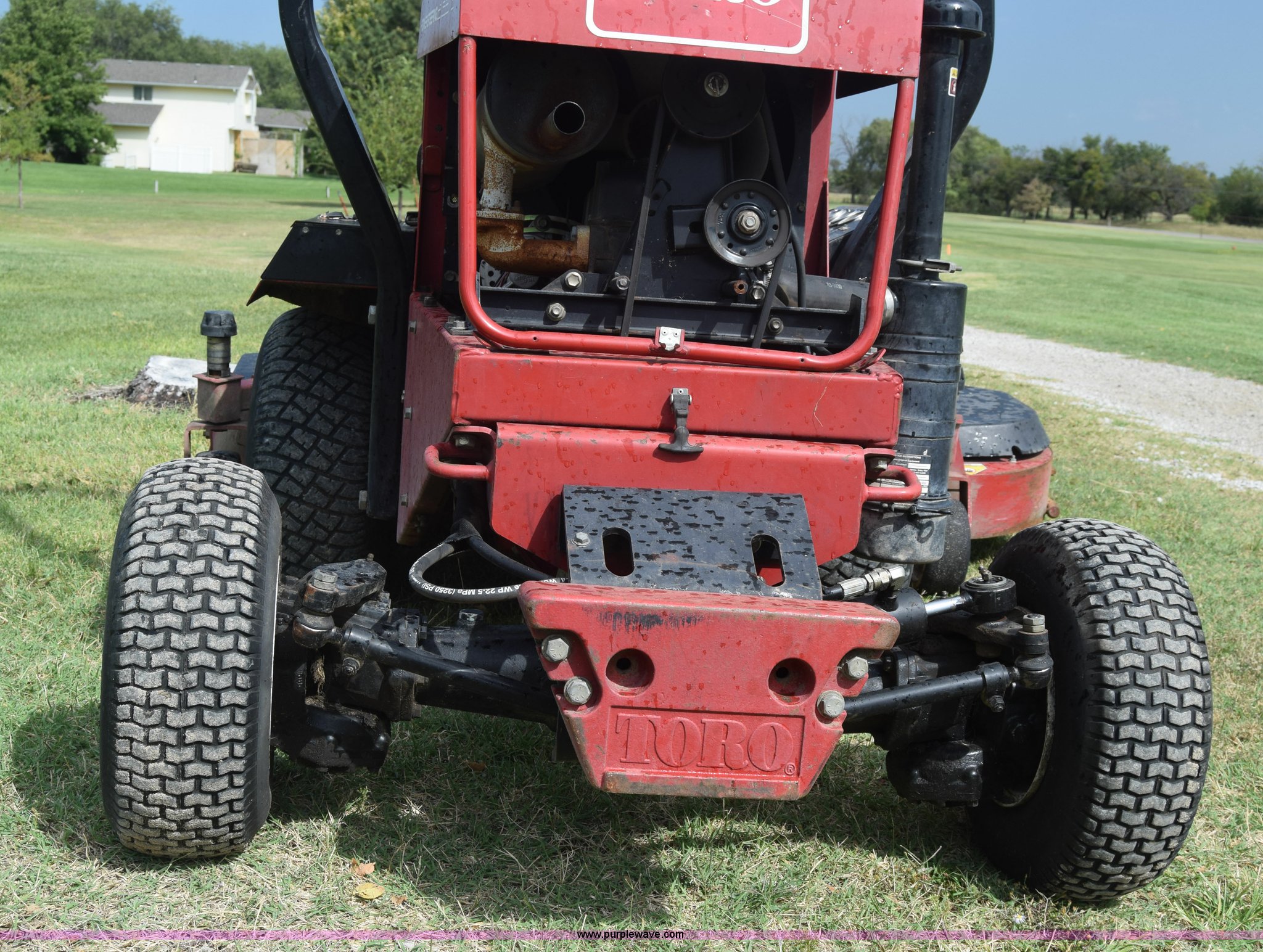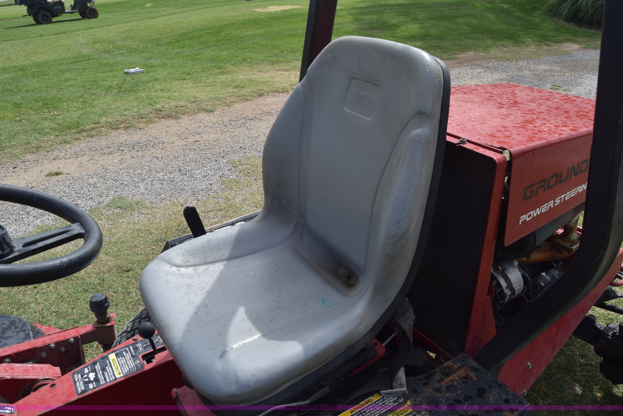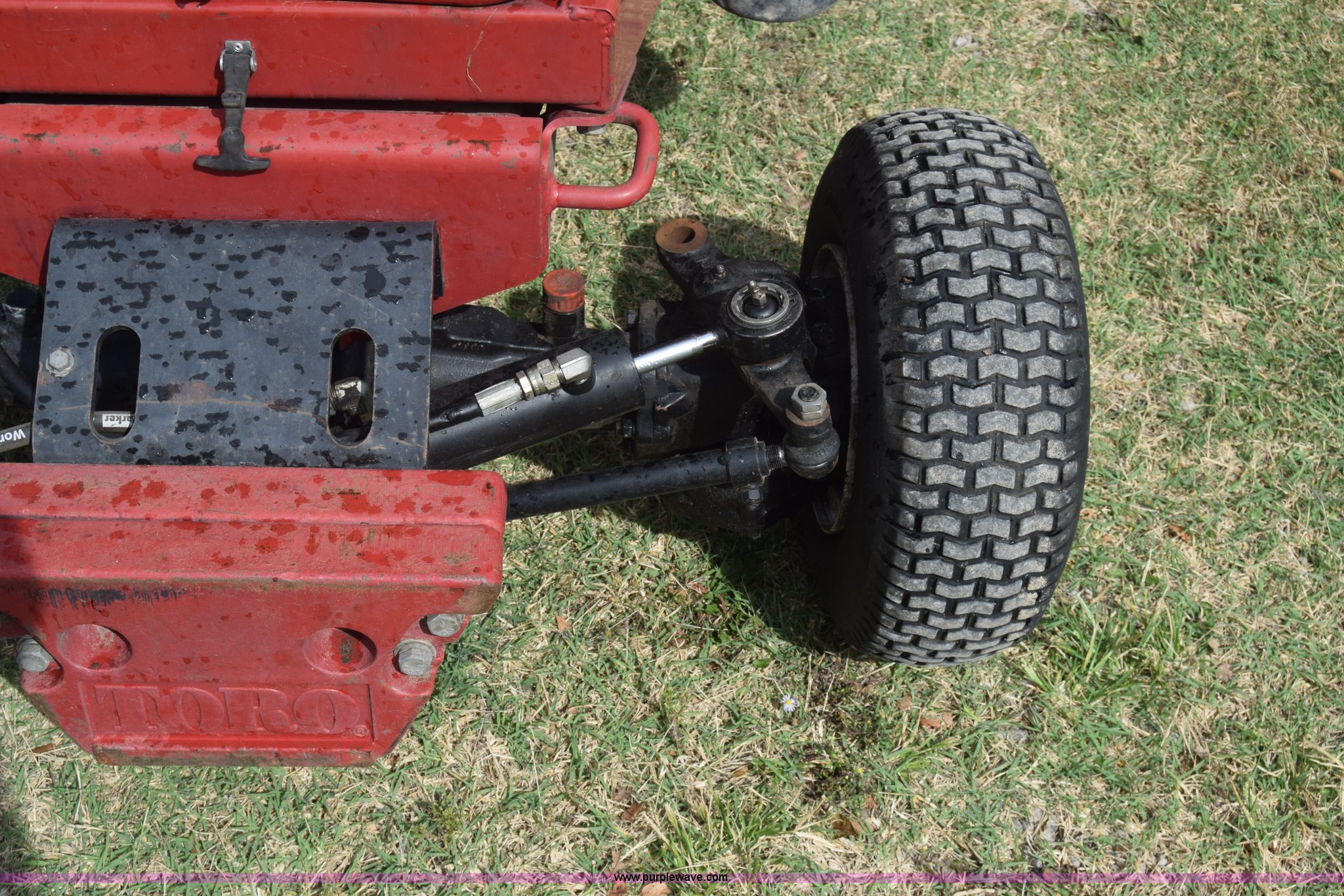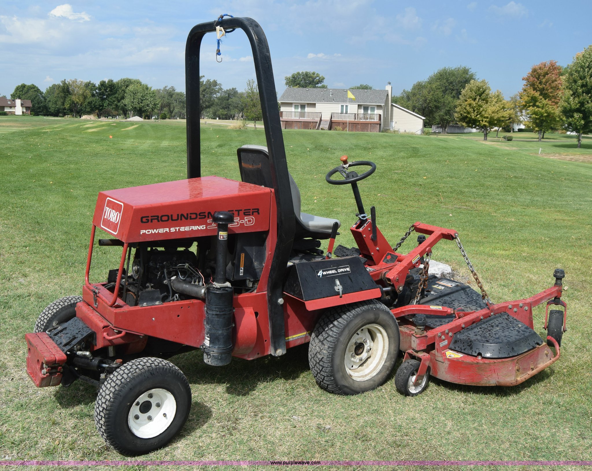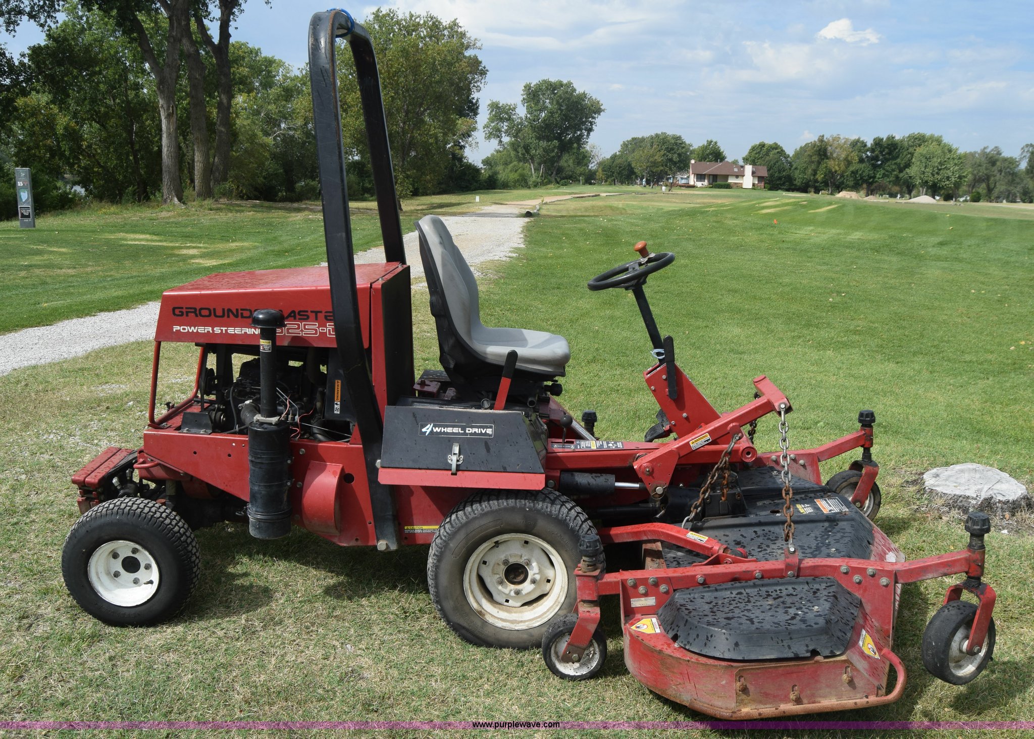 Purple Wave is selling a used Commercial Turf Mower in Kansas. This item is a Toro Groundmaster 325D lawn mower with the following: 3,909 hours on meter, 72" cut, Mitsubishi three cylinder diesel engine, 25 HP, Sunstrand variable hydrostatic transmission, Four wheel drive, Tow post roll bar, Hydraulic power steering, Hydraulic lift functions, 23x8.50-12 tires, Serial 210000307