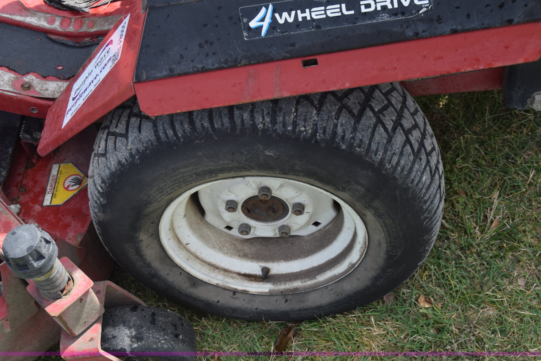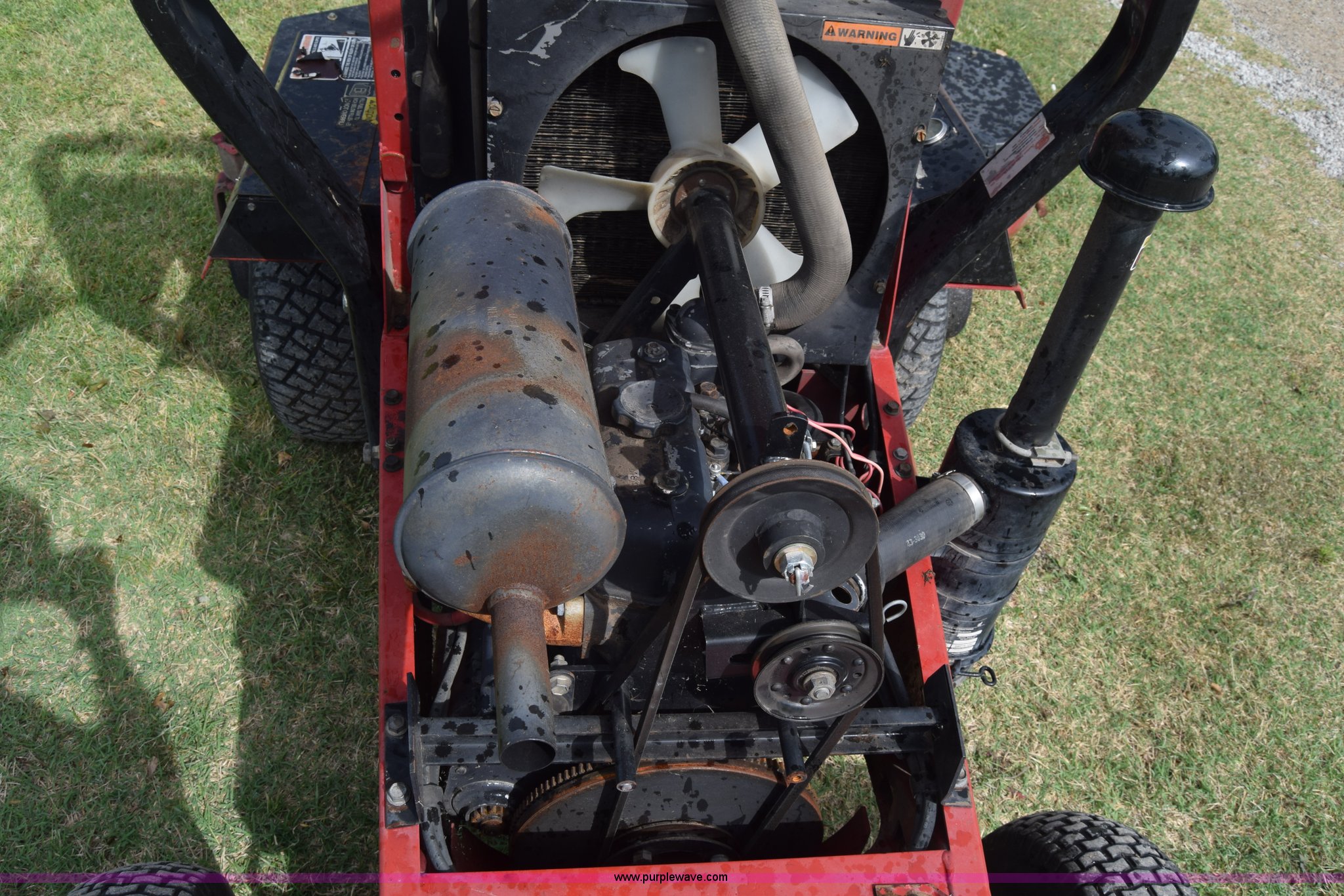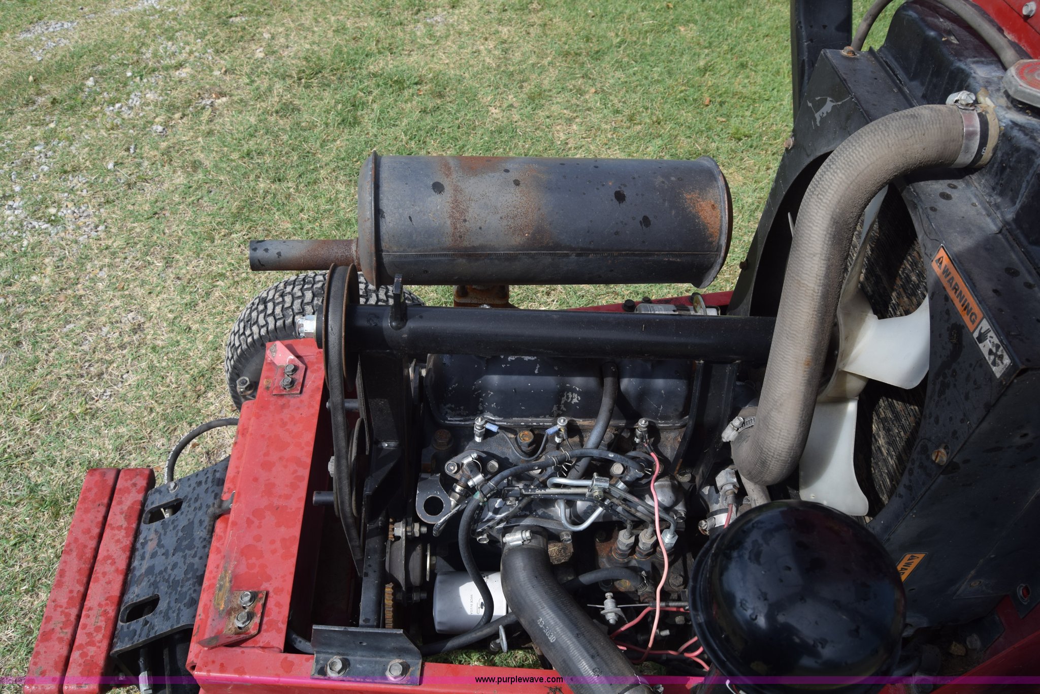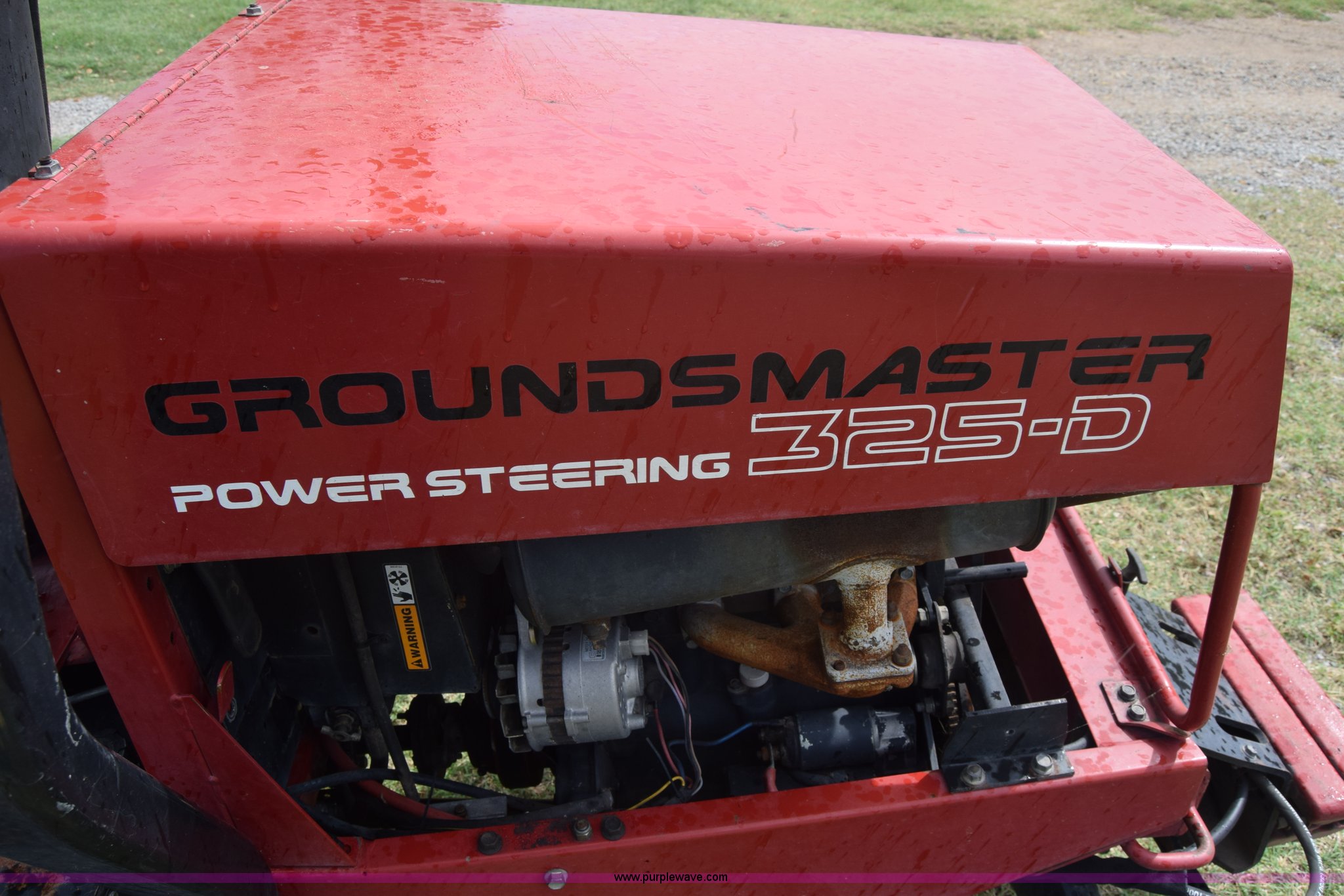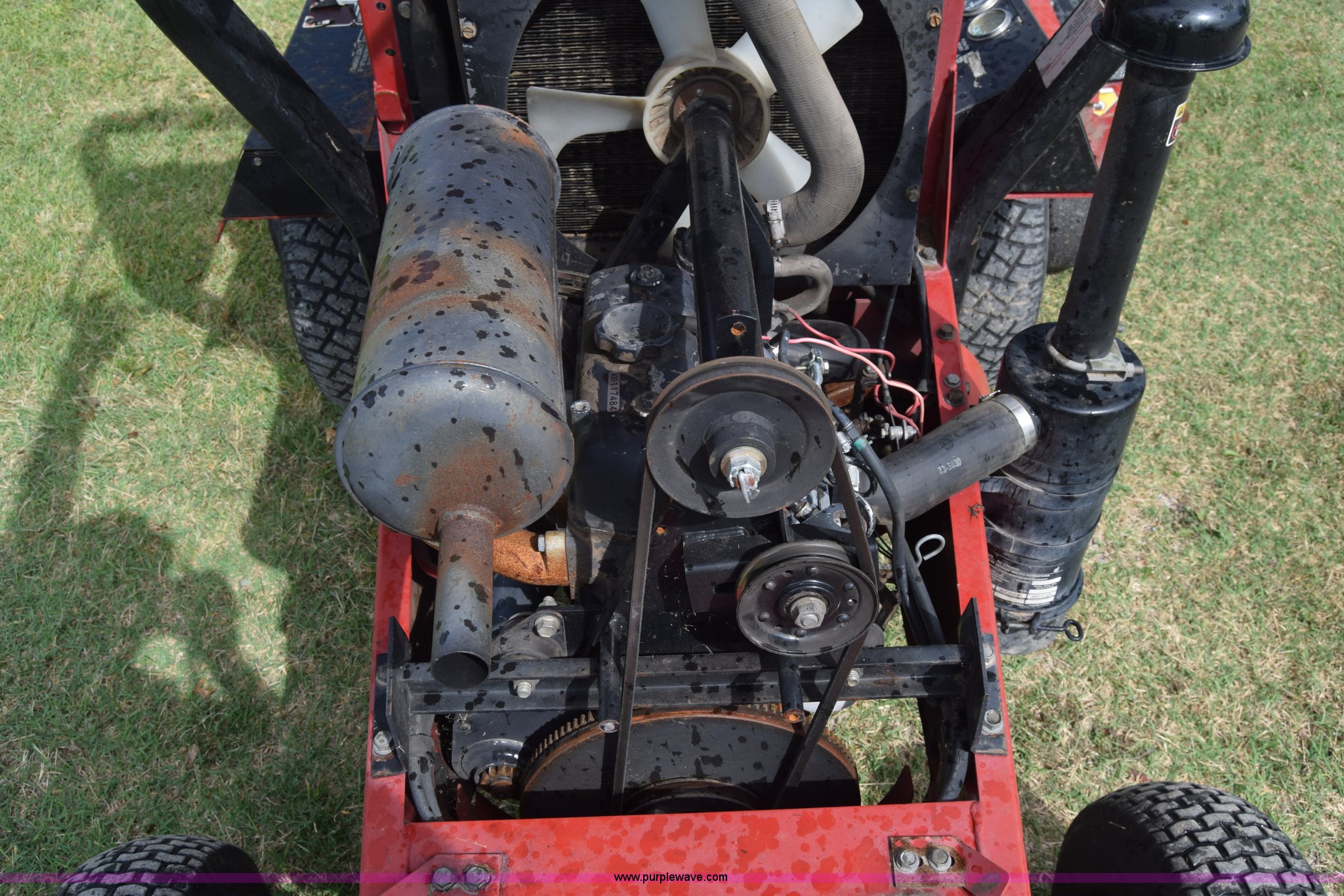 Purple Wave is selling a used Commercial Turf Mower in Kansas. This item is a Toro Groundmaster 325D lawn mower with the following: 3,909 hours on meter, 72" cut, Mitsubishi three cylinder diesel engine, 25 HP, Sunstrand variable hydrostatic transmission, Four wheel drive, Tow post roll bar, Hydraulic power steering, Hydraulic lift functions, 23x8.50-12 tires, Serial 210000307
