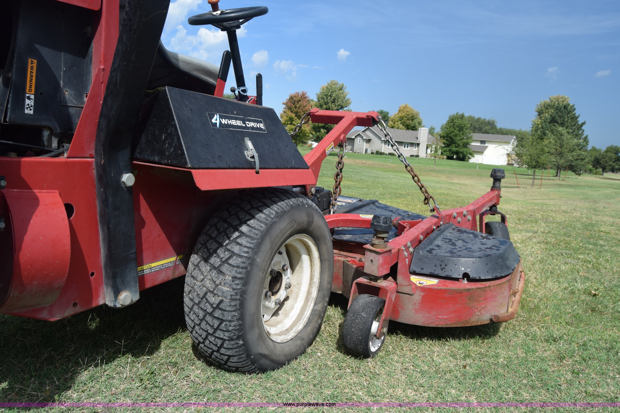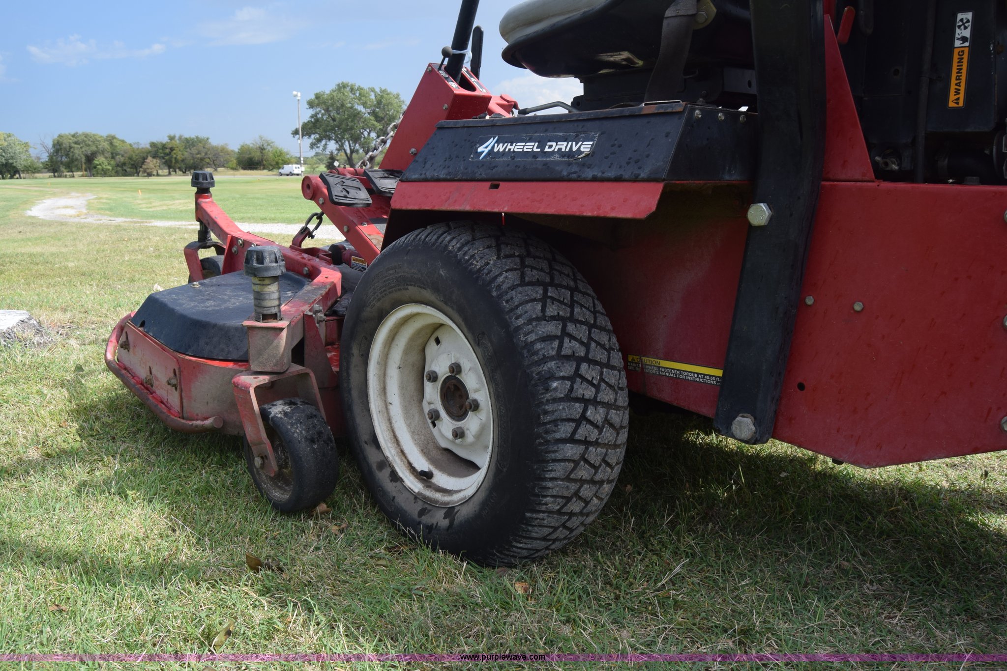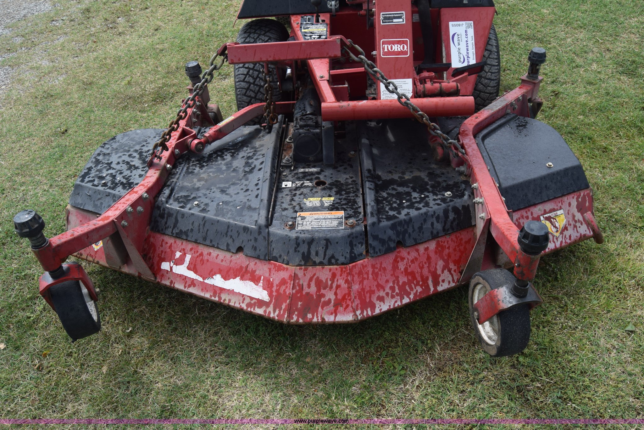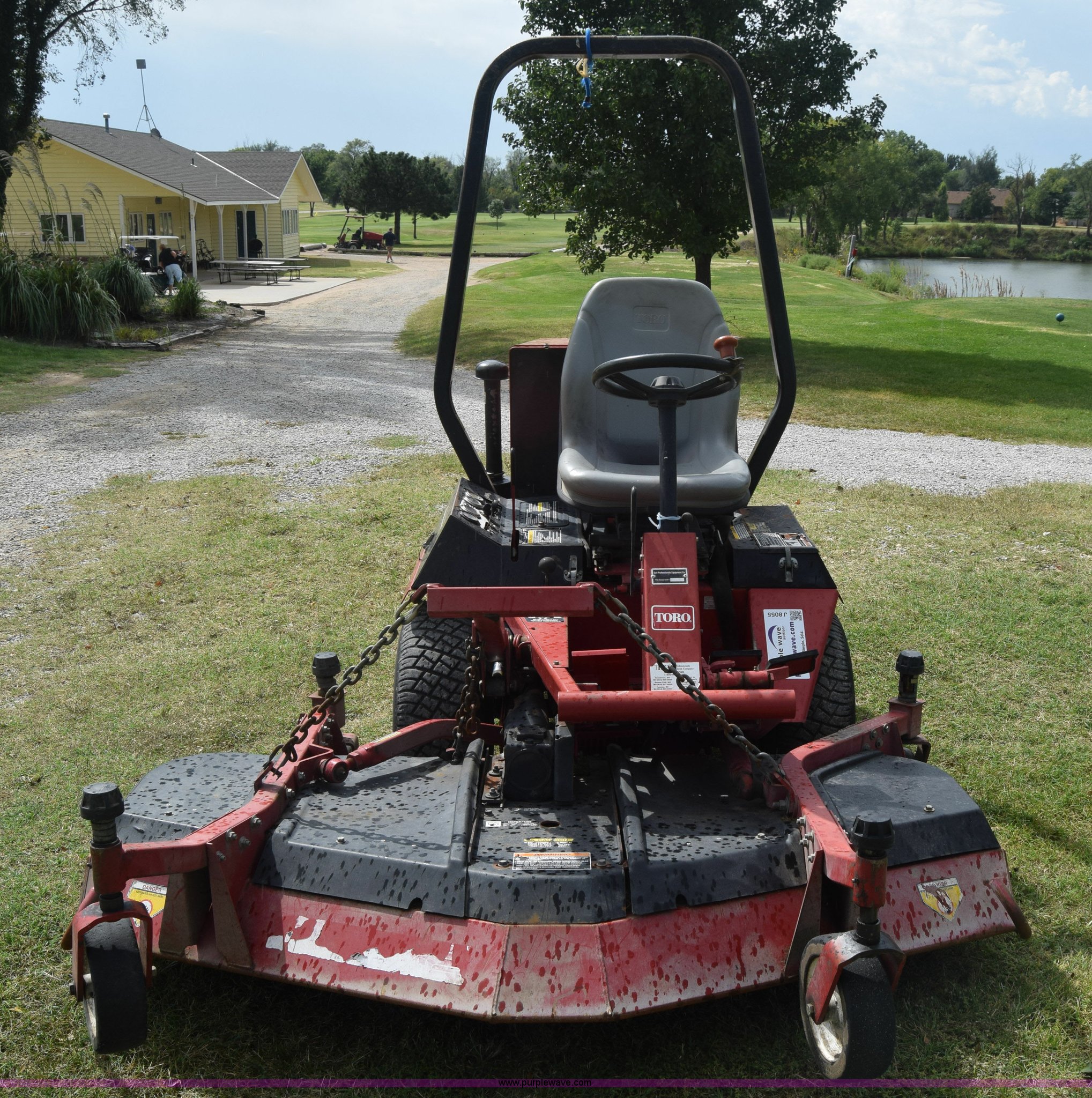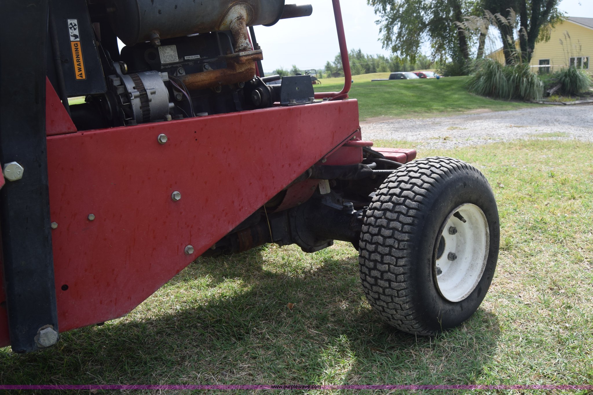 Purple Wave is selling a used Commercial Turf Mower in Kansas. This item is a Toro Groundmaster 325D lawn mower with the following: 3,909 hours on meter, 72" cut, Mitsubishi three cylinder diesel engine, 25 HP, Sunstrand variable hydrostatic transmission, Four wheel drive, Tow post roll bar, Hydraulic power steering, Hydraulic lift functions, 23x8.50-12 tires, Serial 210000307