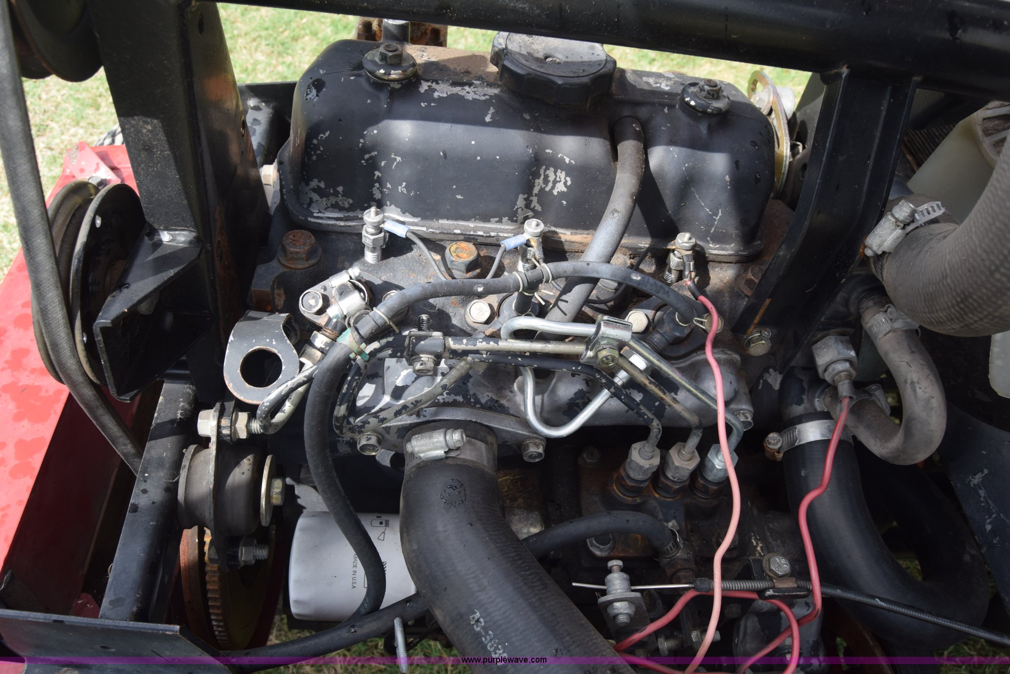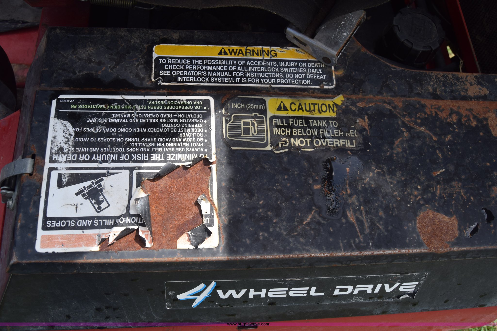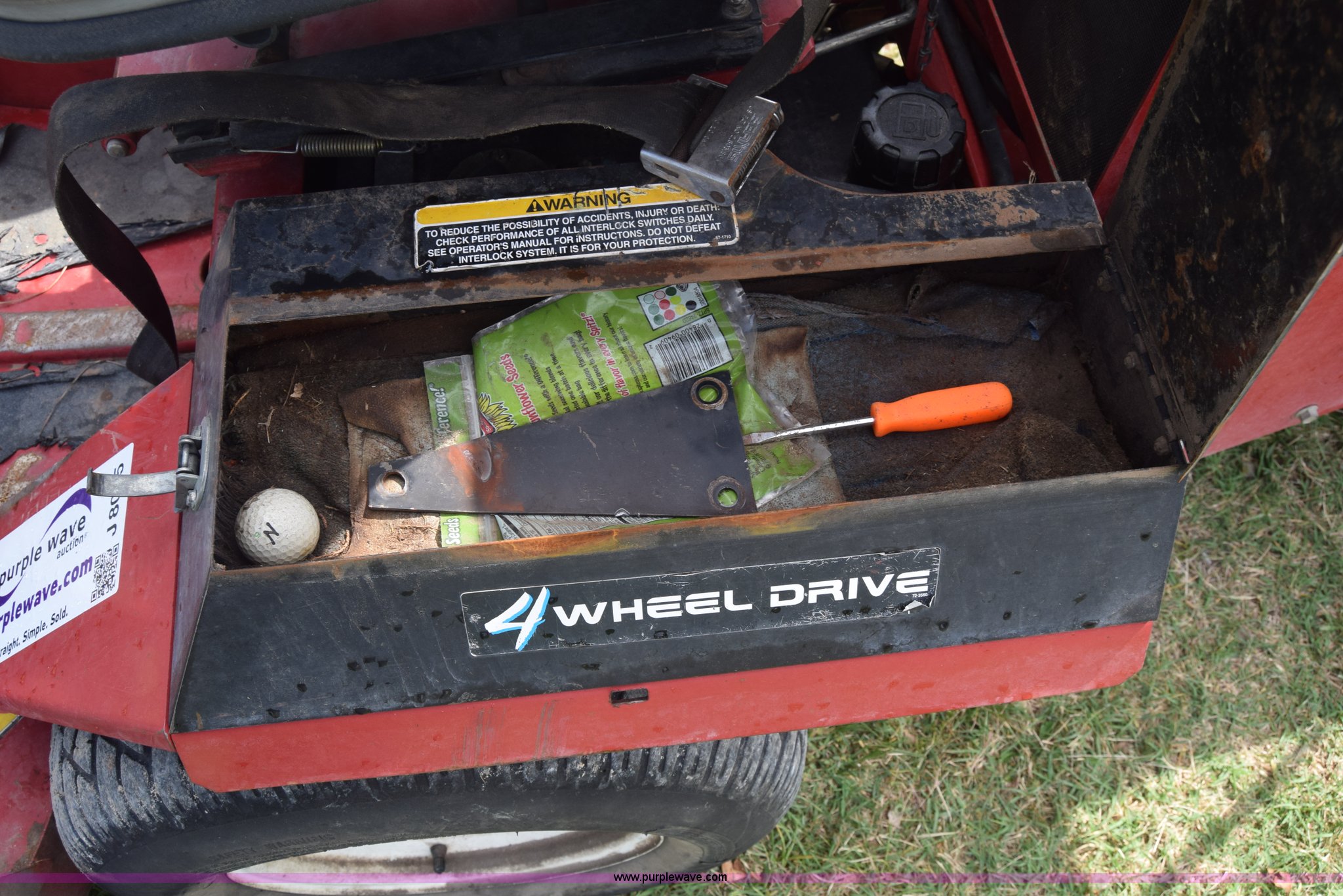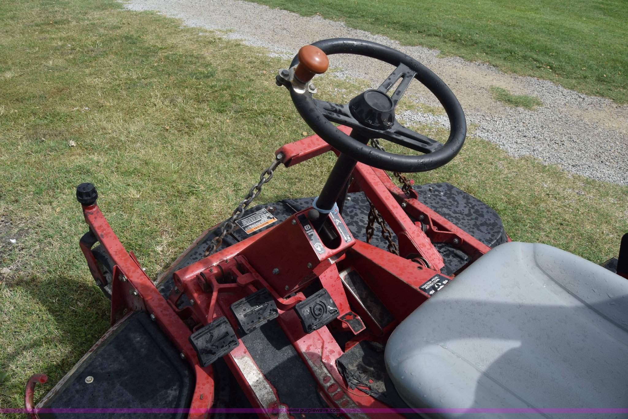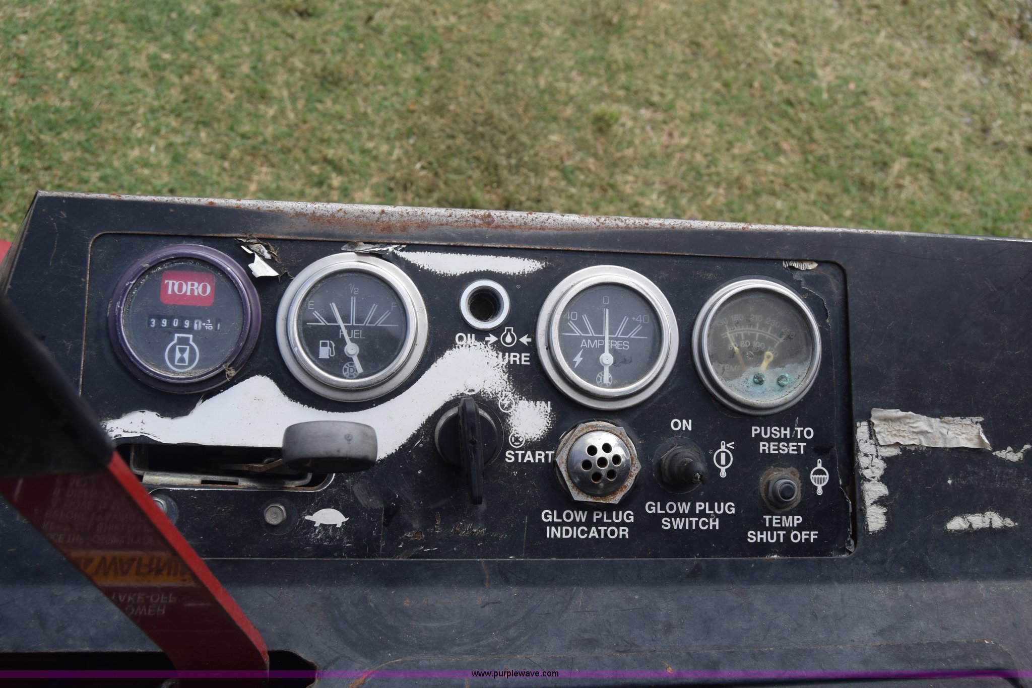 Purple Wave is selling a used Commercial Turf Mower in Kansas. This item is a Toro Groundmaster 325D lawn mower with the following: 3,909 hours on meter, 72" cut, Mitsubishi three cylinder diesel engine, 25 HP, Sunstrand variable hydrostatic transmission, Four wheel drive, Tow post roll bar, Hydraulic power steering, Hydraulic lift functions, 23x8.50-12 tires, Serial 210000307