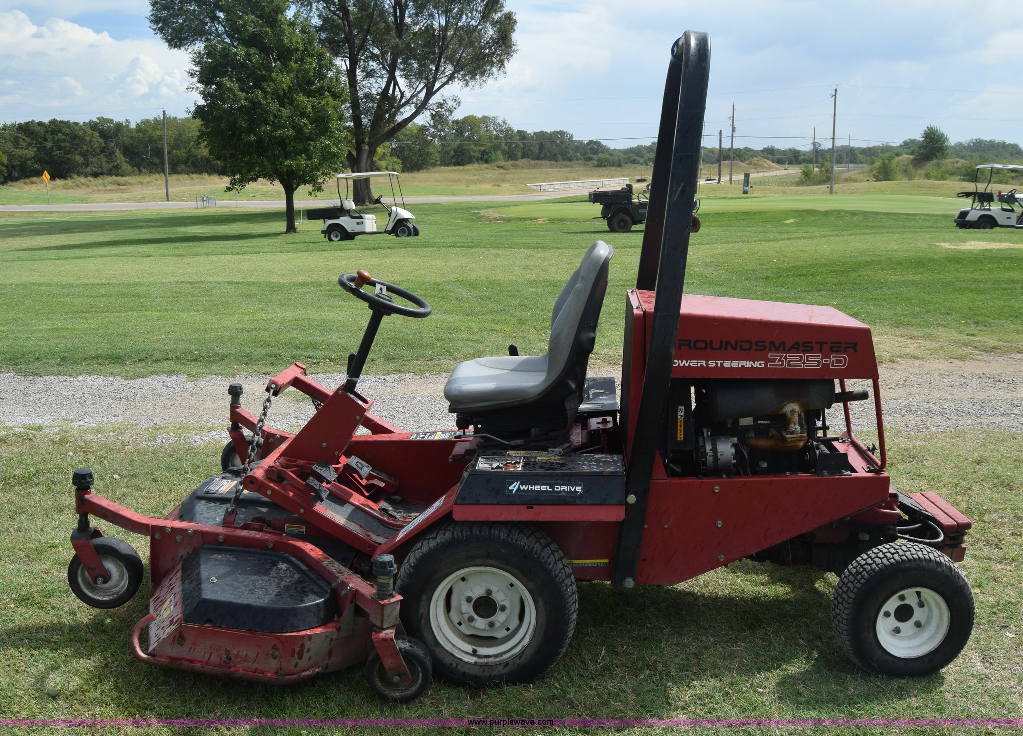 Toro Groundmaster 325D lawn mower. 3,909 hours on meter, 72" cut, Mitsubishi three cylinder diesel engine 25 HP, Sunstrand variable hydrostatic transmission, Four wheel drive, Tow post roll bar, Hydraulic power steering, Hydraulic lift functions, 23x8.50-12 tires, Serial 210000307. Pine Bay Golf Course. 6615 S Grove. Wichita, KS 67216
