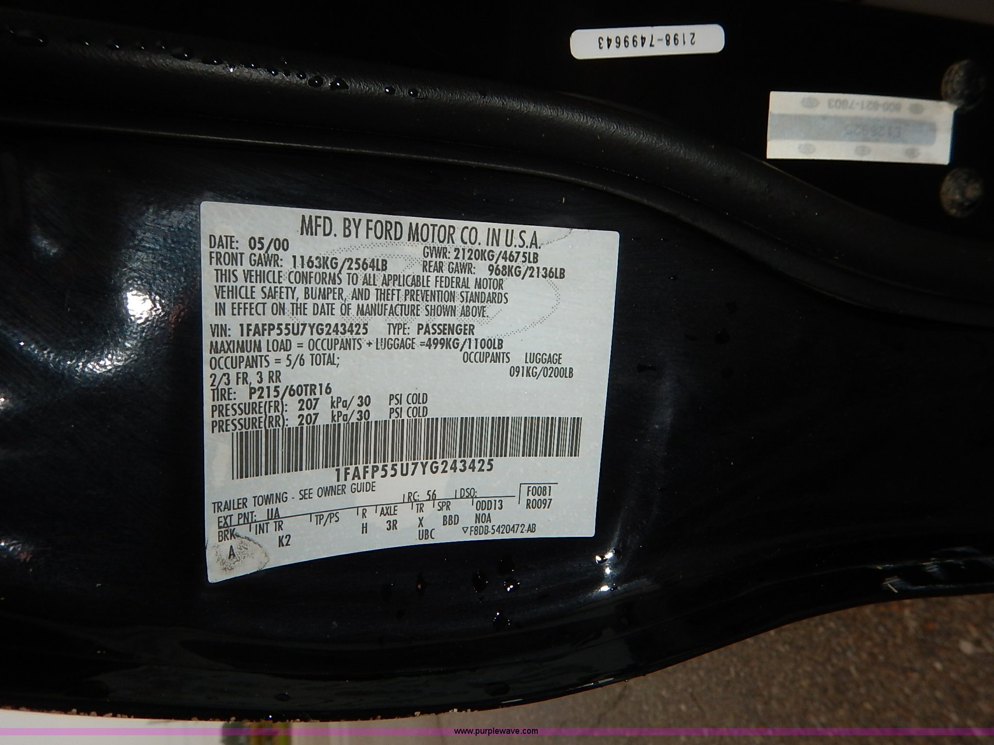 Purple Wave is selling a used Passenger Vehicle in Kansas. This item is a 2000 Ford Taurus SE with the following: 172,103 miles on odometer, 3.0L V6 OHV 12V gas engine, Automatic transmission, AC and heat, Tilt, Cruise, AM/FM, Power windows, locks, mirrors, and seat, Cloth interior, 215/60R16 tires, Interior/exterior cosmetic damage, Dents, Scratches, Paint chipping