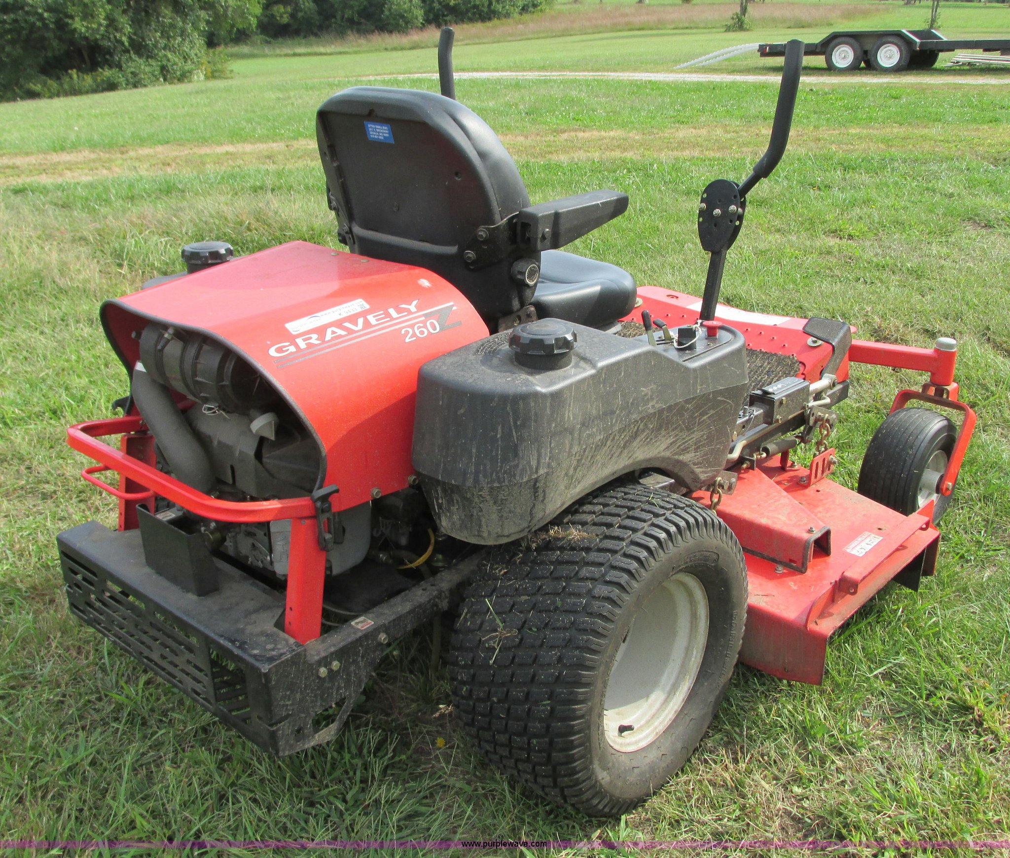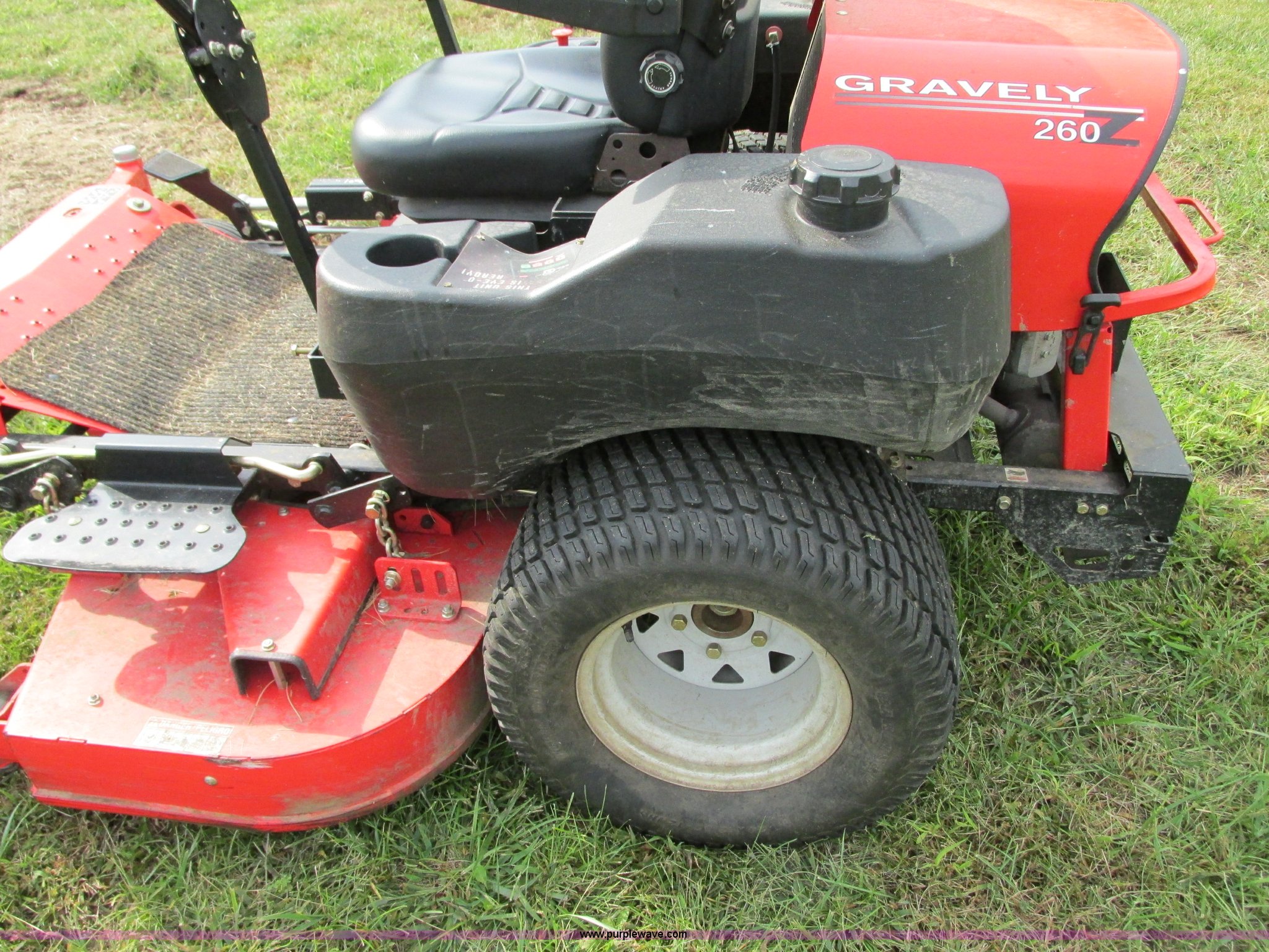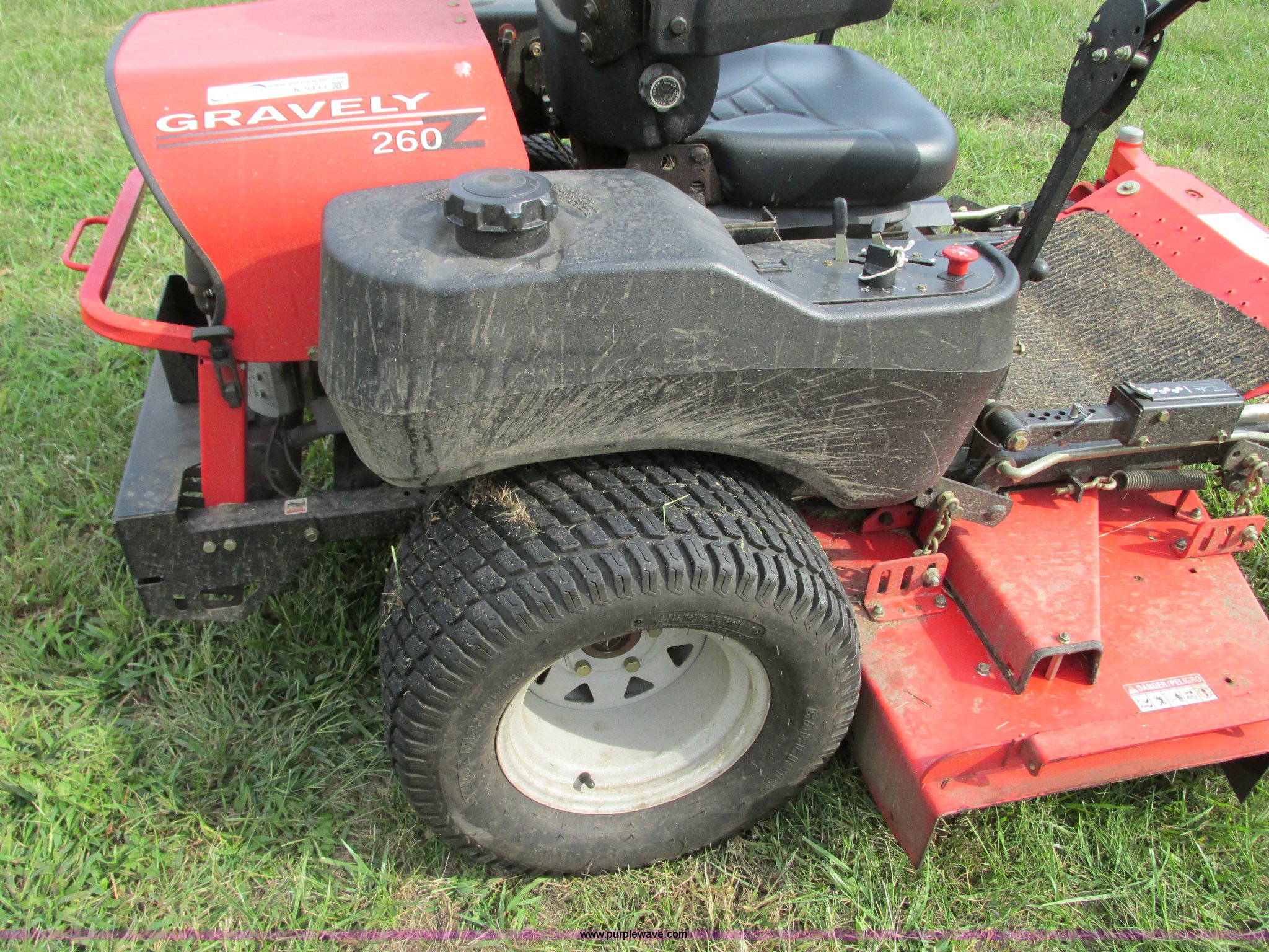 Purple Wave is selling a used Lawn Mower in Missouri. This item is a 2005 Gravely 260Z ZTR lawn mower with the following: Model 992088, 634 hours on meter, 60" cut, Kawasaki F14721V two cylinder gas engine, 25 HP, Hydrostatic transmission, Dual six gallon fuel tanks, 15x6.00-6 front tires, 24x12.00-12 rear tires, Battery replaced in 2015, Serial 000961