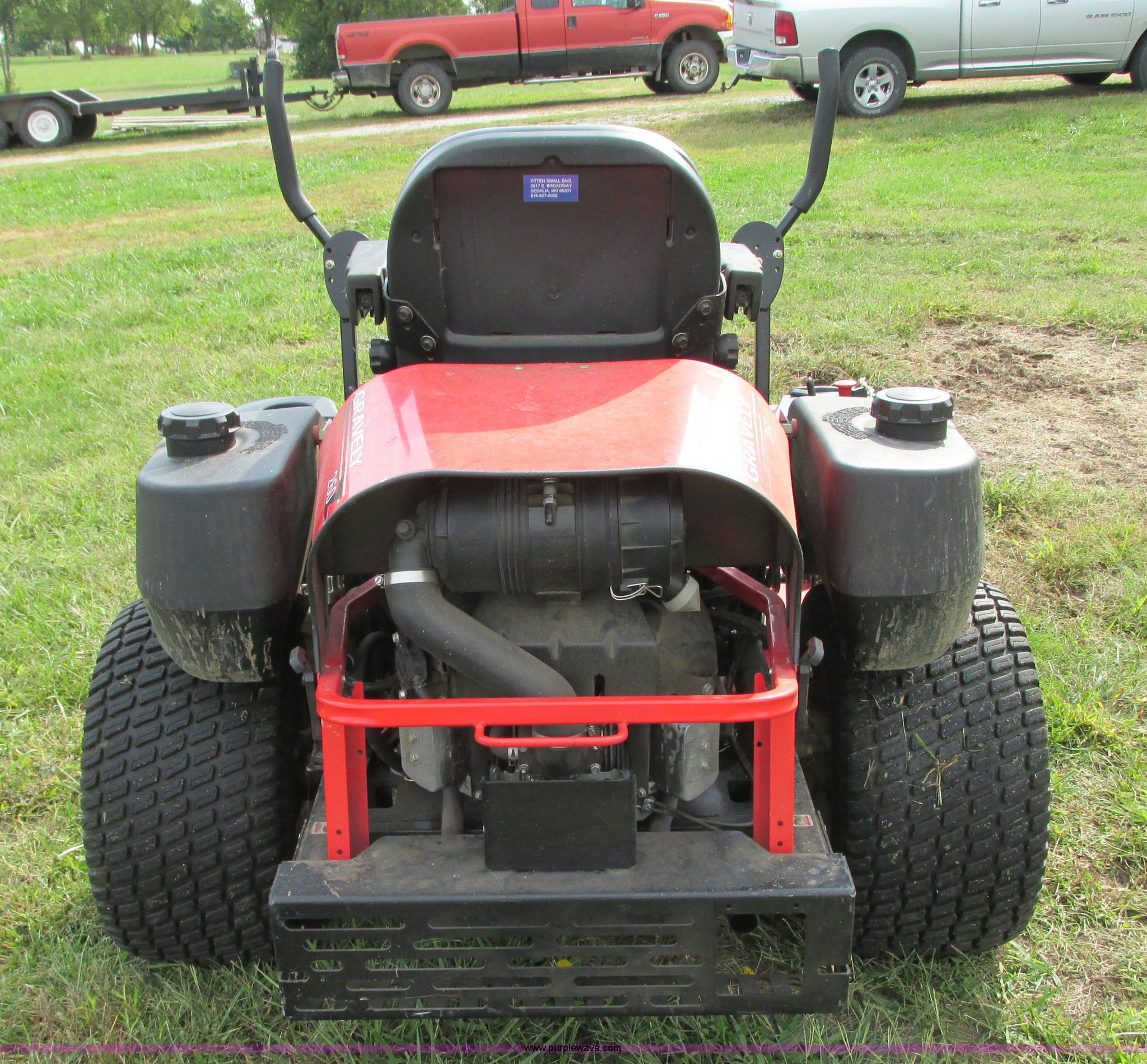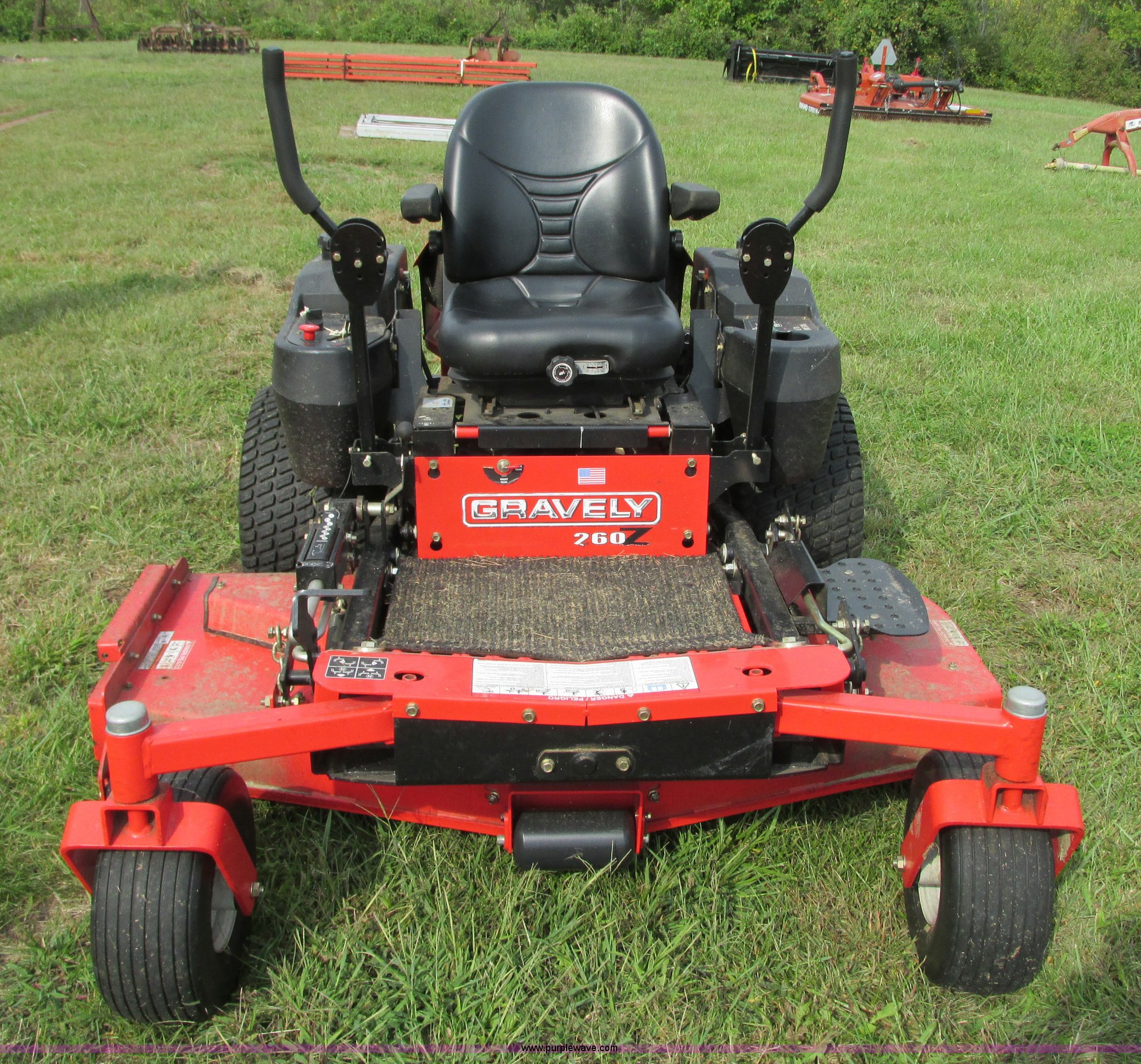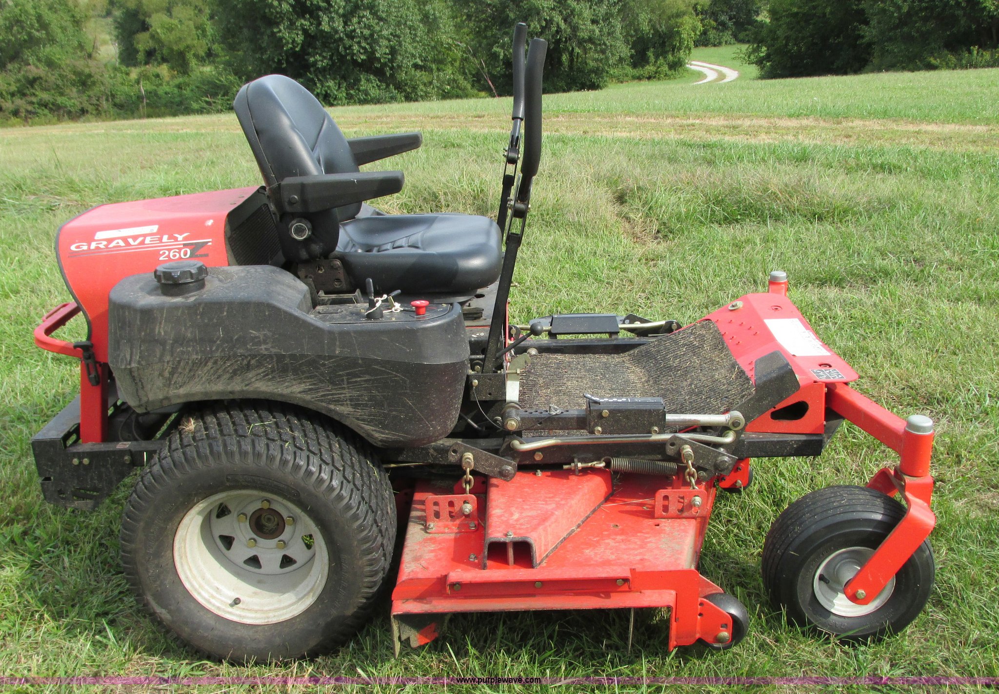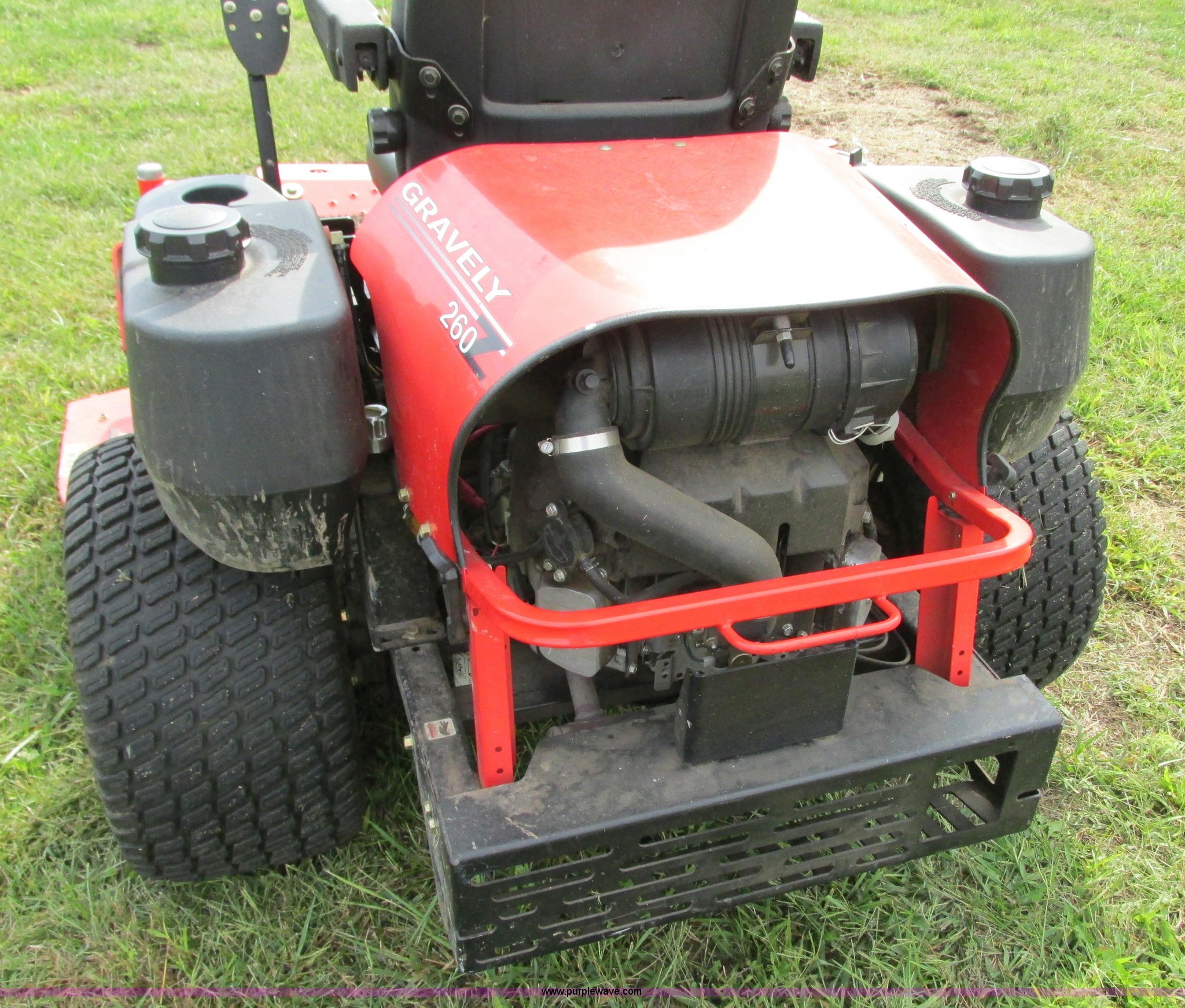 Purple Wave is selling a used Lawn Mower in Missouri. This item is a 2005 Gravely 260Z ZTR lawn mower with the following: Model 992088, 634 hours on meter, 60" cut, Kawasaki F14721V two cylinder gas engine, 25 HP, Hydrostatic transmission, Dual six gallon fuel tanks, 15x6.00-6 front tires, 24x12.00-12 rear tires, Battery replaced in 2015, Serial 000961