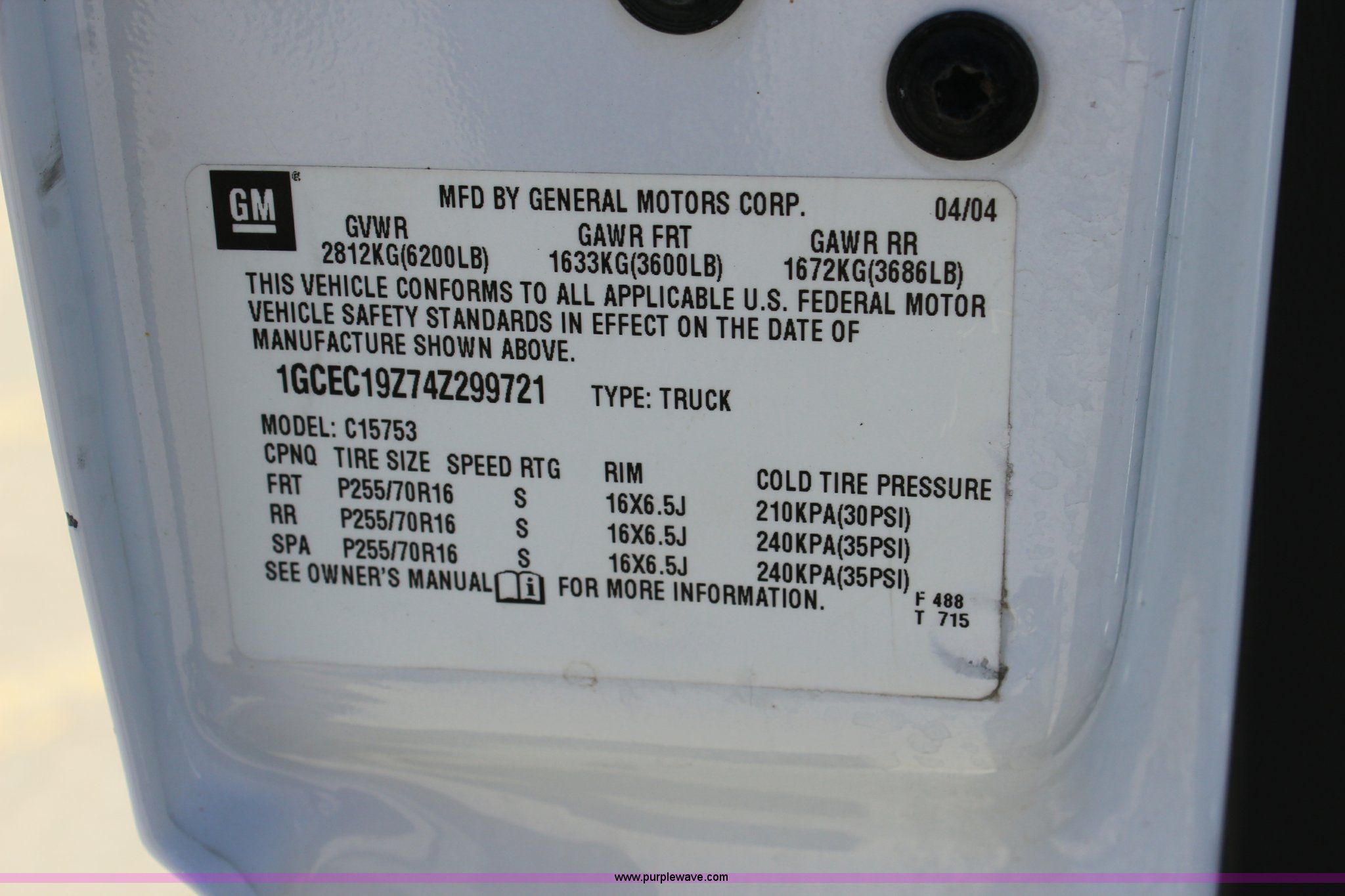 2004 Chevrolet Silverado 1500 Ext. Cab pickup truck. 67,120 miles on odometer, 5.3L V8 OHV 16V gas engine, Automatic transmission, AC and heat, Tilt, Cruise, AM/FM/cassette, Manual windows and locks, Vinyl interior, Front tow hooks, Receiver hitch, 255/70R16 tires, Unit# 0894. Completed bill of sale documentation required prior to release of paid invoice. 1GCEC19Z74Z299721. Westar Energy. 4001 NW 14th St. Topeka, KS 66618