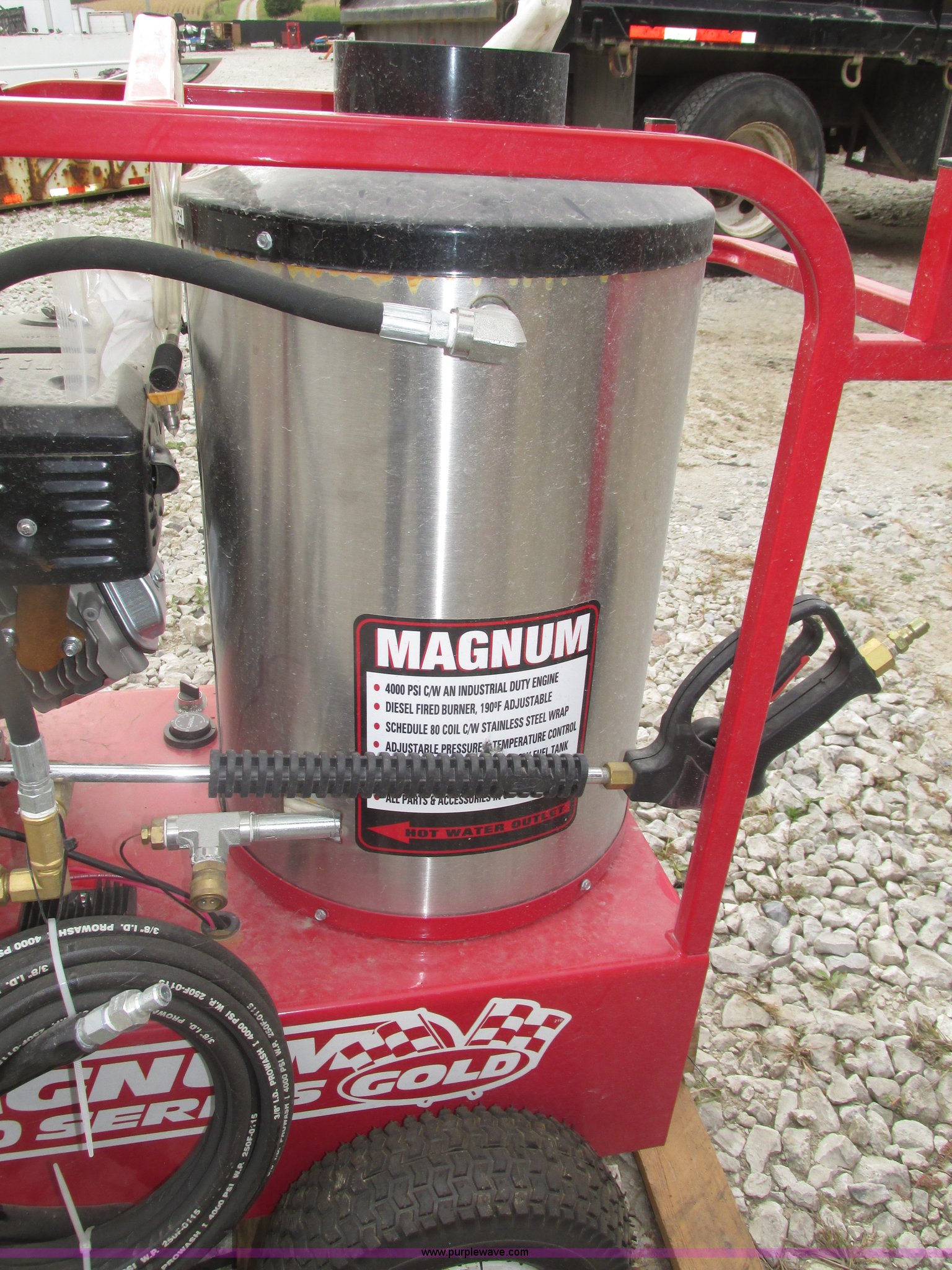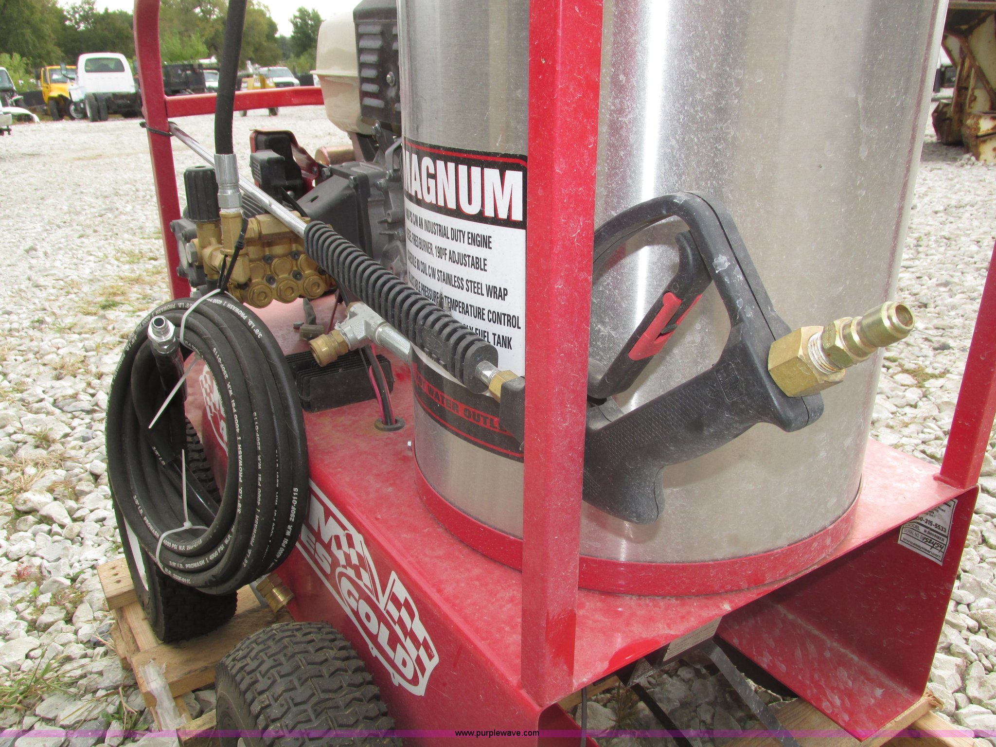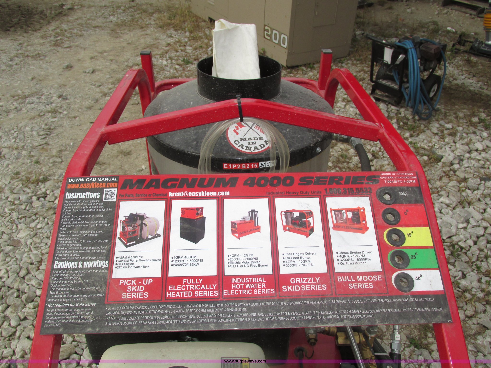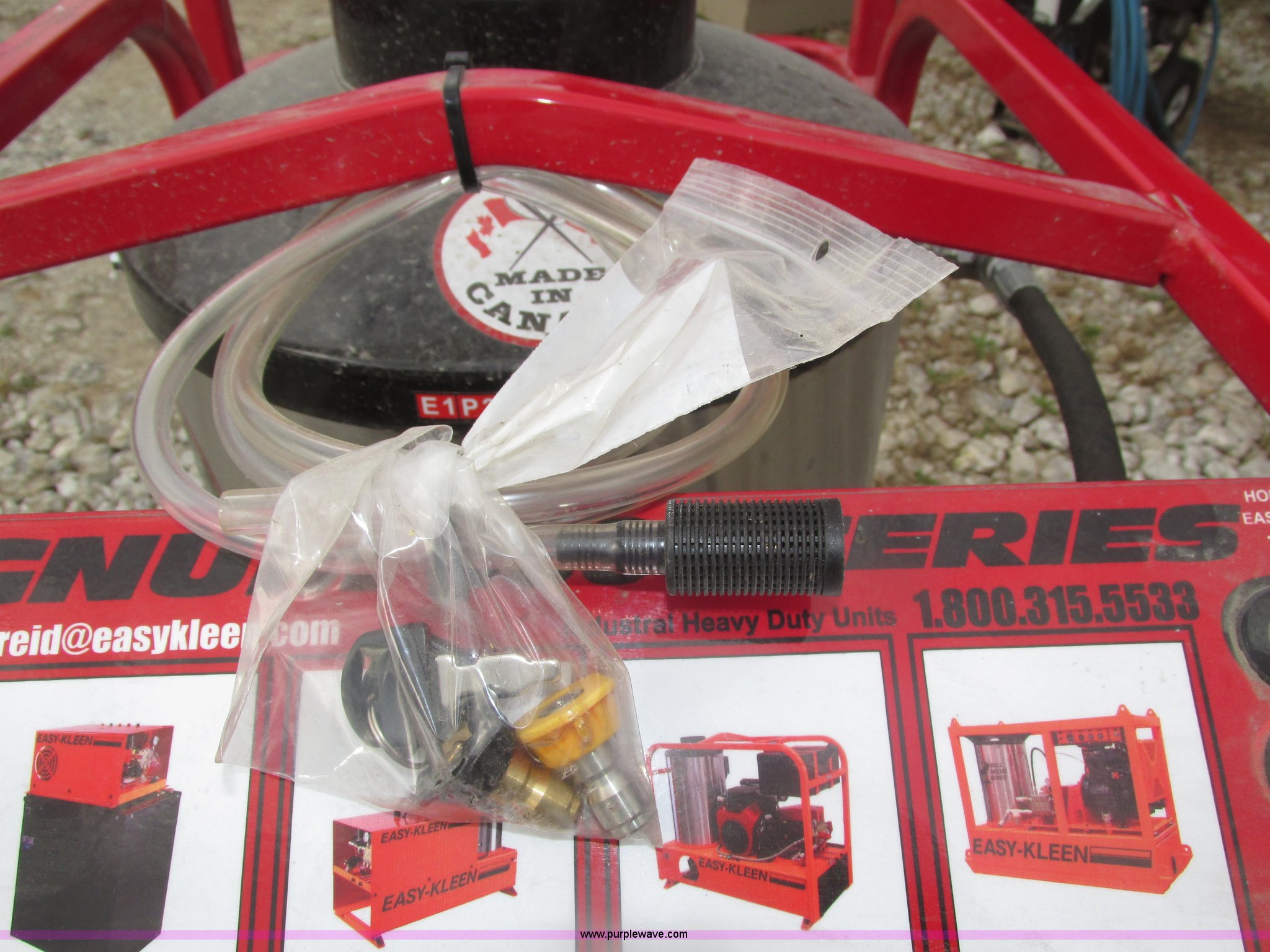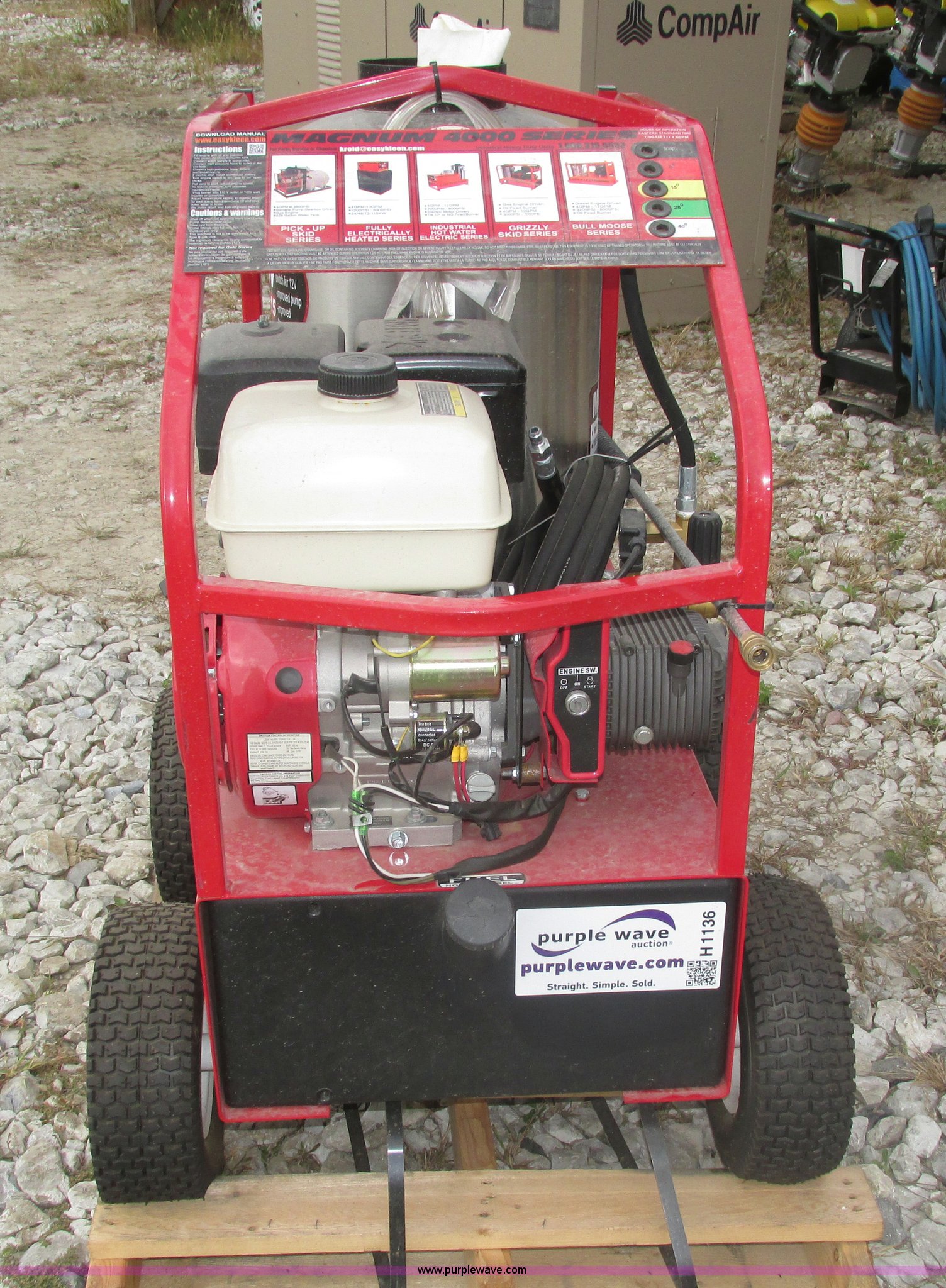Purple Wave is selling a used Pressure Washer in Nebraska. This item is a 2015 Easy-Kleen RB5050HR Magnum hot water pressure washer with the following: Lifan single cylinder gas engine, 15 HP, 4,000 psi maximum pressure, Adjustable burner control, Siphon attachment, No. 2 diesel fired, Electric or manual start, (2) keys, Wand and hose, (2) tips, 12V constant duty ignition, Lifting eye, Hose hanger, 13 x 5.00-6 pneumatic tires, Diesel fuel tank cap cracked, Unused, Serial EK152454