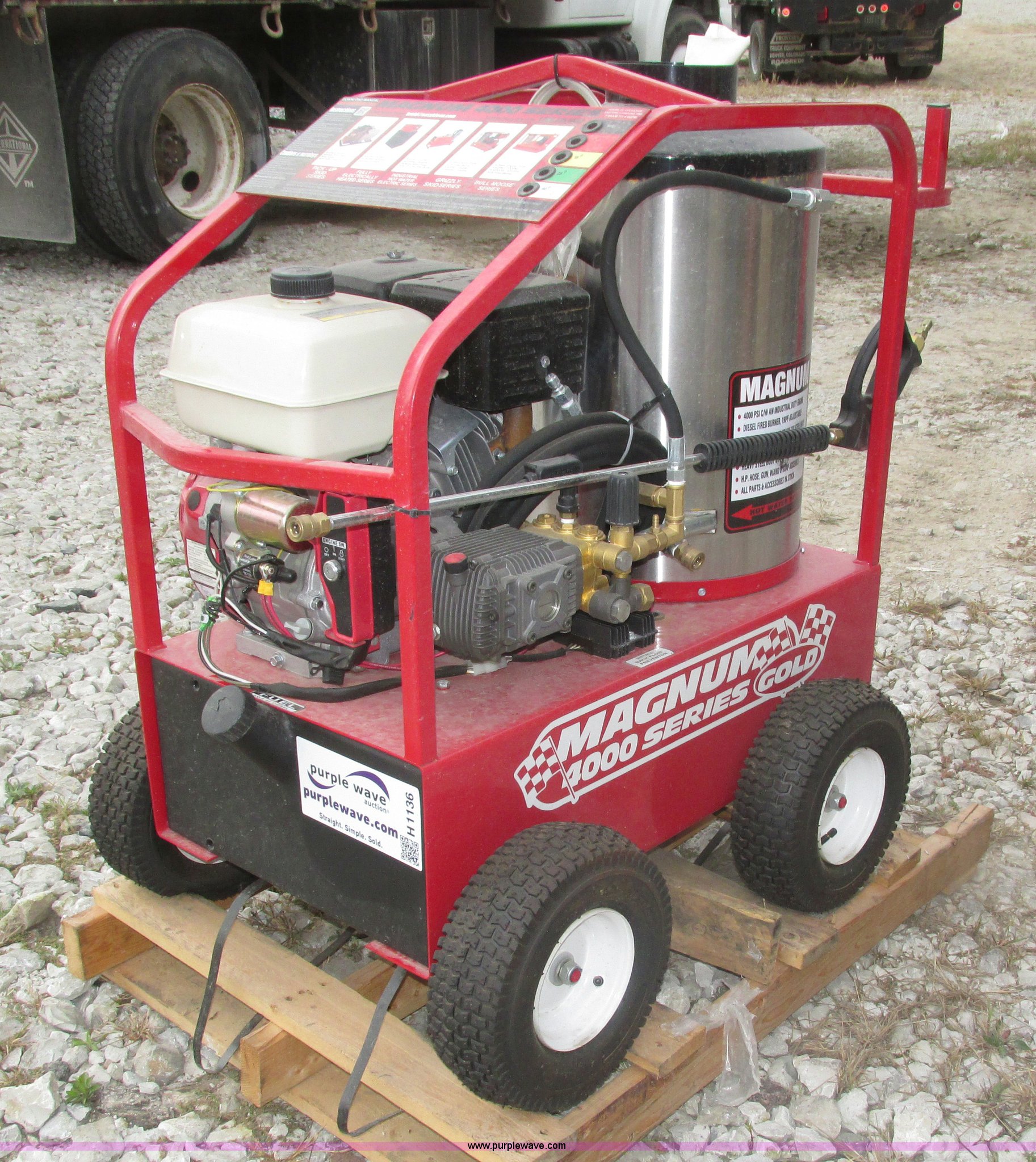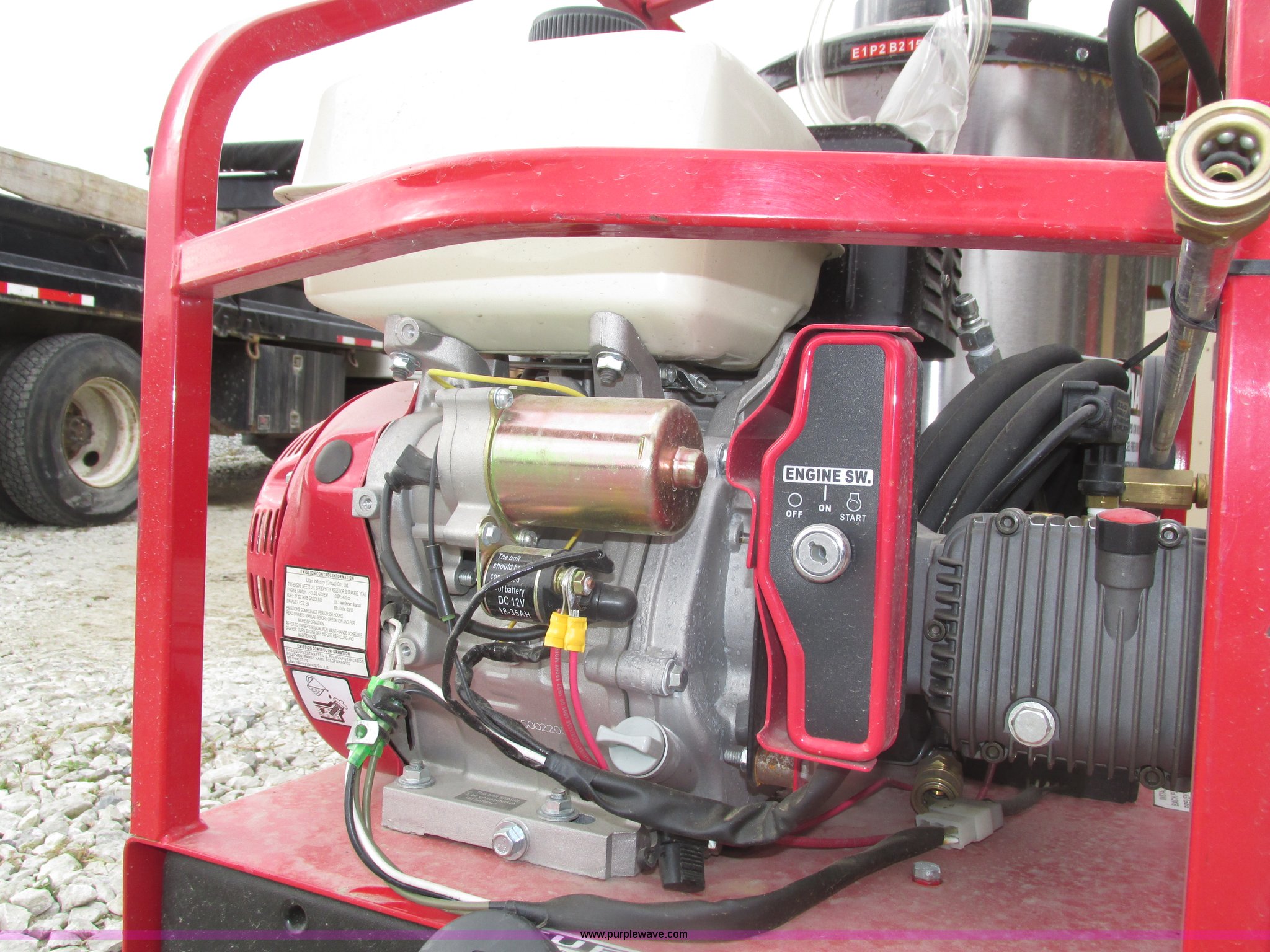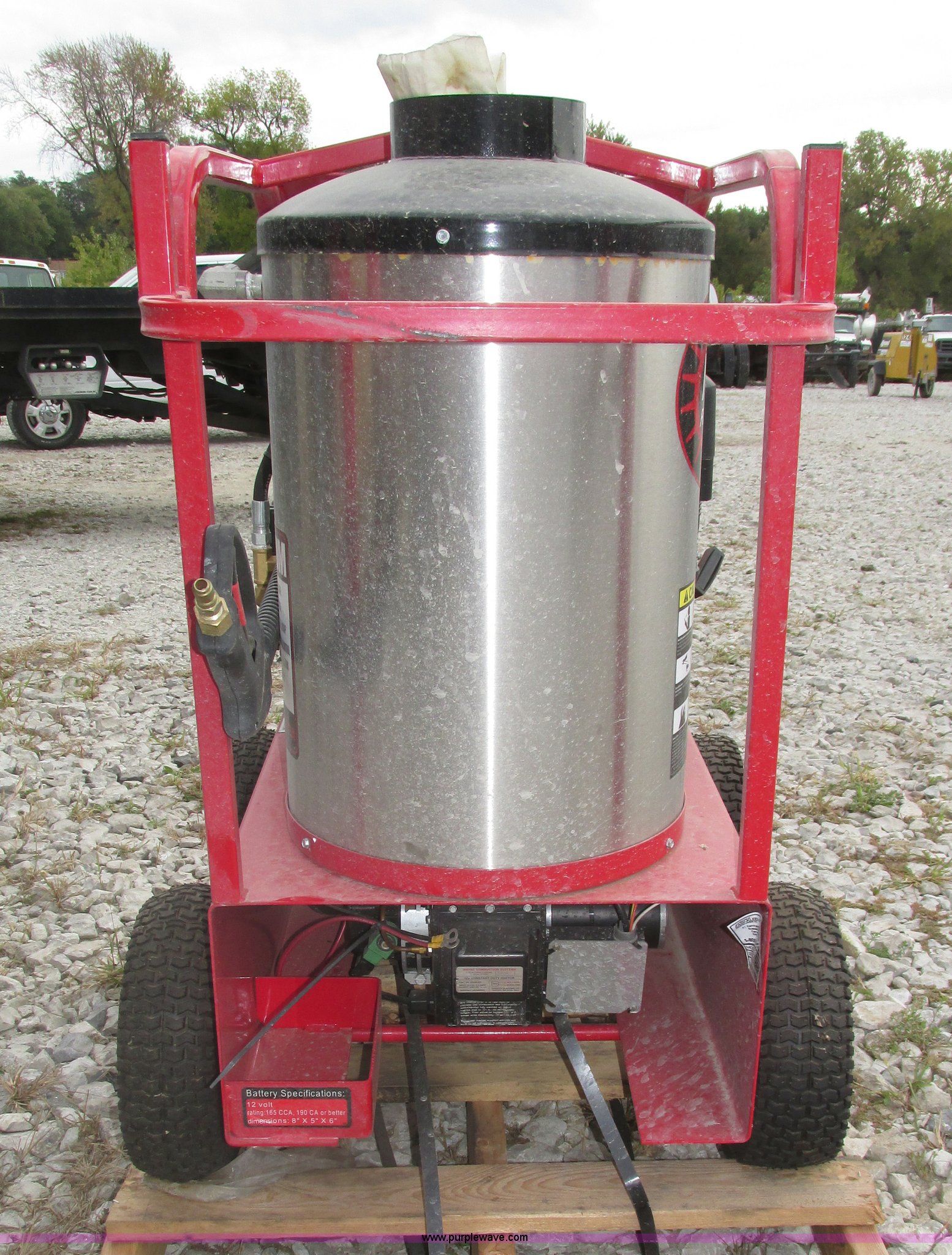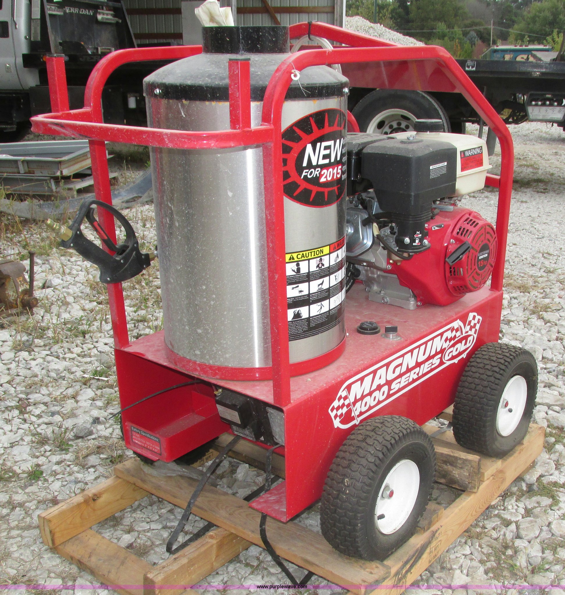 Purple Wave is selling a used Pressure Washer in Nebraska. This item is a 2015 Easy-Kleen RB5050HR Magnum hot water pressure washer with the following: Lifan single cylinder gas engine, 15 HP, 4,000 psi maximum pressure, Adjustable burner control, Siphon attachment, No. 2 diesel fired, Electric or manual start, (2) keys, Wand and hose, (2) tips, 12V constant duty ignition, Lifting eye, Hose hanger, 13 x 5.00-6 pneumatic tires, Diesel fuel tank cap cracked, Unused, Serial EK152454