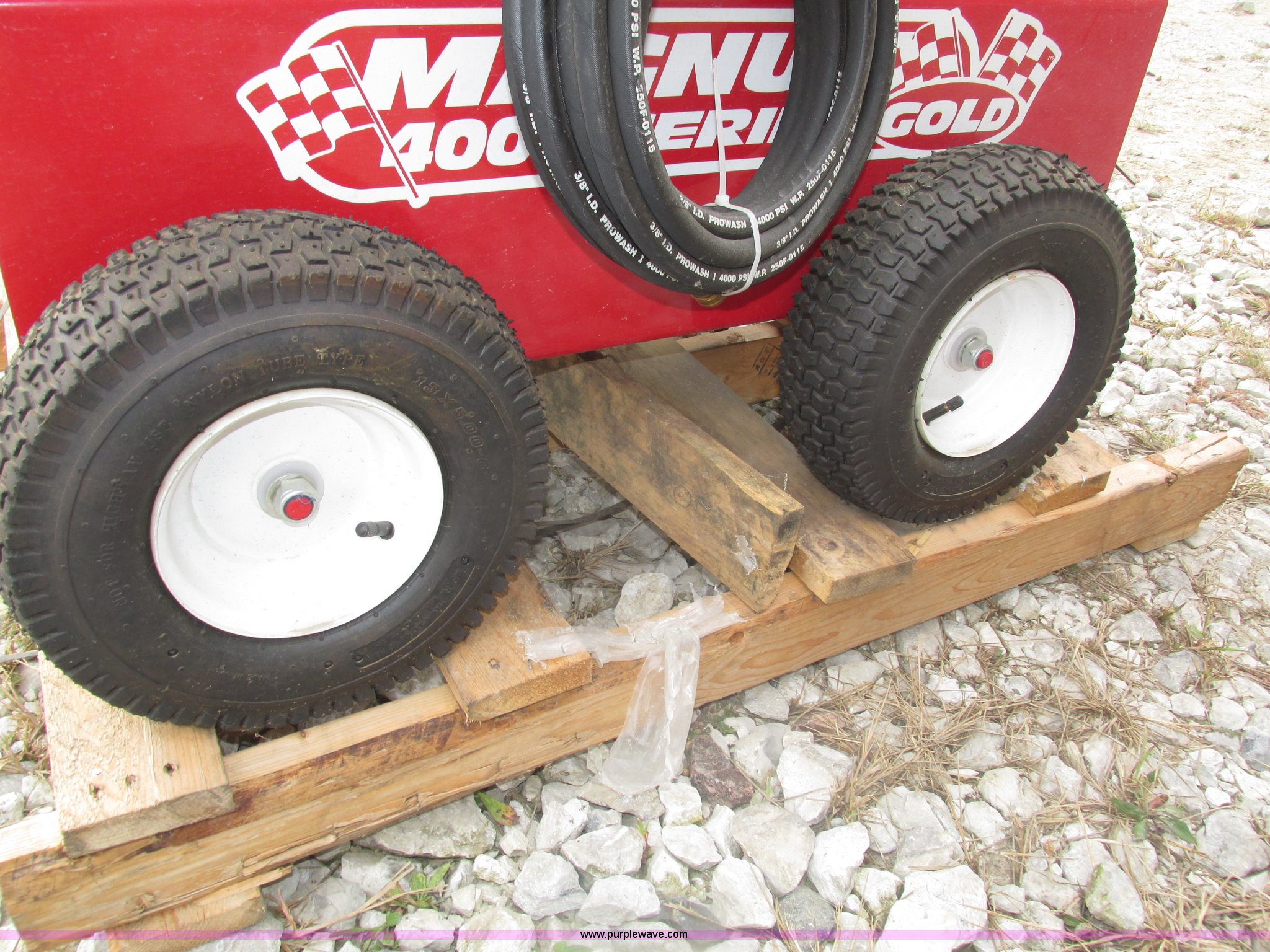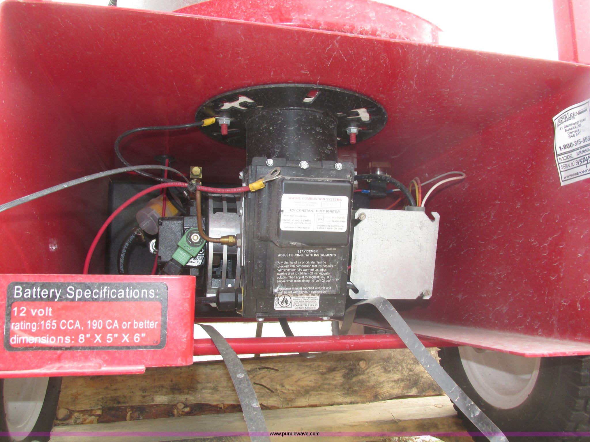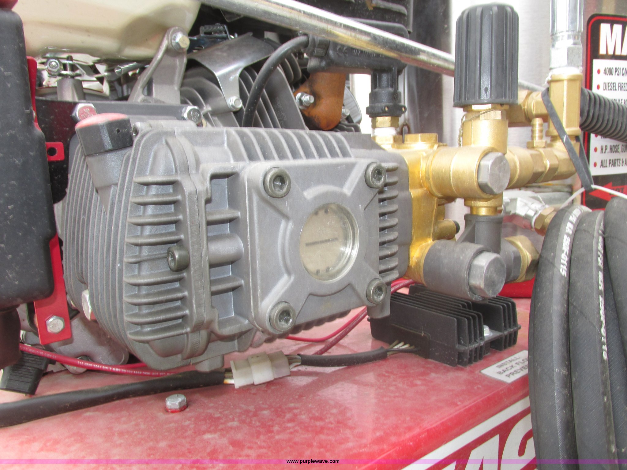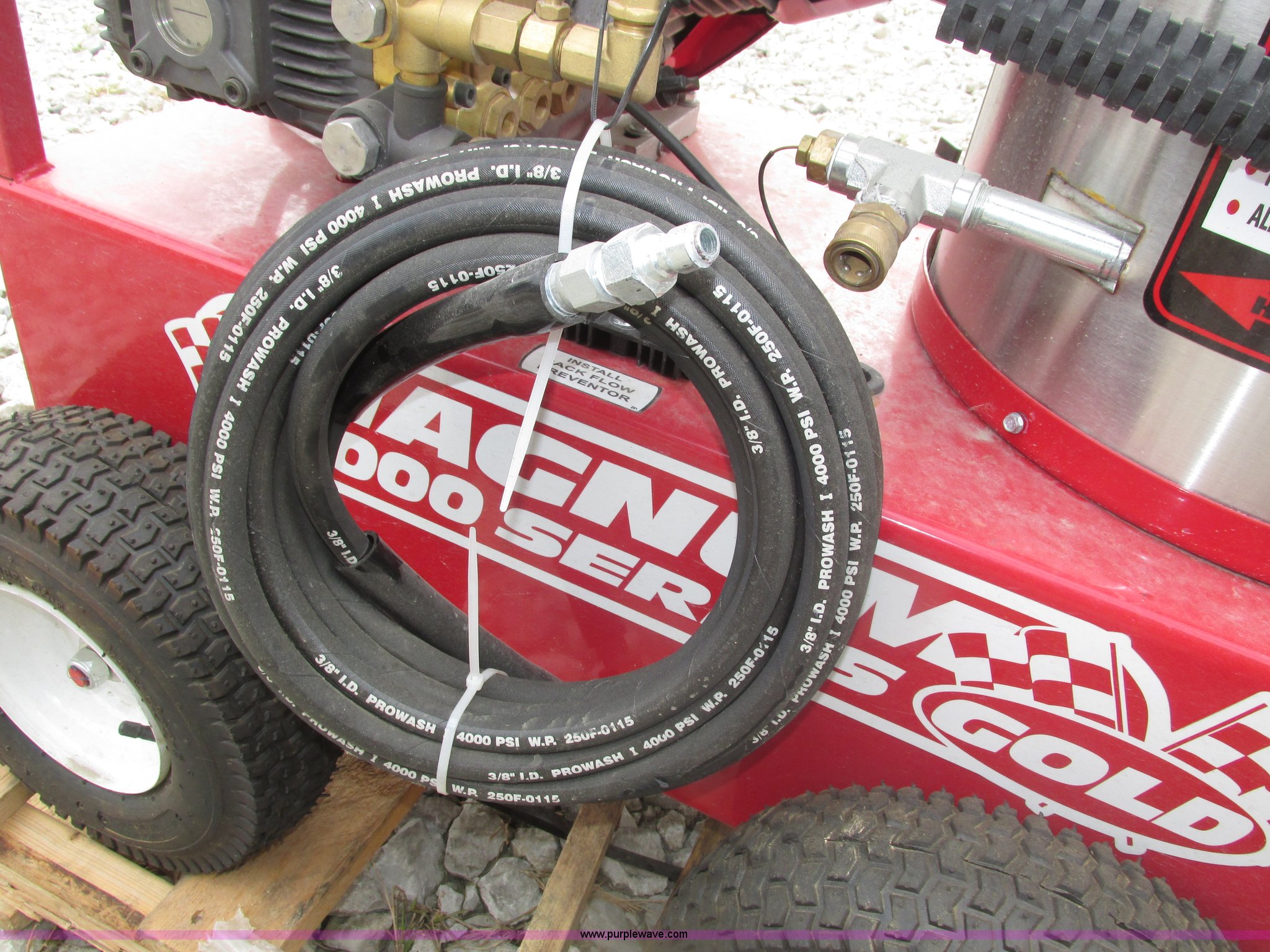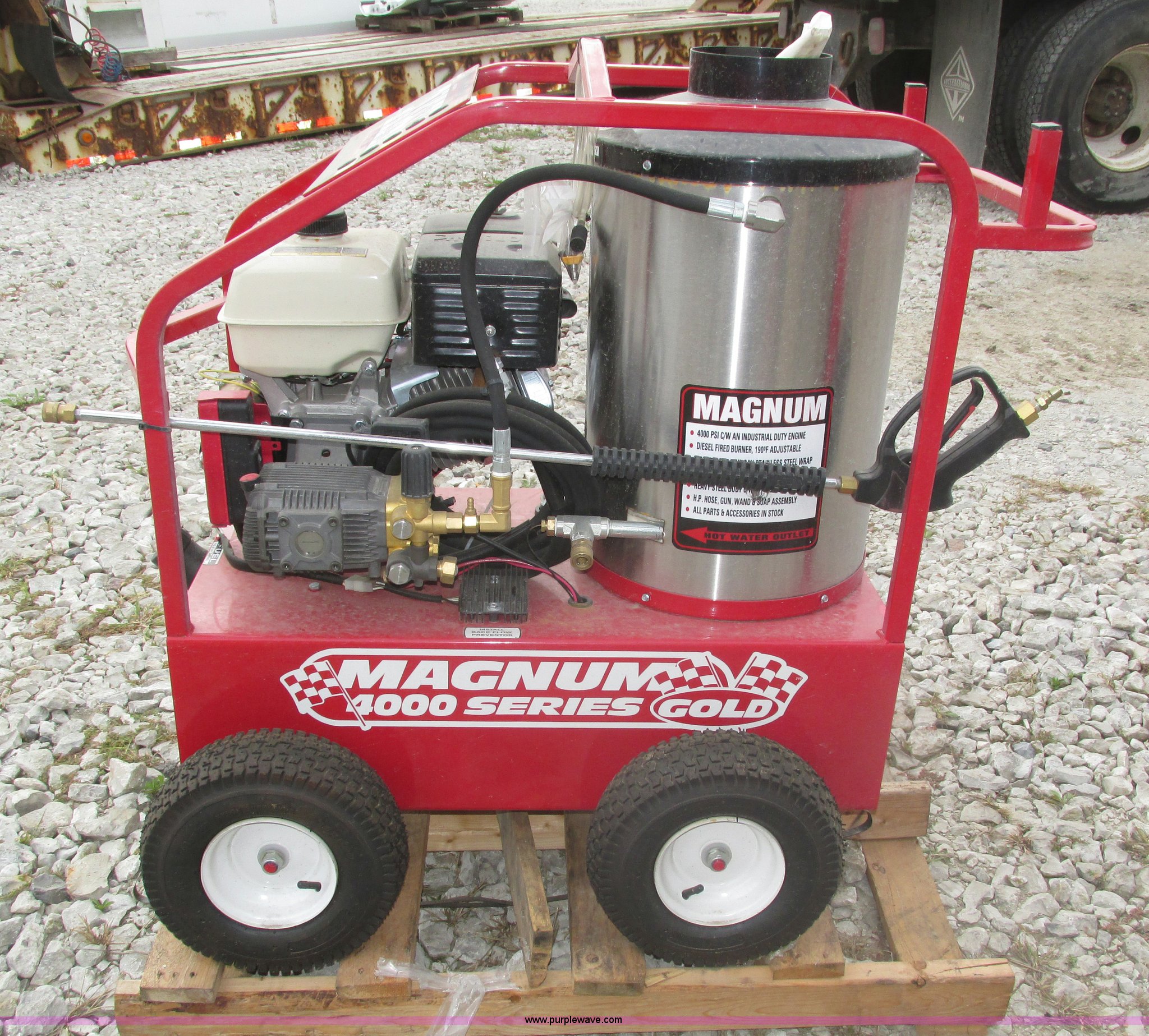 Purple Wave is selling a used Pressure Washer in Nebraska. This item is a 2015 Easy-Kleen RB5050HR Magnum hot water pressure washer with the following: Lifan single cylinder gas engine, 15 HP, 4,000 psi maximum pressure, Adjustable burner control, Siphon attachment, No. 2 diesel fired, Electric or manual start, (2) keys, Wand and hose, (2) tips, 12V constant duty ignition, Lifting eye, Hose hanger, 13 x 5.00-6 pneumatic tires, Diesel fuel tank cap cracked, Unused, Serial EK152454