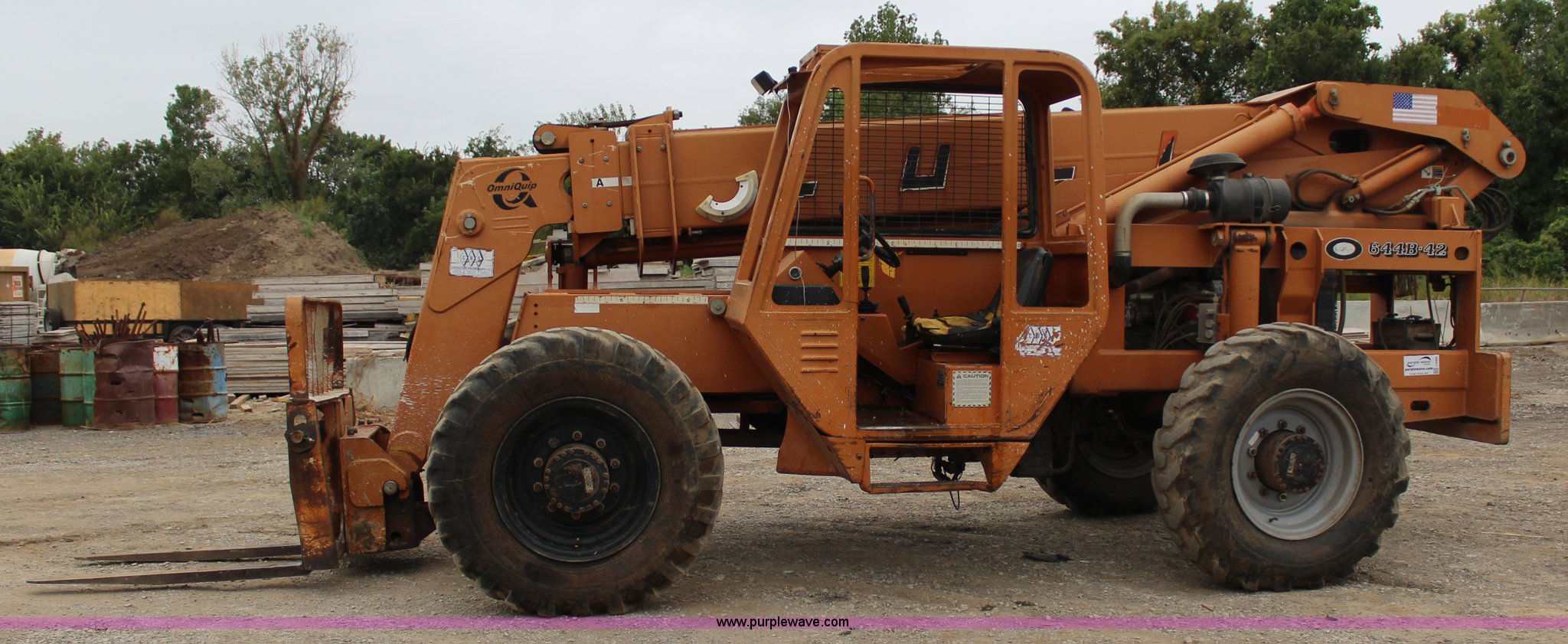 Purple Wave is selling a used Telehandler in Oklahoma. This item is a Lull 644B-42 telehandler with the following: 7,080 hours on meter, Cummins B4.5T four cylinder turbo diesel engine, 99 HP, Powershift transmission, 4F-3R gears, Four wheel drive, Canopy, 6.000 lbs maximum lift capacity, 35'4" maximum reach length, 42' maximum lift height, 48"L forks, Three stage mast, Mast tilt, Tilt carriage, Tilt cab, Quick attach, 13.00-24TG tires, 23,500 lbs. base operating weight, Serial 00Z2AN21-1184