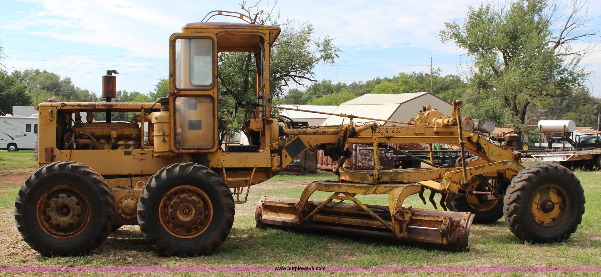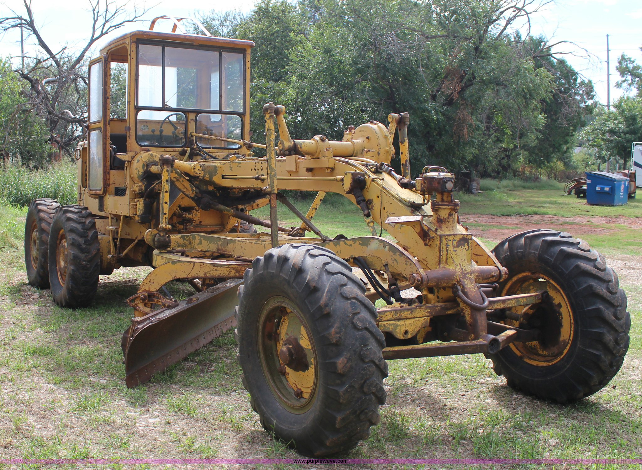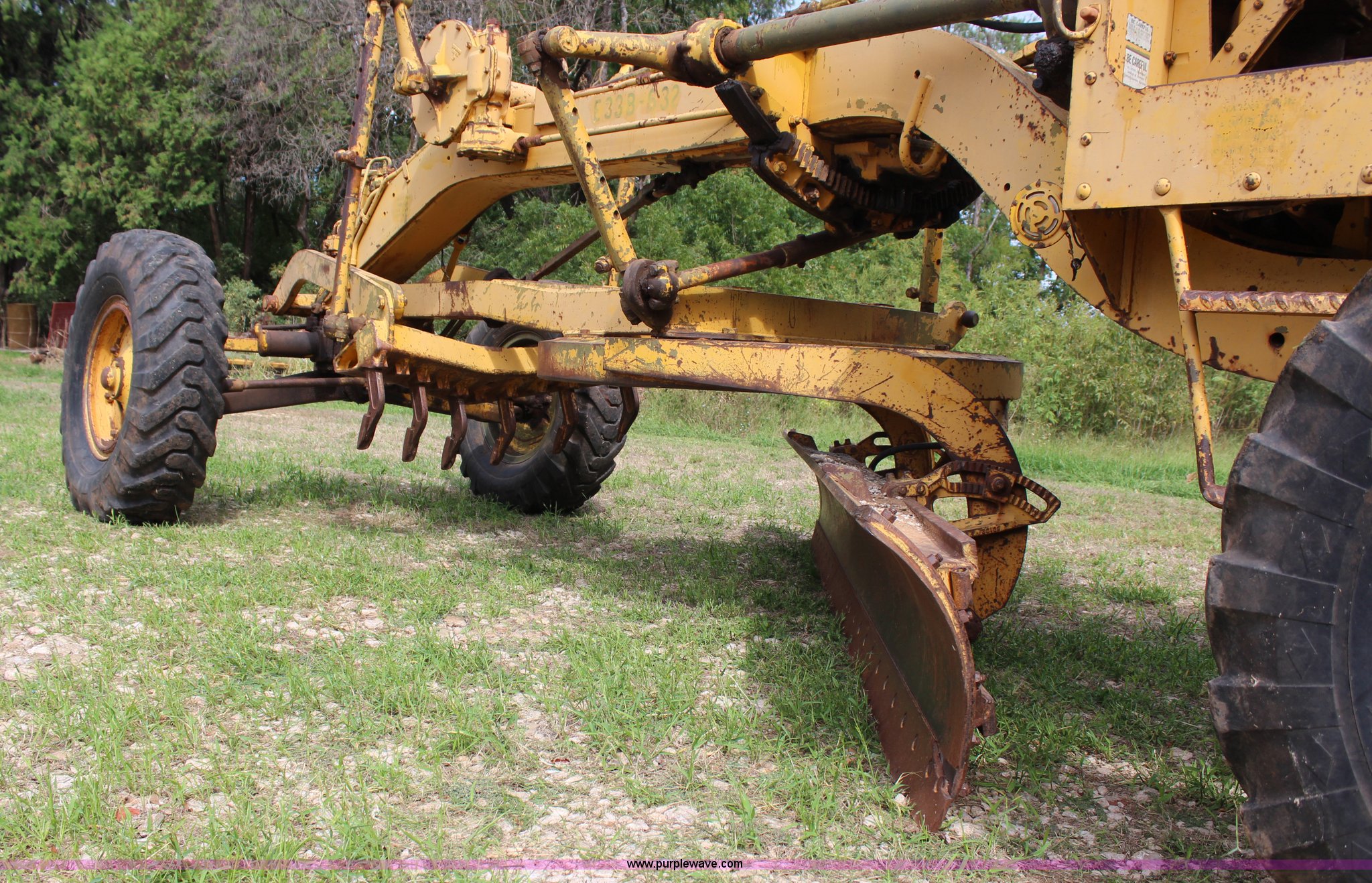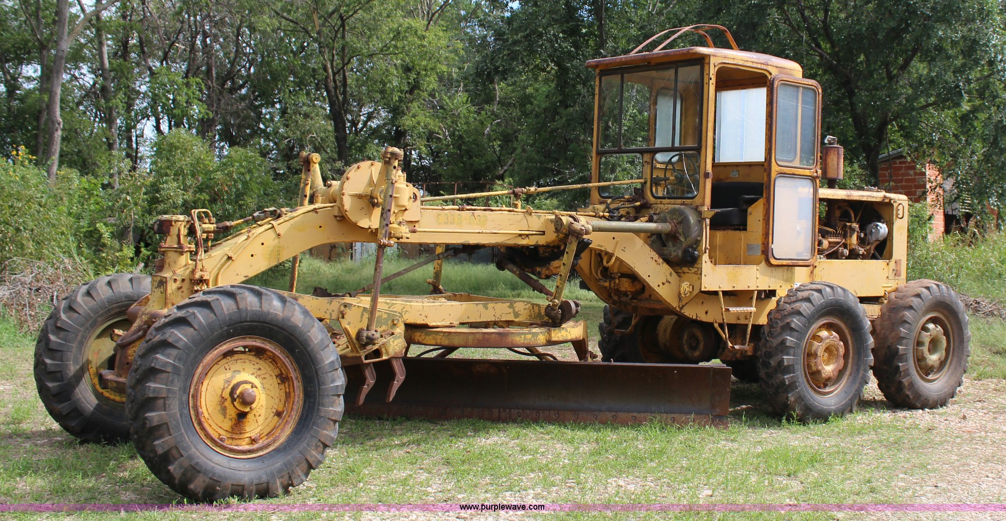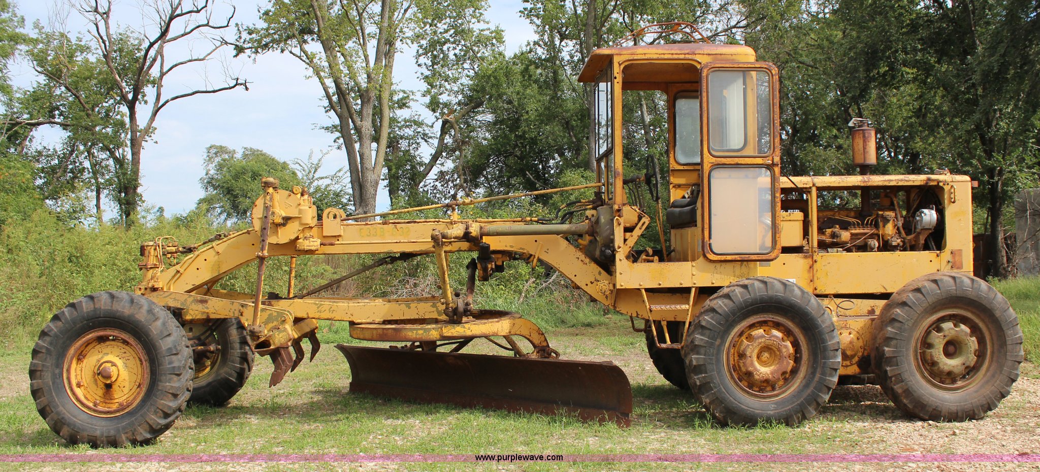 Purple Wave is selling a used Motor Grader in Oklahoma. This item is a 1965 Caterpillar 12E rigid frame motor grader with the following: Caterpillar E3R463 six cylinder diesel engine, Serial 99E12000, 6F-4R gears, 12' moldboard, Side shift, Mid-mounted scarifier, (6) teeth, 60 gallon fuel tank, 13.00-24 tires, Stock No. 3805, Sale# 1615KP, Serial 99E12000