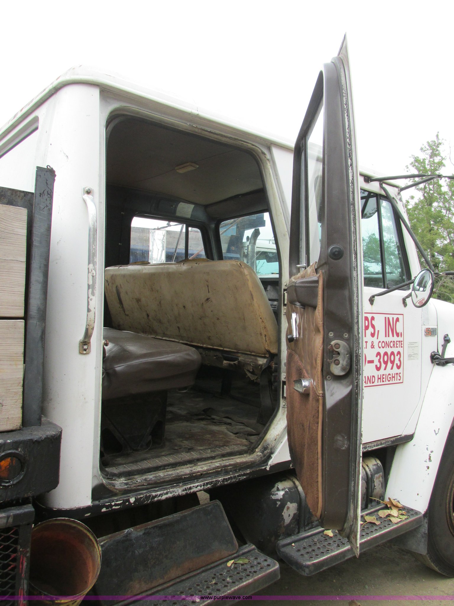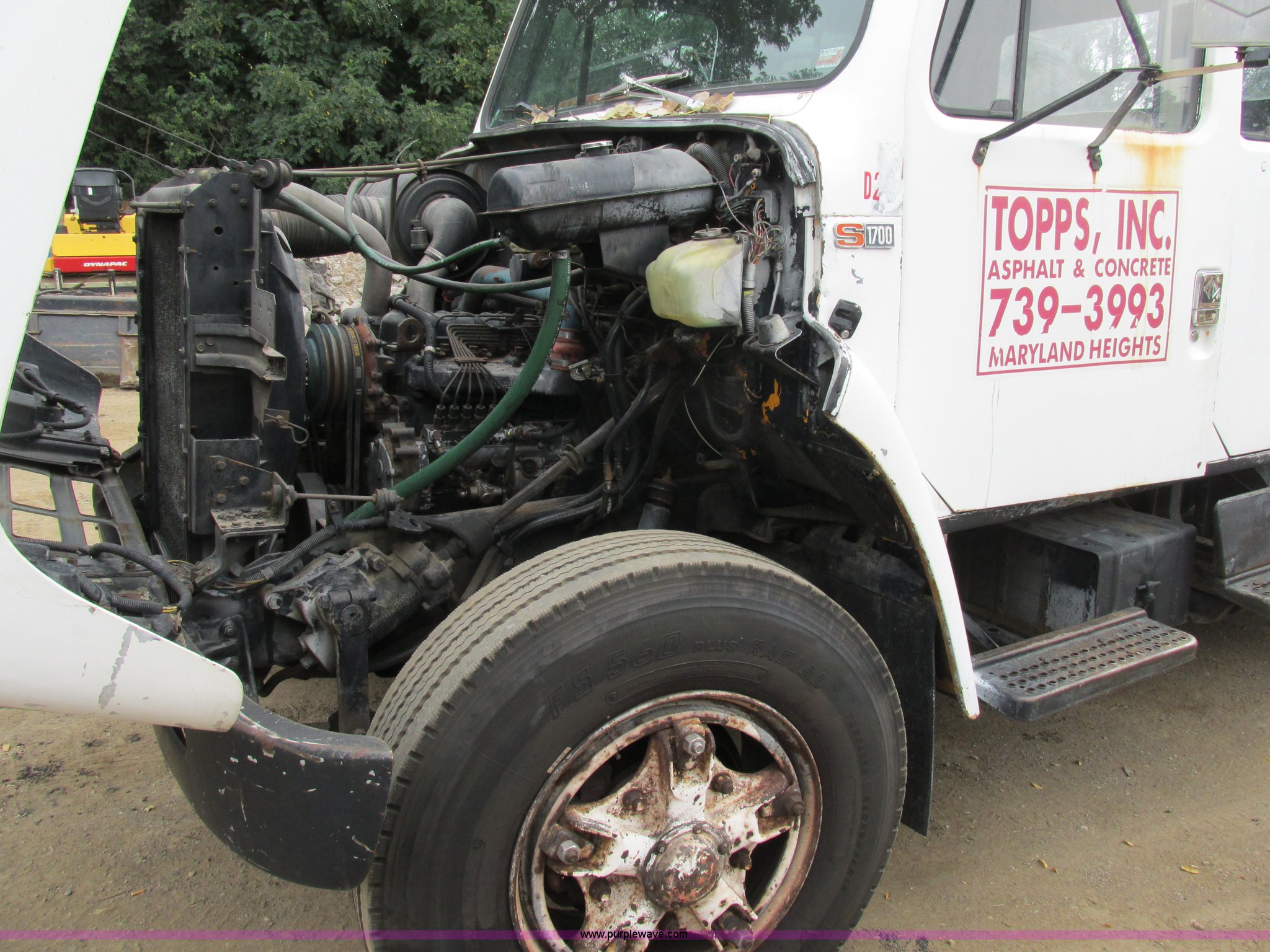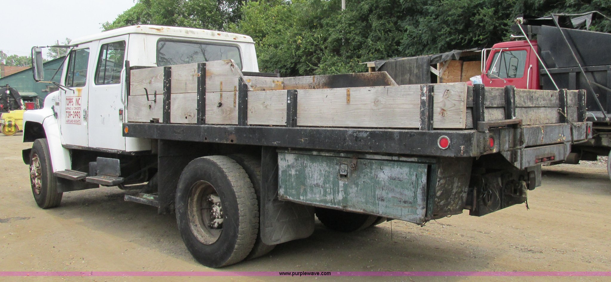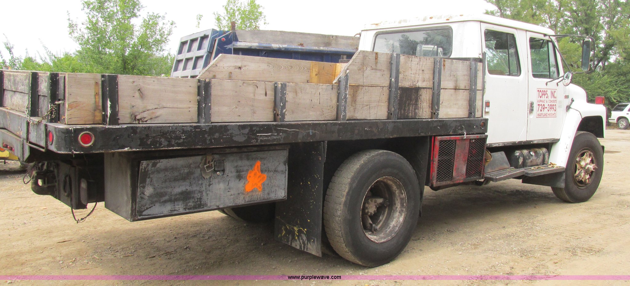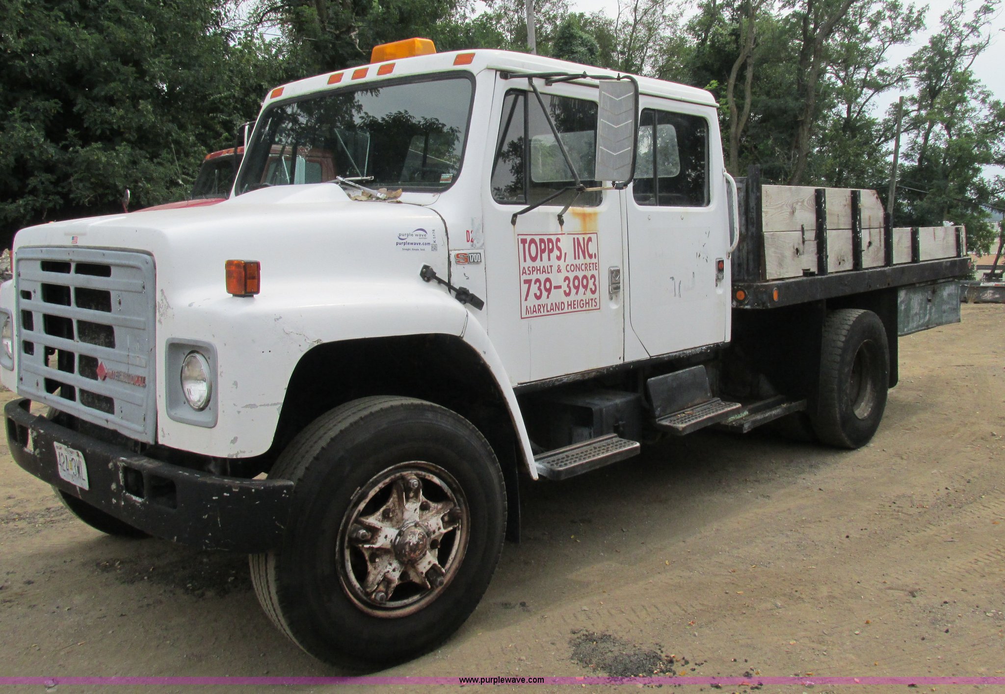 1989 International 1754 Crew Cab flatbed truck. 106,731 miles on odometer, International DT360 5.9L L6 turbo diesel engine, Allison automatic transmission, Heat, Manual windows, Vinyl interior, 14'L x 93"W flatbed, Toolboxes, Spring suspension, Hydraulic brakes, 11R22.5 tires. 1HTLCZWPXKH656565. Topps Asphalt. 11502 Dorsett Road. St. Louis, MO 63043