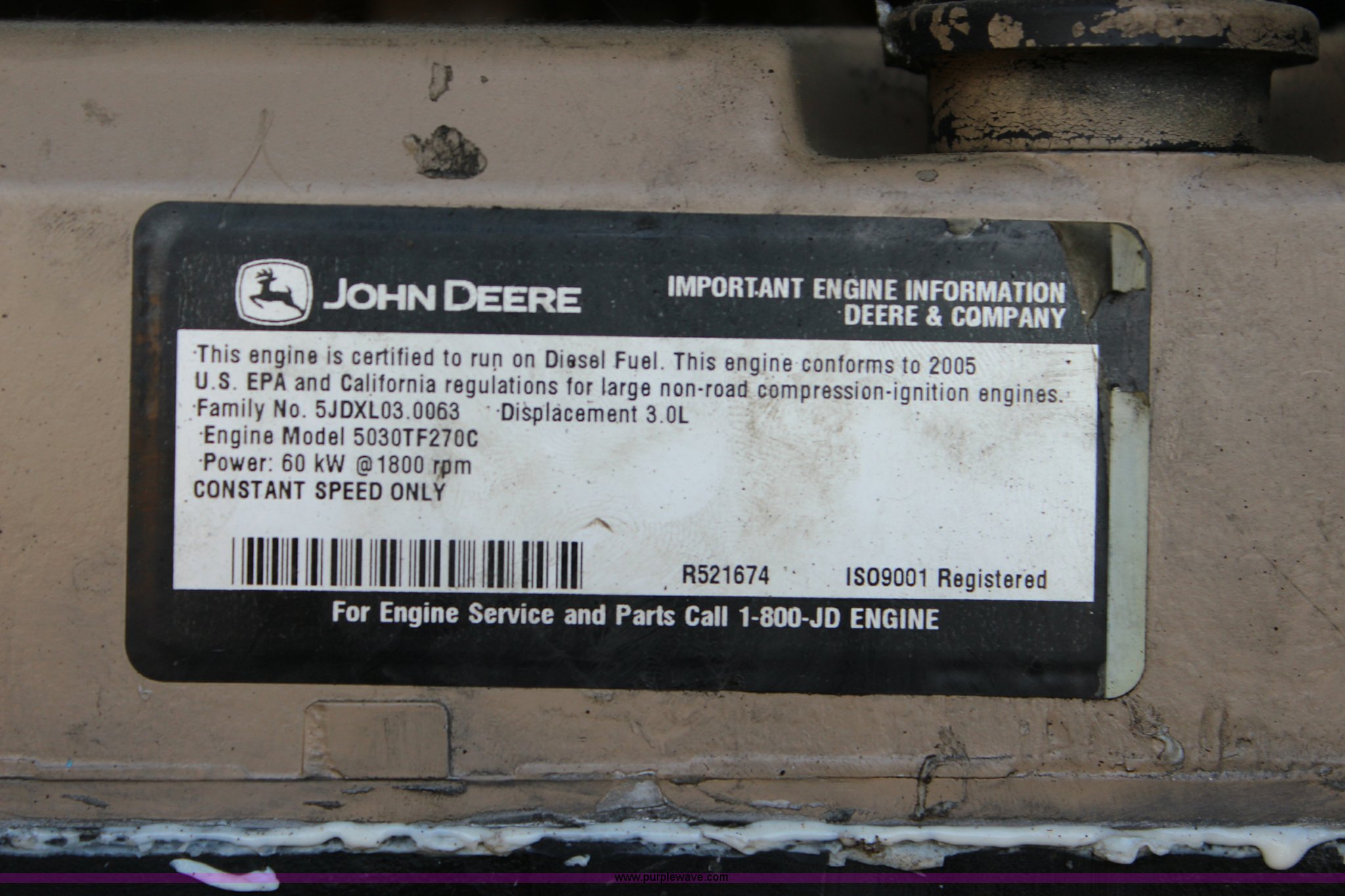 Baldor TS45T generator. 4,154 hours on meter, John Deere 5030T four cylinder turbo diesel engine 60 kW, Serial SE5030T134606, 38 kW, Single and three phase, 2" ball hitch, Surge brakes, 205/75R15 tires. 4TCSU10665H610892. Kaw Valley Companies. 5600 Kansas Avenue. Kansas City, KS 66106
