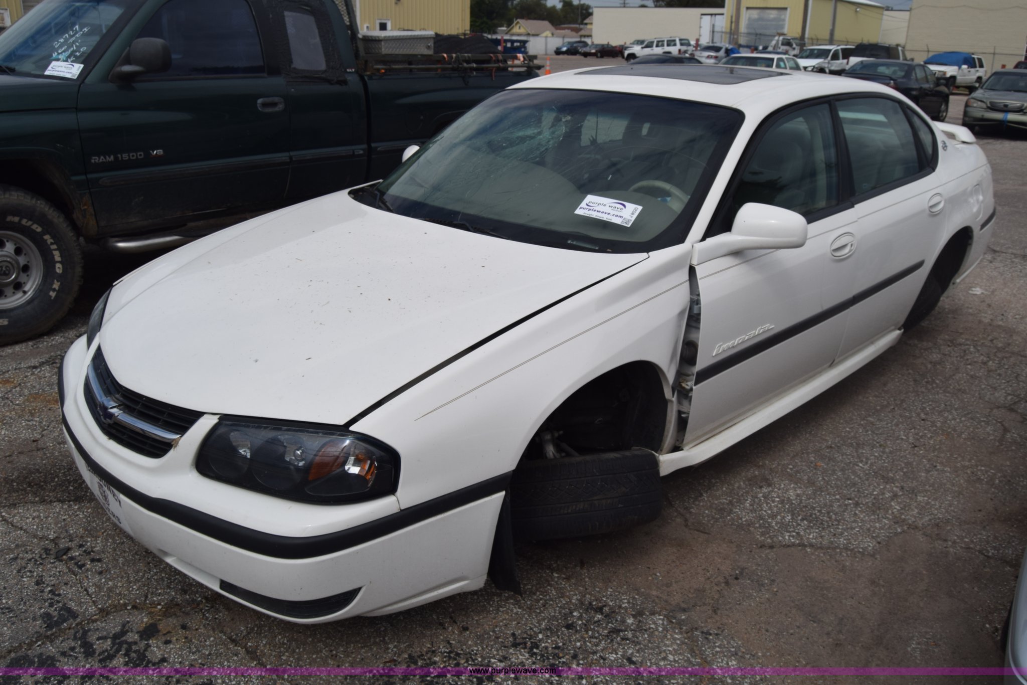 2003 Chevrolet Impala LS. Unknown miles on odometer, 3.8L V6 OHV 12V gas engine, Automatic transmission, AC and heat, Tilt, Cruise, AM/FM/CD/cassette, Power windows, locks, mirrors, and seats, Vinyl interior, Keys, 225/60R16 tires, Interior/exterior cosmetic damage, Dents and scratches, Battery dead, Windshield broken, Air bags deployed, Driver's side wheel damaged, Case# 15C045887. Vehicle is abandoned. Condition and history are unknown. No additional information is available. Vehicle does not have keys unless notated otherwise in the item listing.. View City Of Wichita Terms for title acquisition and item removal requirements.. 2G1WH52K139190327. Bud Roat Towing. 310 N Handley. Wichita, KS 67203