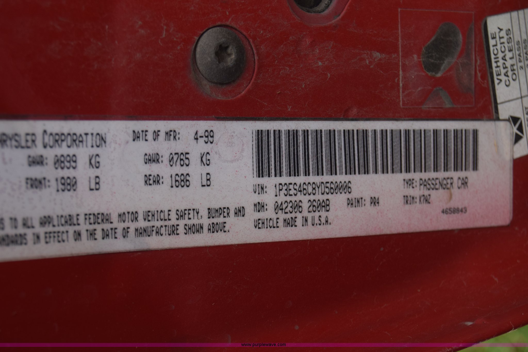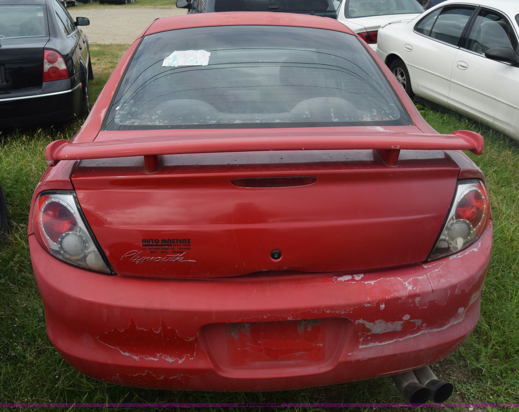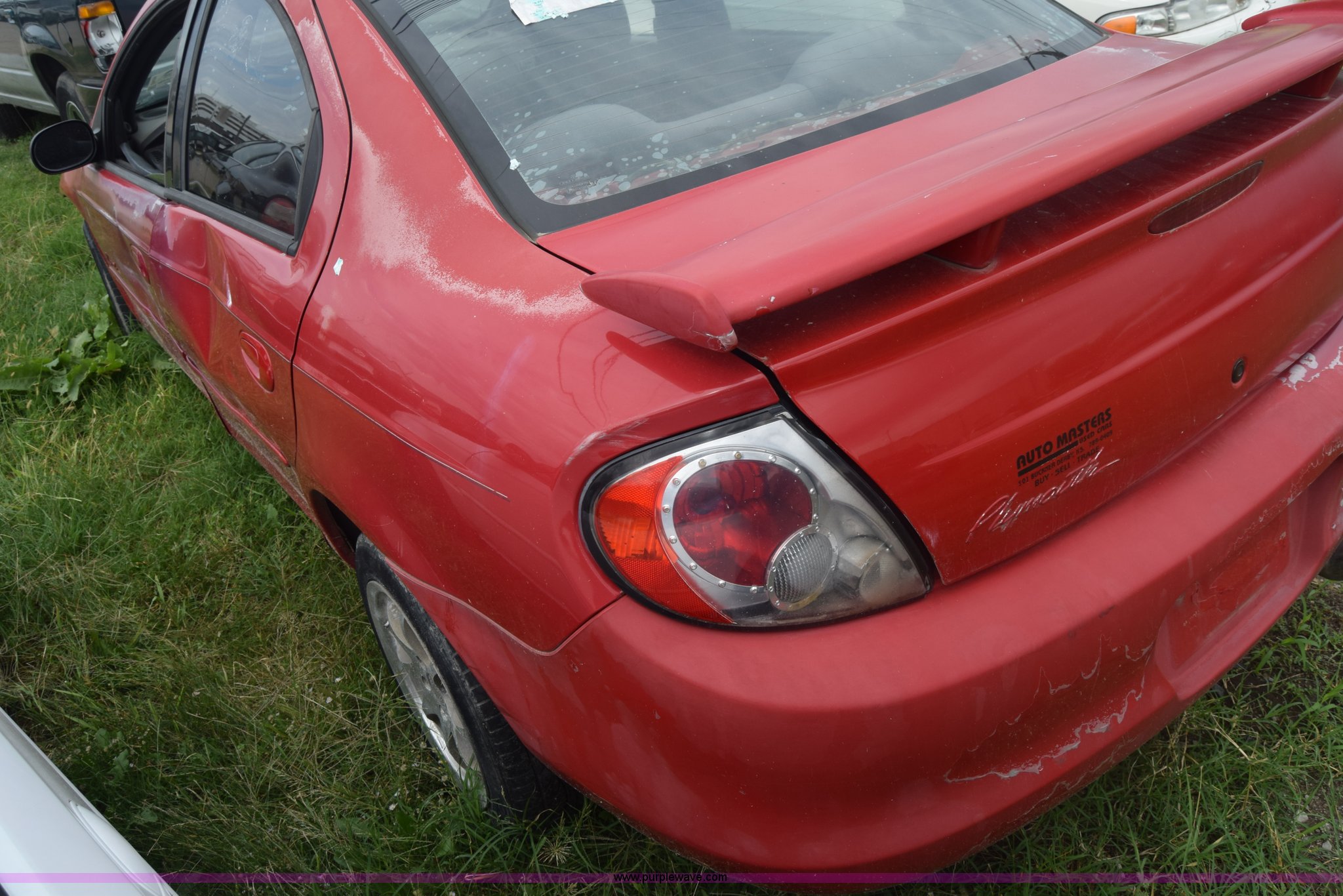 Purple Wave is selling a used Passenger Vehicle in Kansas. This item is a 2000 Plymouth Neon with the following: Unknown miles on odometer, 2.0L L4 SOHC 16V gas engine, Automatic transmission, Manual windows and locks, Cloth interior, 185/60R15 tires, Interior/exterior cosmetic damage, Dents, Paint scratched and peeling, Front end damaged, No radio, AC and heat controls missing, Case# 15C41159