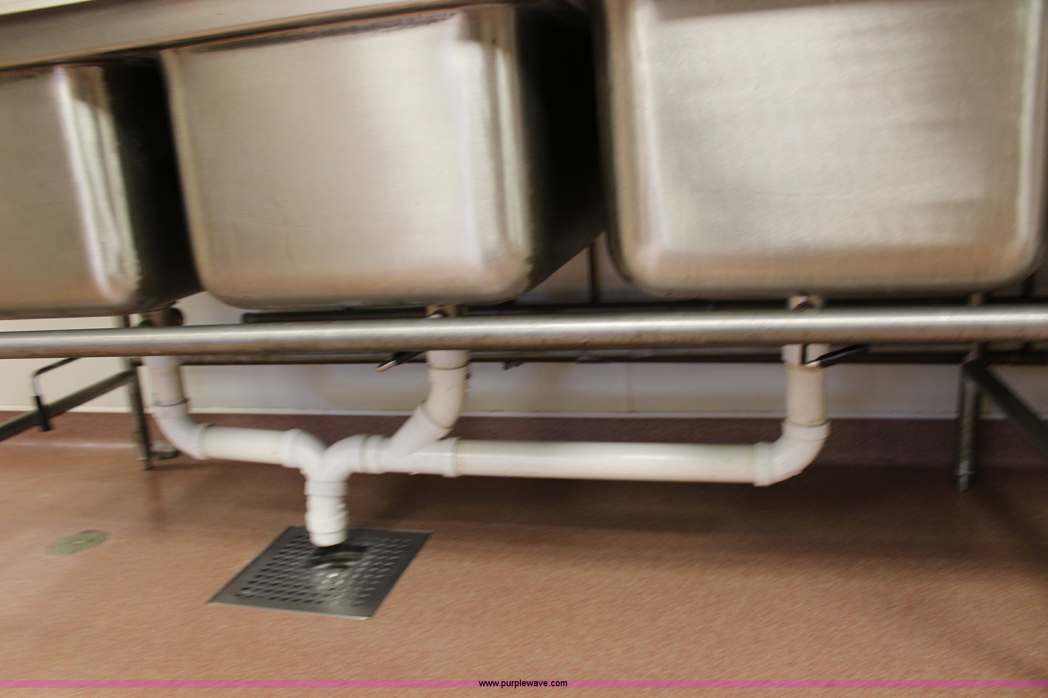 Stainless steel sink. Three compartment, Garbage disposal, 114"L x 35"D x 44.5"H. Buyer is responsible for all aspects of removal. Tonganoxie Elementary School. 304 Shawnee. Tonganoxie, KS 66086