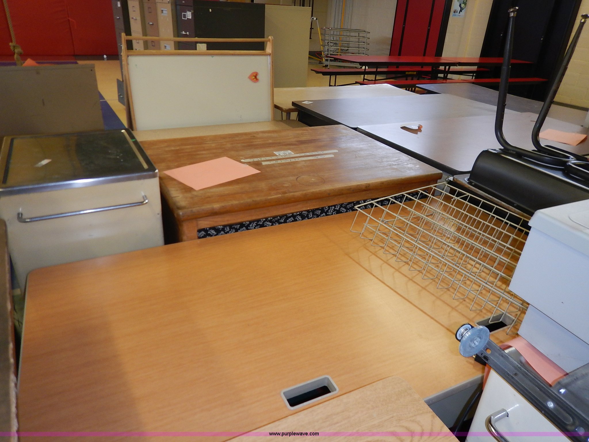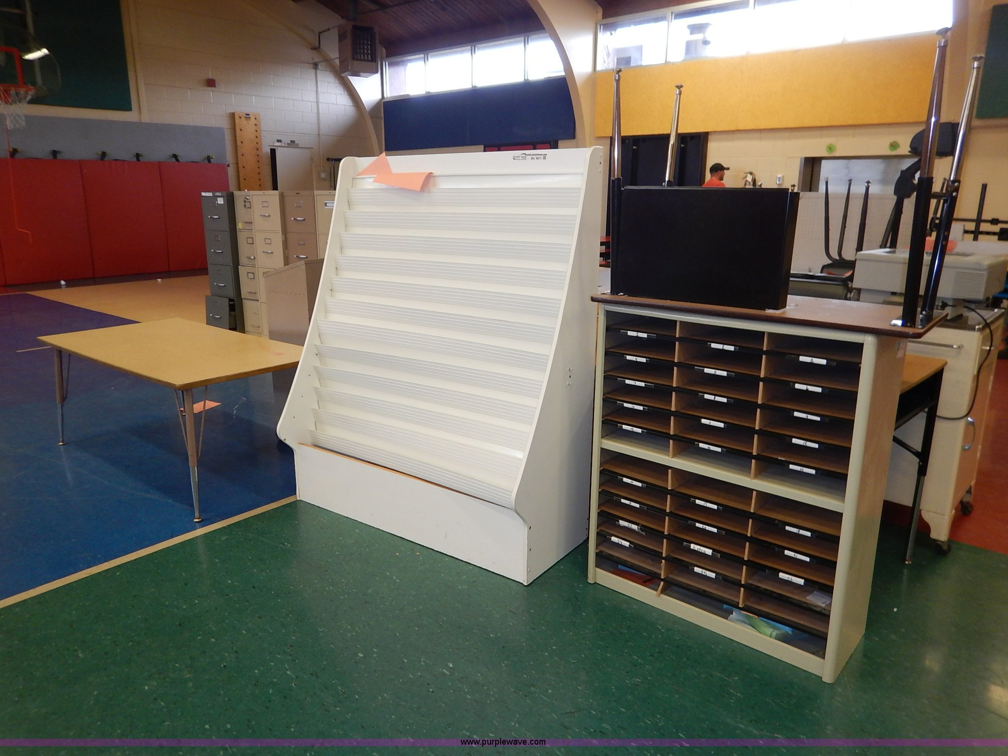 Purple Wave is selling a used Office Supplies and Equip. in Kansas. This item is a Assorted furniture with the following: Paper/magazine racks, Tables, Desks, Scale, Projector and more