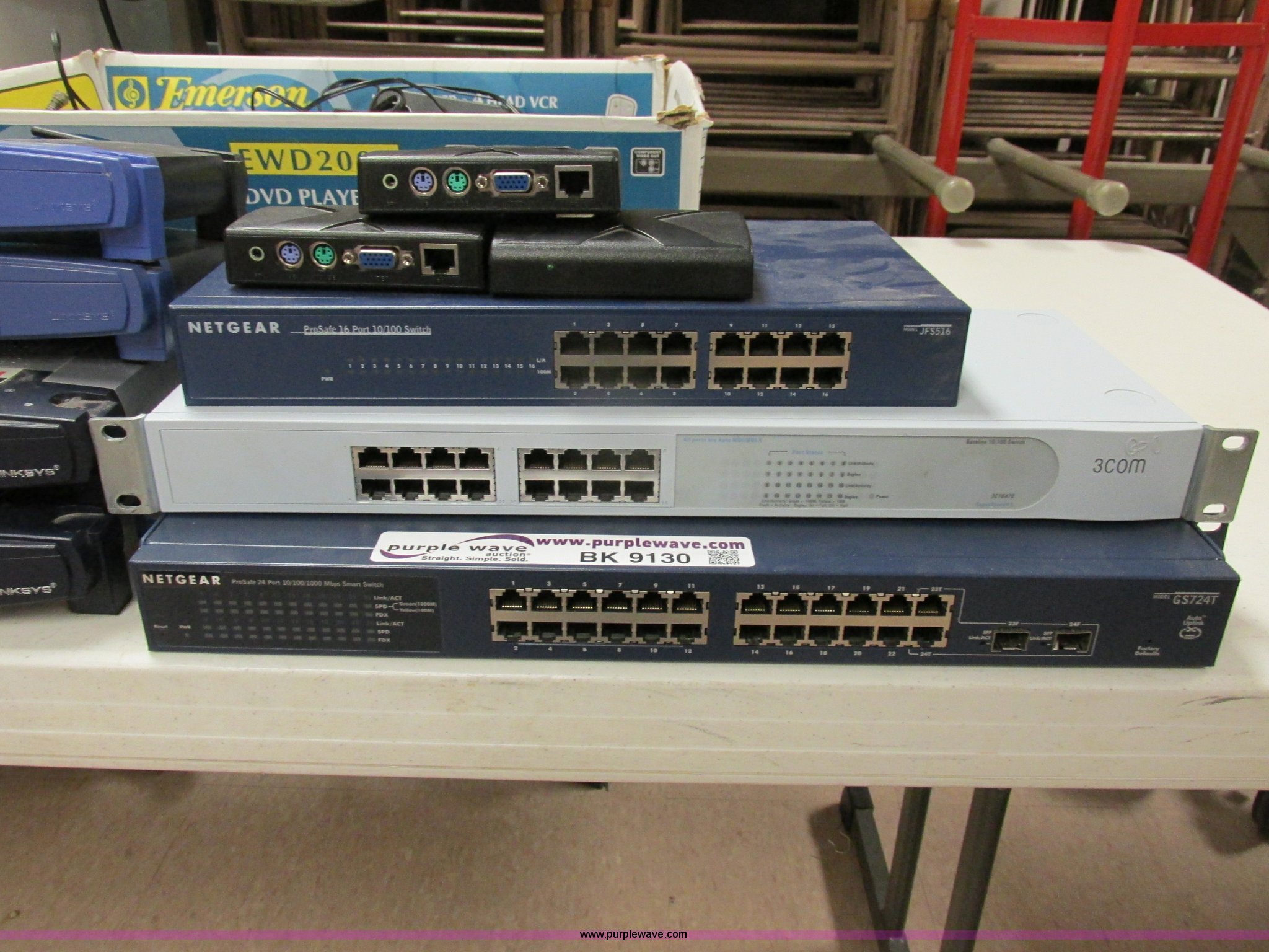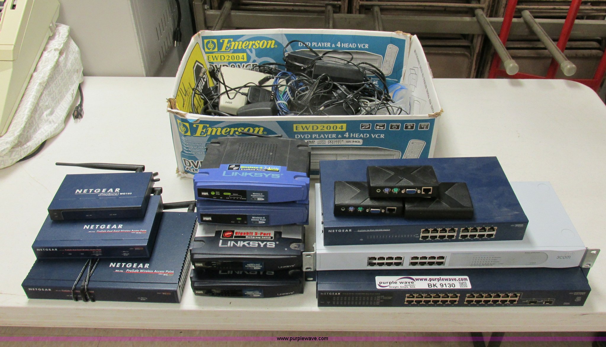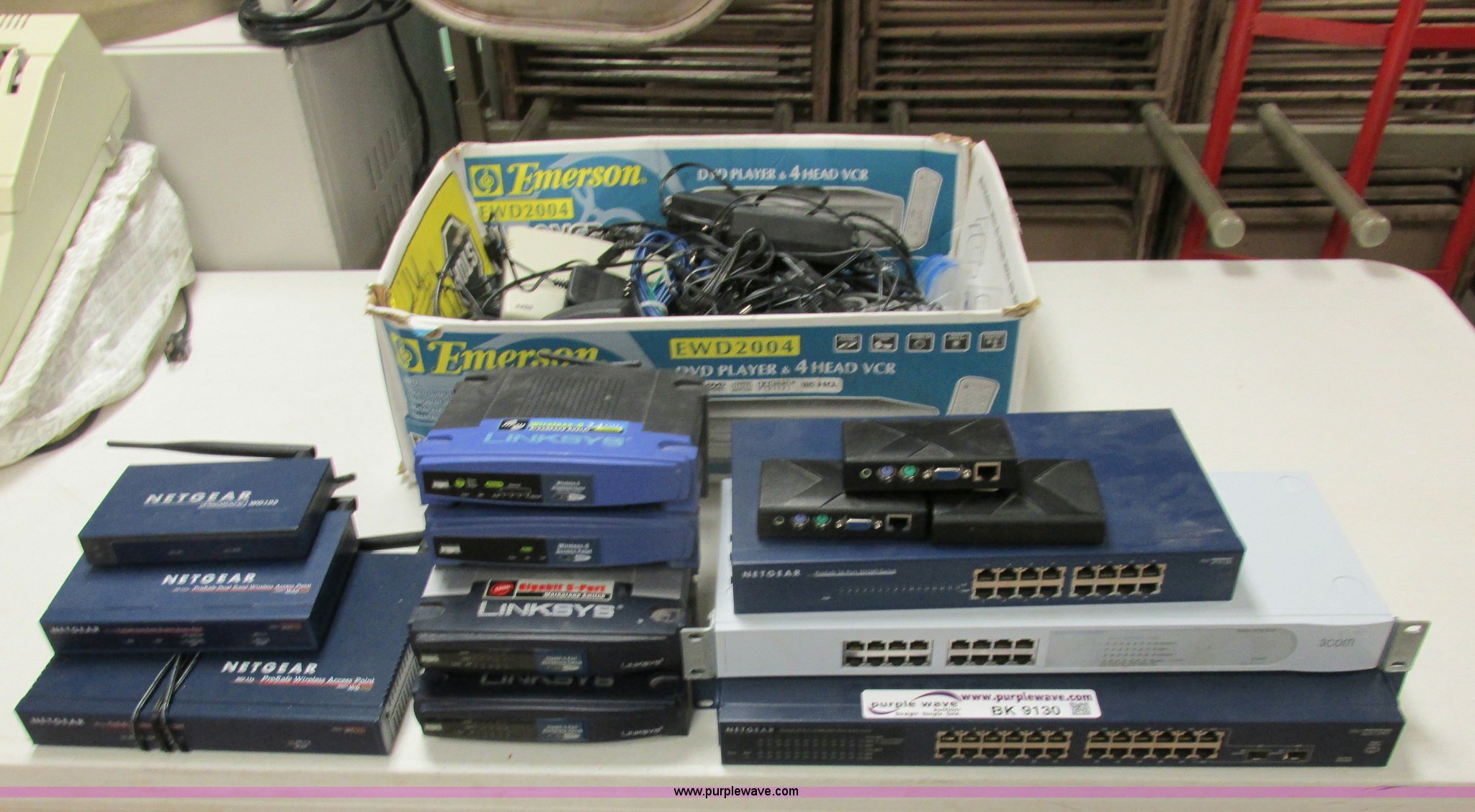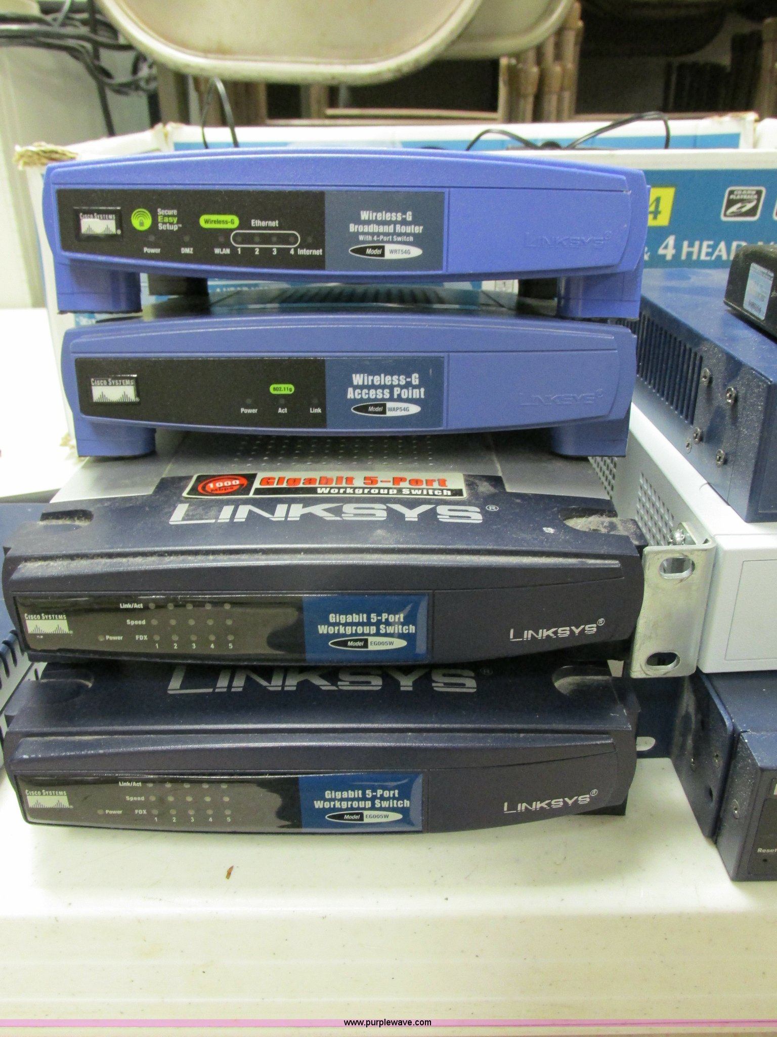 Purple Wave is selling a used Computers in Kansas. This item is a Assorted networking equipment with the following: (2) Linksys five port switch, (2) Linksys Wireless G 2.4 GHz router, Netgear WG302 wireless access point, Netgear WA102 wireless access point, Netgear AG103 wireless access point, Netgear JFS516 16 port switch, Baseline 16 port switch, Assorted power cords and patch cables