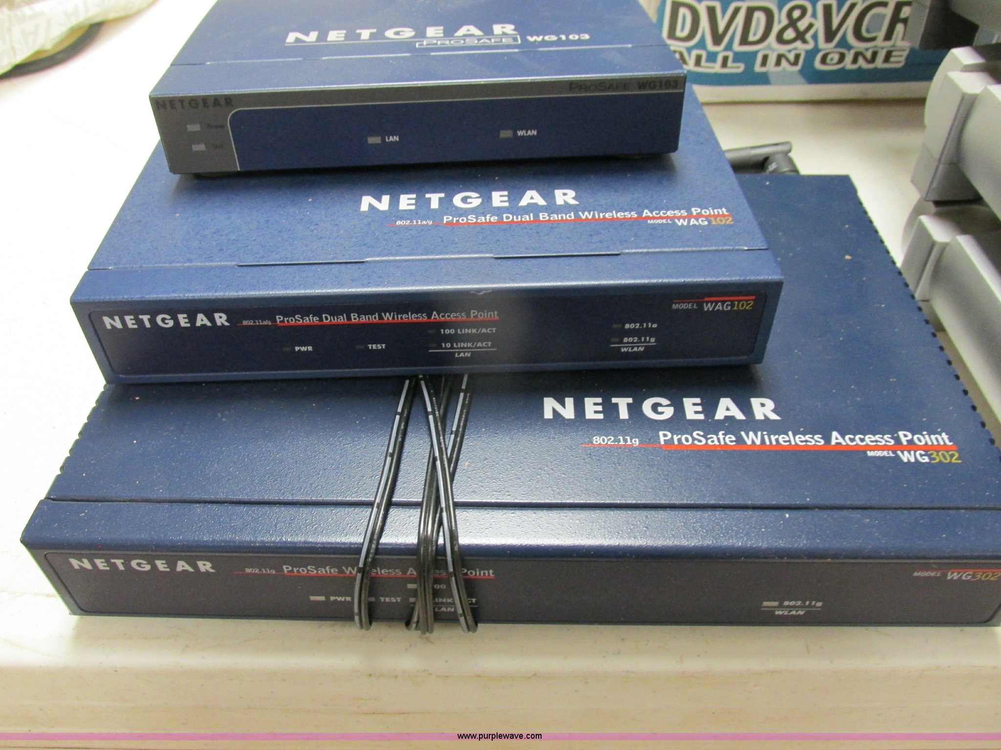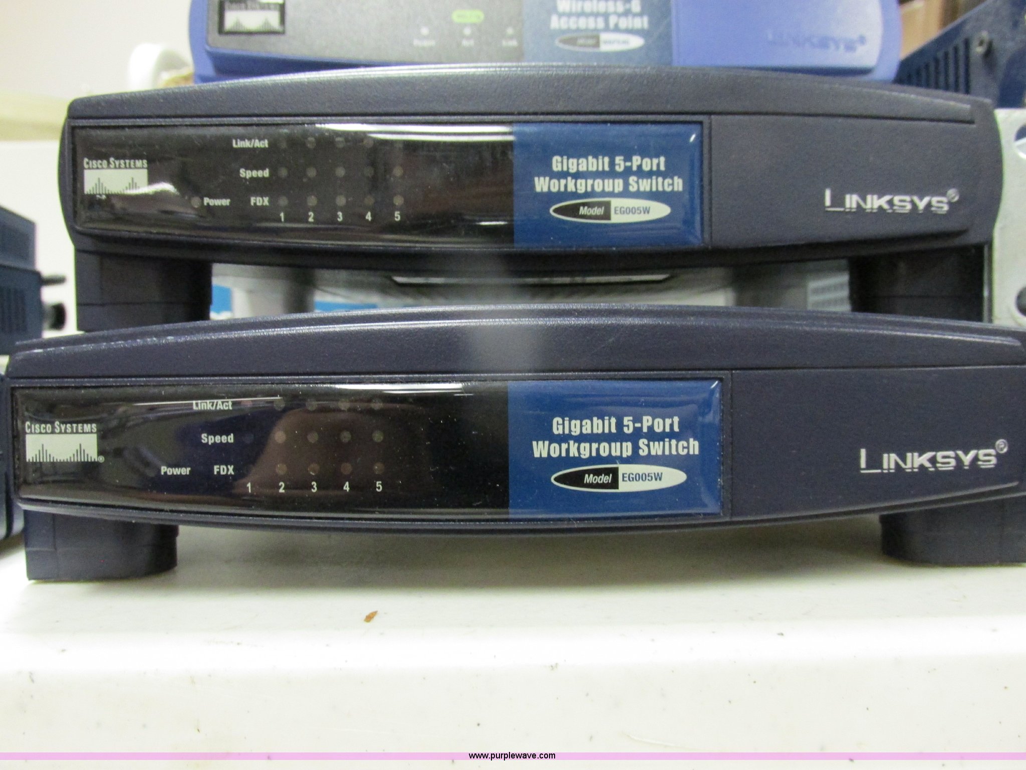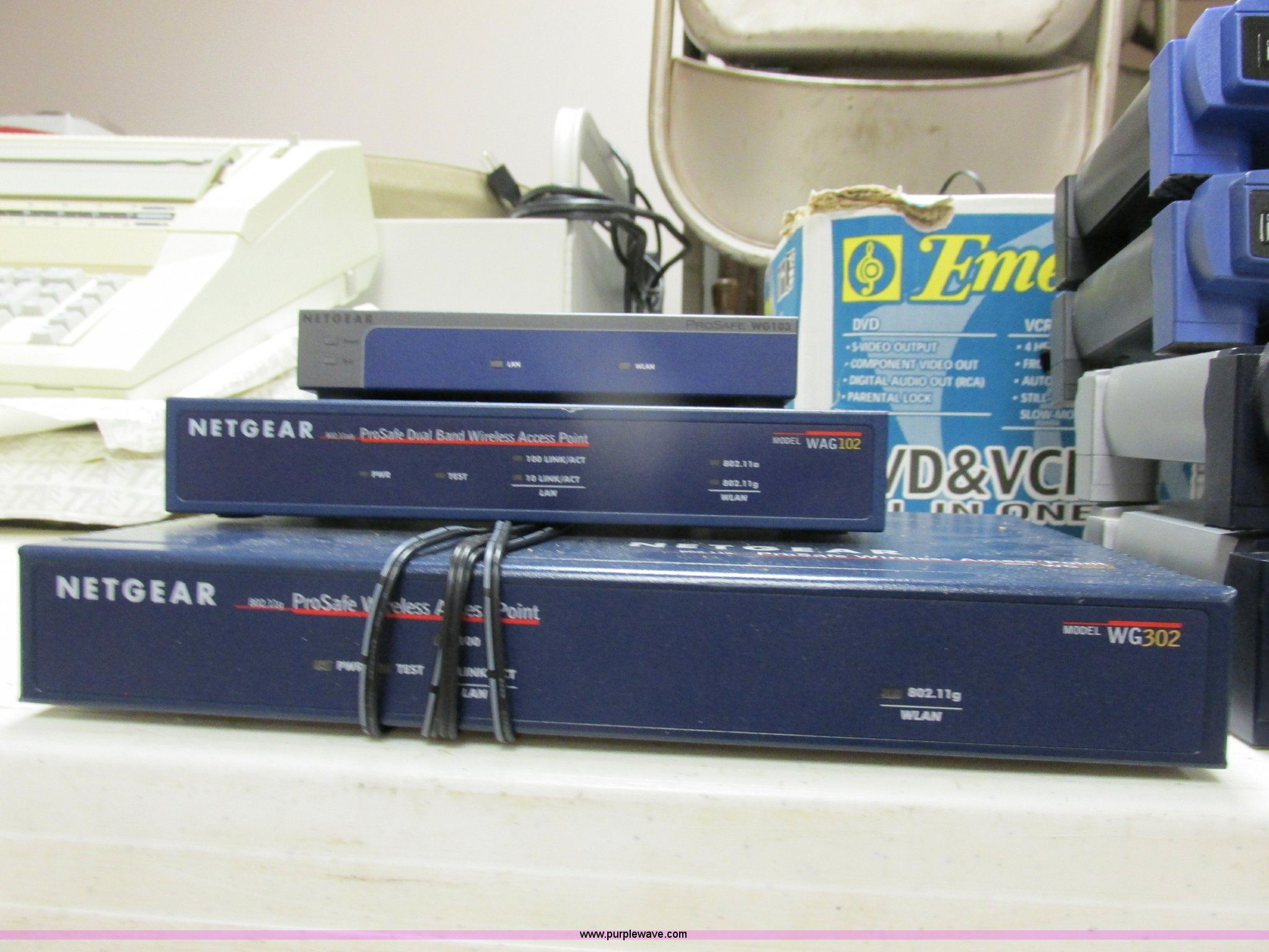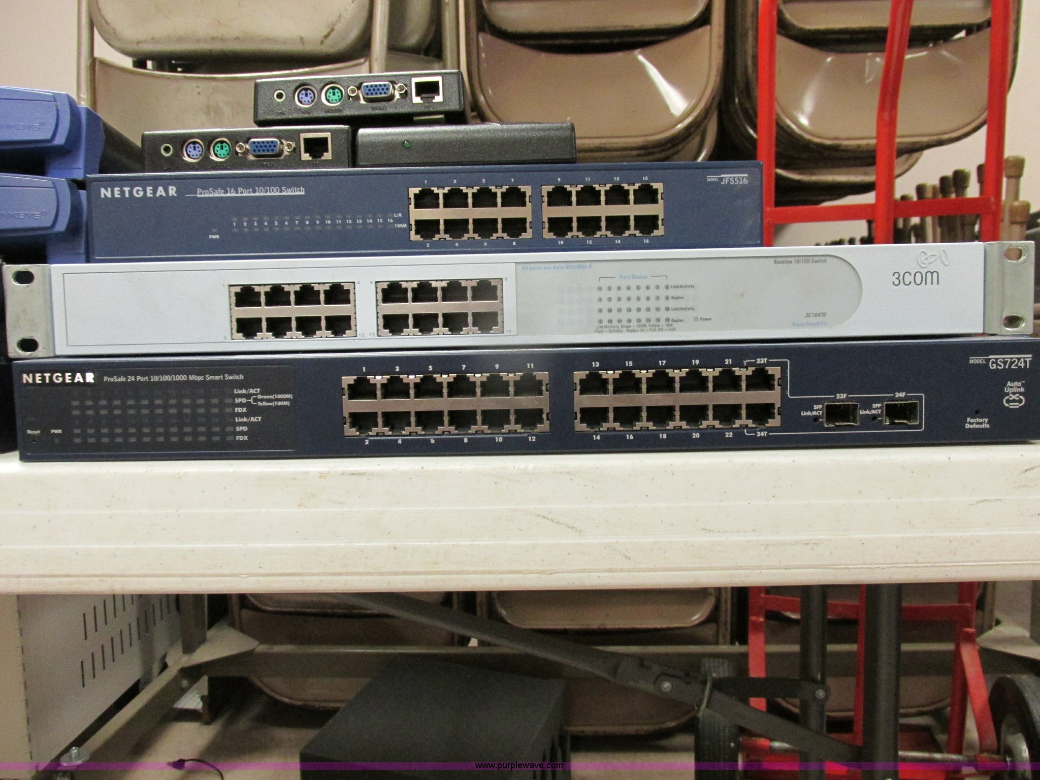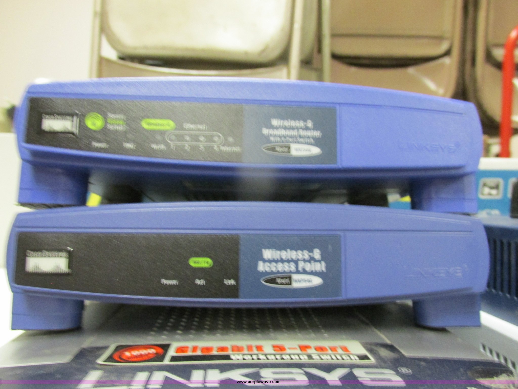 Purple Wave is selling a used Computers in Kansas. This item is a Assorted networking equipment with the following: (2) Linksys five port switch, (2) Linksys Wireless G 2.4 GHz router, Netgear WG302 wireless access point, Netgear WA102 wireless access point, Netgear AG103 wireless access point, Netgear JFS516 16 port switch, Baseline 16 port switch, Assorted power cords and patch cables
