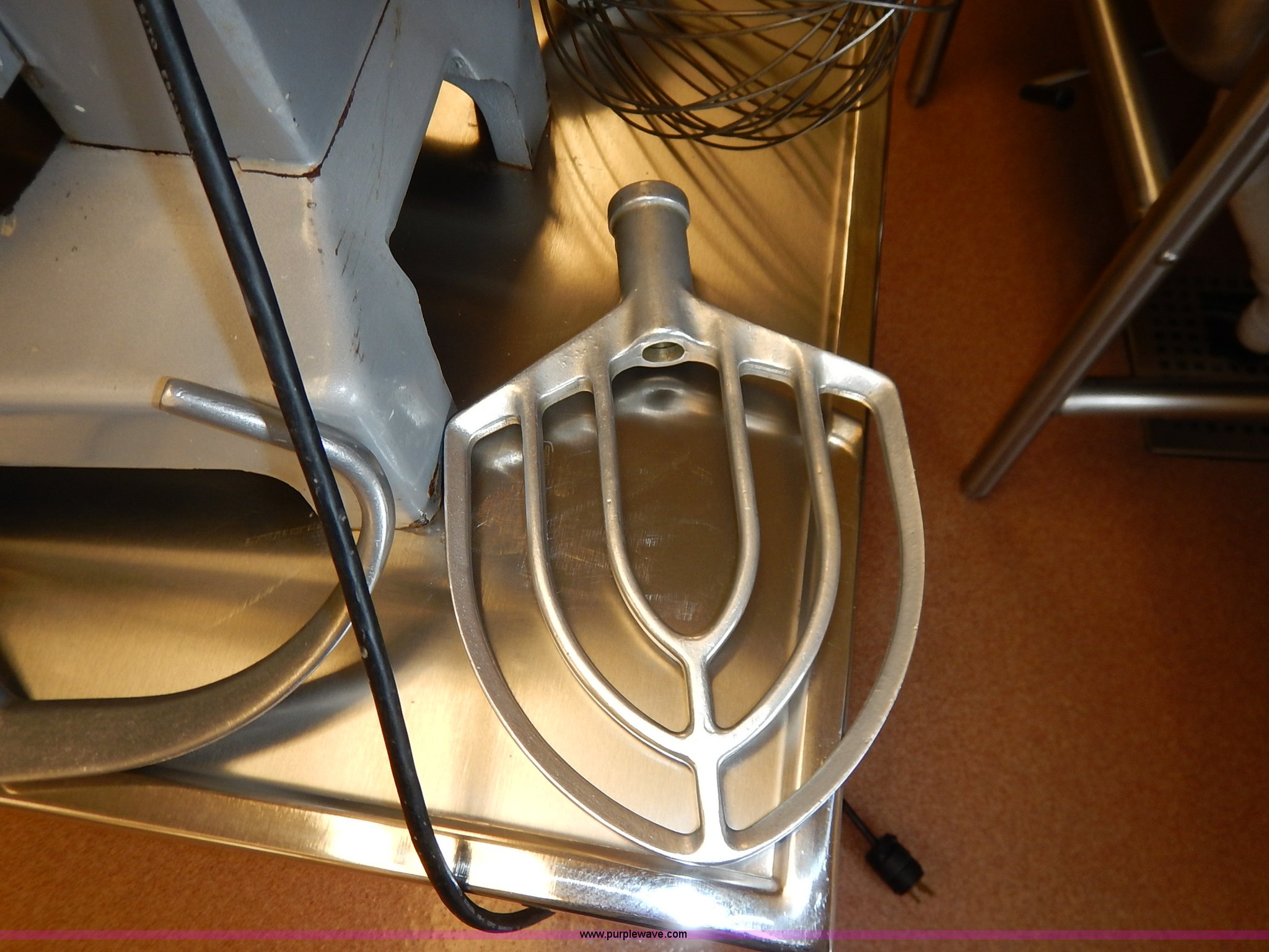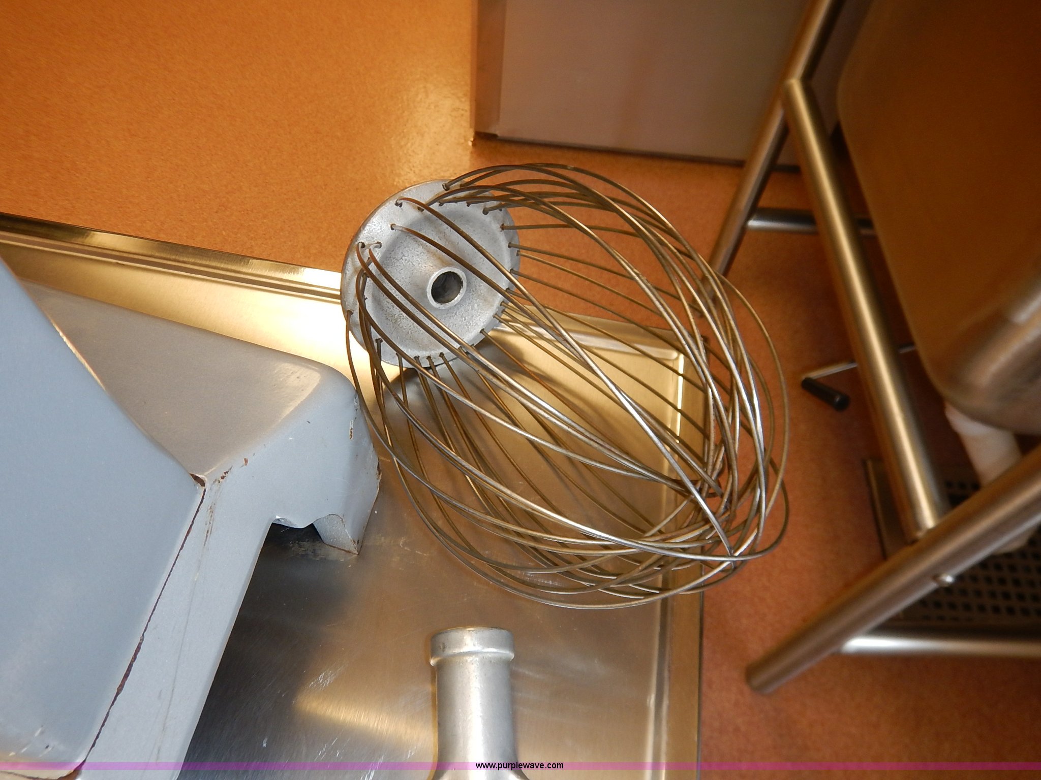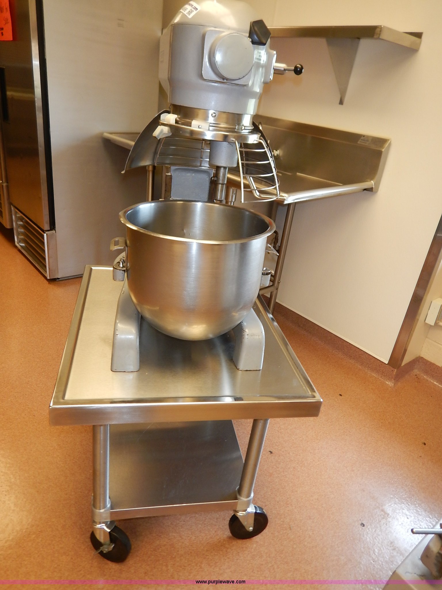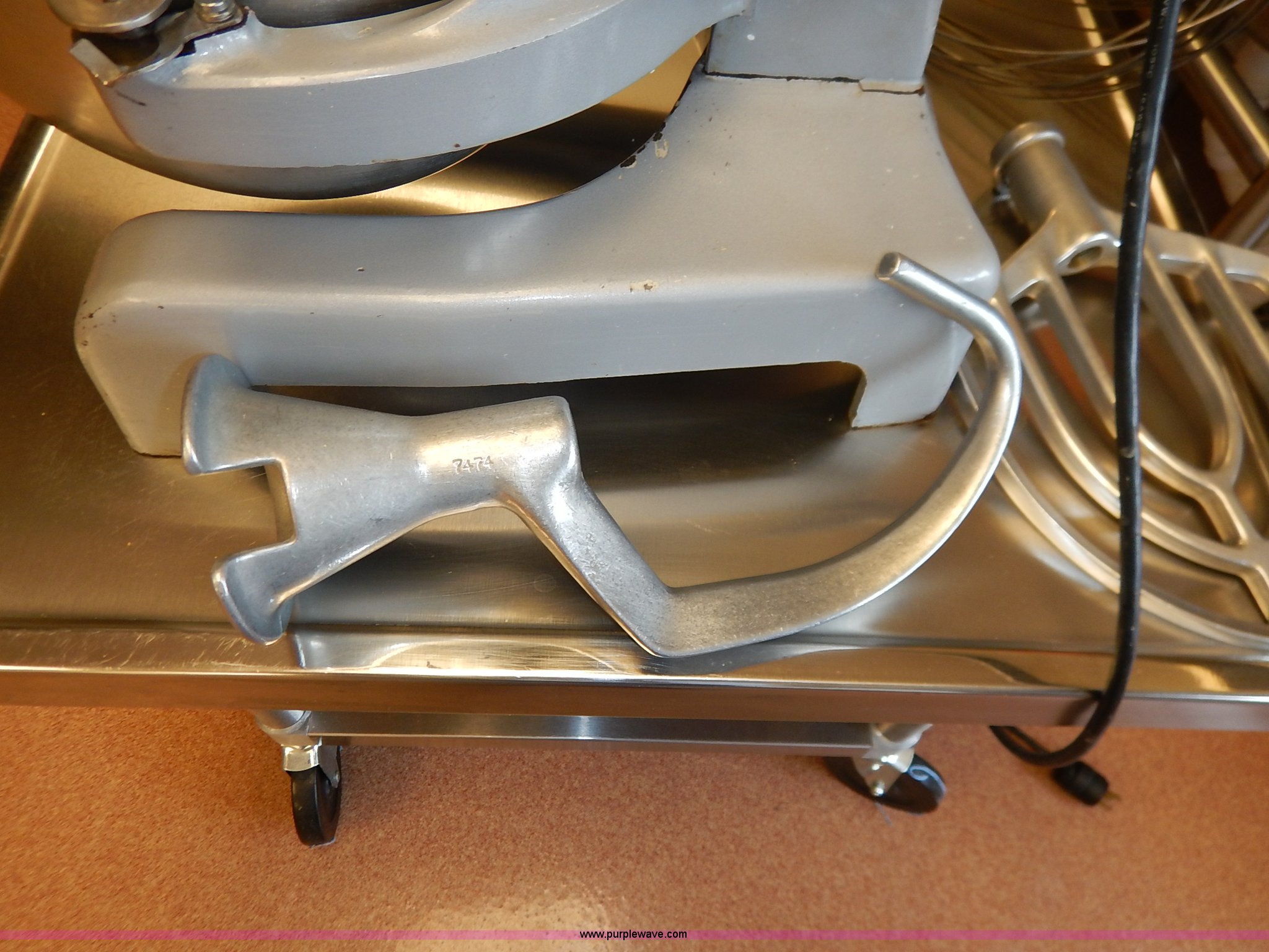 Purple Wave is selling a used Restaurant Equip. in Kansas. This item is a Hobart A200T mixer with the following: 115V, 14" bowl, 24"W x 30"D x 25"H stainless steel table, (3) mixing attachments, Mixing whip, Mixing paddle, Mixing hook, Serial 31-1175-633