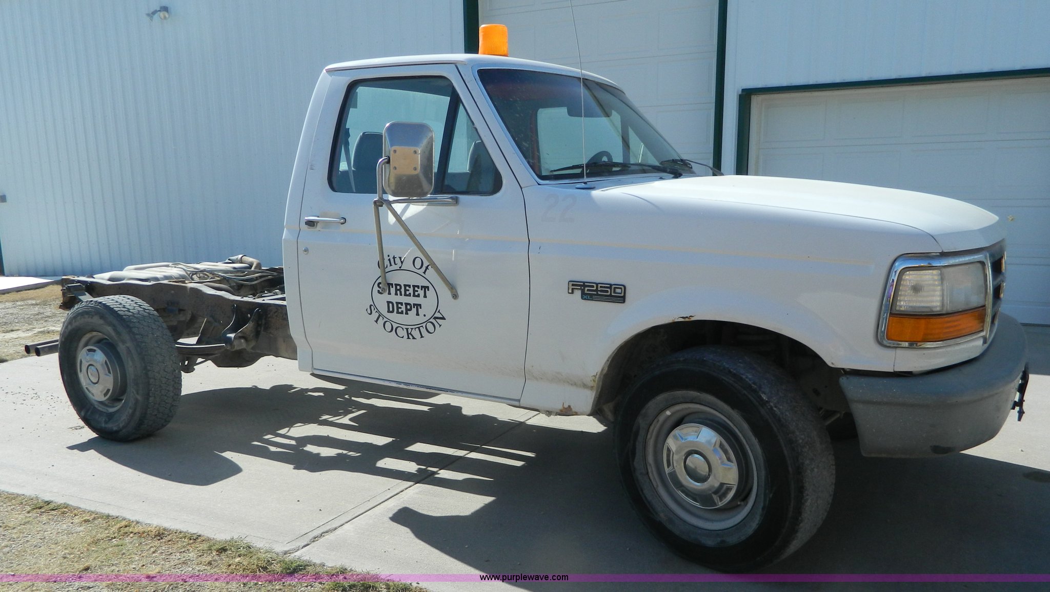 Purple Wave is selling a used 3/4 or 1 Ton Pickup or Van in Kansas. This item is a 1995 Ford F250 pickup truck cab and chassis with the following: 218,685 miles on odometer, 5.8L V8 OHV 16V gas engine, Automatic transmission, AC and heat, AM/FM, Manual windows and locks, Vinyl interior, 235/85R16 tires, Interior/exterior cosmetic damage, Rust, No bed