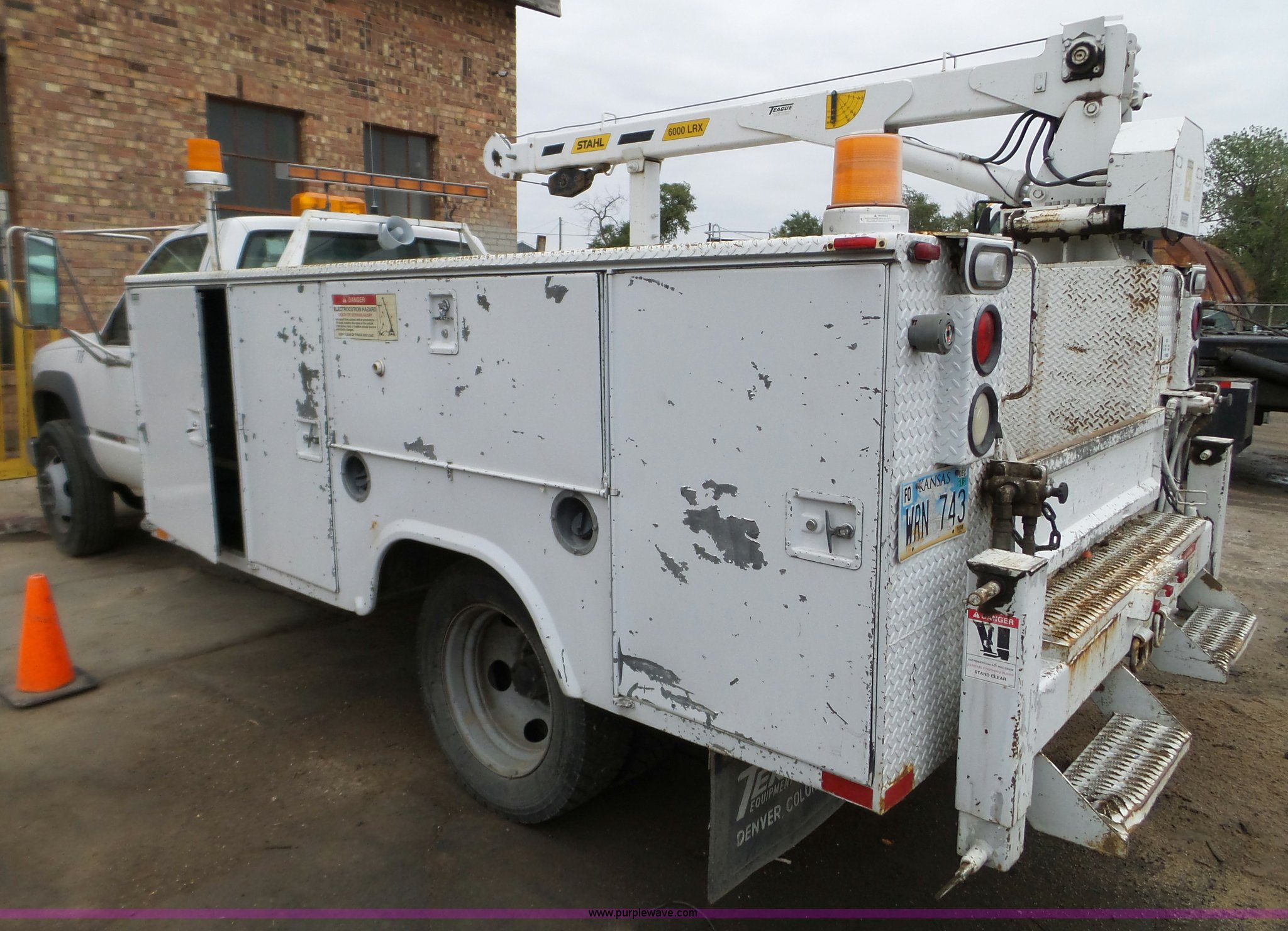 Purple Wave is selling a used Service Truck in Kansas. This item is a 2000 GMC Sierra Classic 3500 service truck with crane with the following: 66,960 miles on odometer, 1,283 hours on meter, 6.5L V8 OHV 16V turbo diesel engine, Five speed manual transmission, AC and heat, AM/FM, Manual windows and locks, Vinyl interior, Block heater, PTO, Stahl service bed, (8) compartments, Shelving, Stahl 6000LRX crane, 6,000 lbs max lift capacity, Hydraulic reservoir, Valve turner and hose have been removed, (2) outriggers, Remote, Receiver hitch, 225/70R19.5 tires, Power steering pump needs to be replaced, CB not included, Contents not included, Unit# 718