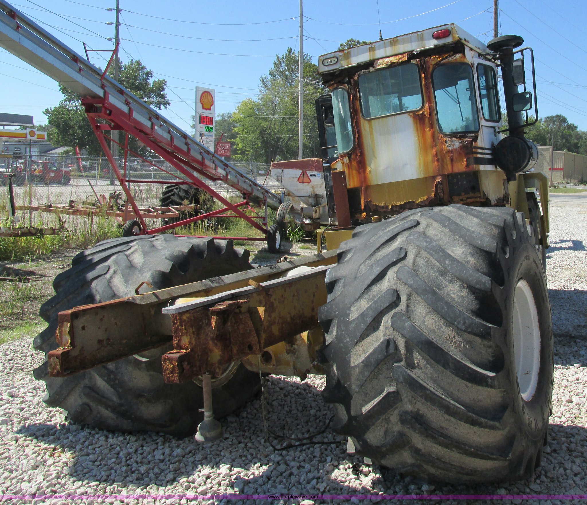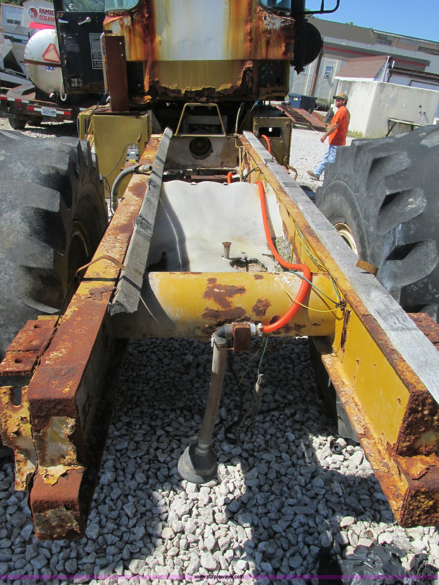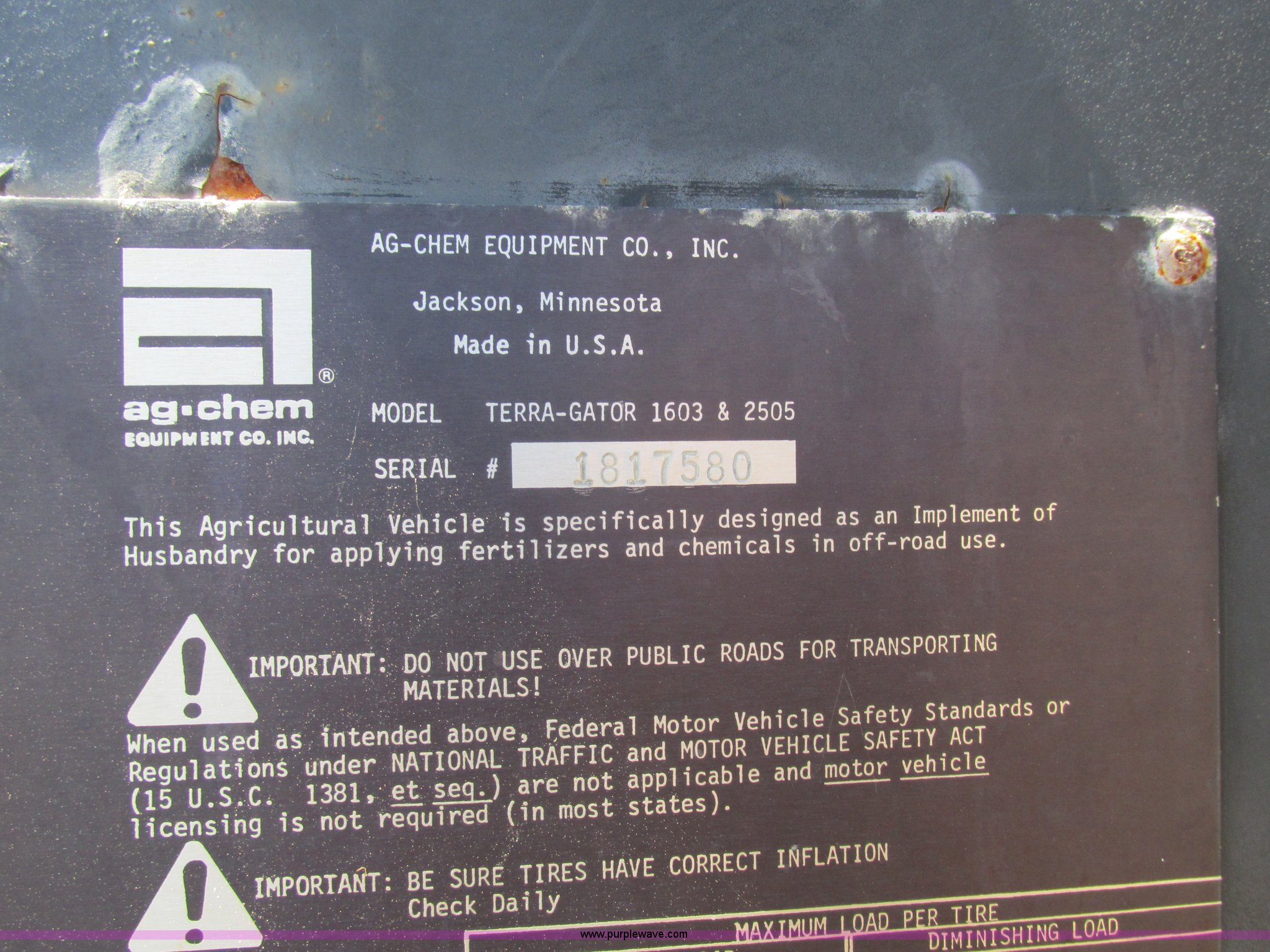 Purple Wave is selling a used Applicator Self Propelled in Missouri. This item is a Ag-Chem TerraGator 1803 applicator cab and chassis with the following: 5,814 hours on meter, Cummins six cylinder turbo diesel engine, Eaton Fuller Road Ranger eight speed manual transmission, 66x43.00-25 NHS tires, One tire flat, Rust, Non-operational unit, Serial 1817580