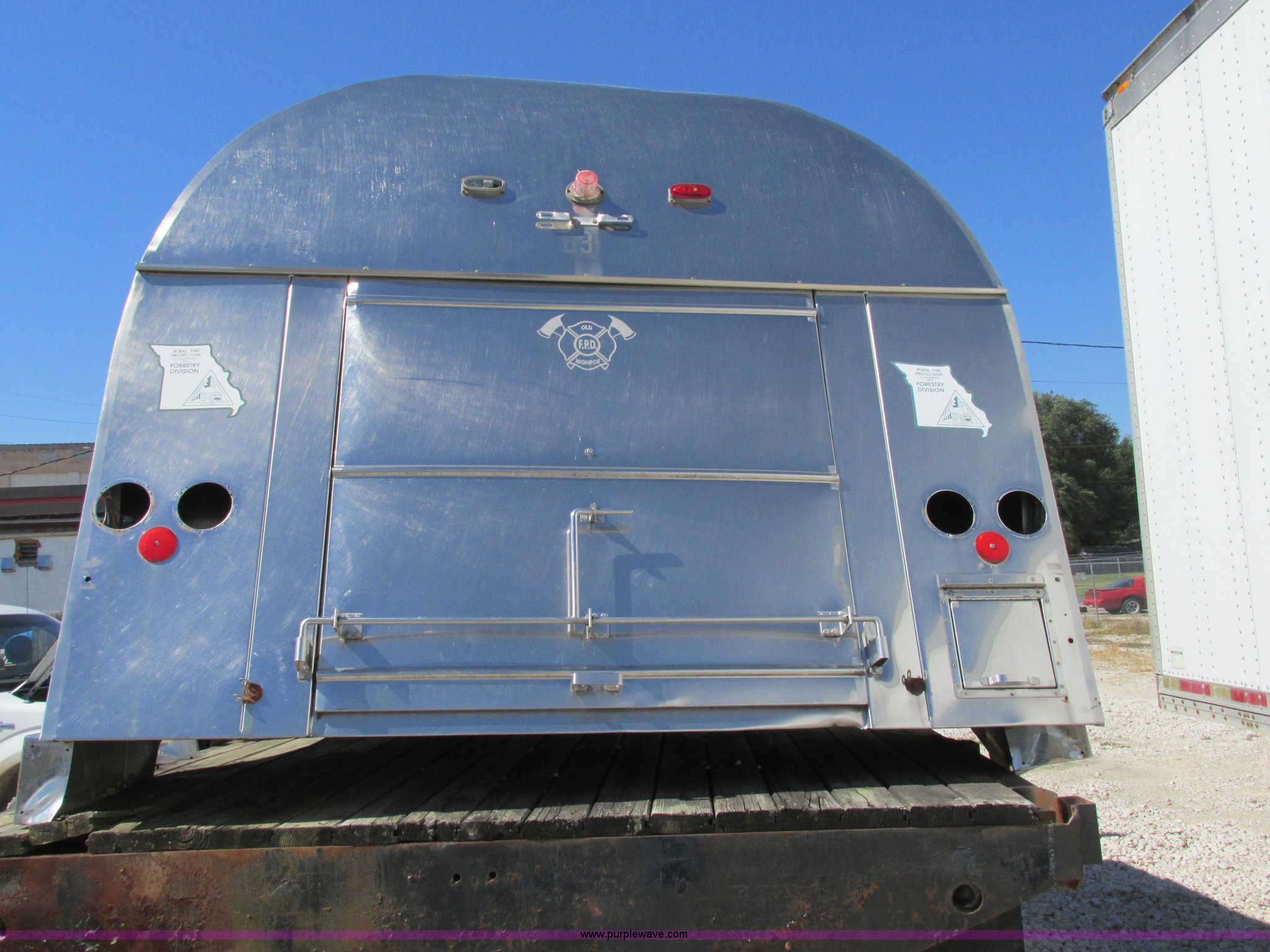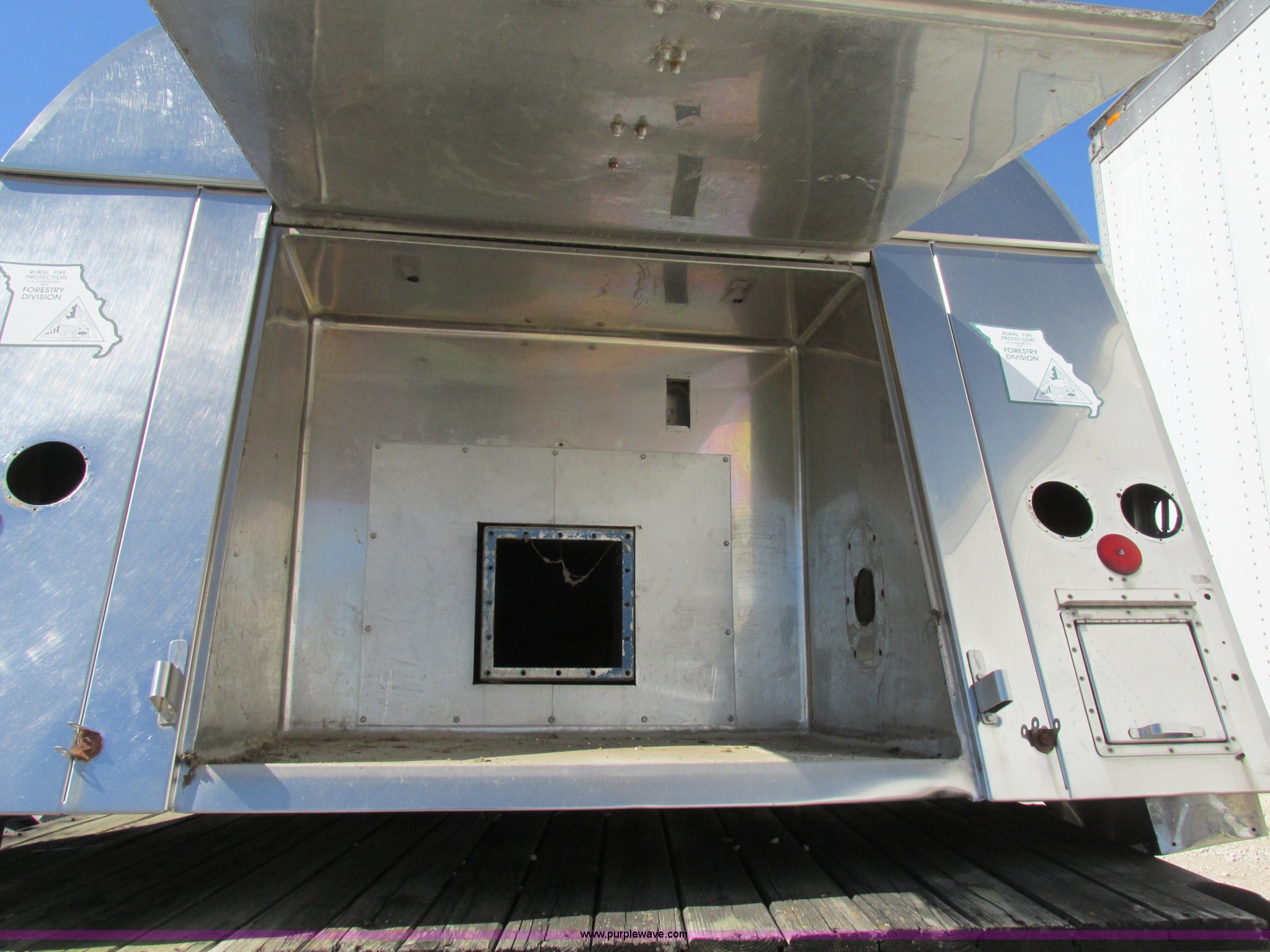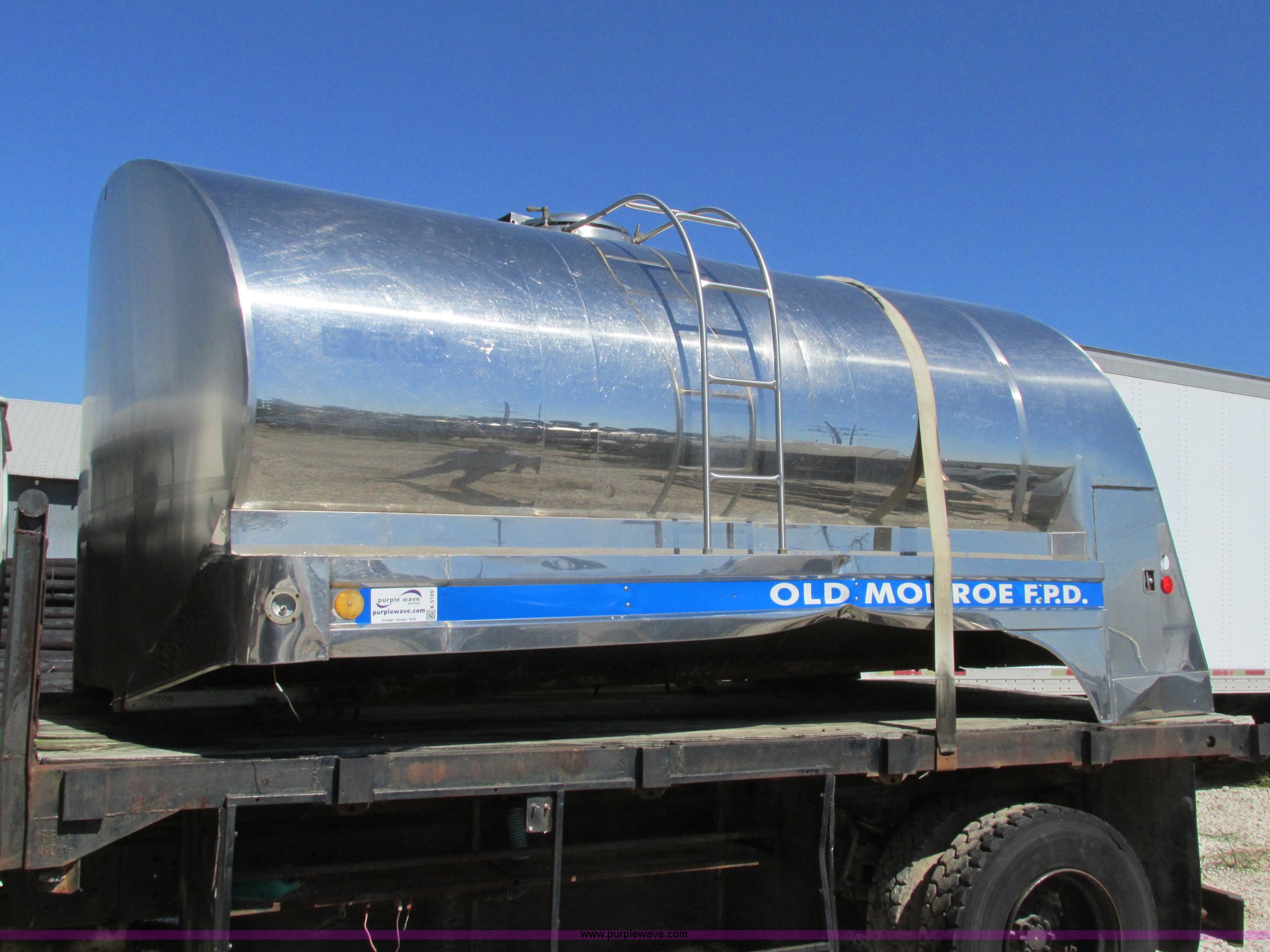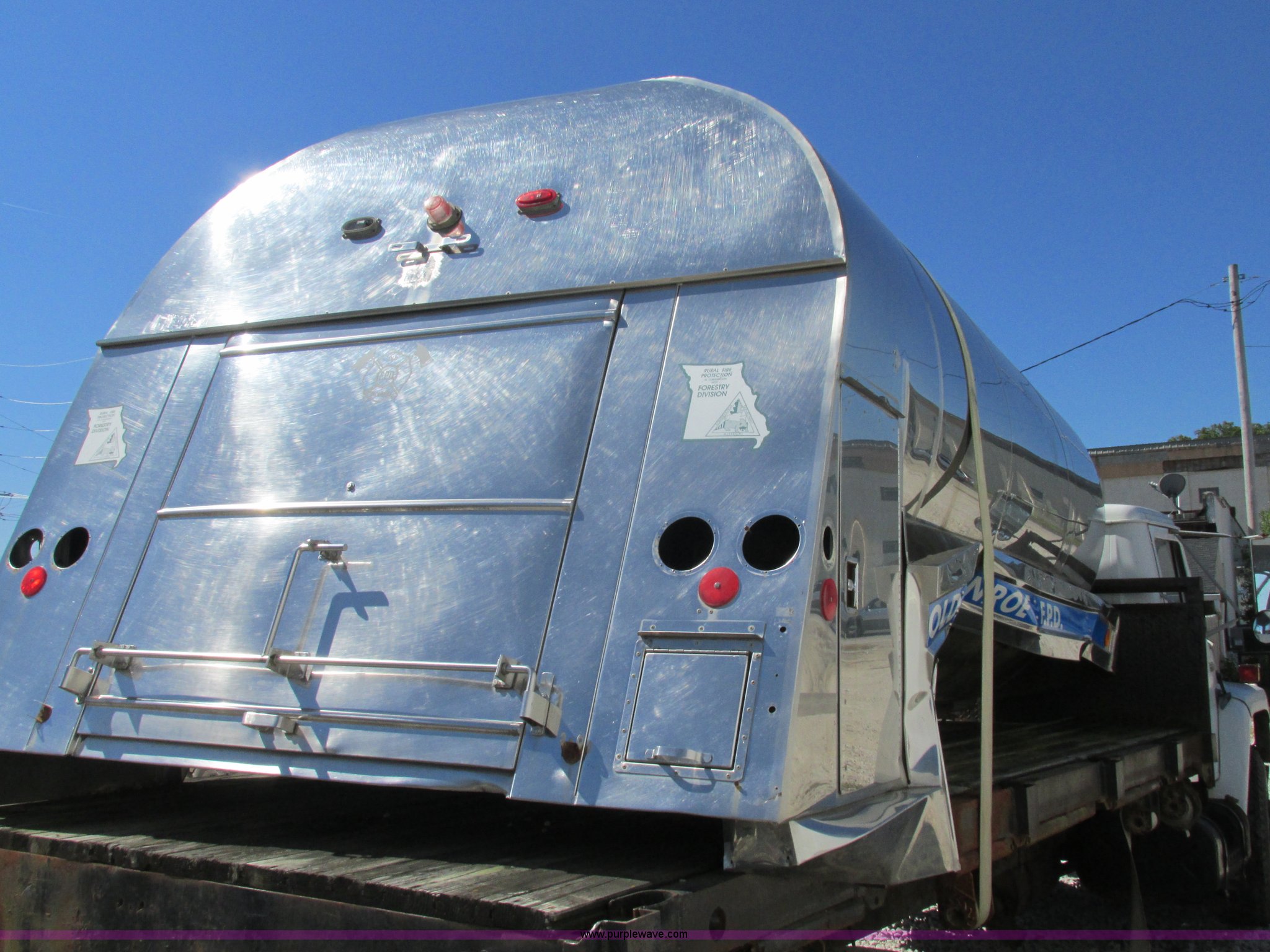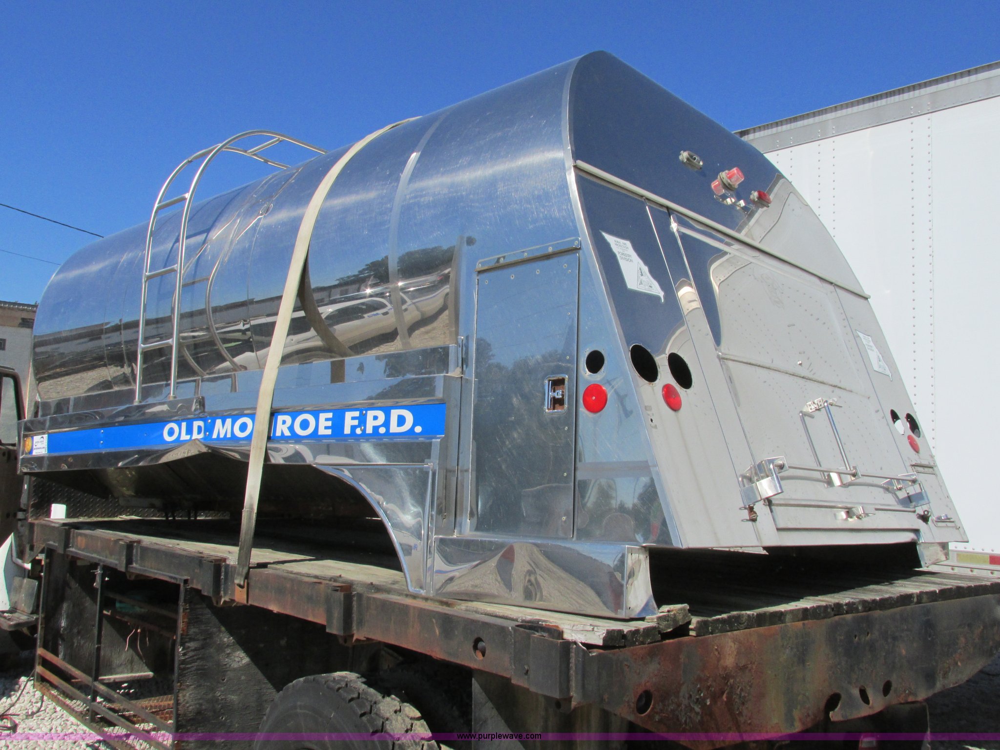 Purple Wave is selling a used Truck Part and Attach. in Missouri. This item is a Stainless steel tank bed with the following: 15'L x 8'W, 1,000 gallon capacity, Access ladder to top hatch, Cosmetic damage, Removed from fire truck
