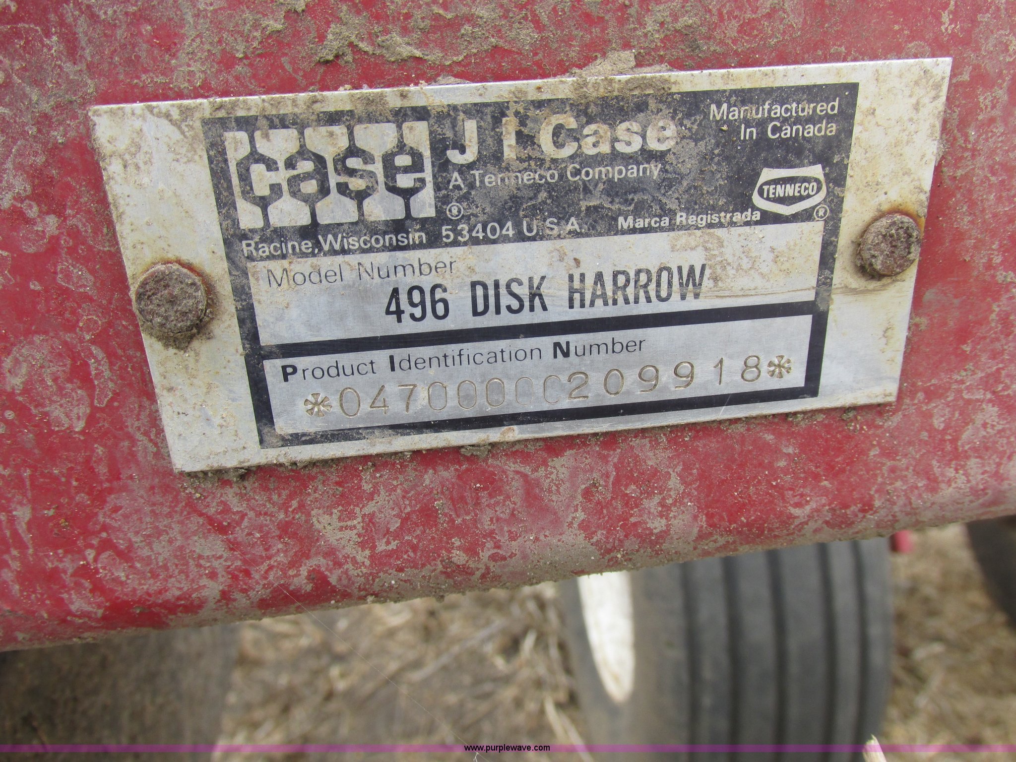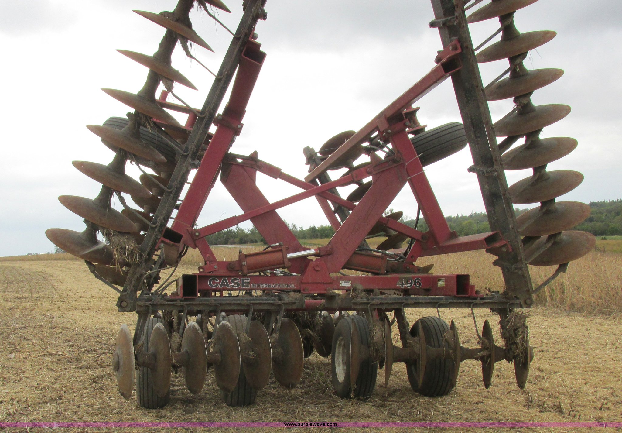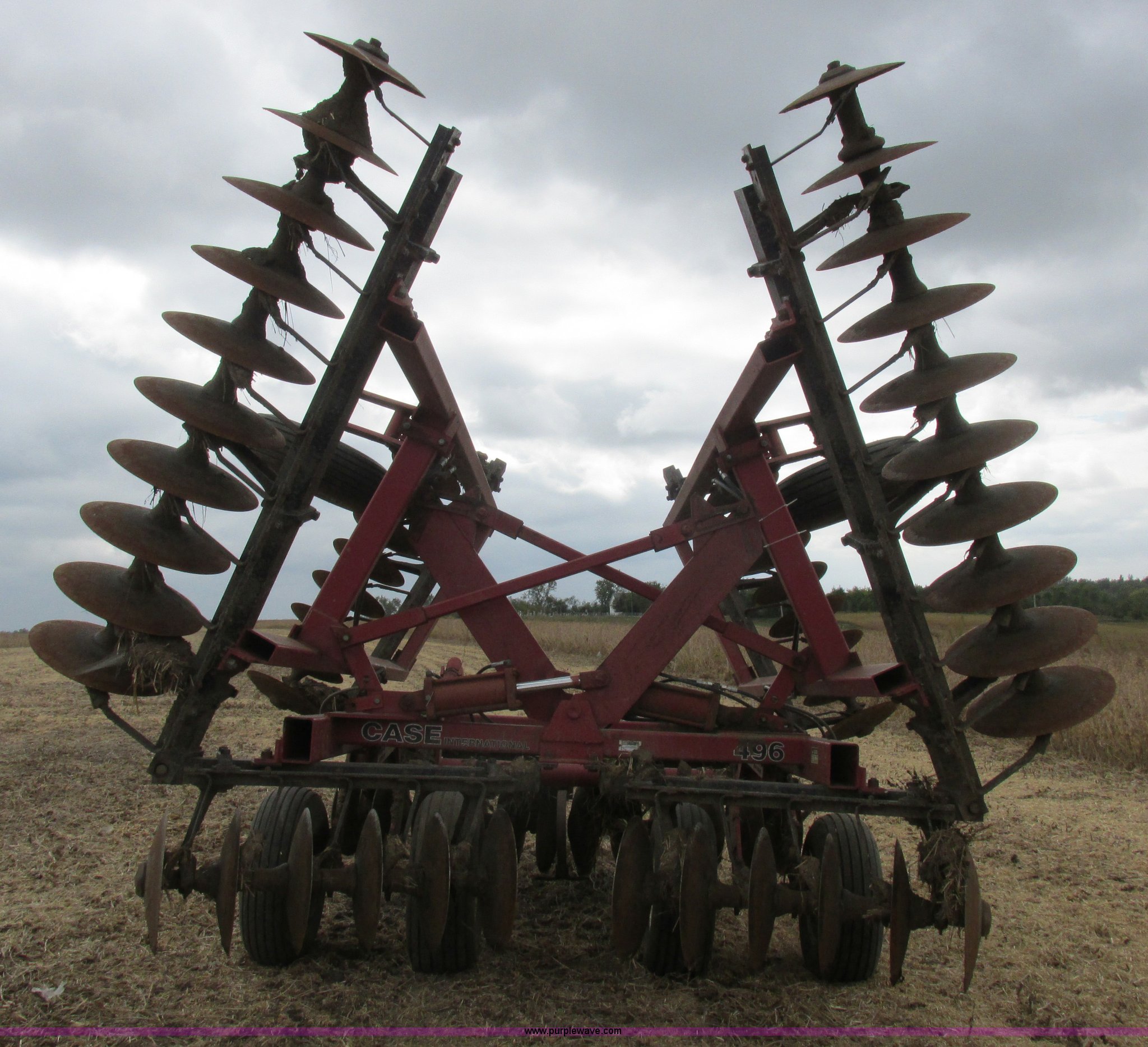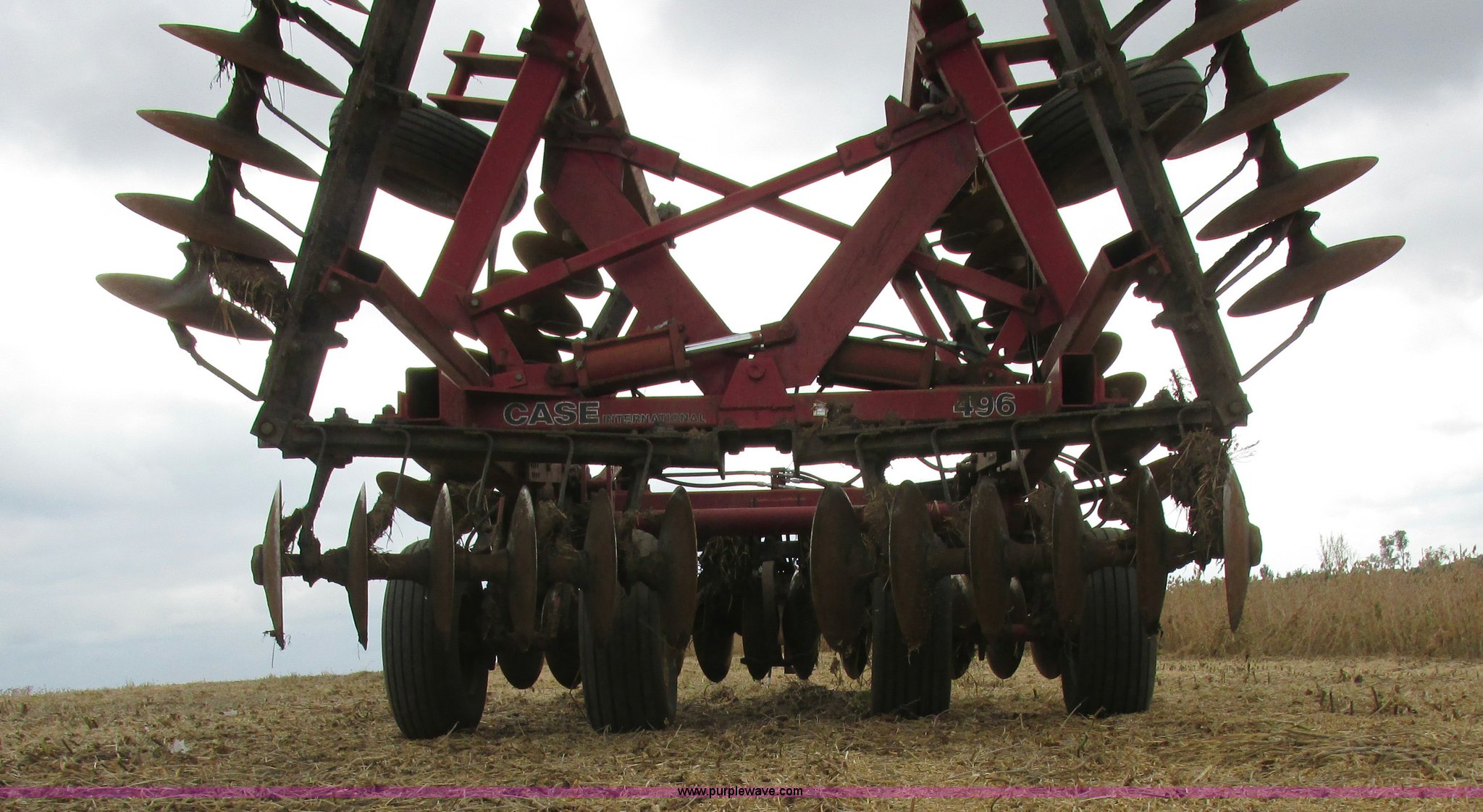 Purple Wave is selling a used Disk in Missouri. This item is a Case IH 496 disk with the following: 24'W, Hydraulic fold, Hydraulic couplers, Pin hitch, 9.5L-14 tires, Serial 0400000209918