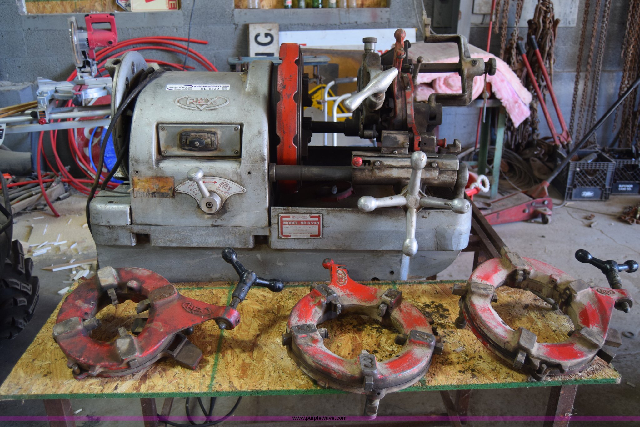 Purple Wave is selling a used Tools in Kansas. This item is a Rex 6590 pipe threader with the following: Single phase, 115V, Assorted dies, Serial L61354