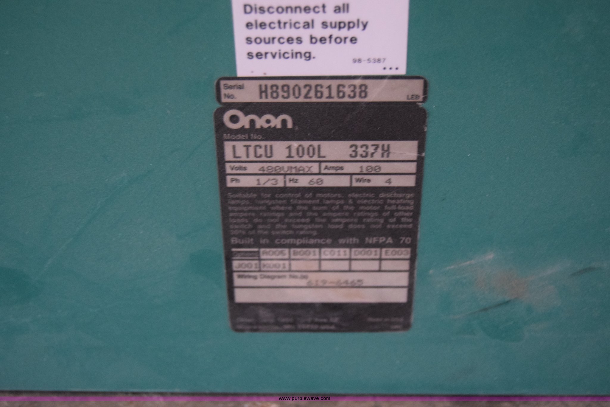Purple Wave is selling a used Generator Set in Kansas. This item is a Onan generator with the following: Model 15.0RJC-3CR/11976AB, 420 hours on meter, Four cylinder dual fuel engine, Natural gas and gas capable, Set up for natural gas, 120/240V, Single phase, 15 kW, 63 amps, 60 Hz, 1,800 RPM, Onan transfer switch, Model LTCU/100L/337H, 70" x 26" x 36"H