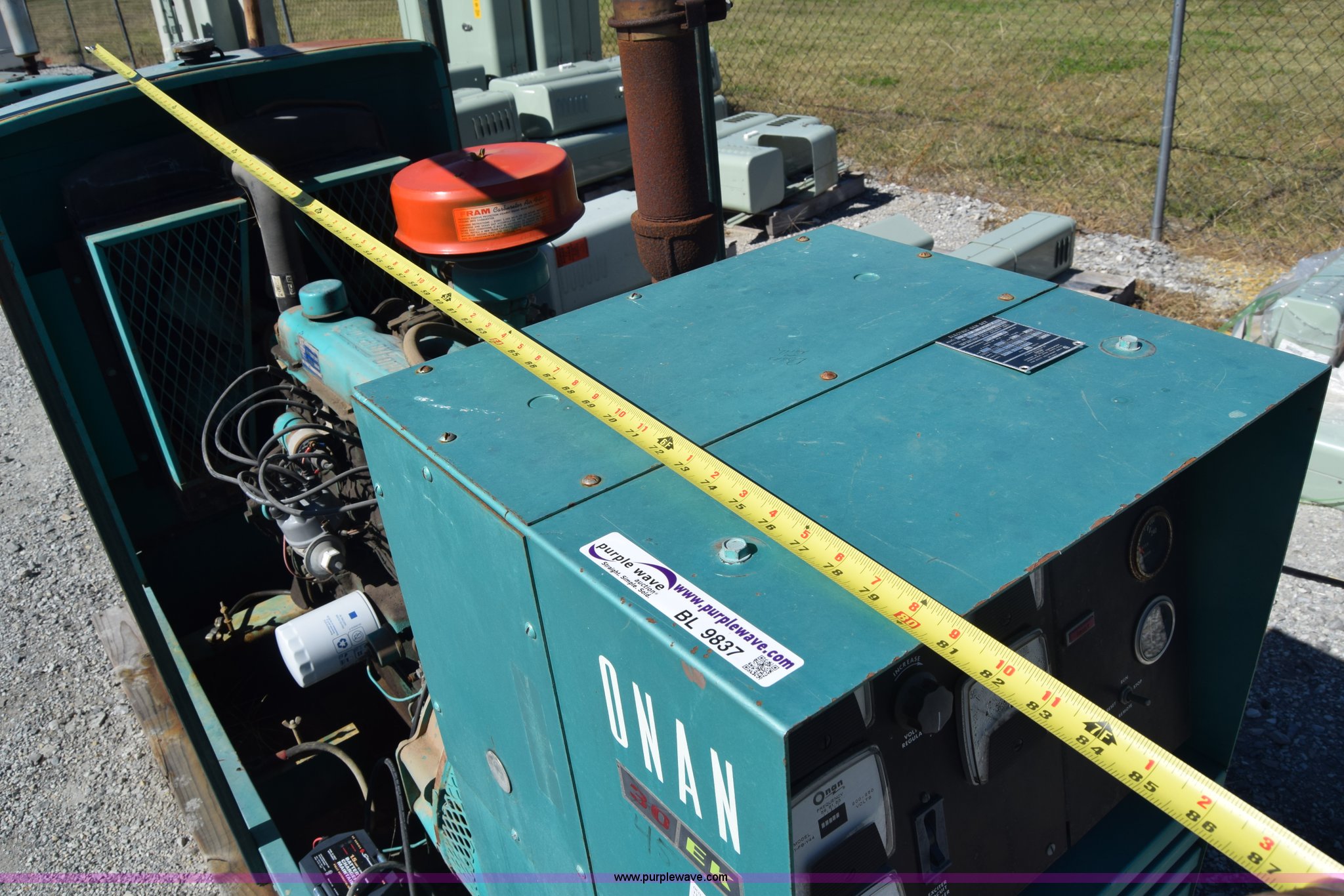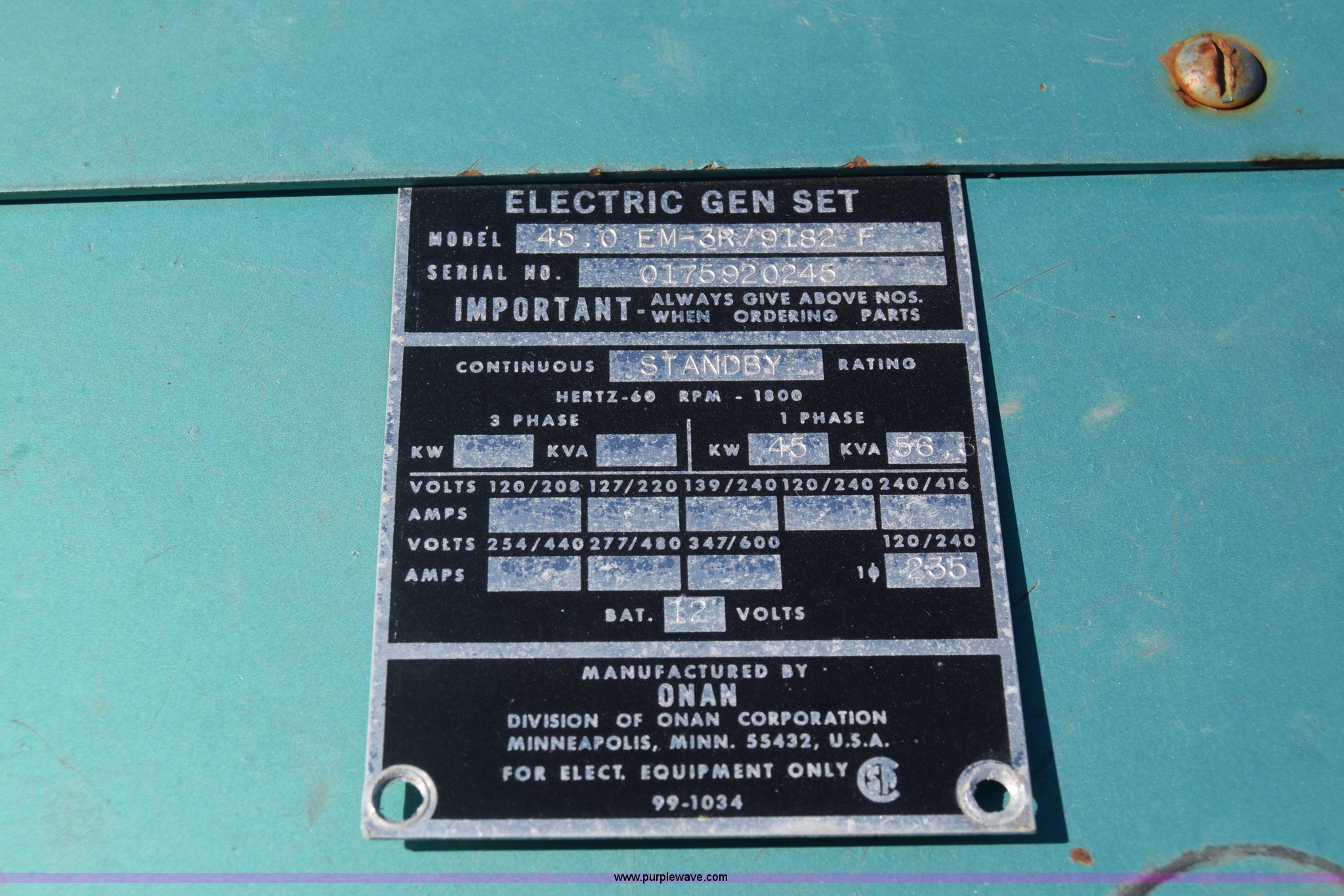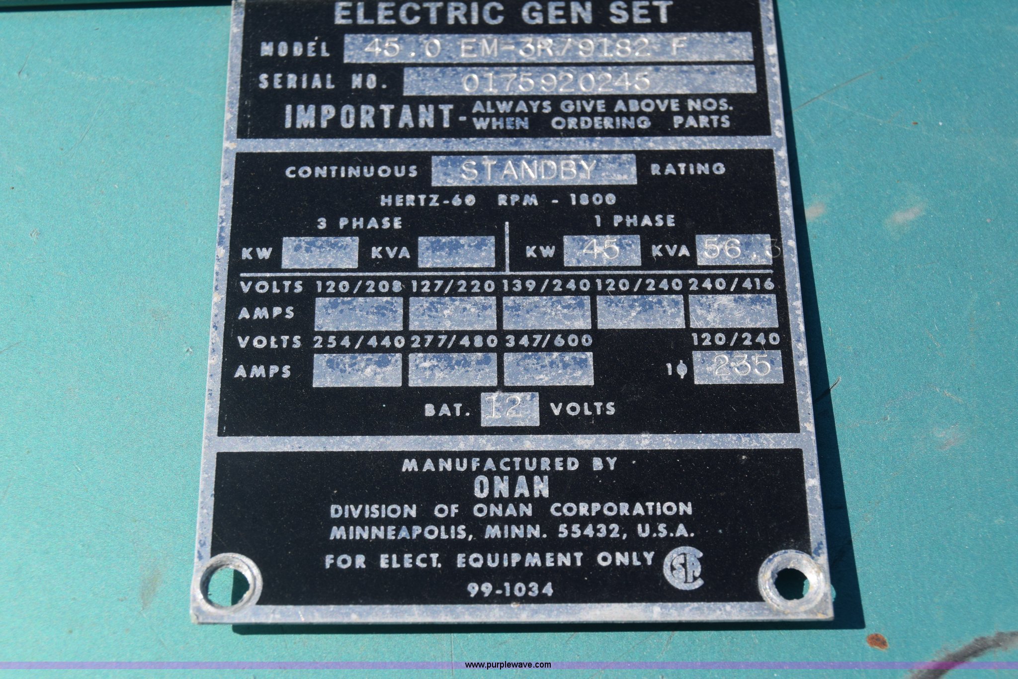 Purple Wave is selling a used Generator Set in Kansas. This item is a Onan 35EK generator with the following: Model 45.0EM-3R/9182F, 2,088 hours on meter, Ford six cylinder dual fuel engine, Natural gas and gas capable, Set up for natural gas, 1.5 amp battery charger/maintainer, 45 kW, 56 kVA, Single phase, 80" x 36" x 72"H
