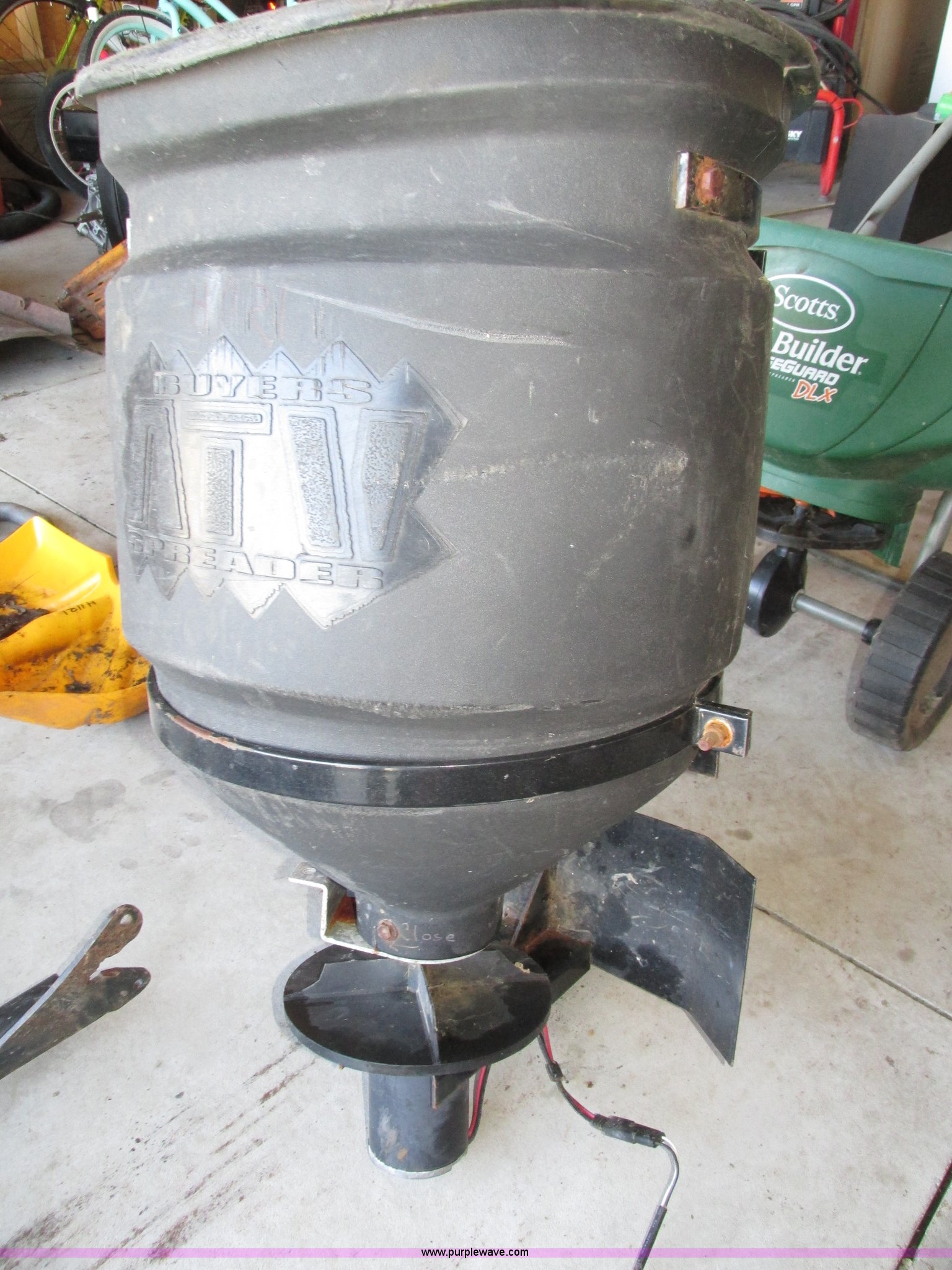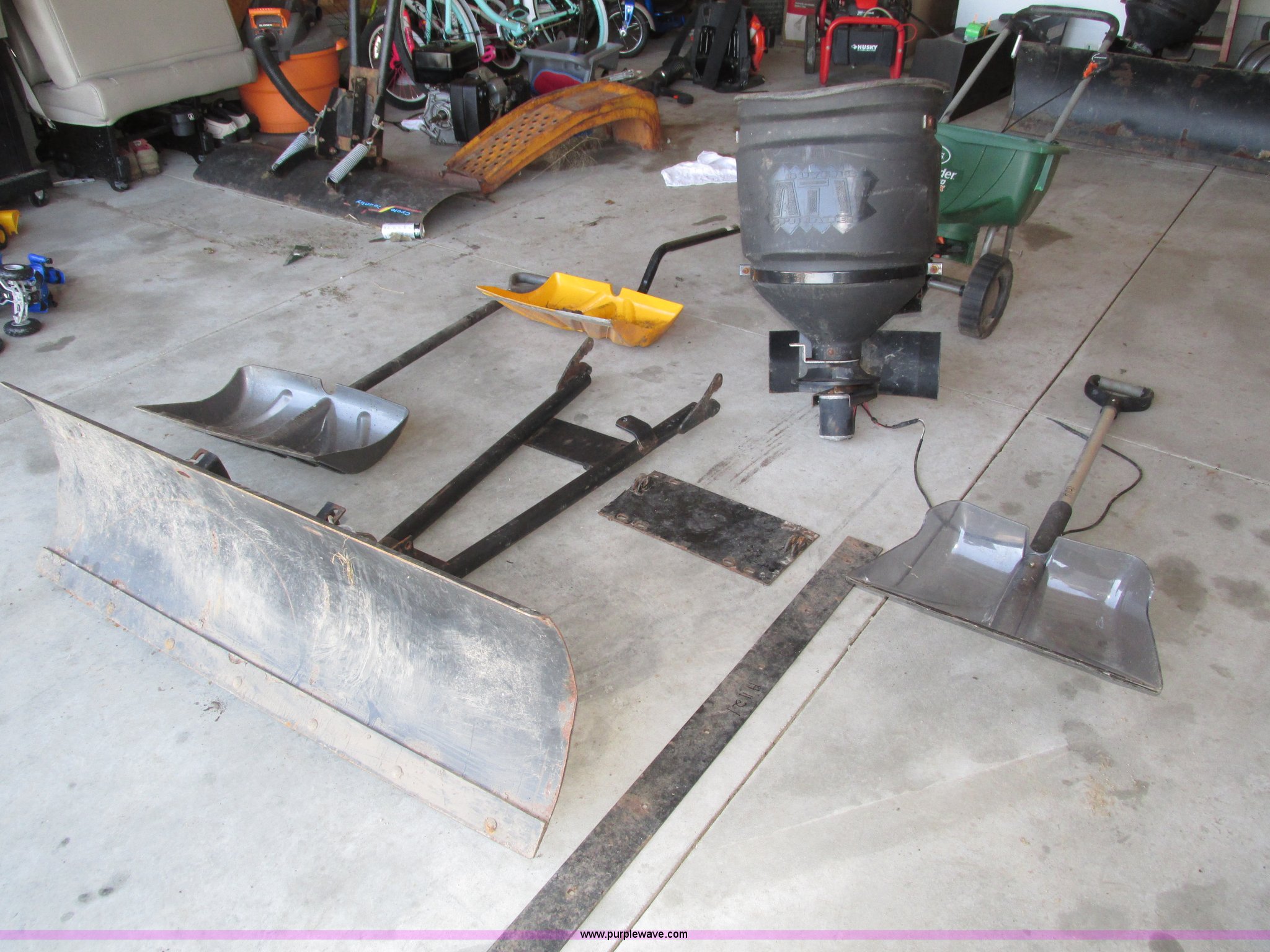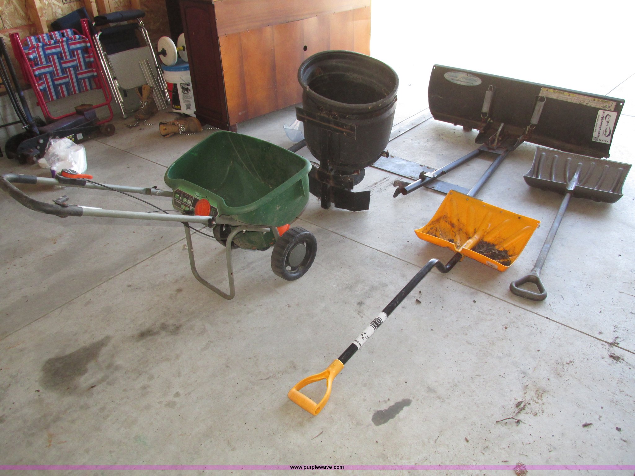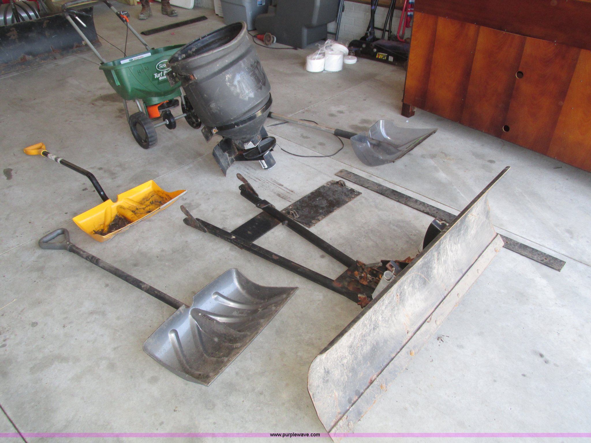 Purple Wave is selling a used Lawn and Garden in Nebraska. This item is a Assorted snow removal tools and accessories with the following: Cycle Country 48"W x 15"H snow blade, Additional cutting blade and mounting bracket, Previously used with ATV, Buyers ATV plastic salt spreader, 1 1/2 bag capacity, 8" spinner, 75 lbs capacity, No lid, Previously used with ATV, 20"W plastic snow shovel, D-handle, Sun Cast 20"W plastic snow shovel, D-handle, 18"W plastic snow shovel, Ergonomic D-handle, Scotts EdgeGuard DLX broadcast spreader