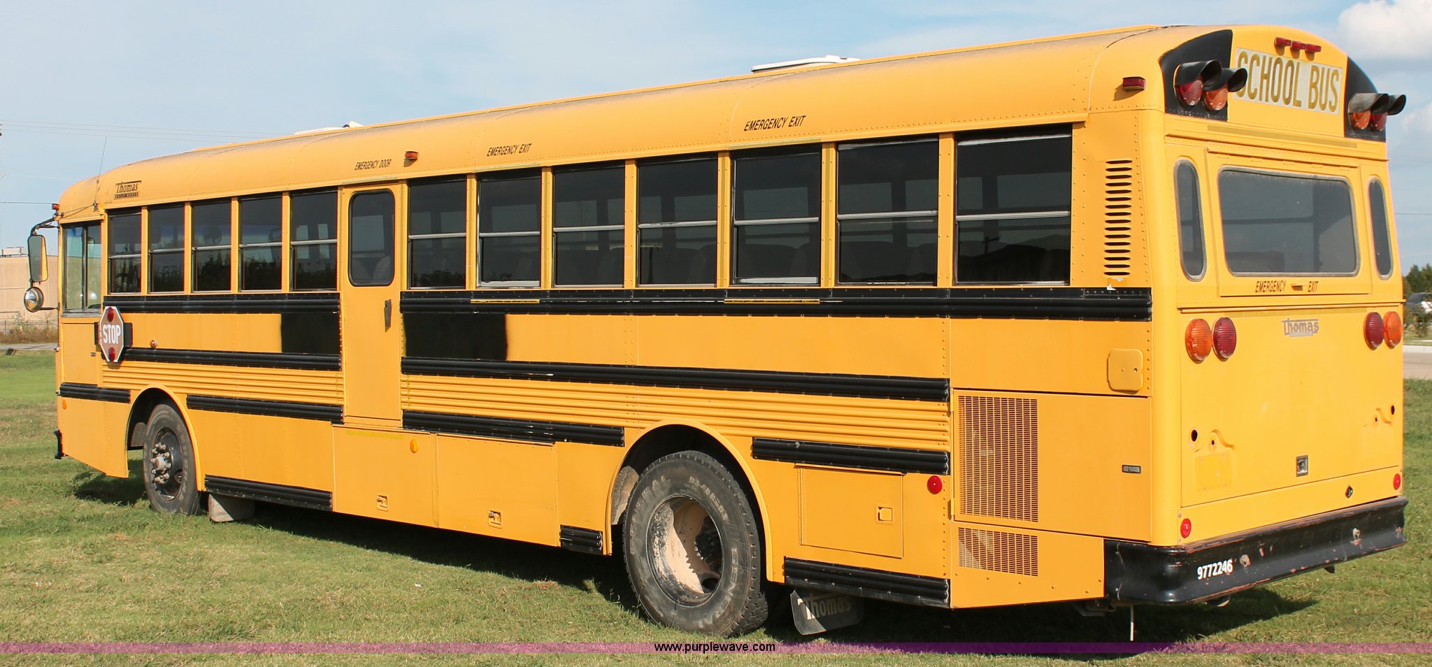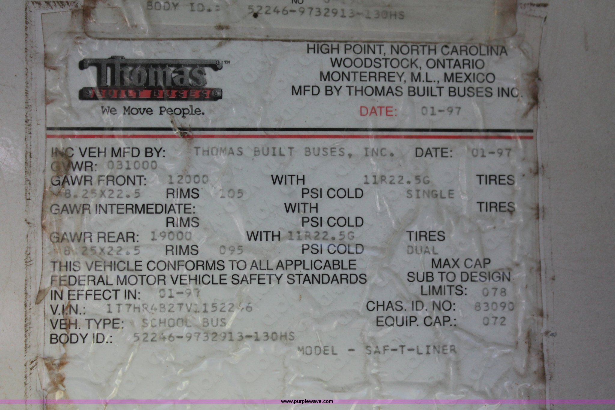 Purple Wave is selling a used Bus in Oklahoma. This item is a 1997 Thomas Built Saf-T-Liner MVP ER school bus with the following: 107,477 miles on odometer, 7,648 hours on meter, Cummins six cylinder turbo diesel engine, Automatic transmission, Heat, AM/FM/cassette, Vinyl interior, Rear, roof, and side egress, One roof hatch missing, 11R22.5 tires