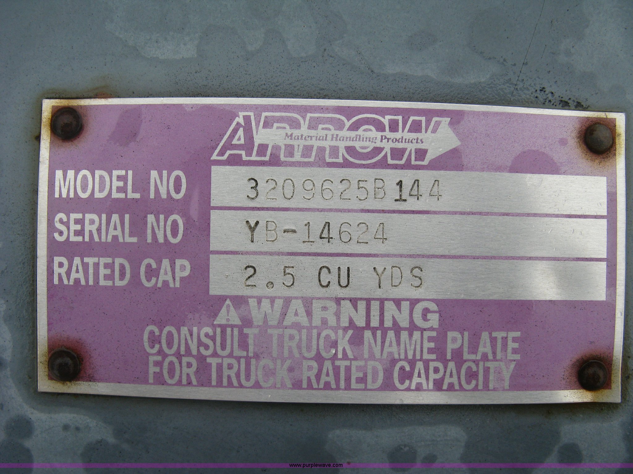 Purple Wave is selling a used Bucket or Loader Attach. in Kansas. This item is a Arrow loader bucket with the following: Model 3209625B144, 8'W, 2.5 cu. yd. capacity, Bolt-on cutting edge, Integrated tool carrier application, Serial YB-14624