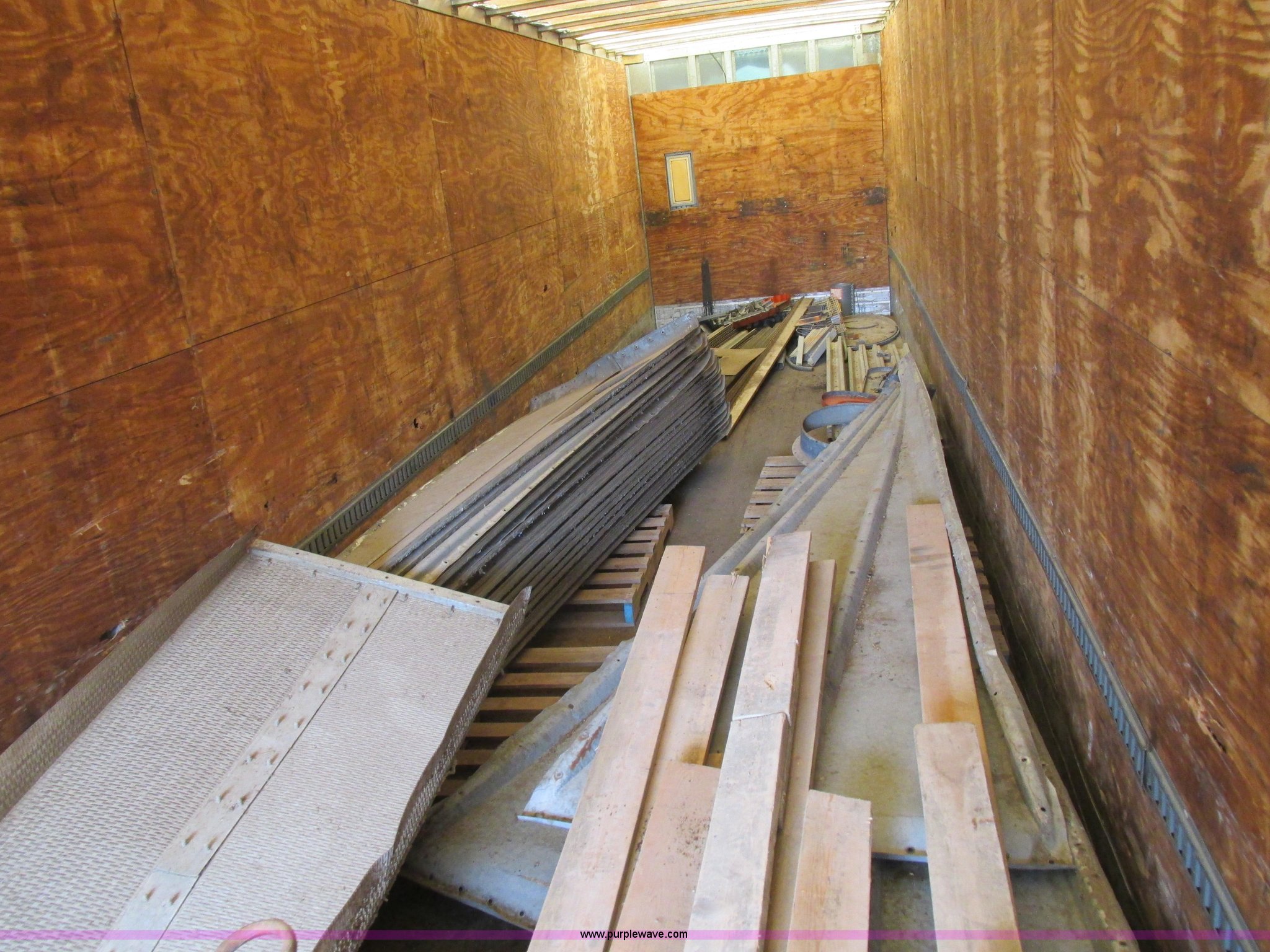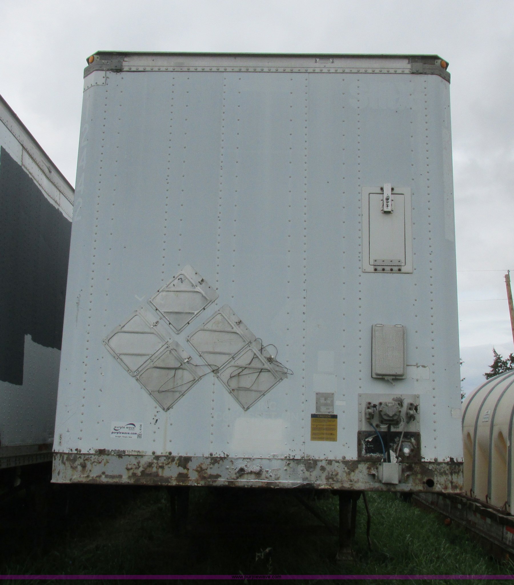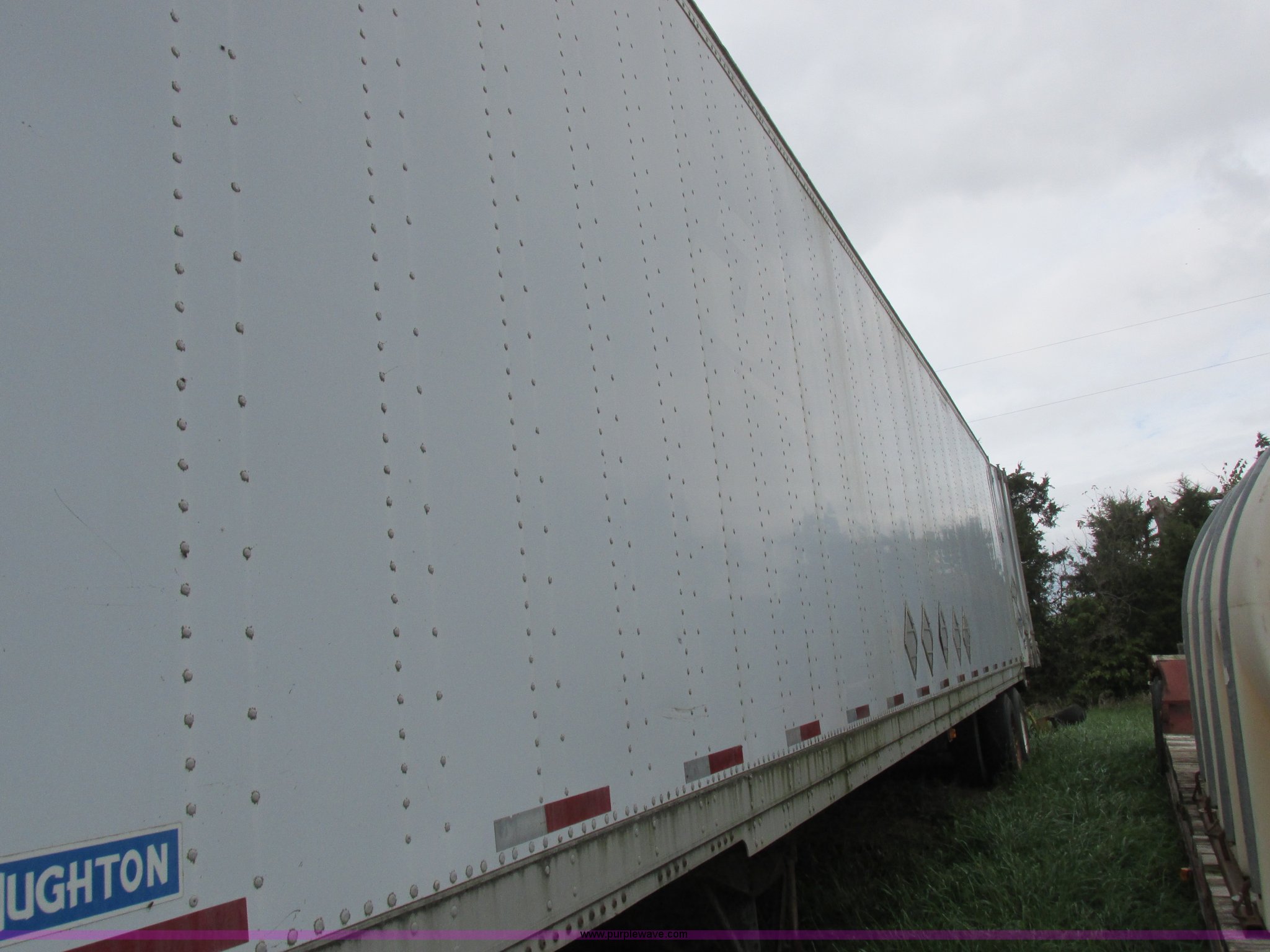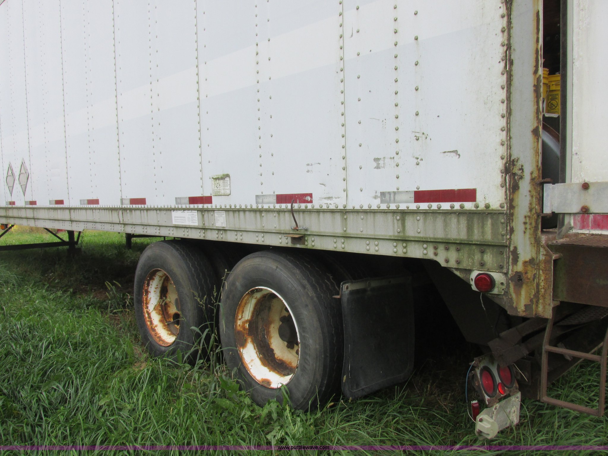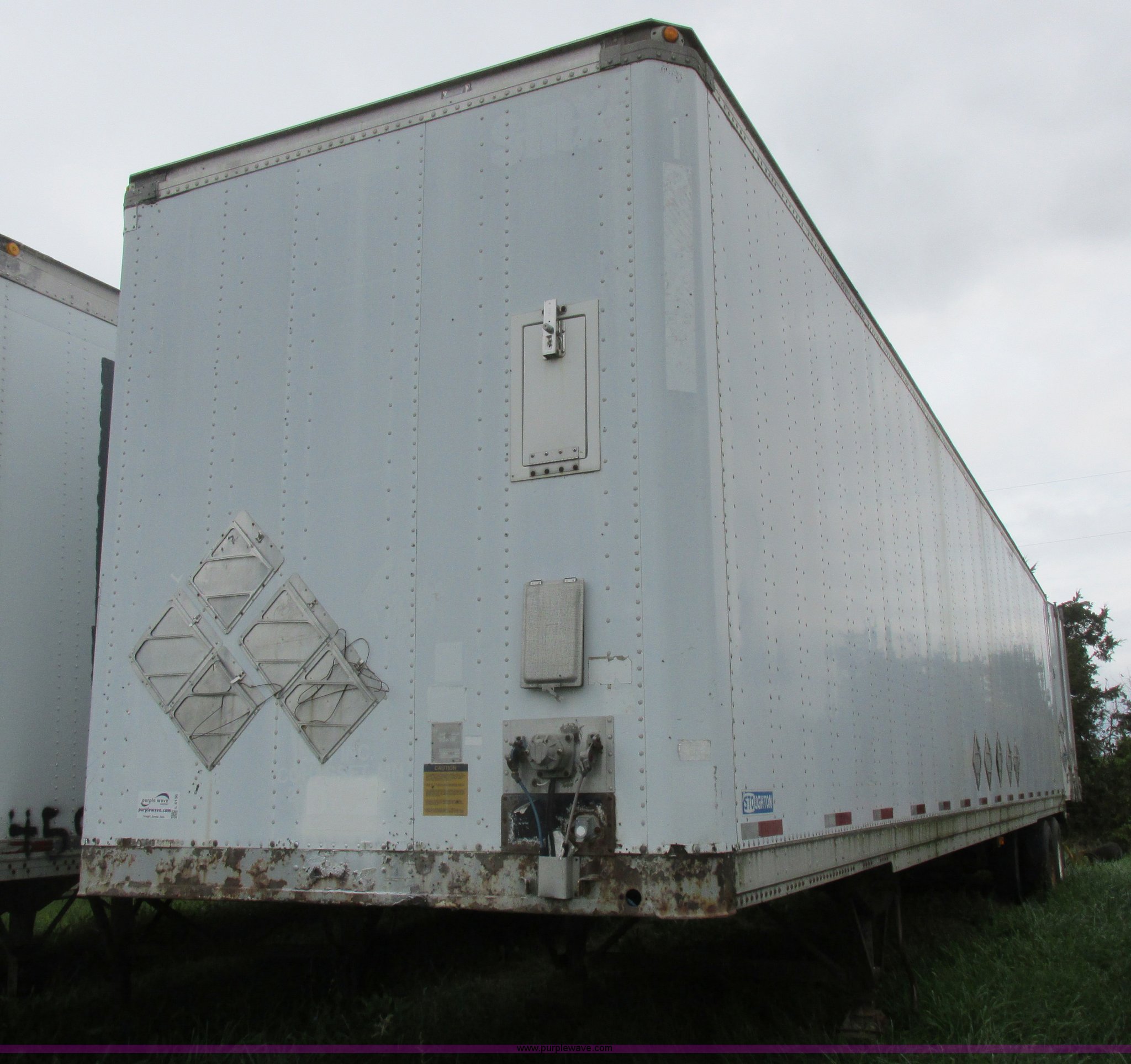 Purple Wave is selling a used Dry Van Trailer in Missouri. This item is a 1996 Stoughton dry van trailer with the following: Model AVW4857SCAR, 48'L x 102"W, Wood deck, Swing-out rear doors, Lift gate, Unknown operating condition, Assorted grain bin parts and accessories, Dual leg landing gear, Air suspension, Air brakes, Tandem axle, 295/75R22.5 tires, GVWR 70,000 lbs