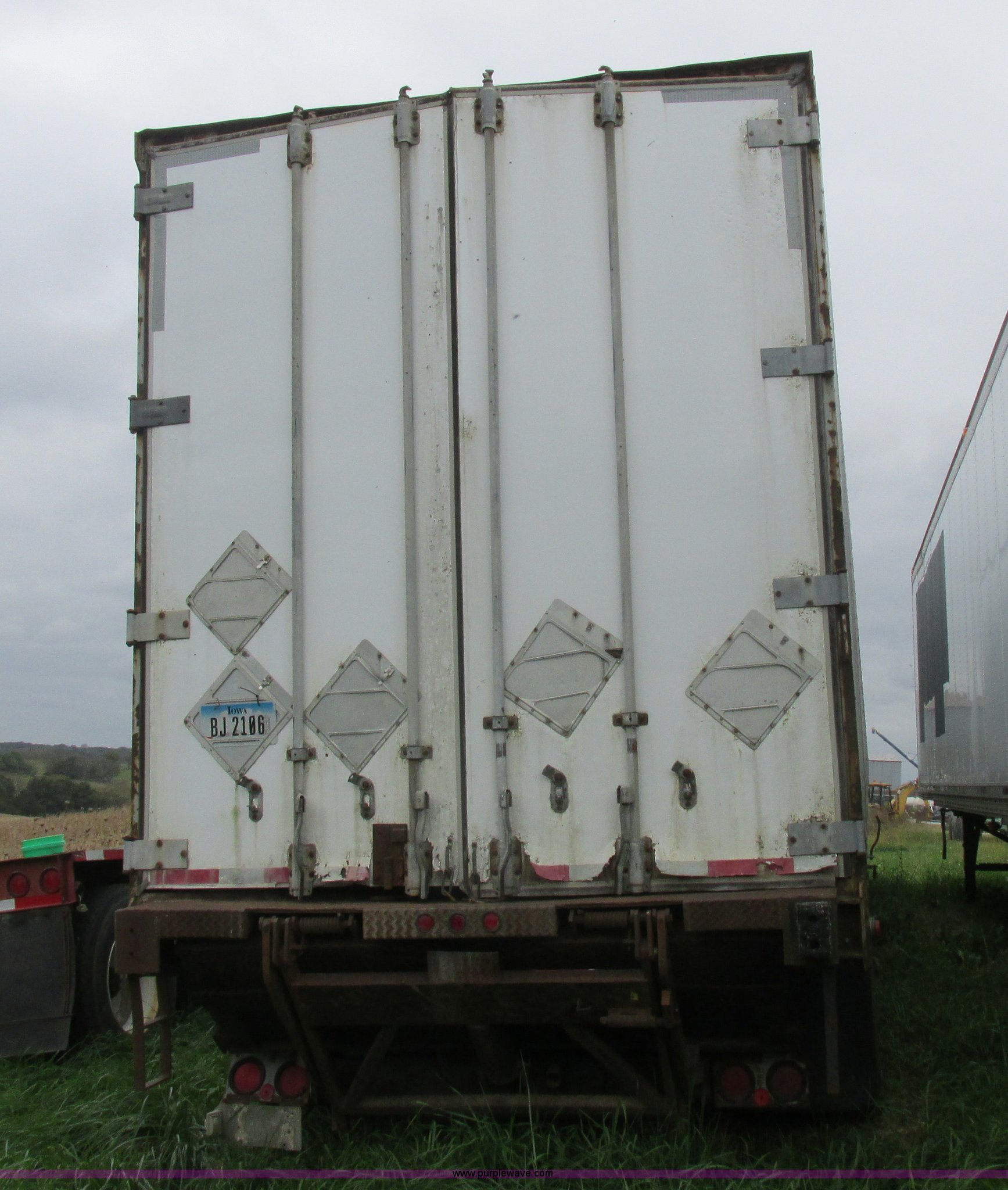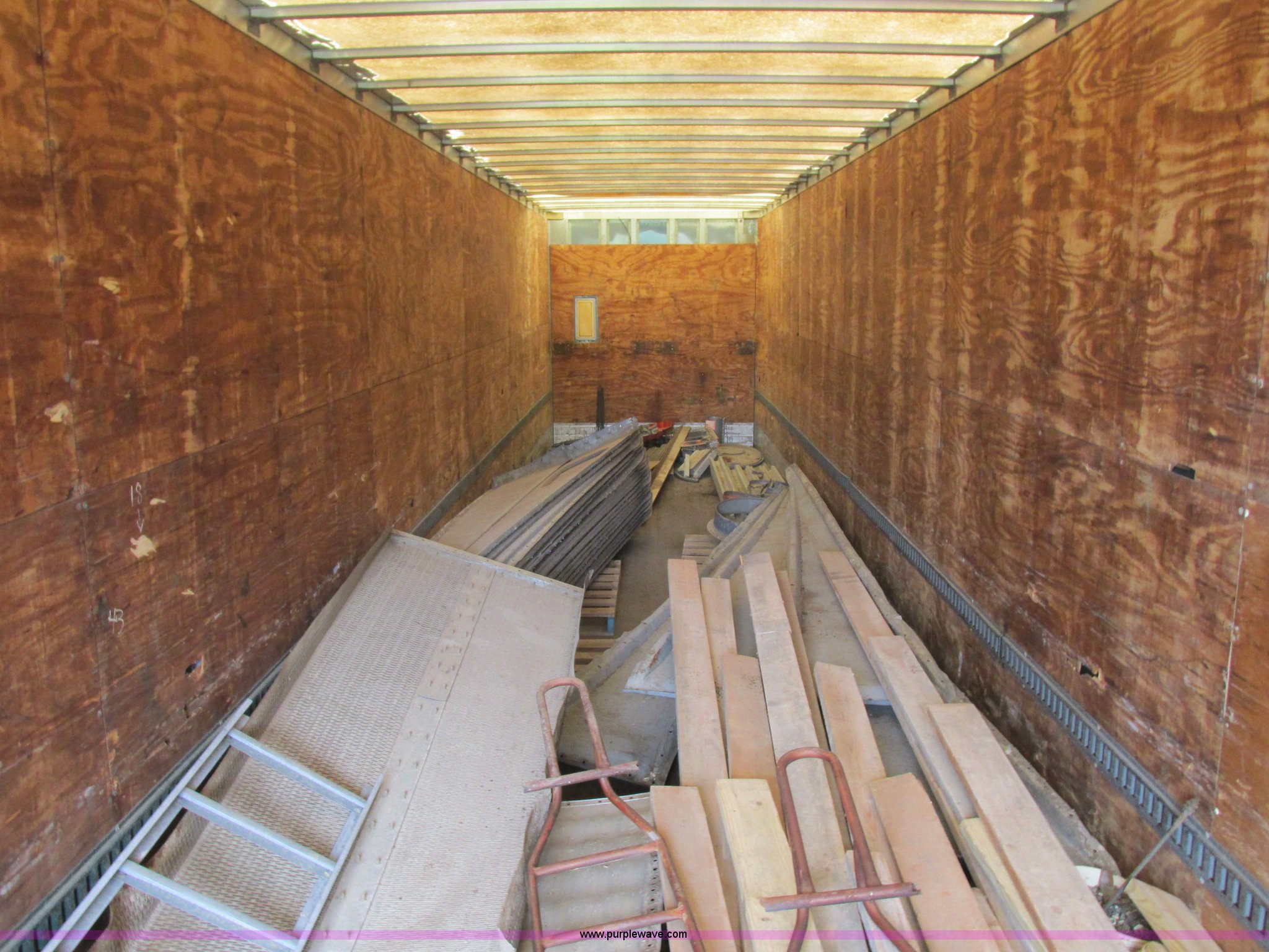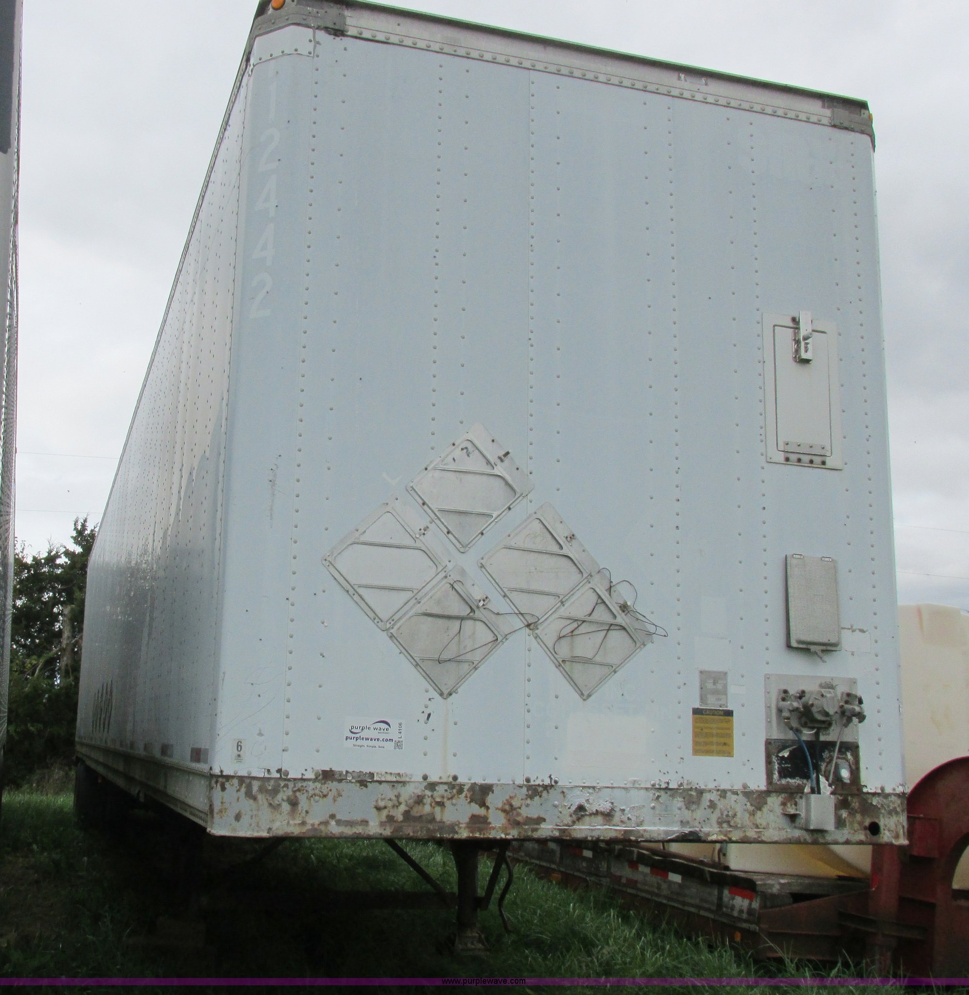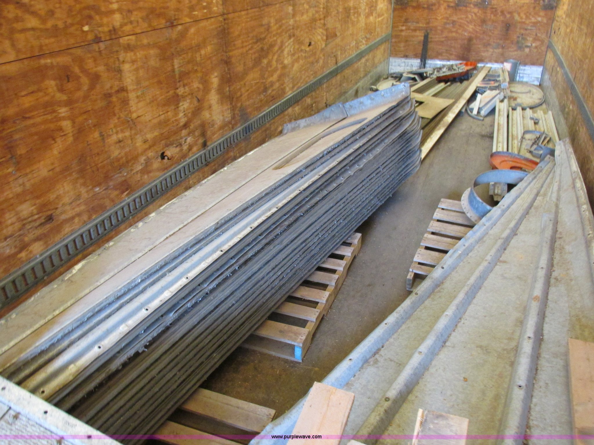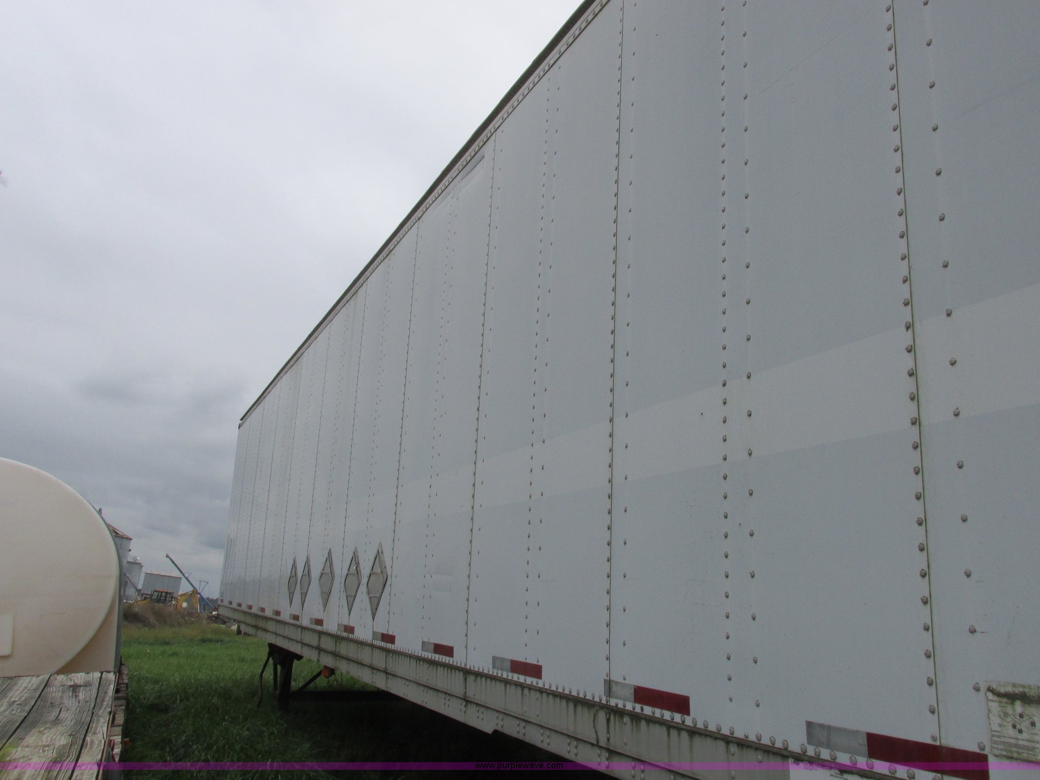 Purple Wave is selling a used Dry Van Trailer in Missouri. This item is a 1996 Stoughton dry van trailer with the following: Model AVW4857SCAR, 48'L x 102"W, Wood deck, Swing-out rear doors, Lift gate, Unknown operating condition, Assorted grain bin parts and accessories, Dual leg landing gear, Air suspension, Air brakes, Tandem axle, 295/75R22.5 tires, GVWR 70,000 lbs