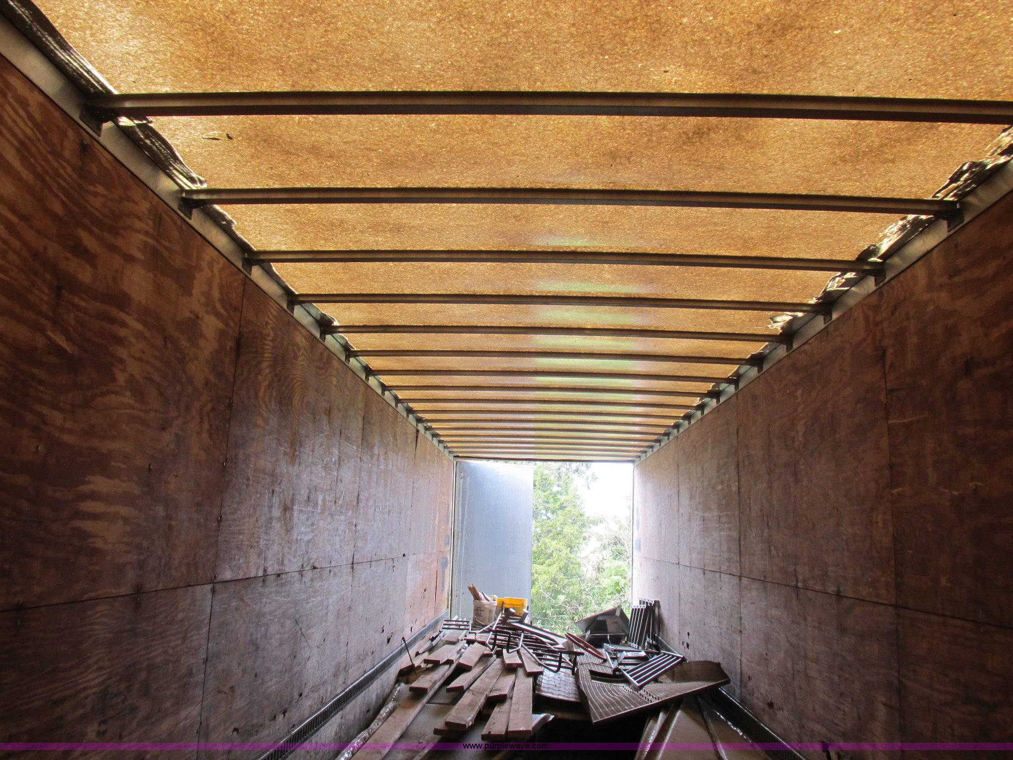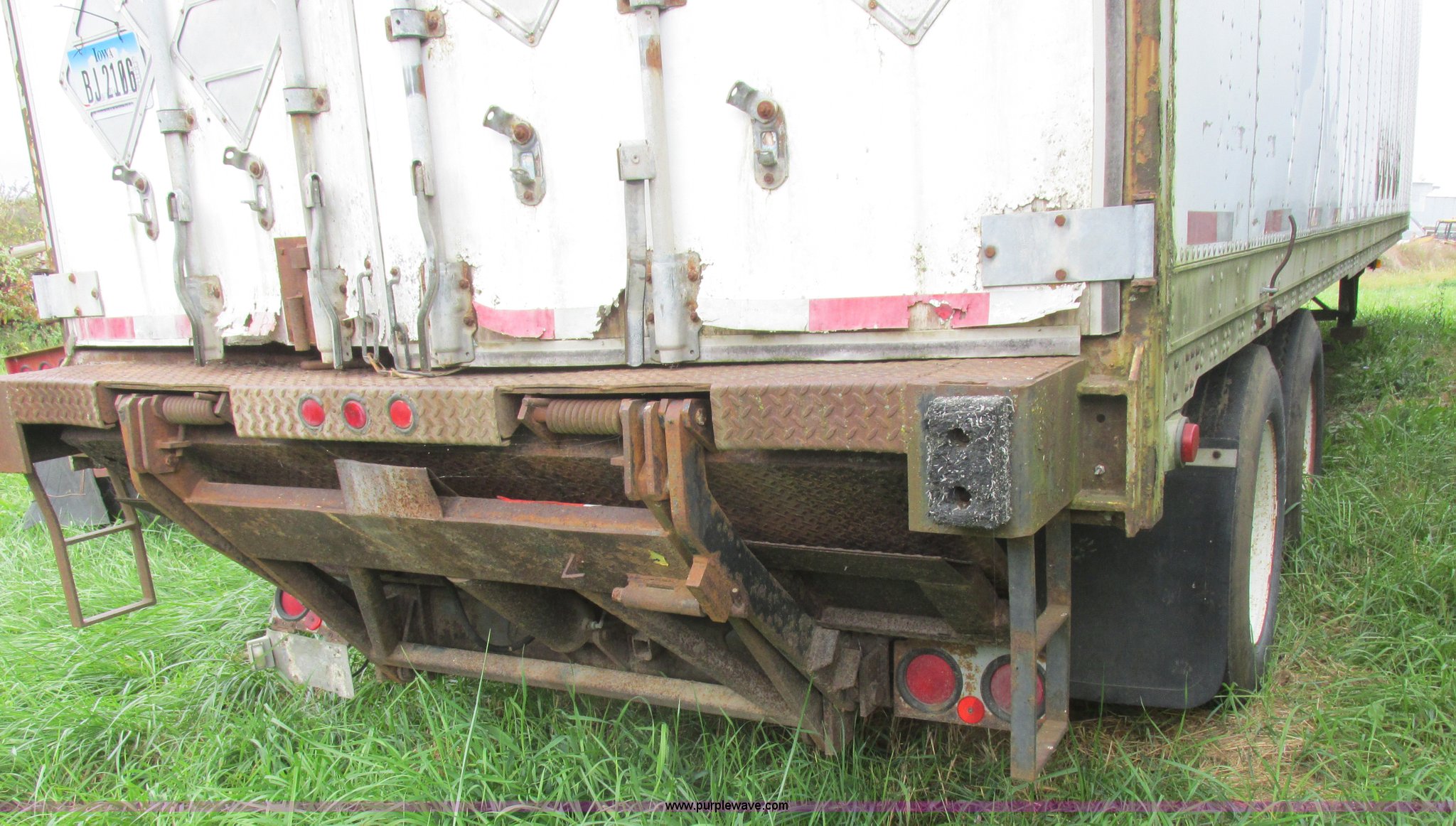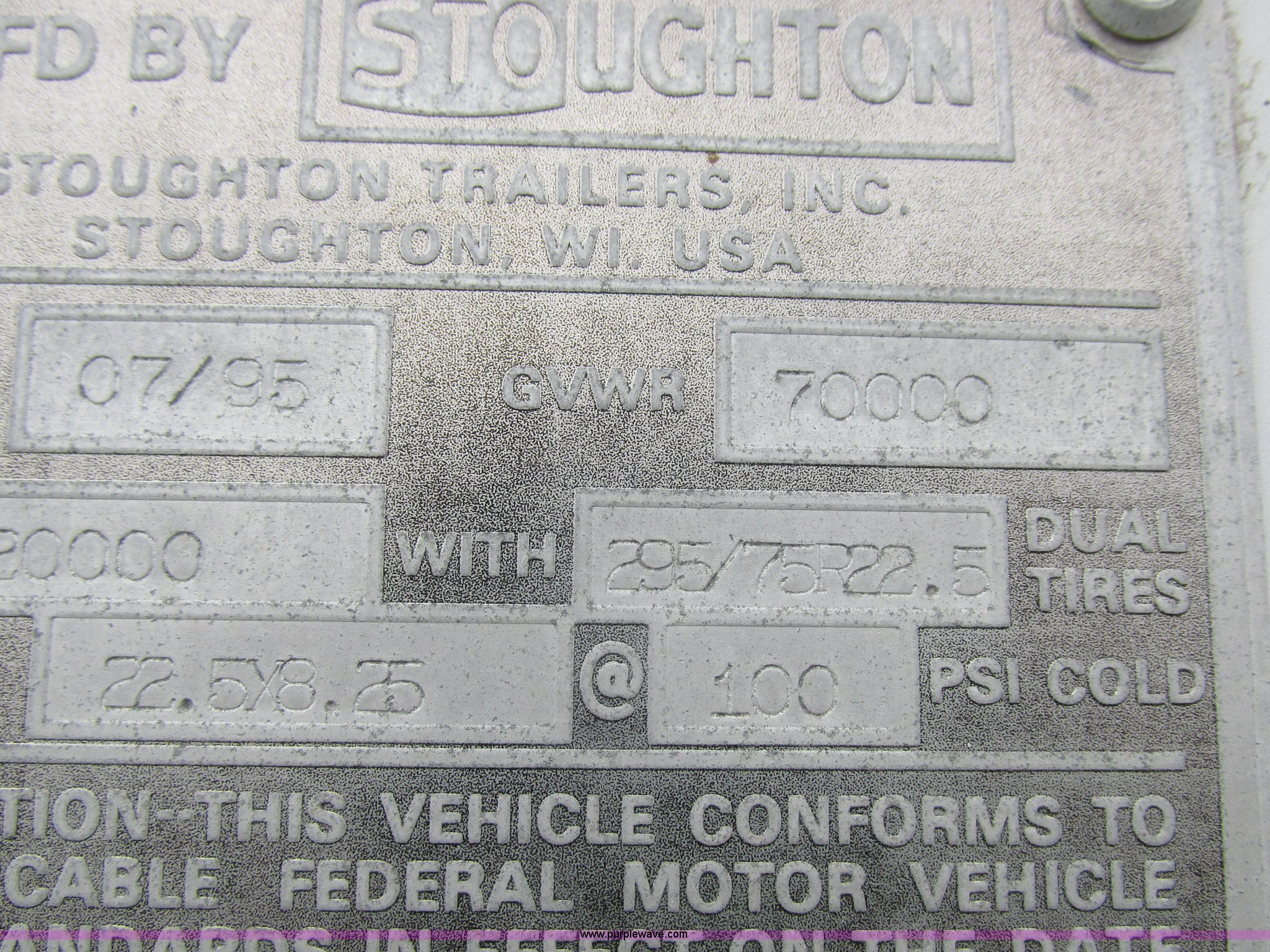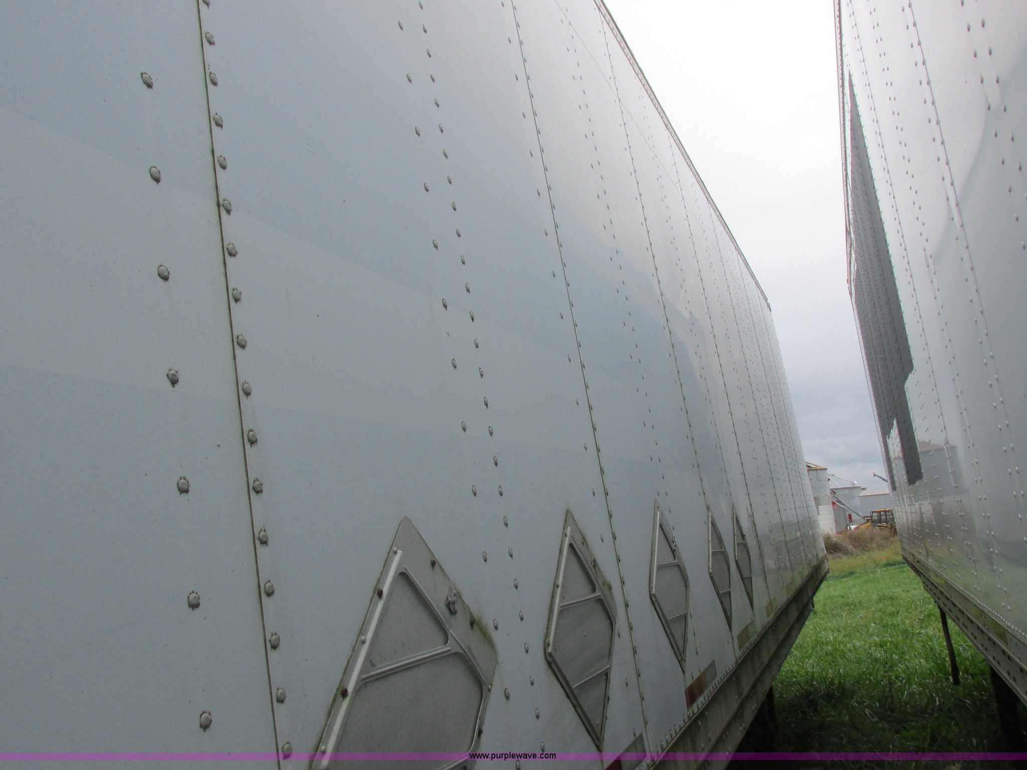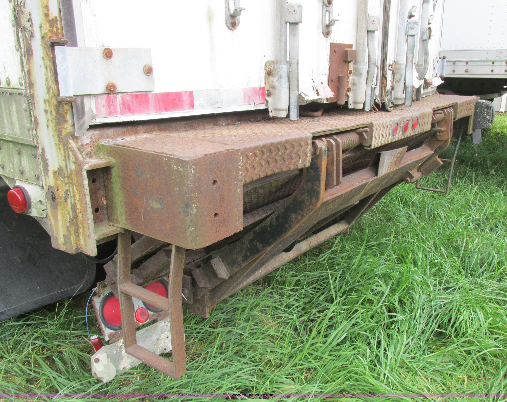 Purple Wave is selling a used Dry Van Trailer in Missouri. This item is a 1996 Stoughton dry van trailer with the following: Model AVW4857SCAR, 48'L x 102"W, Wood deck, Swing-out rear doors, Lift gate, Unknown operating condition, Assorted grain bin parts and accessories, Dual leg landing gear, Air suspension, Air brakes, Tandem axle, 295/75R22.5 tires, GVWR 70,000 lbs