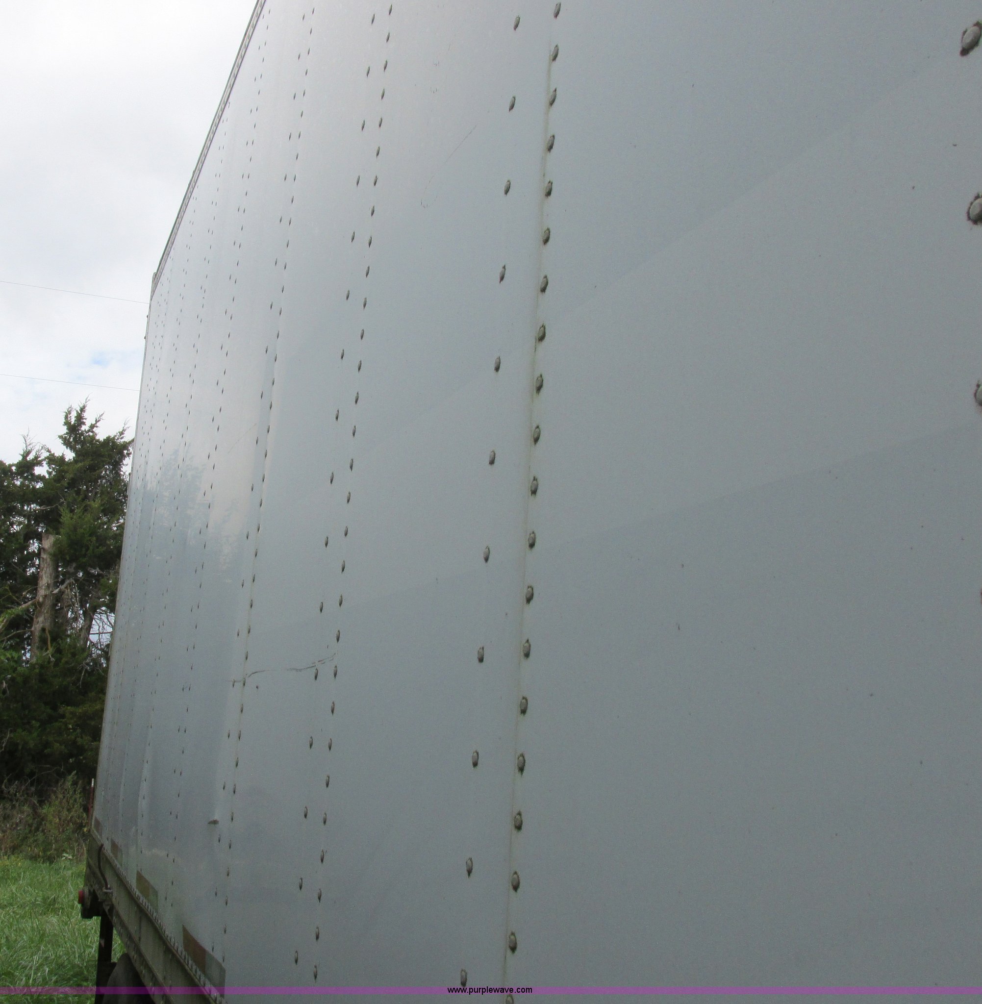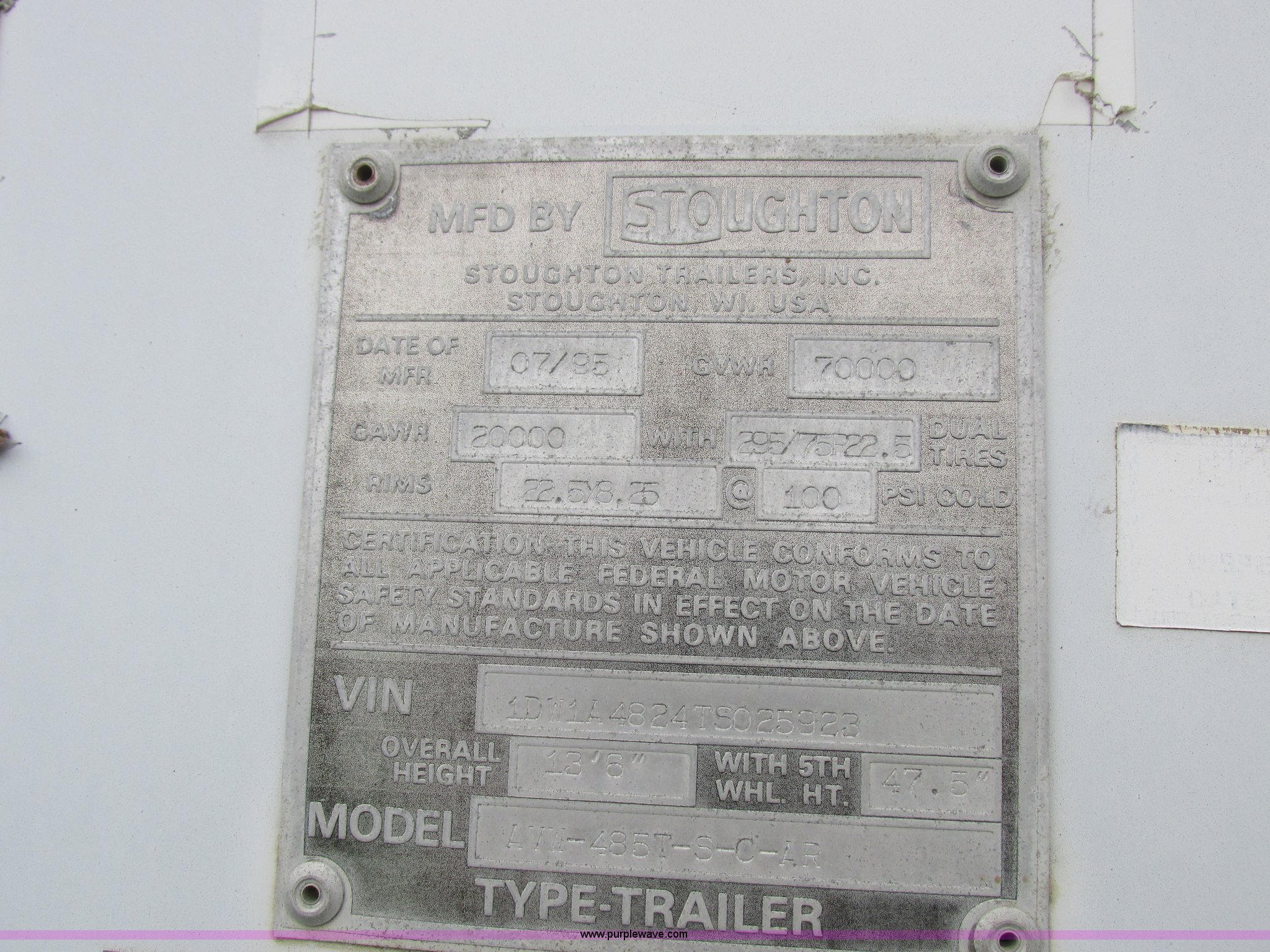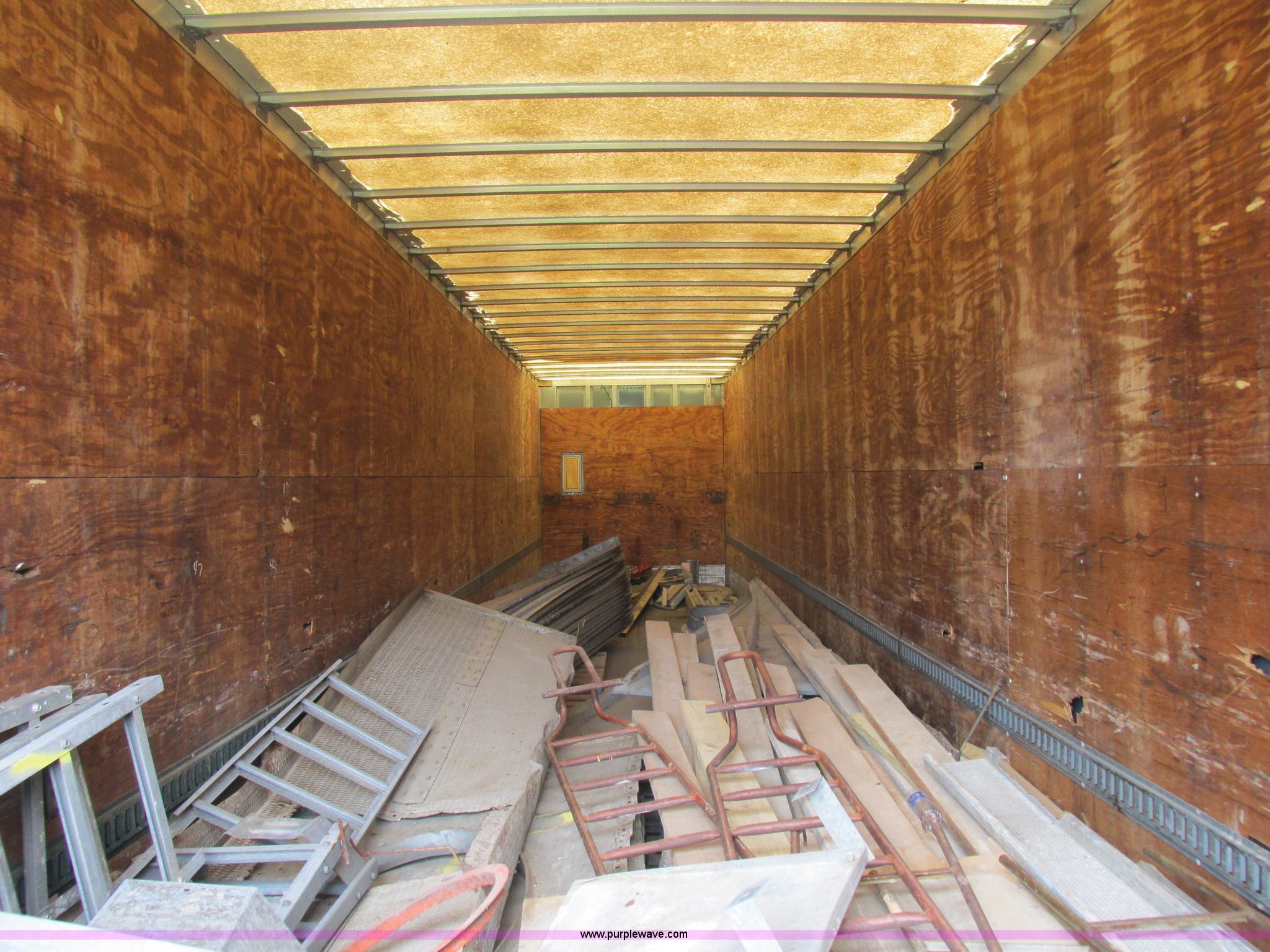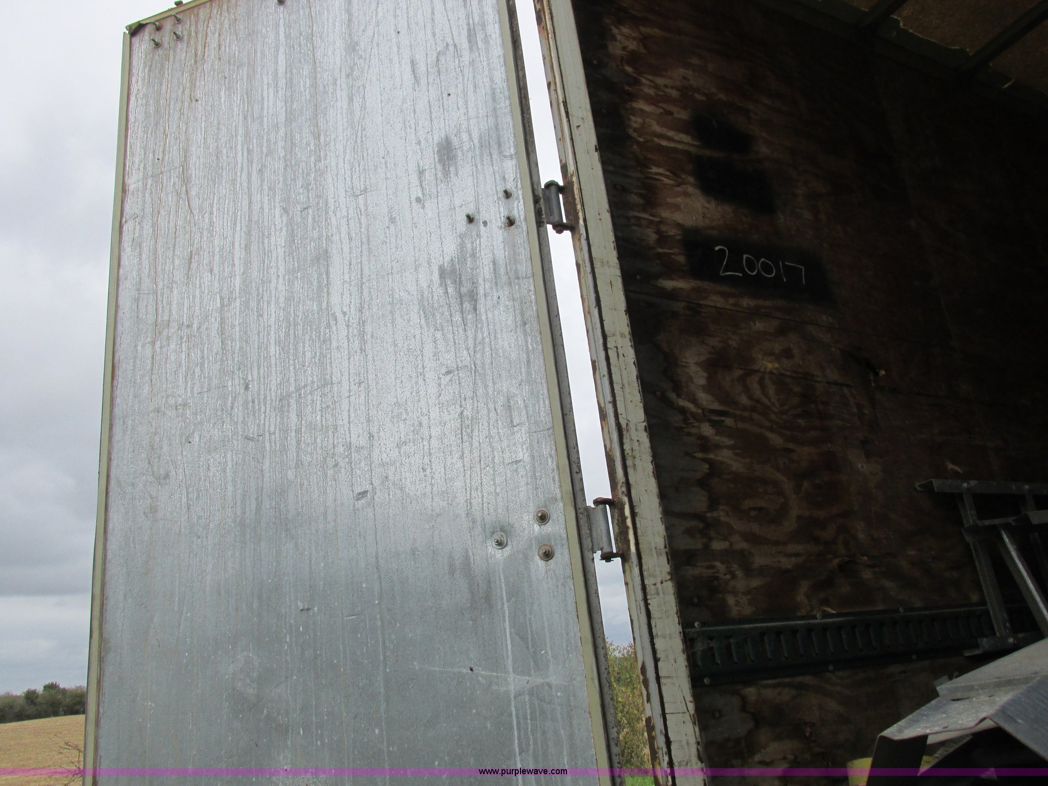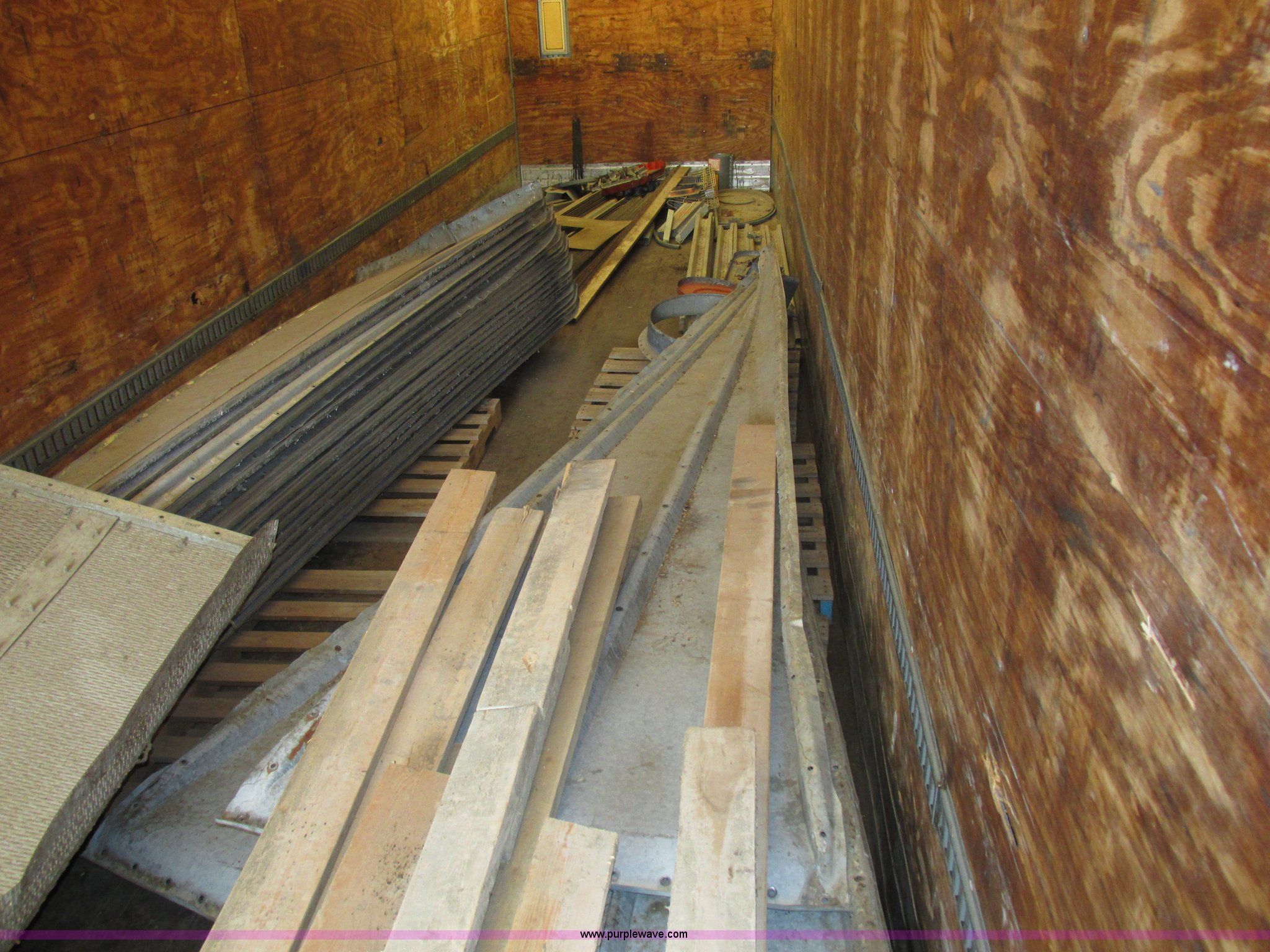 Purple Wave is selling a used Dry Van Trailer in Missouri. This item is a 1996 Stoughton dry van trailer with the following: Model AVW4857SCAR, 48'L x 102"W, Wood deck, Swing-out rear doors, Lift gate, Unknown operating condition, Assorted grain bin parts and accessories, Dual leg landing gear, Air suspension, Air brakes, Tandem axle, 295/75R22.5 tires, GVWR 70,000 lbs