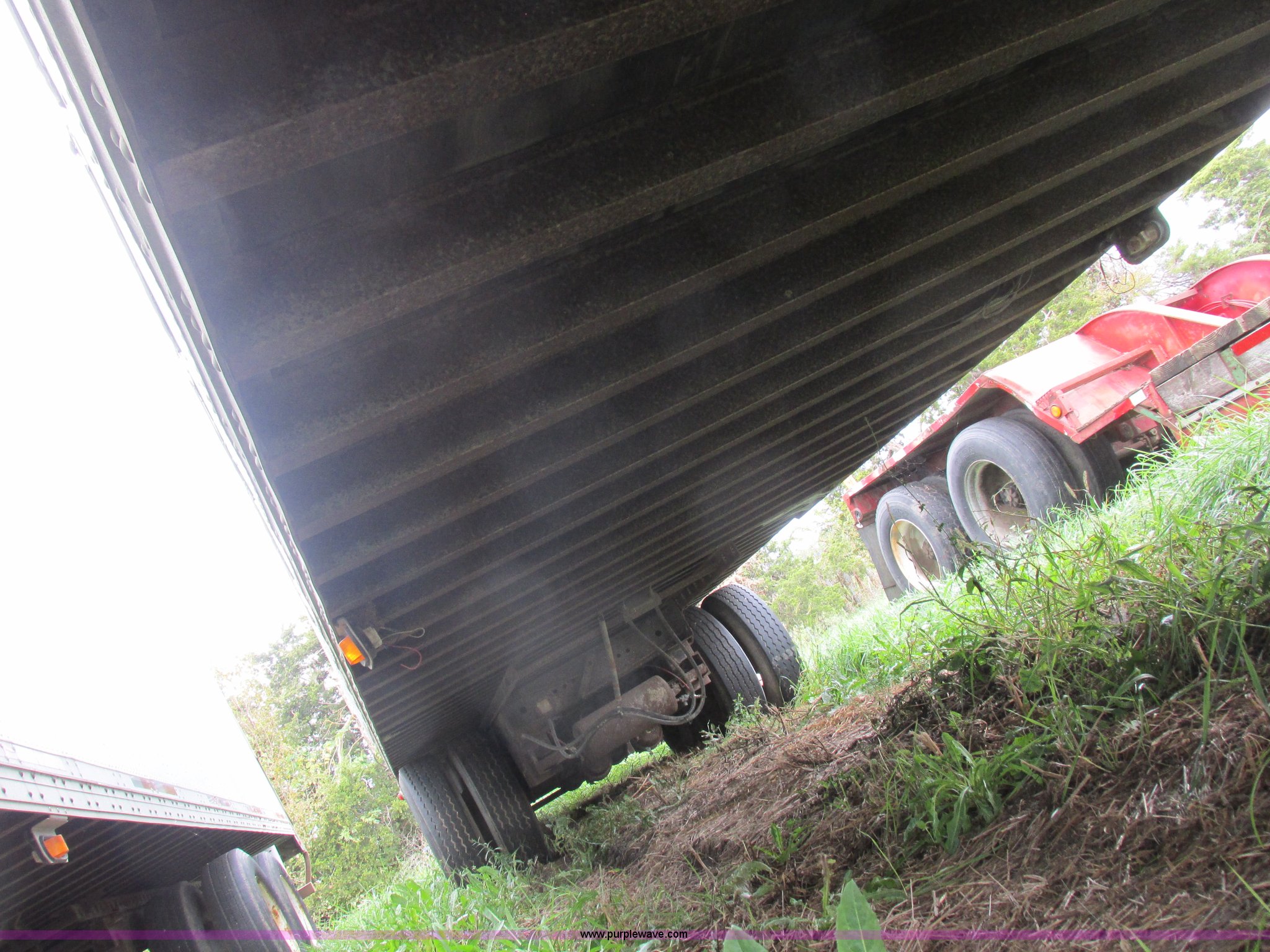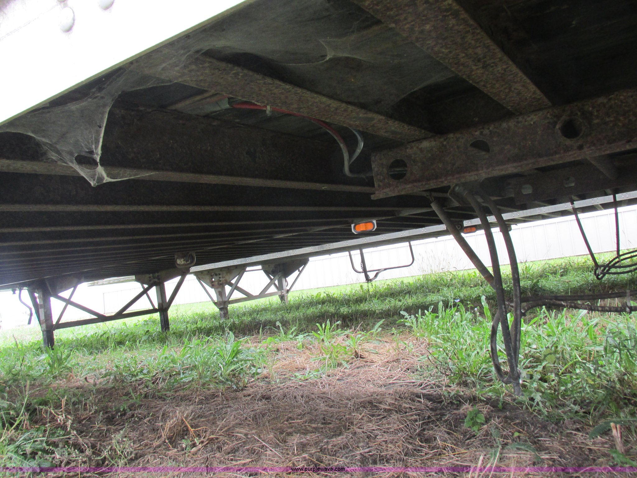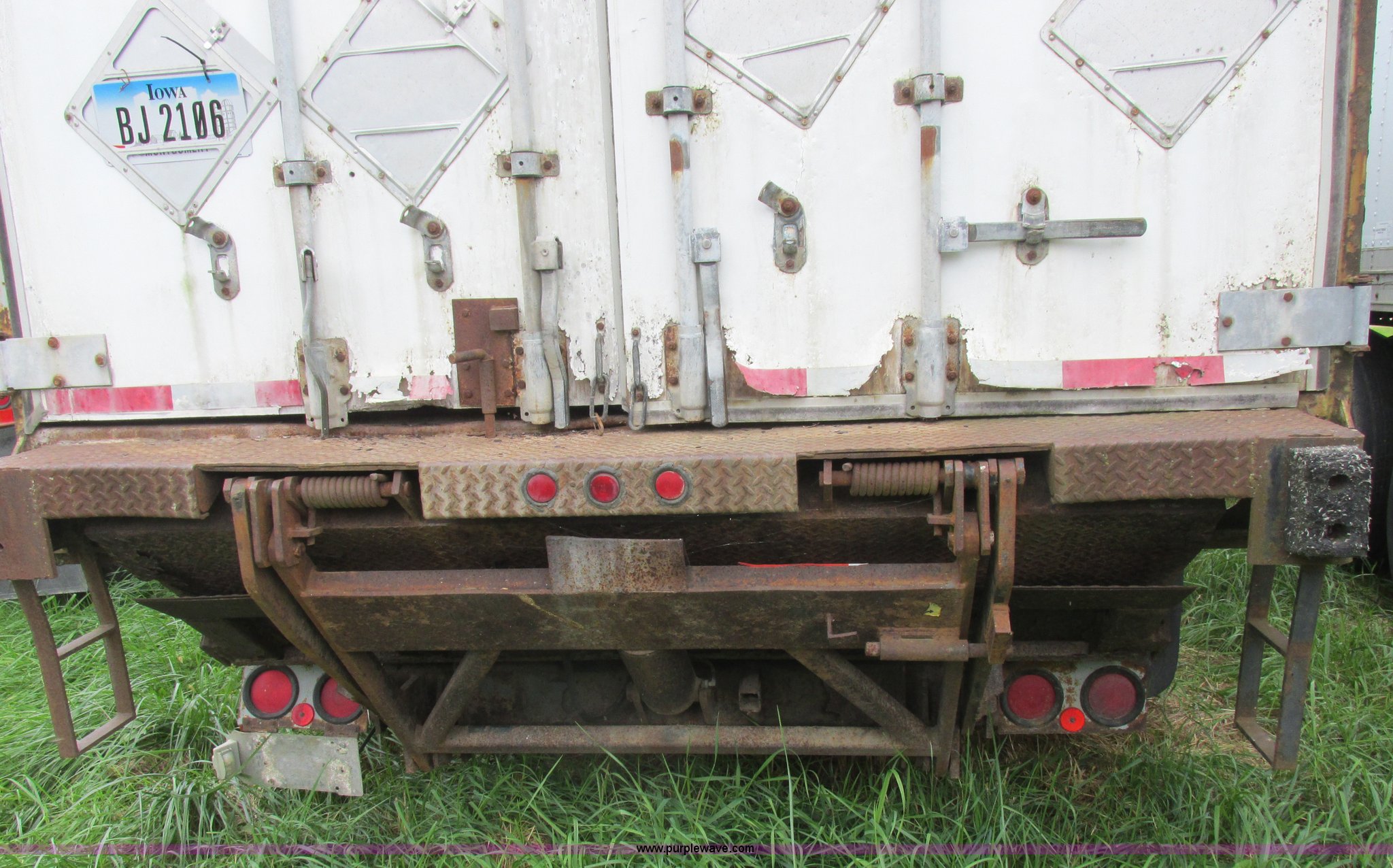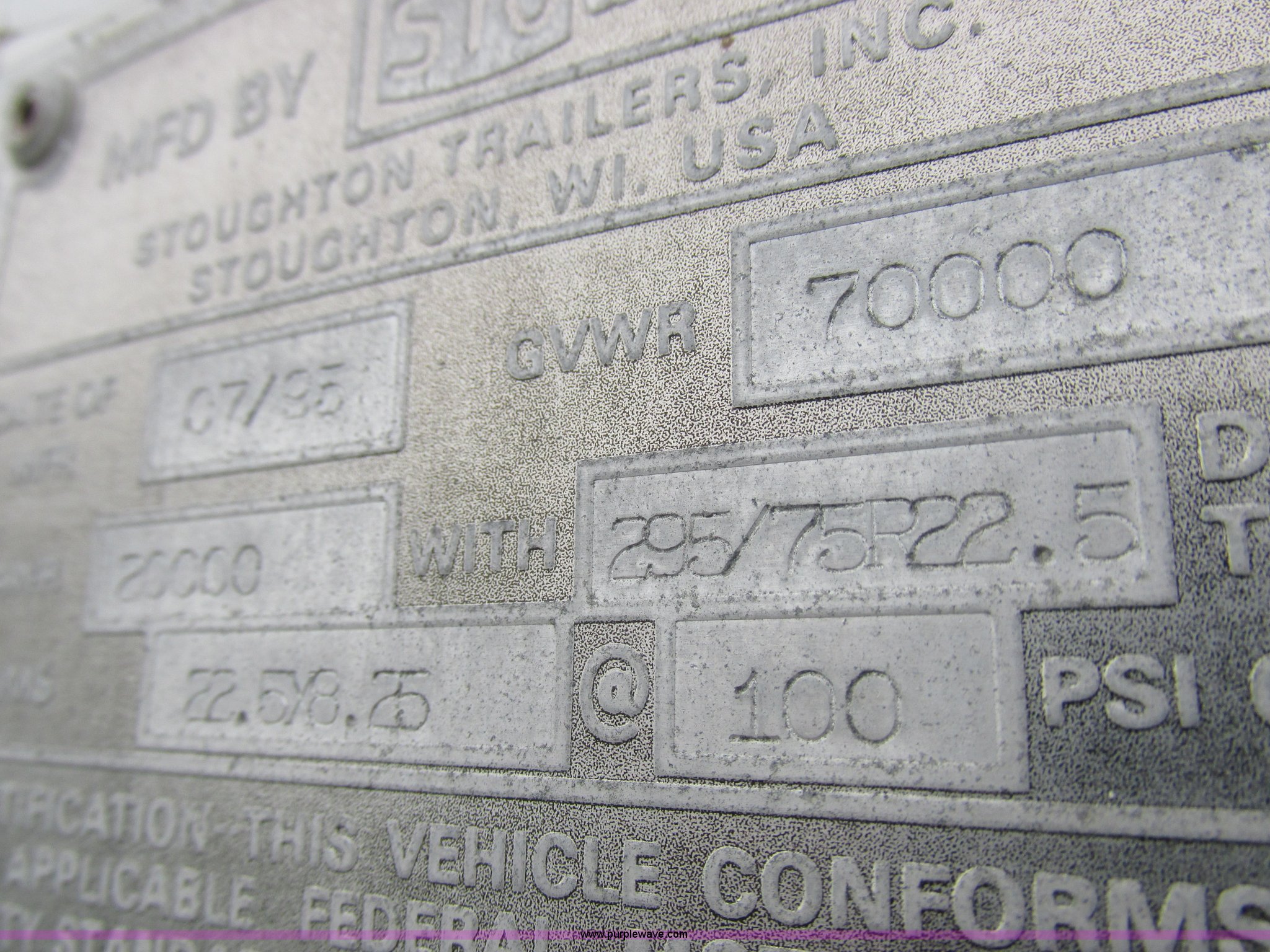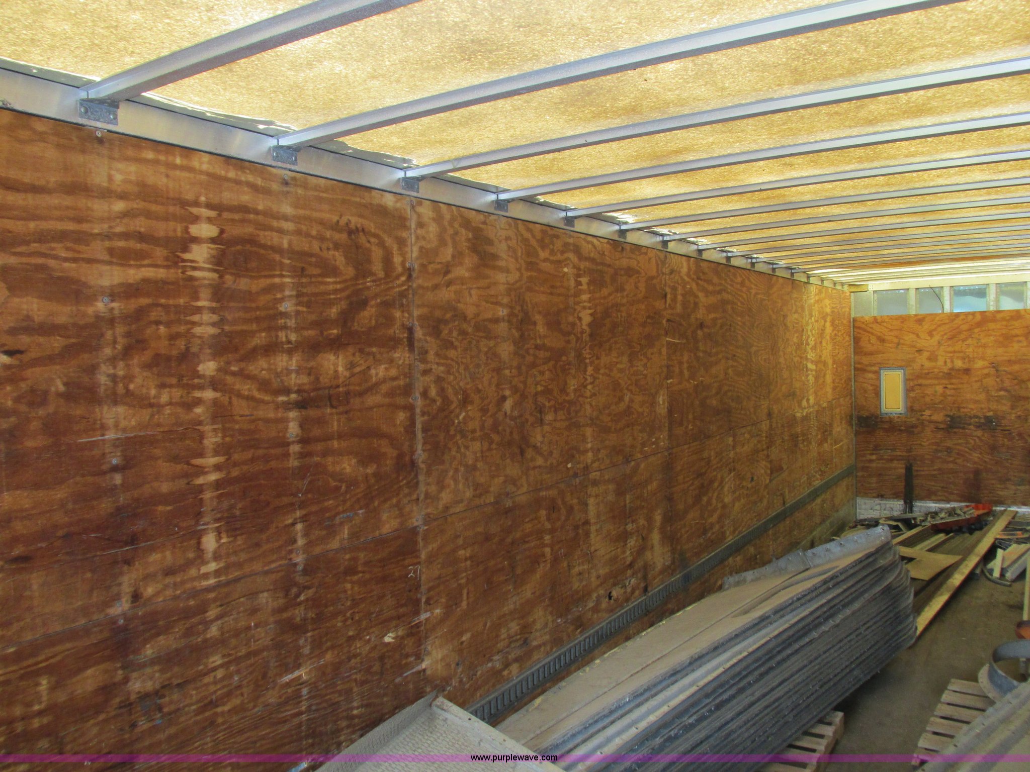 Purple Wave is selling a used Dry Van Trailer in Missouri. This item is a 1996 Stoughton dry van trailer with the following: Model AVW4857SCAR, 48'L x 102"W, Wood deck, Swing-out rear doors, Lift gate, Unknown operating condition, Assorted grain bin parts and accessories, Dual leg landing gear, Air suspension, Air brakes, Tandem axle, 295/75R22.5 tires, GVWR 70,000 lbs