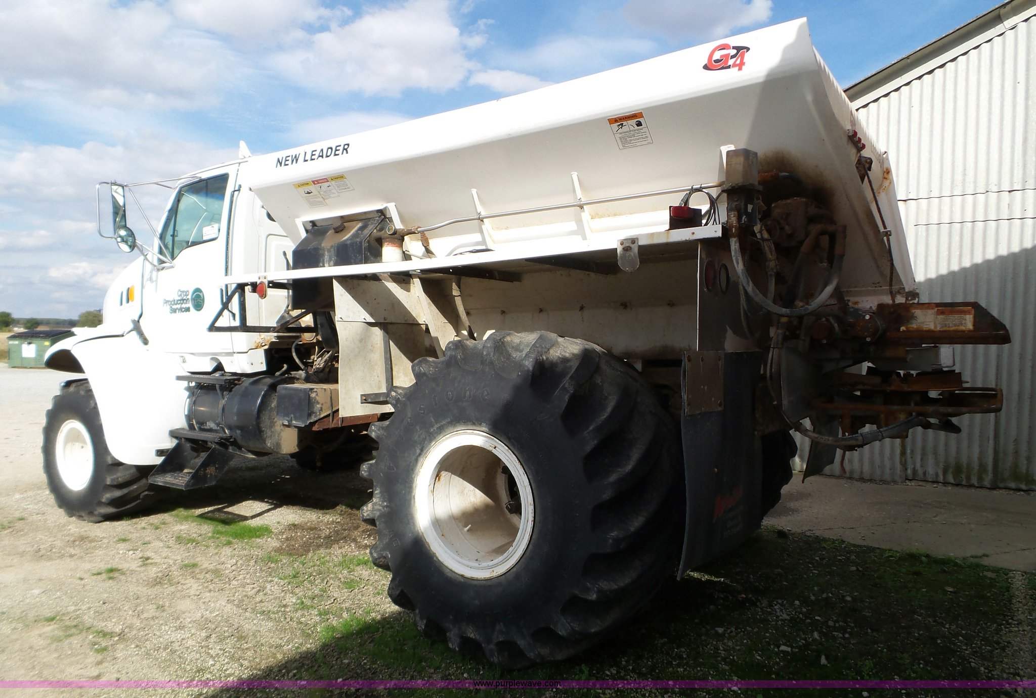 Purple Wave is selling a used Applicator Truck in Indiana. This item is a 2001 Sterling L8500 applicator truck with the following: 22,408 miles on odometer, 7,006 hours on meter, Caterpillar 3126 7.2L L6 diesel engine, Automatic transmission, Single axle, AC and heat, Tilt, Cruise, AM/FM, Air suspension seat, Heated mirrors, Raven spreader controls, PTO, New Leader spreader bed, Model L3220G4, 12'L, Dual spreader, Dual fuel tanks, Spring suspension, Air brakes, 48x25.00-20 front flotation tires, 66x43.00-25 rear flotation tires